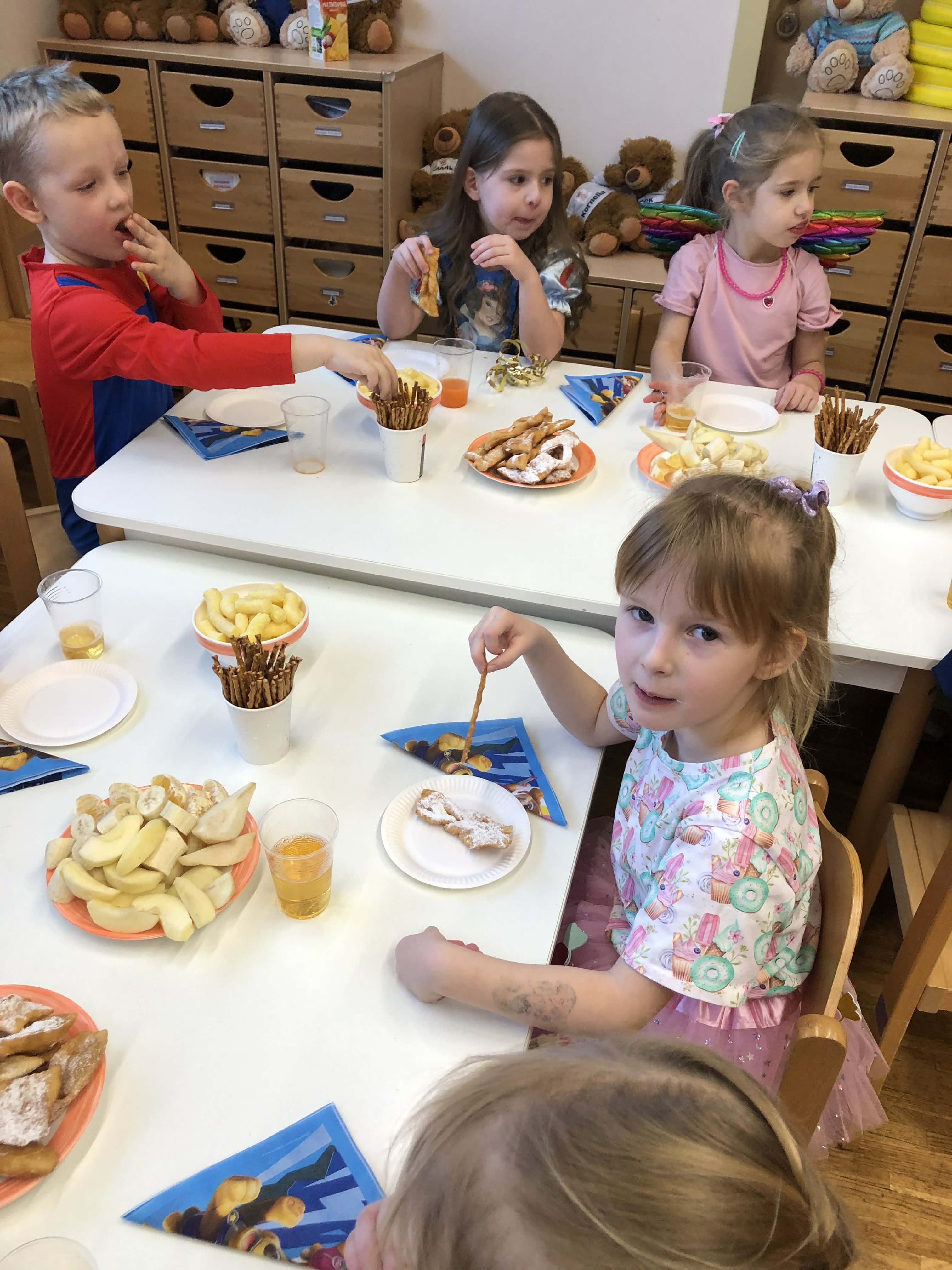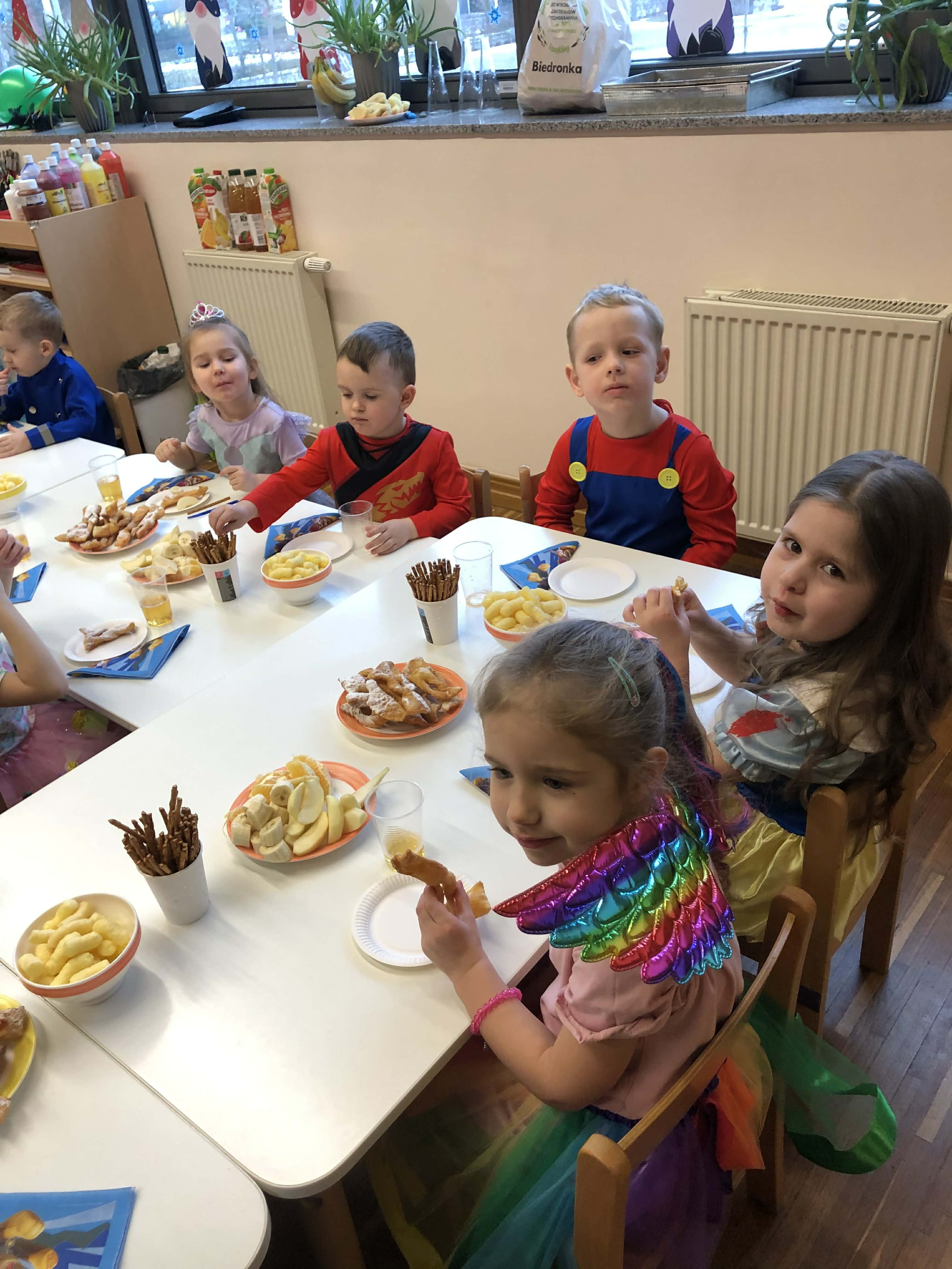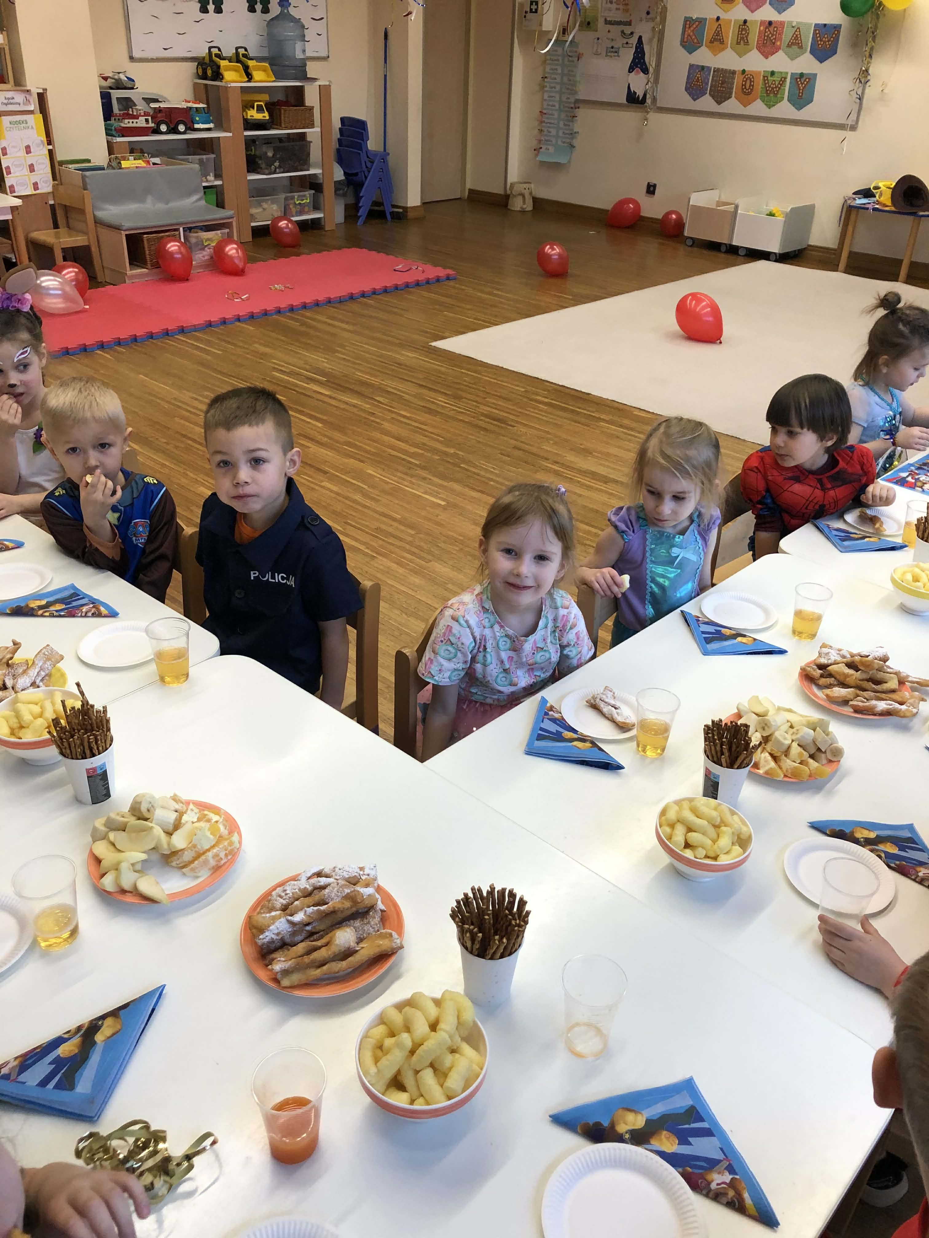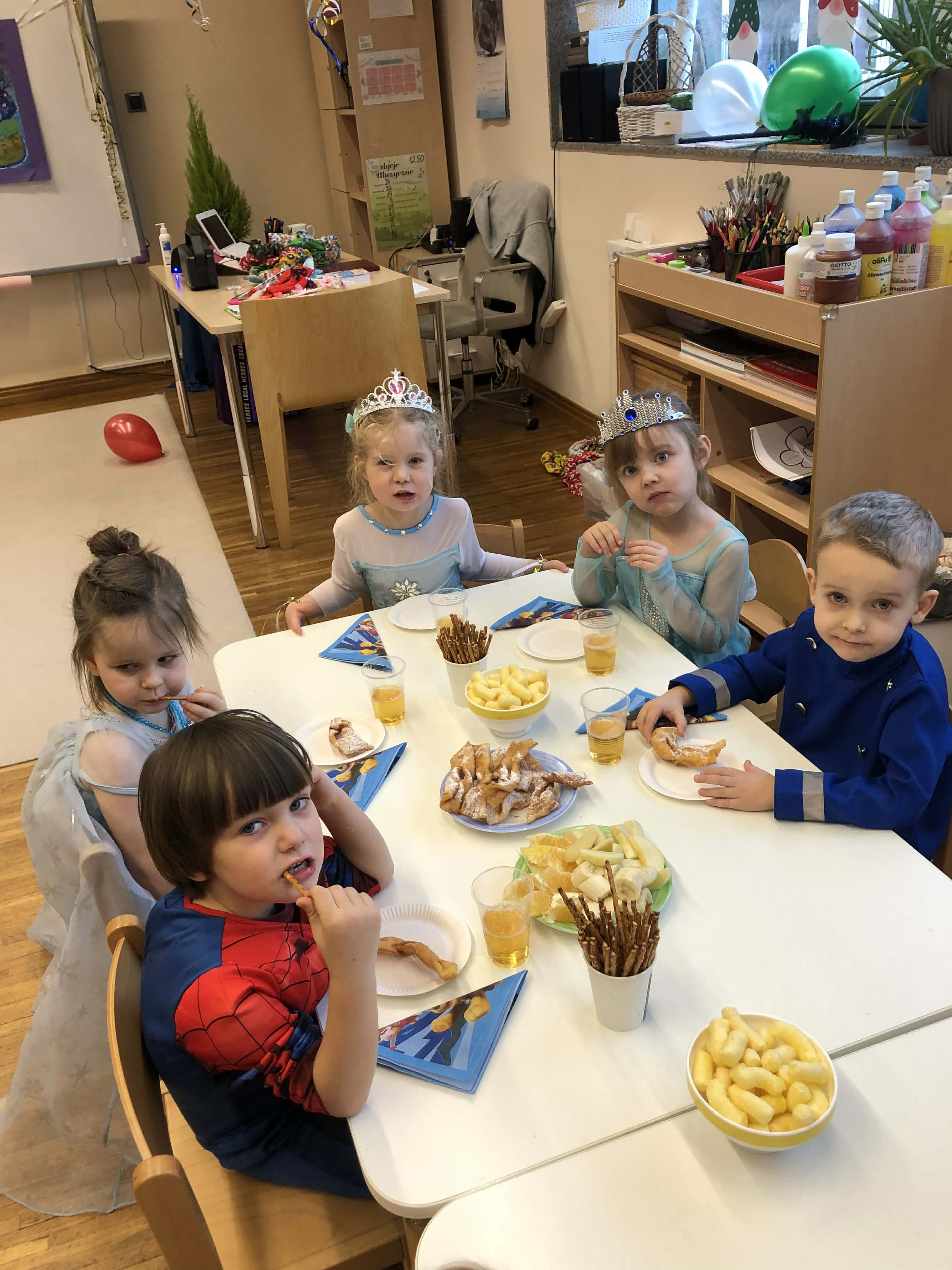 Dnia 30 stycznia w grupie 4-latków odbył się bal karnawałowy. Sala została pięknie udekorowana kolorowymi serpentynami i balonami, co stworzyło radosną, karnawałową atmosferę. Dzieci przebrane były w bajkowe postacie – chłopcy wcielili się w superbohaterów, a dziewczynki w księżniczki. Bal obfitował w tańce przy muzyce znanych dziecięcych przebojów oraz liczne konkursy i zabawy ruchowe z wykorzystaniem m.in. gumy animacyjnej i balonów. Po wyczerpujących pląsach na dzieci czekał poczęstunek: soki, owoce, chrupki, słone paluszki oraz faworki. Zabawa przebiegła w radosnej atmosferze i dostarczyła dzieciom wielu uśmiechów oraz niezapomnianych wrażeń.
