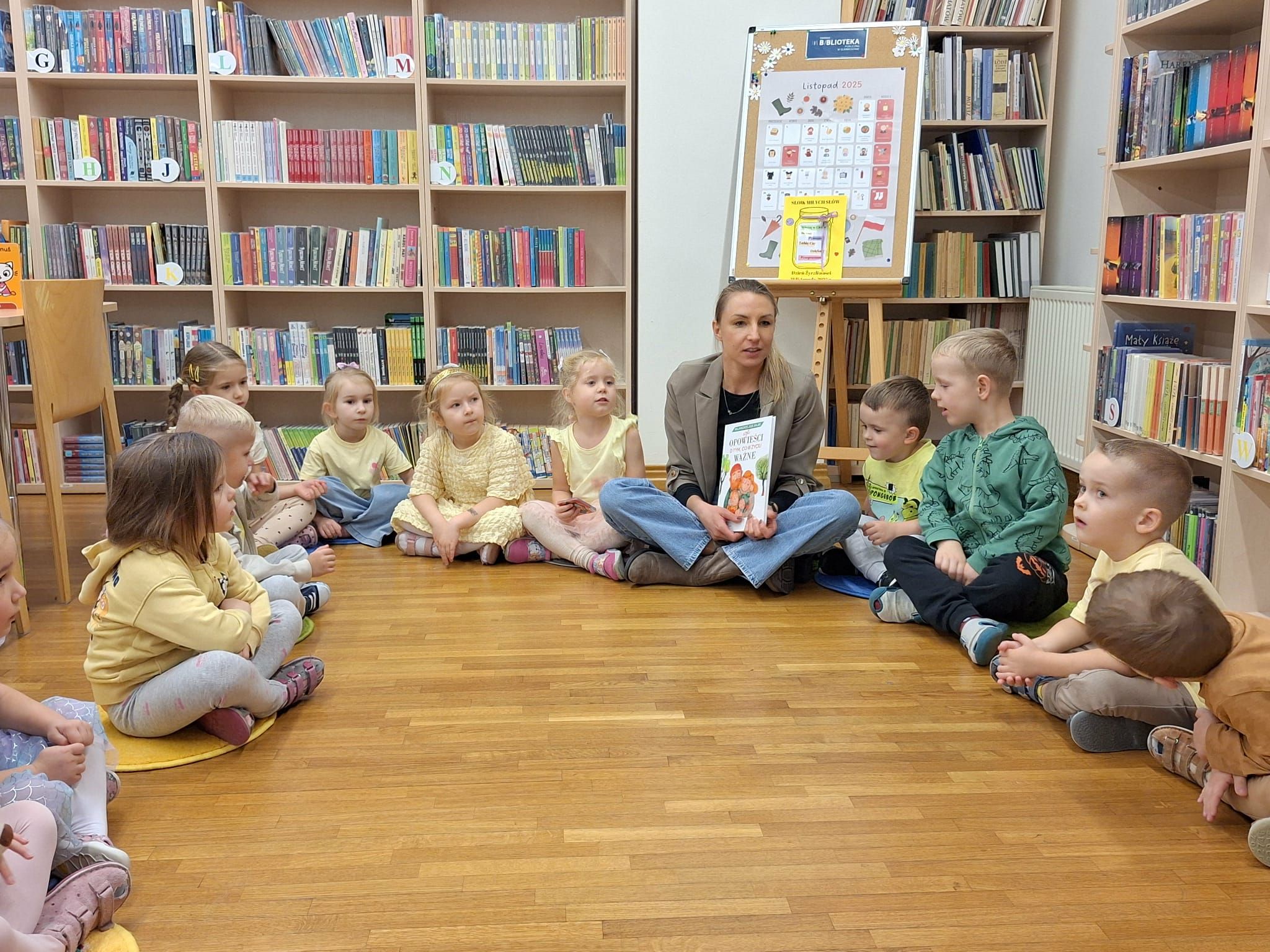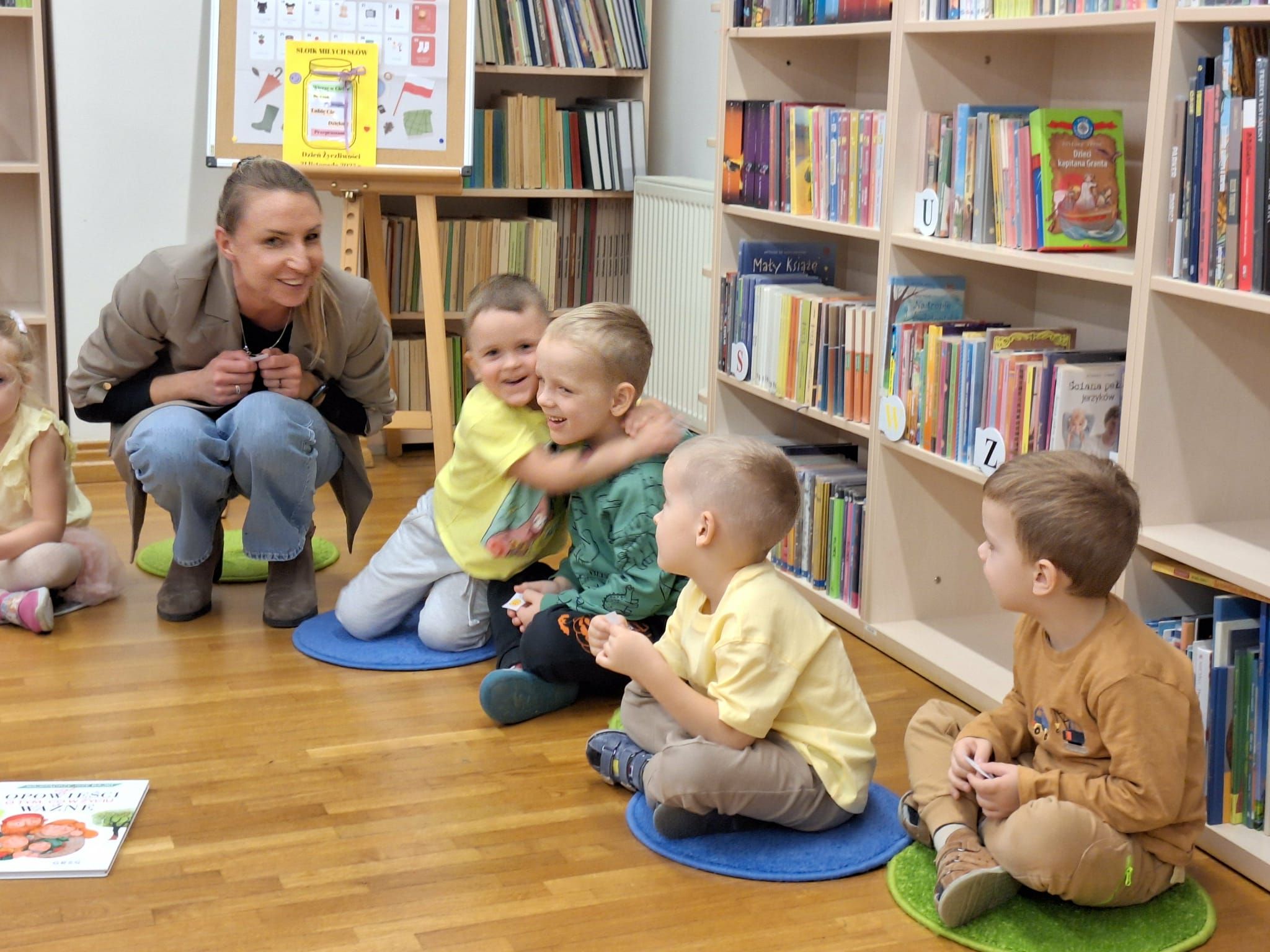 W piątek odbyły się kolejne zajęcia w ramach Dyskusyjnego Klubu książki. Pani Ola zaprosiła dzieci do wysłuchanie opowiadania,, Żadnej magii " o Życzliwości z książki ,,Najmądrzejsze bajki czyli o tym co w życiu ważne " . Dzieci dowiedziały się z niego , że życzliwość sprawia , że ludzie staja się lepsi i o drobiazgach , które nic nie kosztują , a sprawiają , że świat staje się lepszy . Pani Ola zaproponowała również dzieciom zabawę w wtórej mogli wyrazić swoje uczucia do kolegi czy koleżanki z grupy wyrażane gestem lub słowem . na zakończeni dzieci otrzymały oczywiście naklejki , które wkleiły na swoje karty .