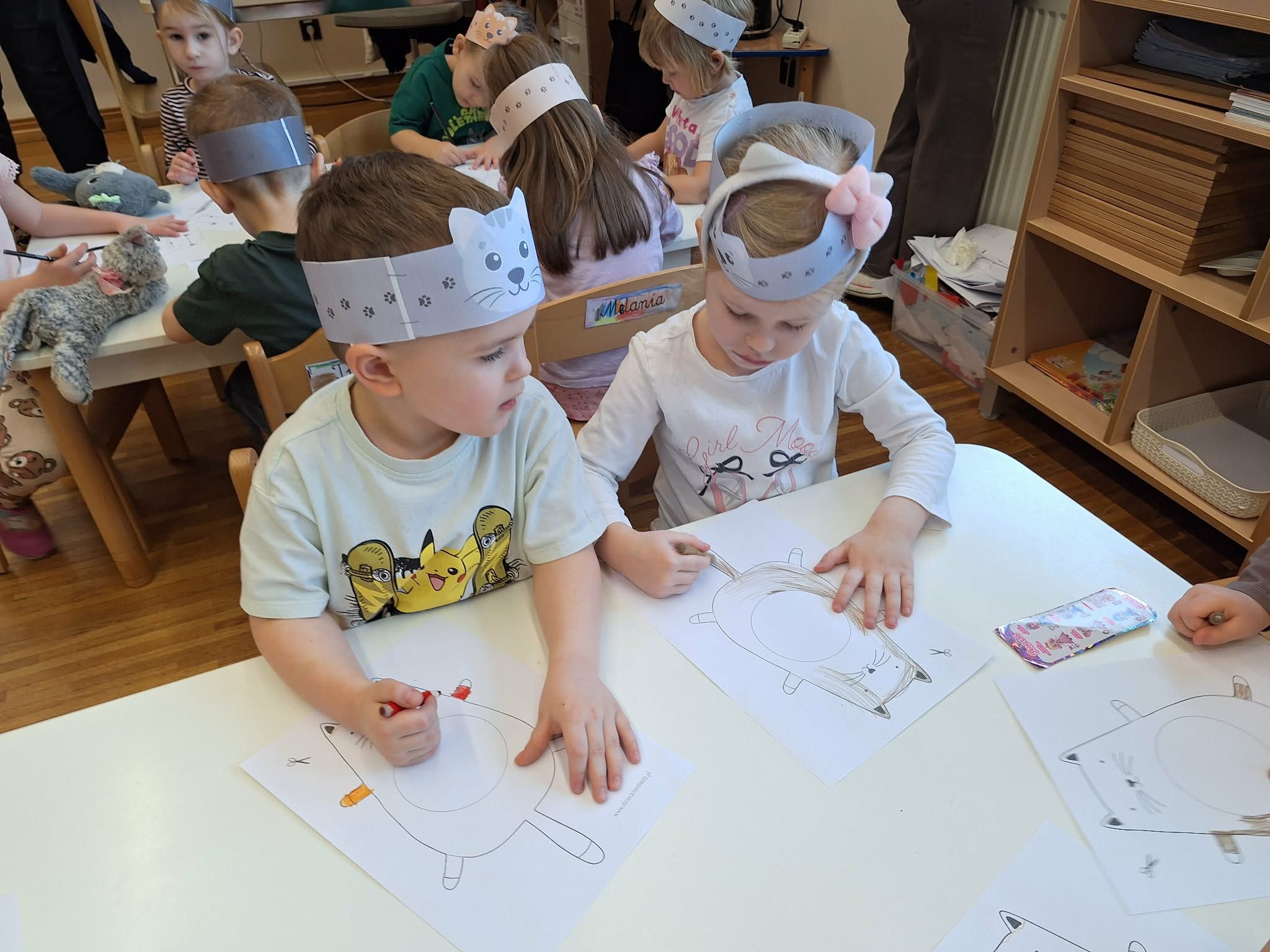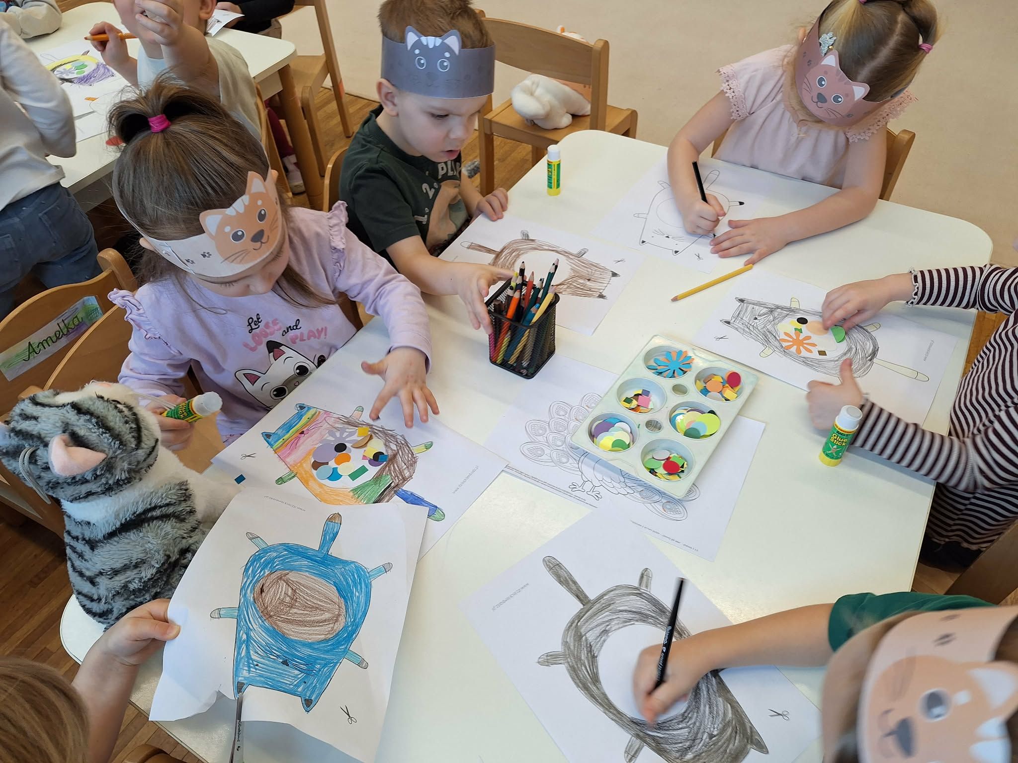 Z okazji Dnia Kota w naszym przedszkolu odbyło się wiele ciekawych i wesołych aktywności. Dzieci rozpoczęły dzień od „kociej gimnastyki” – naśladowały ruchy kotów: przeciągały się jak leniwe kotki, skradały się cichutko na paluszkach oraz zwijały się w kłębek. Następnie przedszkolaki oglądały ilustracje przedstawiające znane koty z bajek i filmów, takie jak Kot w Butach, Garfield oraz Hello Kitty. Dzieci chętnie opowiadały, z jakich bajek pochodzą te postacie i czym się wyróżniają. Podczas zajęć poznały również akcesoria potrzebne kotom, takie jak miseczki, drapak, legowisko czy zabawki. Dużo radości sprawiło im nawijanie sznurka oraz zabawy ruchowe inspirowane kocimi psotami. W części plastycznej dzieci wykonały piękne prace przedstawiające koty – kolorowały, wycinały i wyklejały brzuch kota różnym elementami. To był dzień pełen uśmiechu, ruchu i kociej radości!