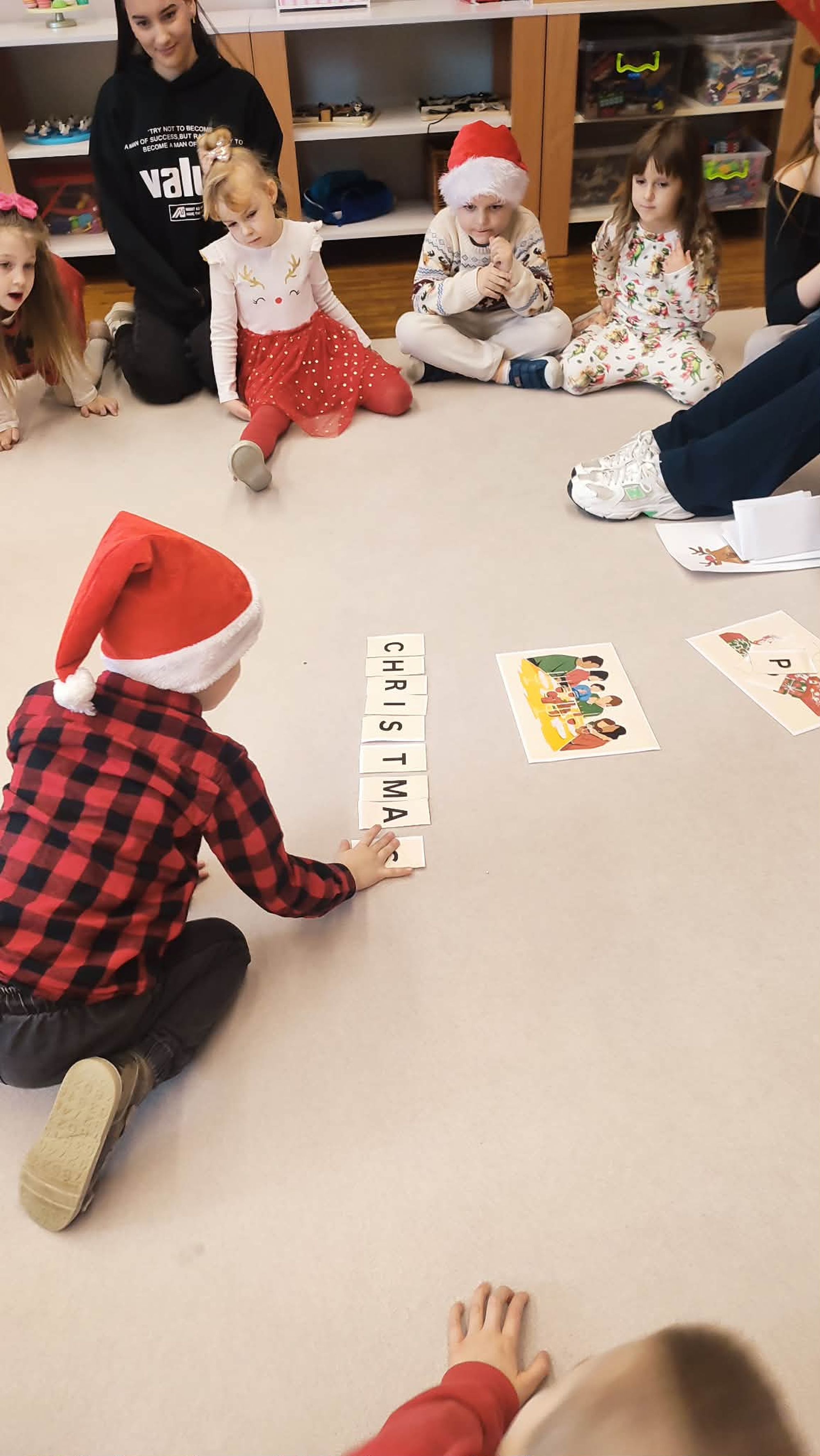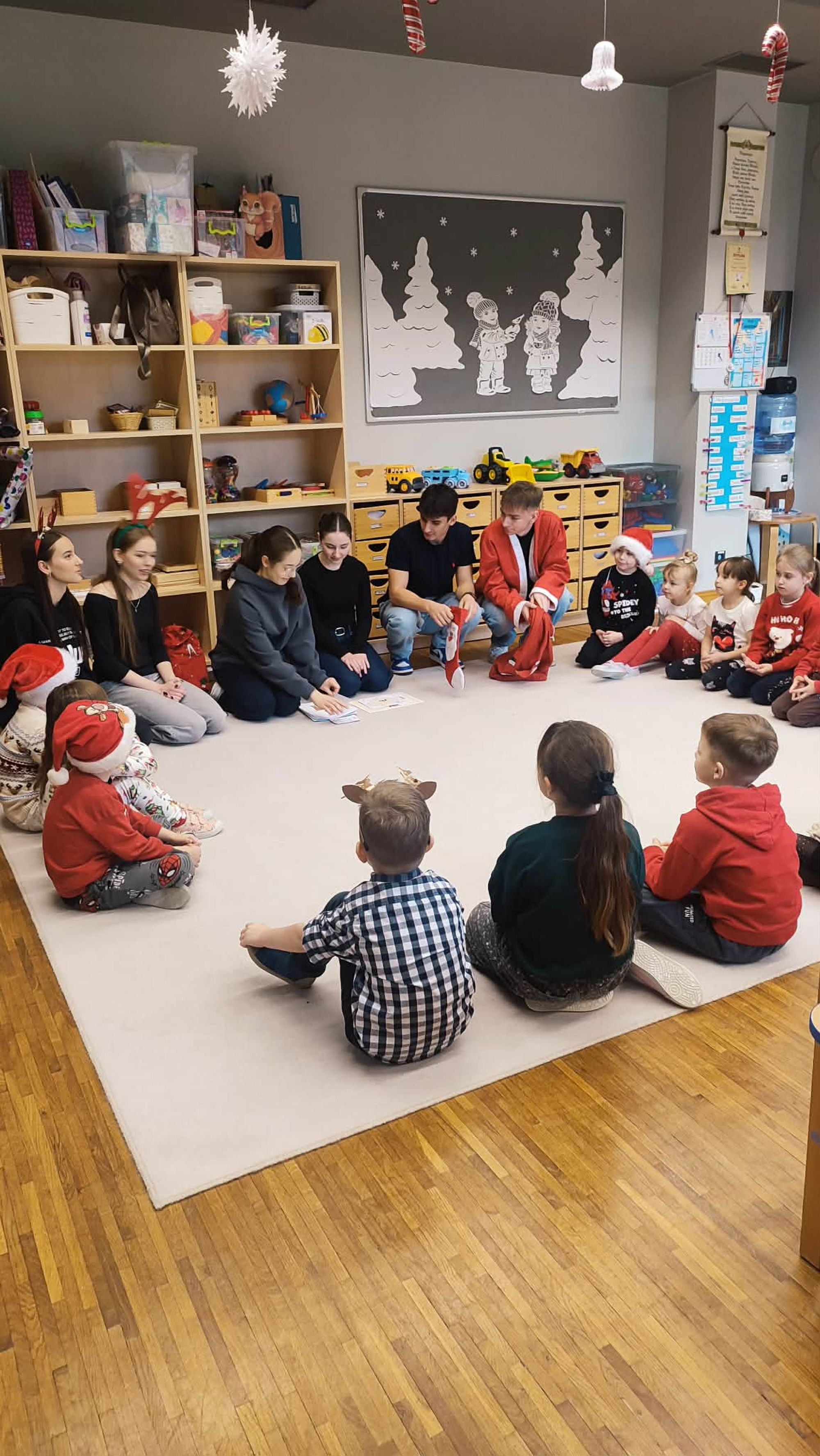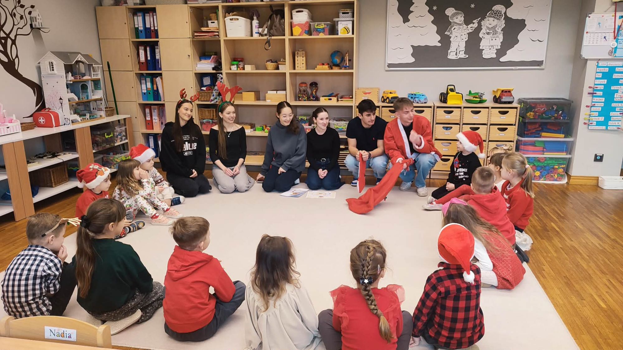 Dzisiaj naszą grupę odwiedzili licealiści z ZSP w Kleszczowie .Przyszli oni w ramach projektu ,,Licealista w przedszkolu ", którego zadaniem było przybliżenie dzieciom tematyki Świąt Bożego Narodzenia w języku angielskim . Dzieci bawiły się z licealistami w różne zabawy ,śpiewały piosenki i wzbogacały słownictwo w zakresie języka angielskiego .Dziękujemy za miłe spotkanie.