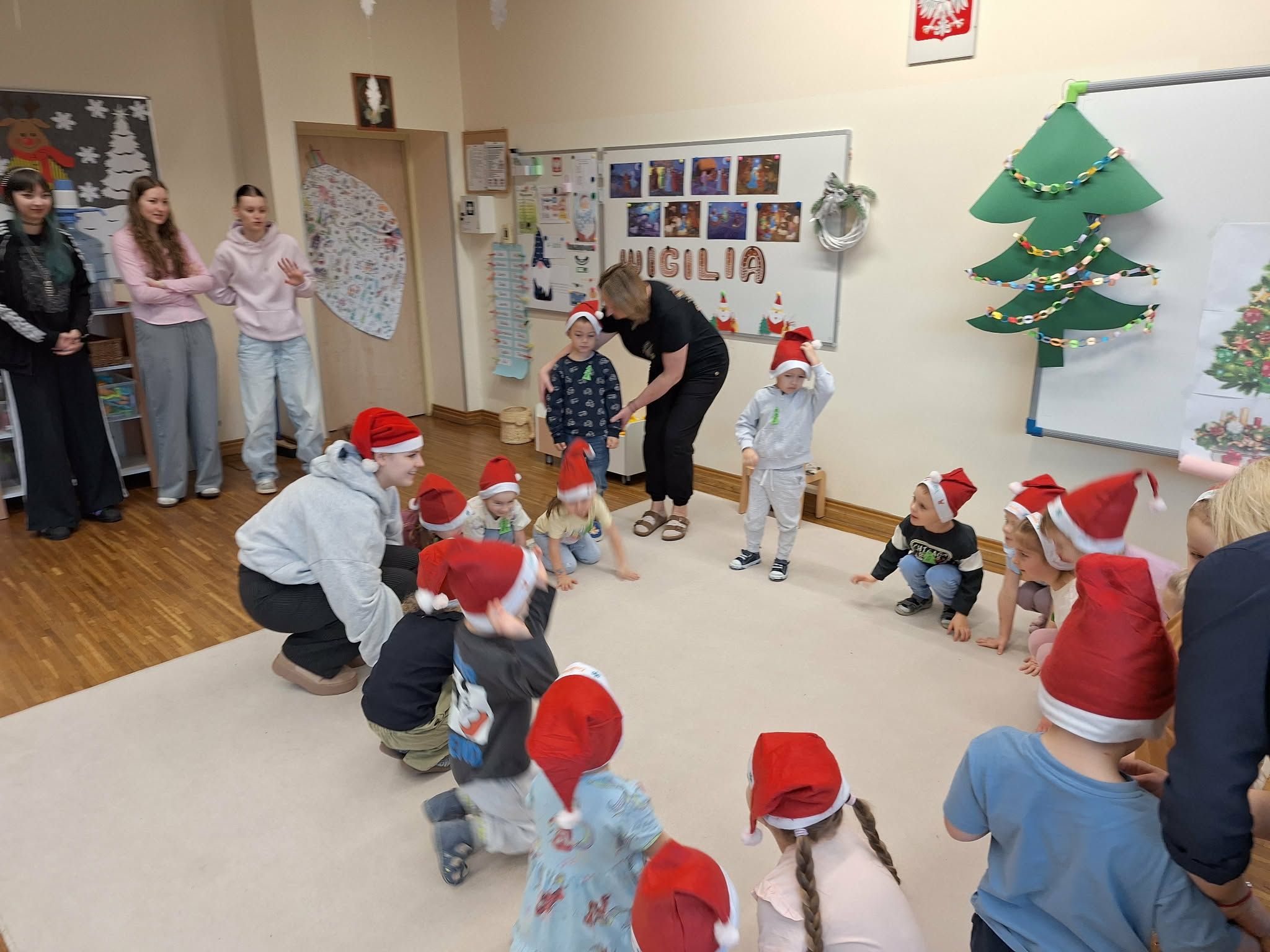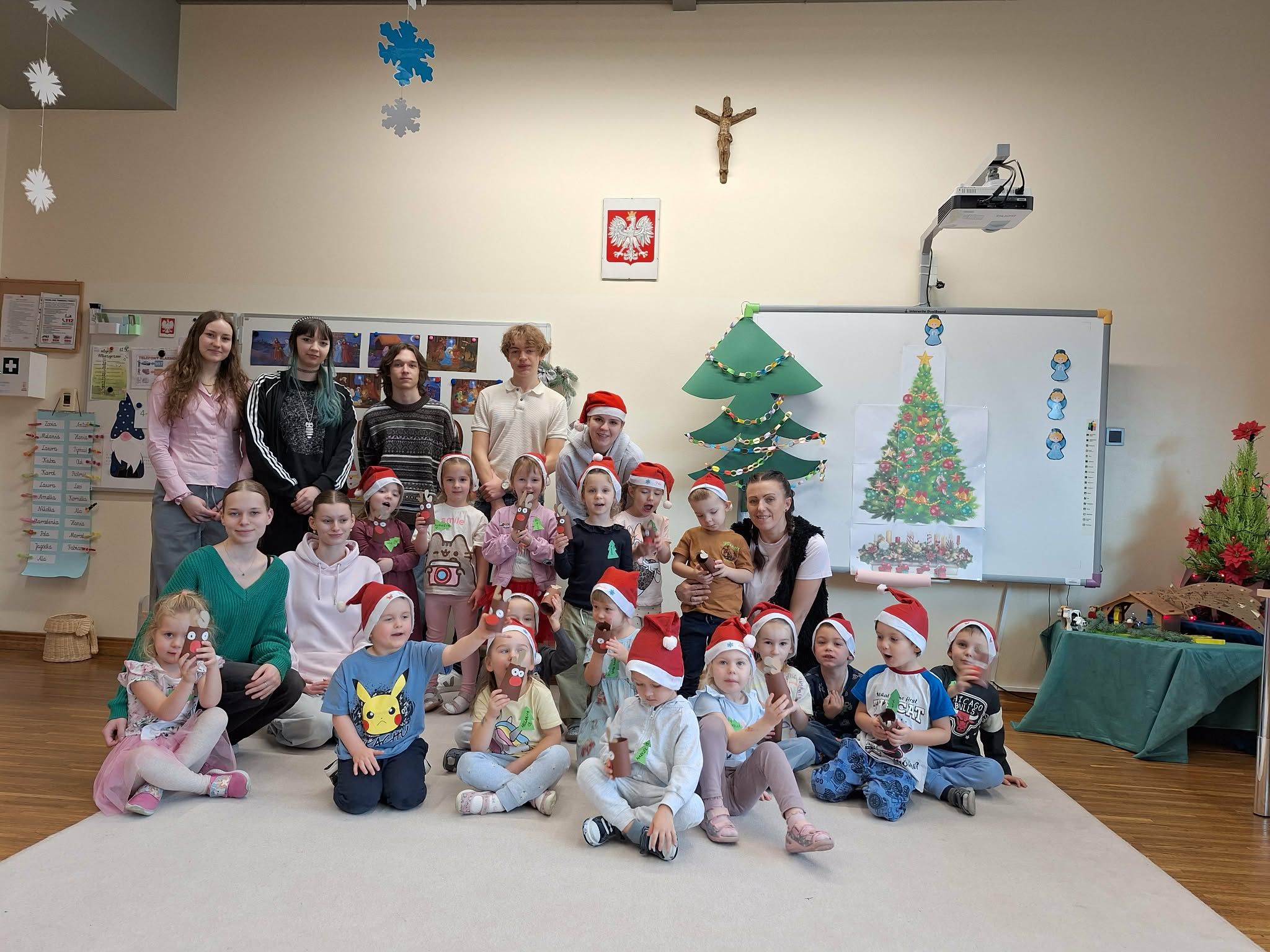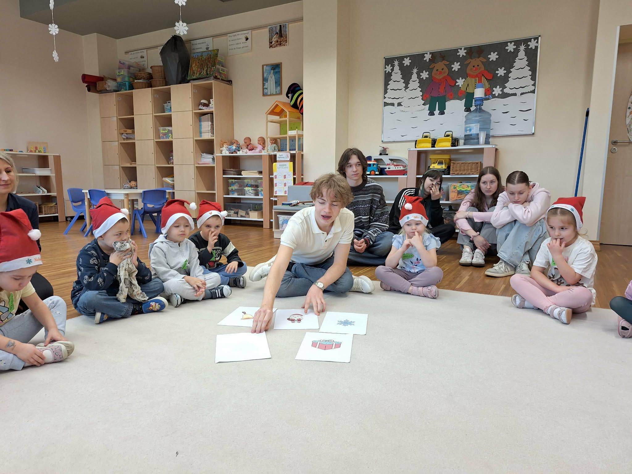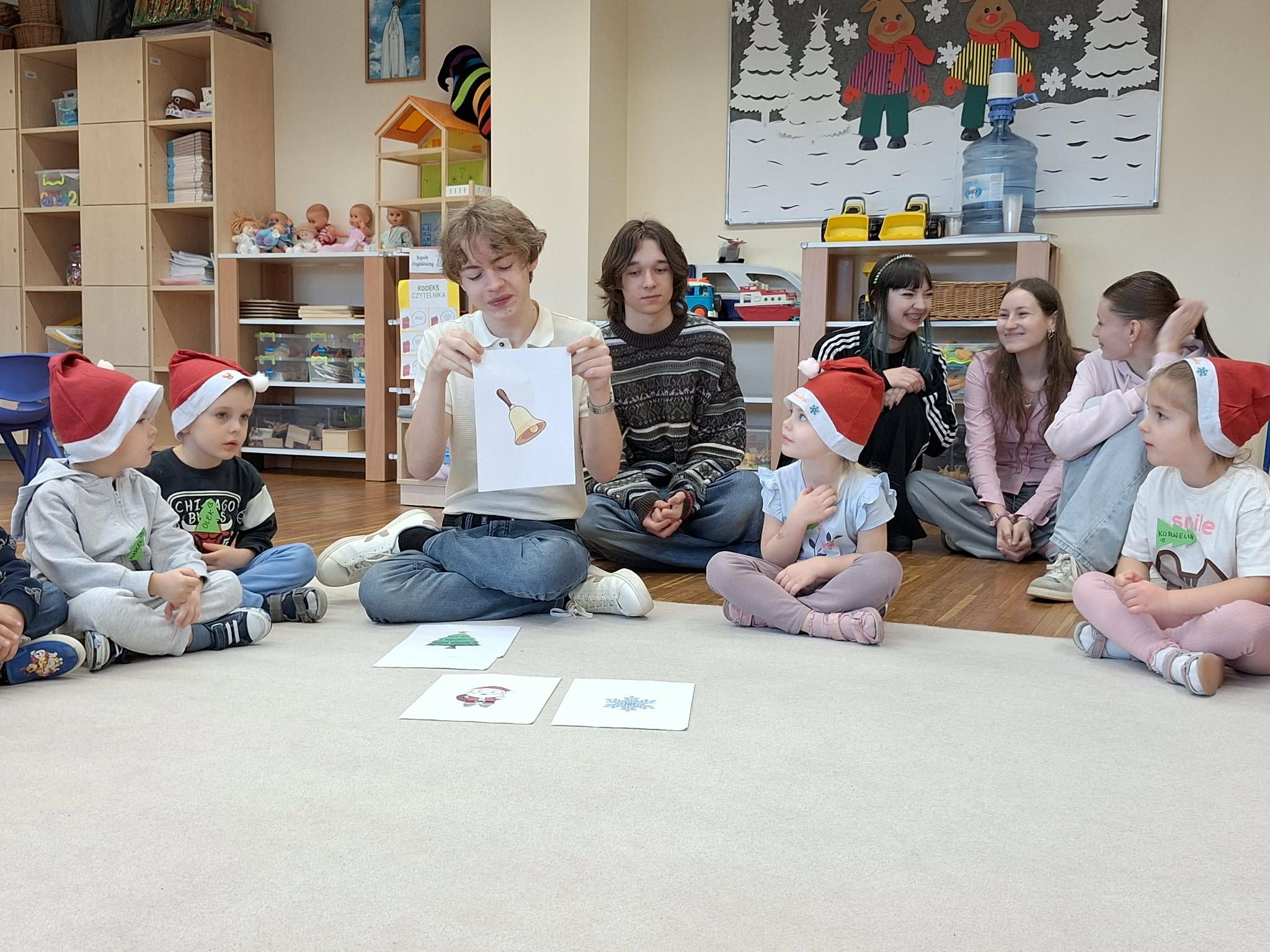 Dzisiaj nasza grupę odwiedzili licealiści z ZSP w Kleszczowie .Przyszli oni w ramach projektu ,,Licealista w przedszkolu ", którego zadaniem było przybliżenie dzieciom tematyki Świąt Bożego Narodzenia w języku angielskim . Dzieci bawiły się z licealistami w różne zabawy ,śpiewali piosenki i wzbogacali słownictwo w zakresie języka angielskiego .Dziękujemy za miłe spotkanie.