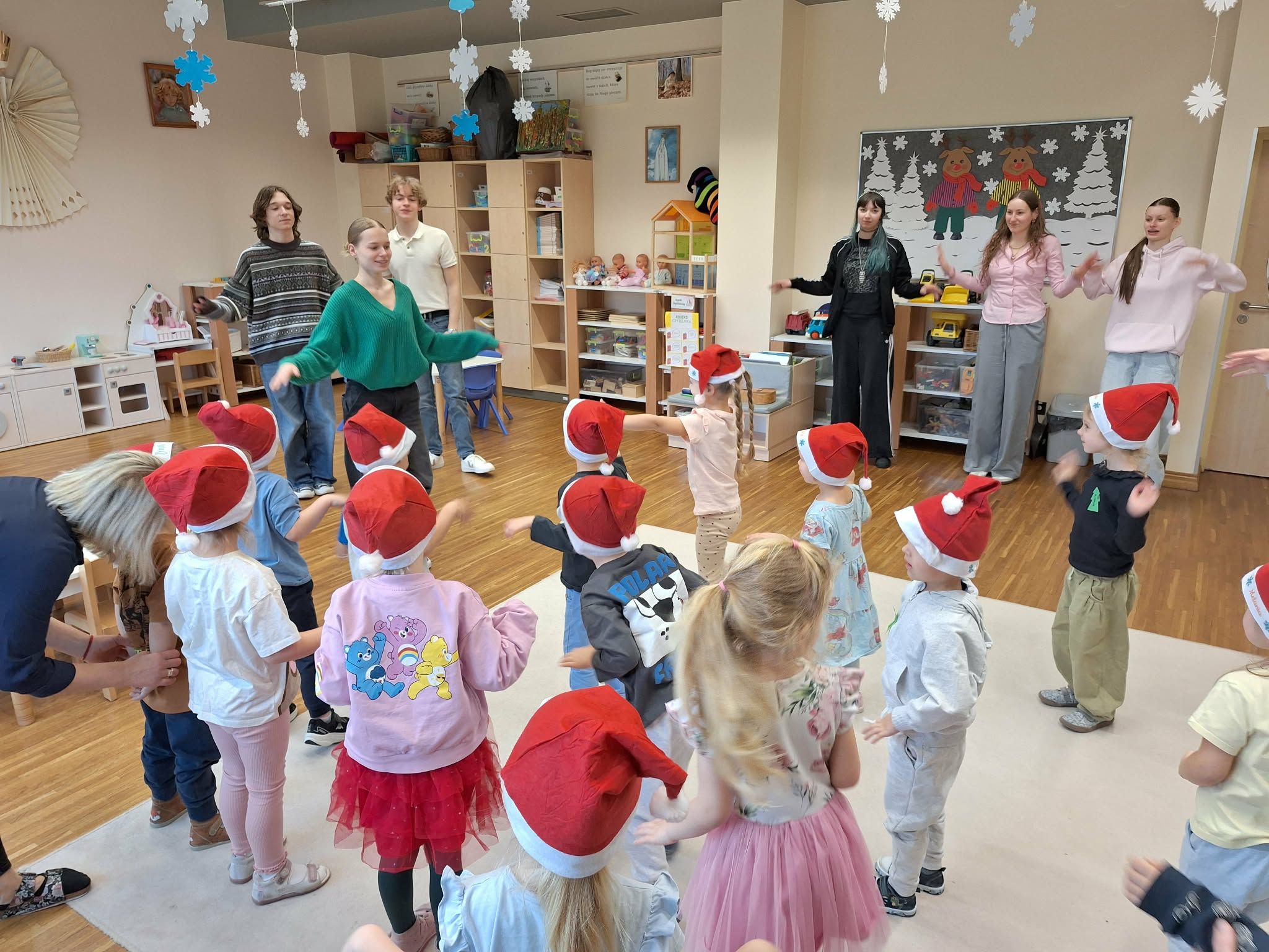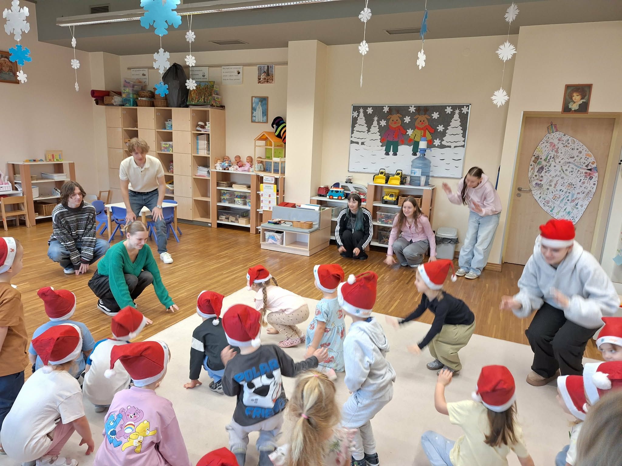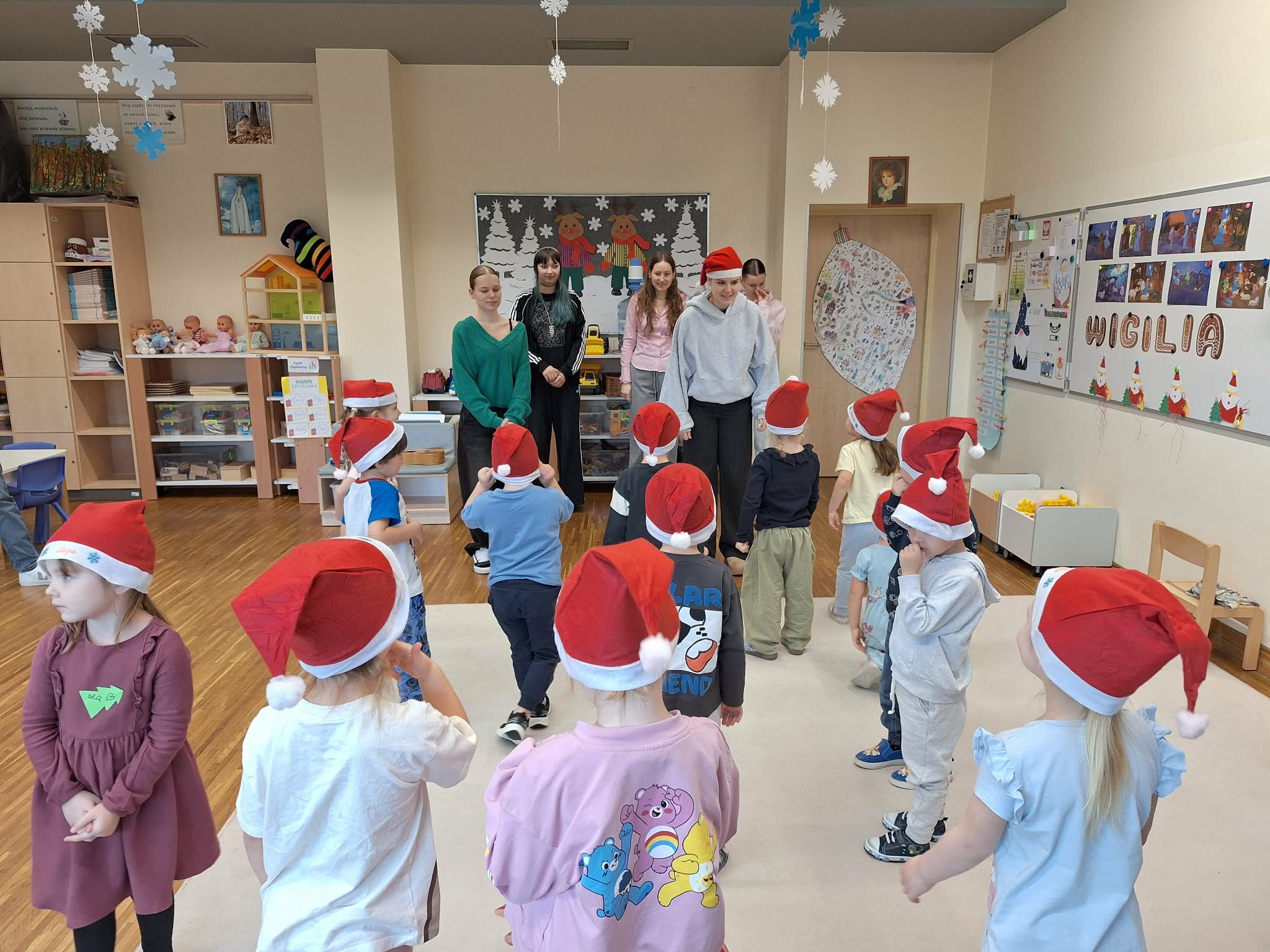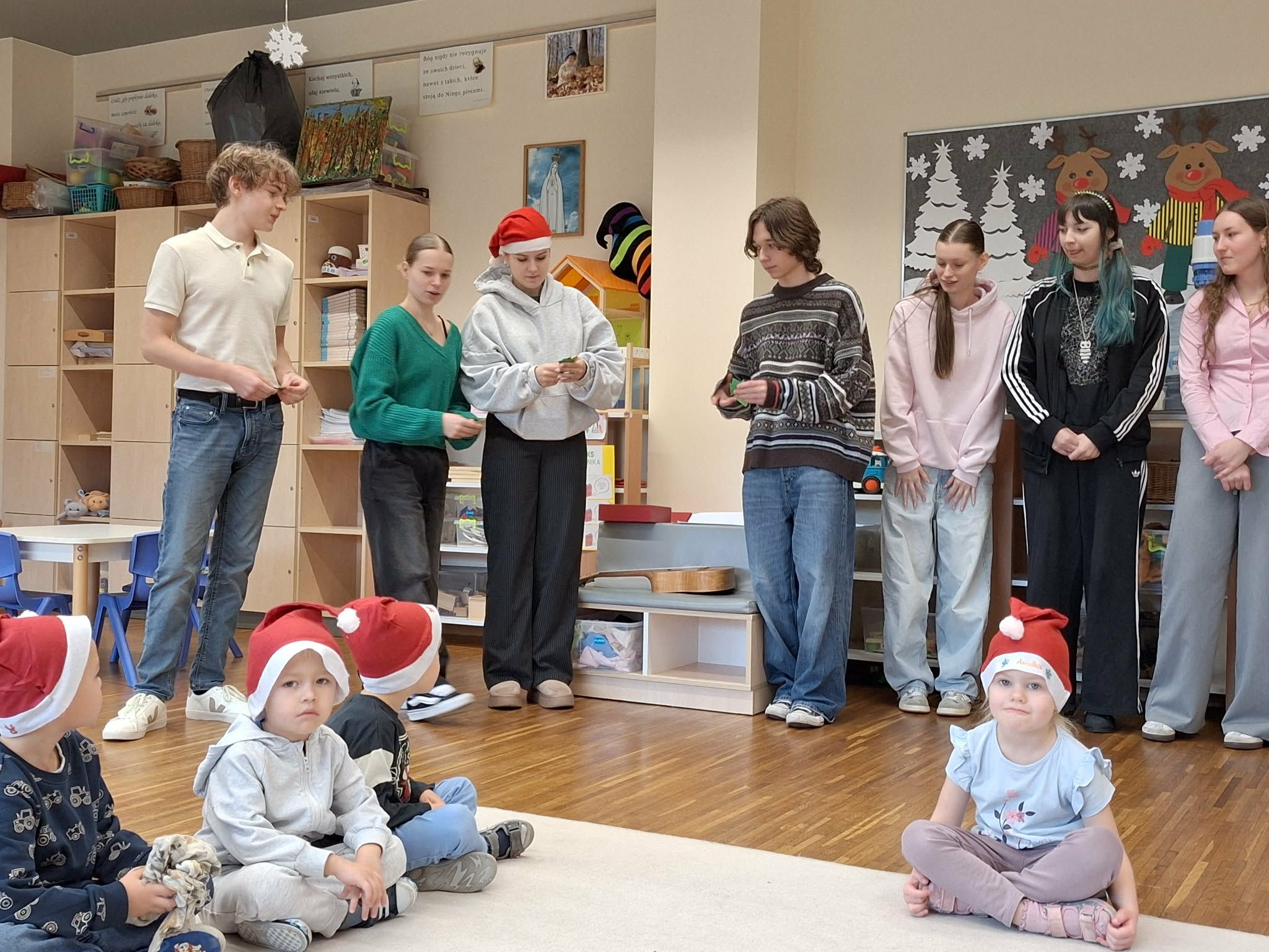 Dzisiaj nasza grupę odwiedzili licealiści z ZSP w Kleszczowie .Przyszli oni w ramach projektu ,,Licealista w przedszkolu ", którego zadaniem było przybliżenie dzieciom tematyki Świąt Bożego Narodzenia w języku angielskim . Dzieci bawiły się z licealistami w różne zabawy ,śpiewali piosenki i wzbogacali słownictwo w zakresie języka angielskiego .Dziękujemy za miłe spotkanie.