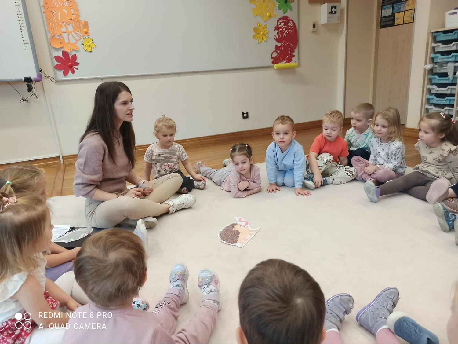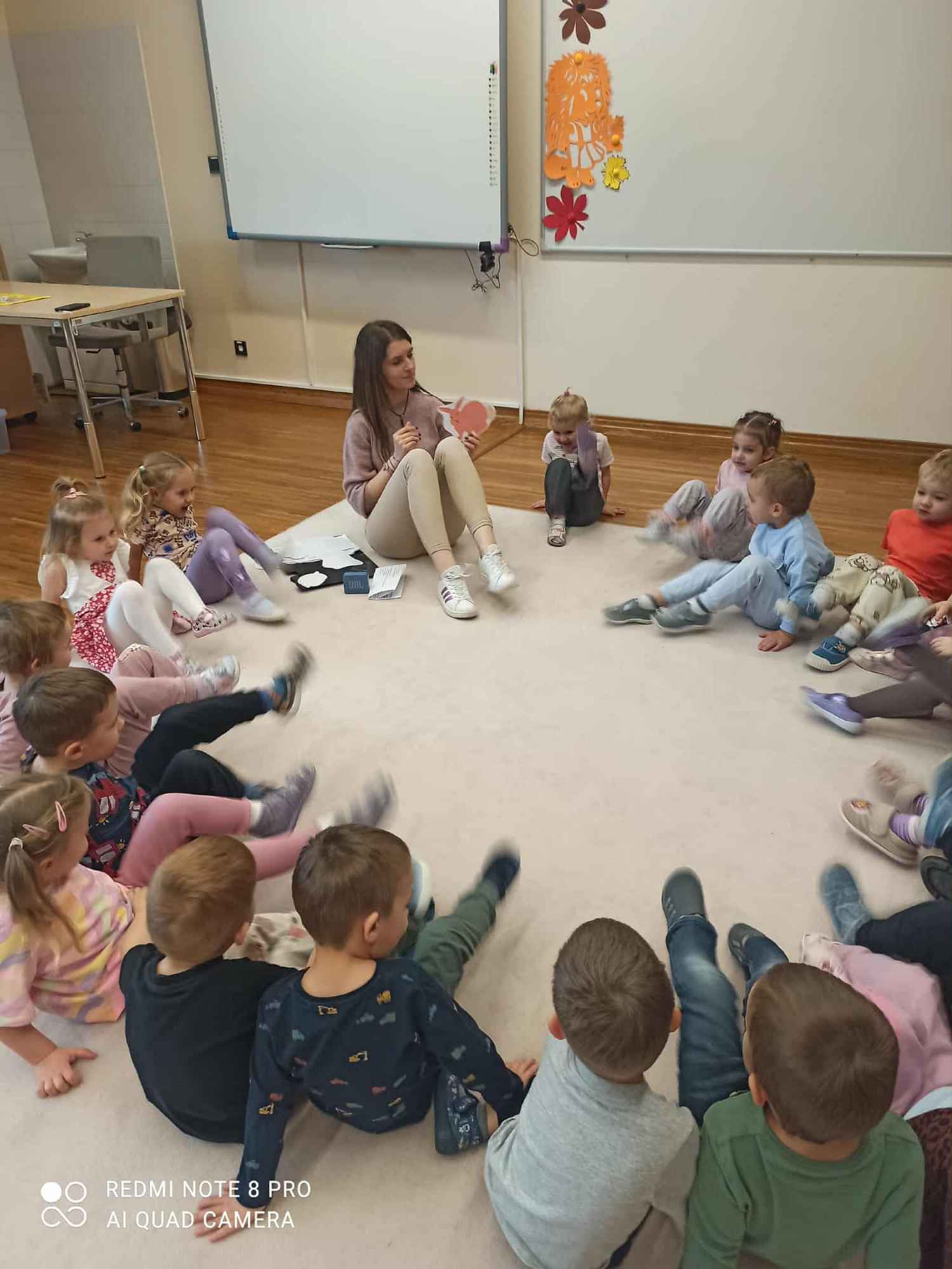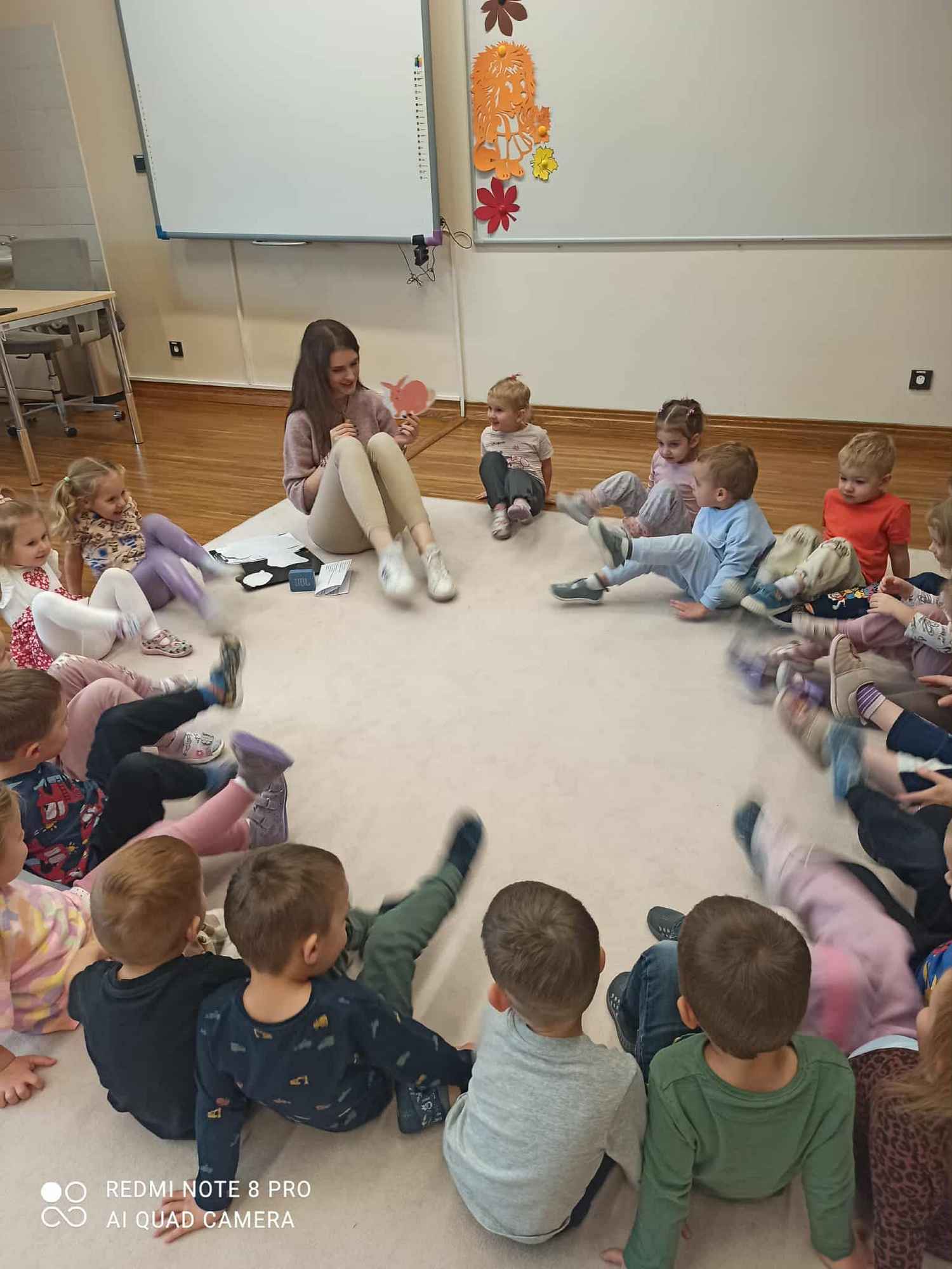 W naszej grupie odbywają się zajęcia logorytmiki z panią Anią. Logorytmika łączy elementy logopedii (terapii mowy) z rytmiką (muzyką i ruchem). Jej głównym celem jest wspieranie rozwoju mowy poprzez ćwiczenia słowno-muzyczno-ruchowe, które wpływają na sferę słuchową, słuchowo-ruchową i ruchową. A wszystko to oprawione w zabawę, której atrakcyjność nie tylko rozwija zainteresowania dzieci, ale również podwyższa motywację, pewność siebie, zdolności skojarzeniowe, rozwija koncentrację uwagi i pamięć. Trzylatki podczas zabaw i ćwiczeń pod okiem logopedy, mają szansę uniknąć złych nawyków, błędów i wad wymowy.