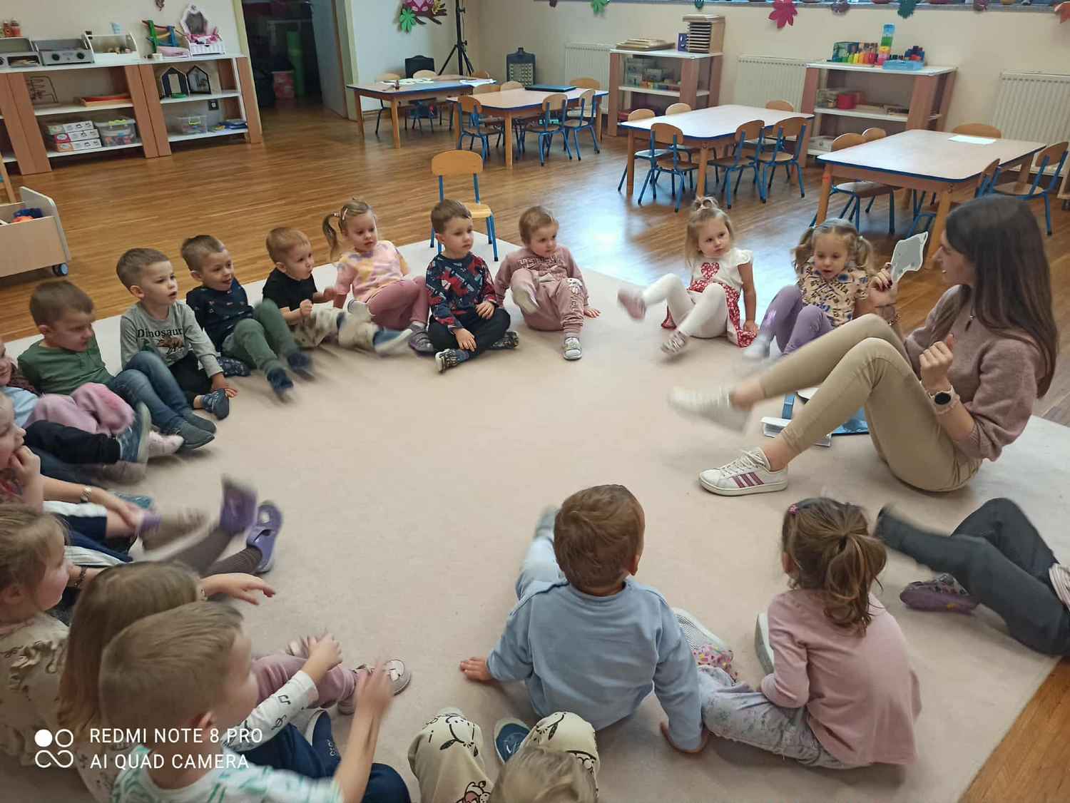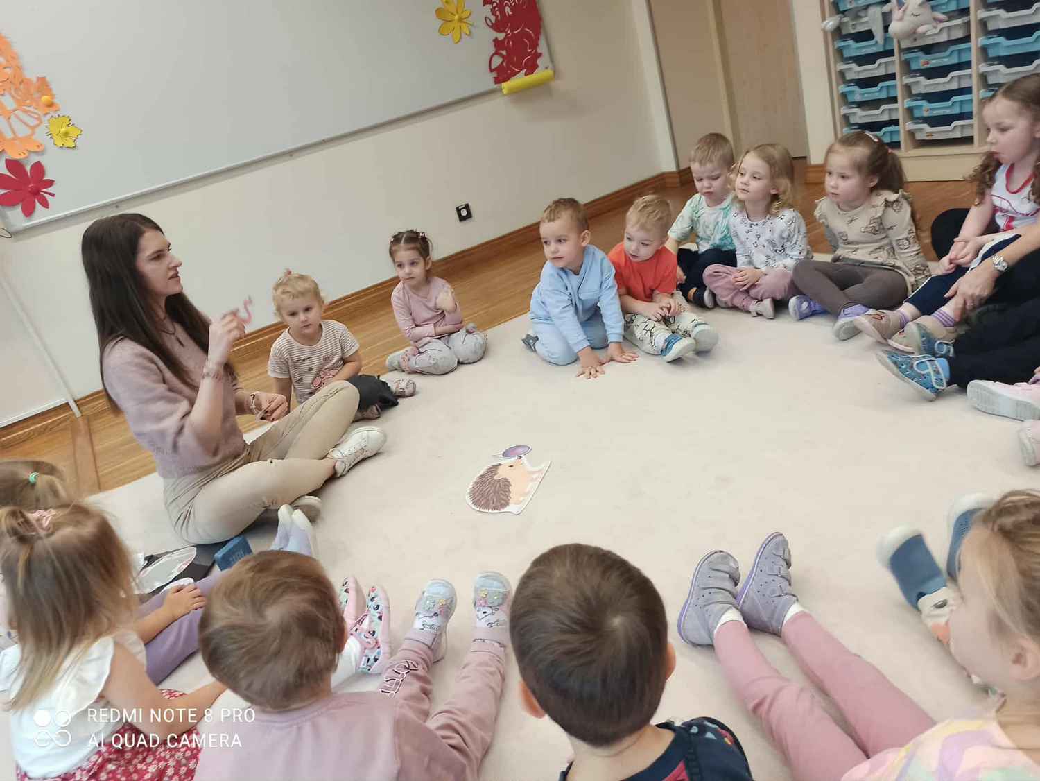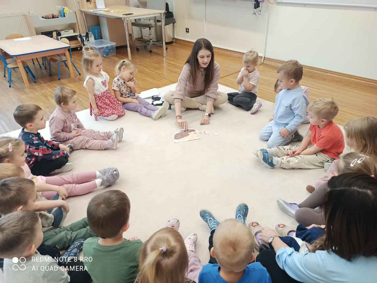 W naszej grupie odbywają się zajęcia logorytmiki z panią Anią. Logorytmika łączy elementy logopedii (terapii mowy) z rytmiką (muzyką i ruchem). Jej głównym celem jest wspieranie rozwoju mowy poprzez ćwiczenia słowno-muzyczno-ruchowe, które wpływają na sferę słuchową, słuchowo-ruchową i ruchową. A wszystko to oprawione w zabawę, której atrakcyjność nie tylko rozwija zainteresowania dzieci, ale również podwyższa motywację, pewność siebie, zdolności skojarzeniowe, rozwija koncentrację uwagi i pamięć. Trzylatki podczas zabaw i ćwiczeń pod okiem logopedy, mają szansę uniknąć złych nawyków, błędów i wad wymowy.