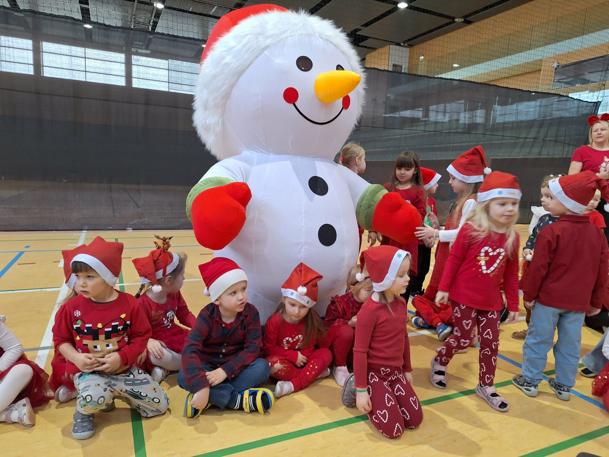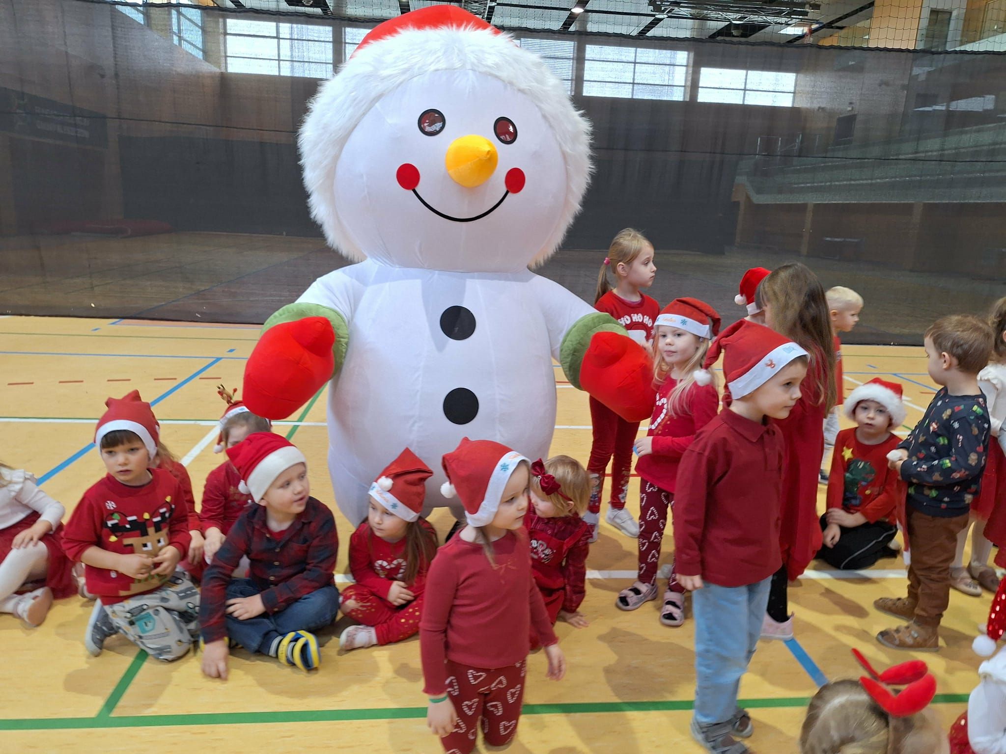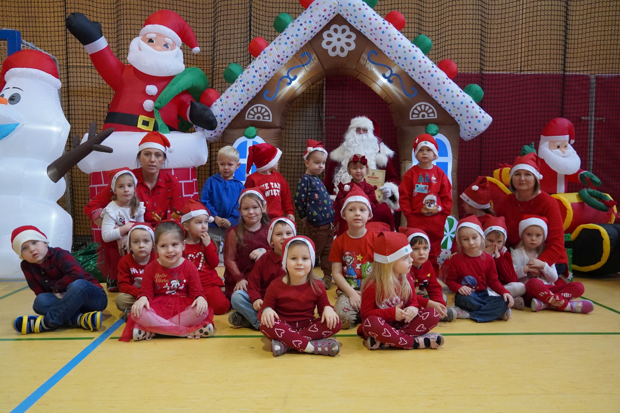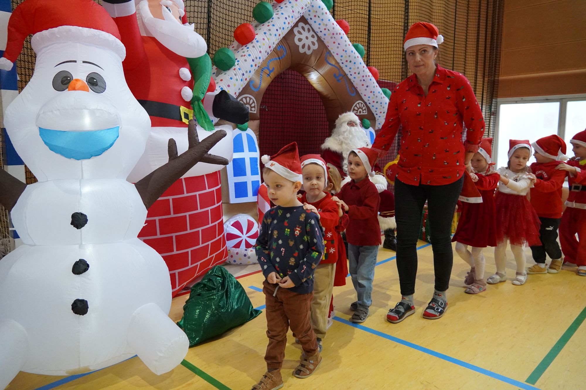 2 grudnia wszystkie dzieci zebrały się na sali gimnastycznej, gdzie zostały zaproszone do wspólnej zabawy z Mikołajem. Przedszkolaki brały udział w różnych wesołych aktywnościach, m.in. w ubieraniu bałwanka oraz zabawach przy świątecznej muzyce. Po części wspólnej każda grupa kolejno miała wyjątkową możliwość przejażdżki saniami Świętego Mikołaja, co dostarczyło dzieciom wielu emocji i radości. Po powrocie do swoich sal na przedszkolaków czekała kolejna niespodzianka — pięknie zapakowane prezenty, przygotowane specjalnie na tę okazję. To był pełen uśmiechów i świątecznej magii dzień.