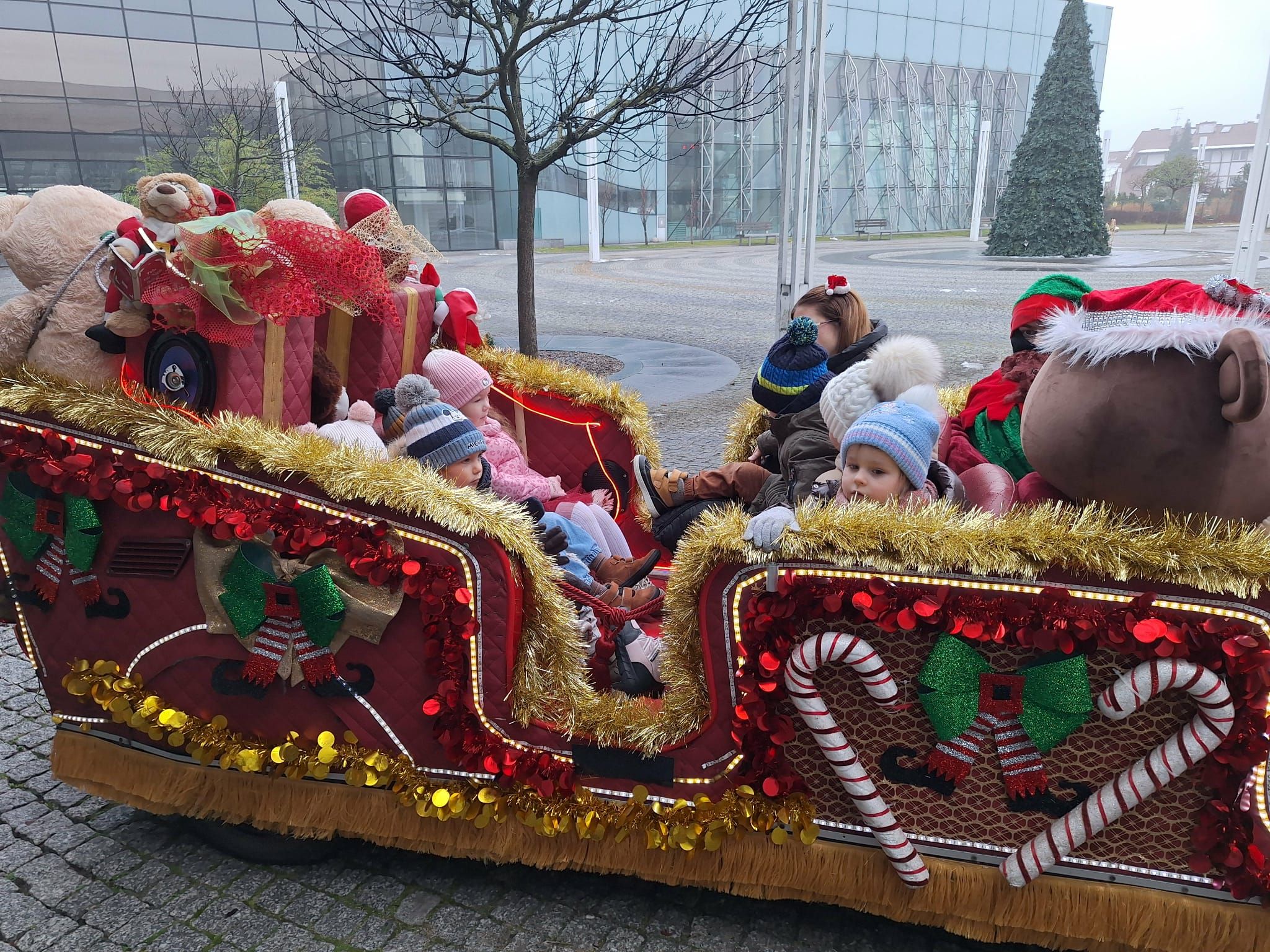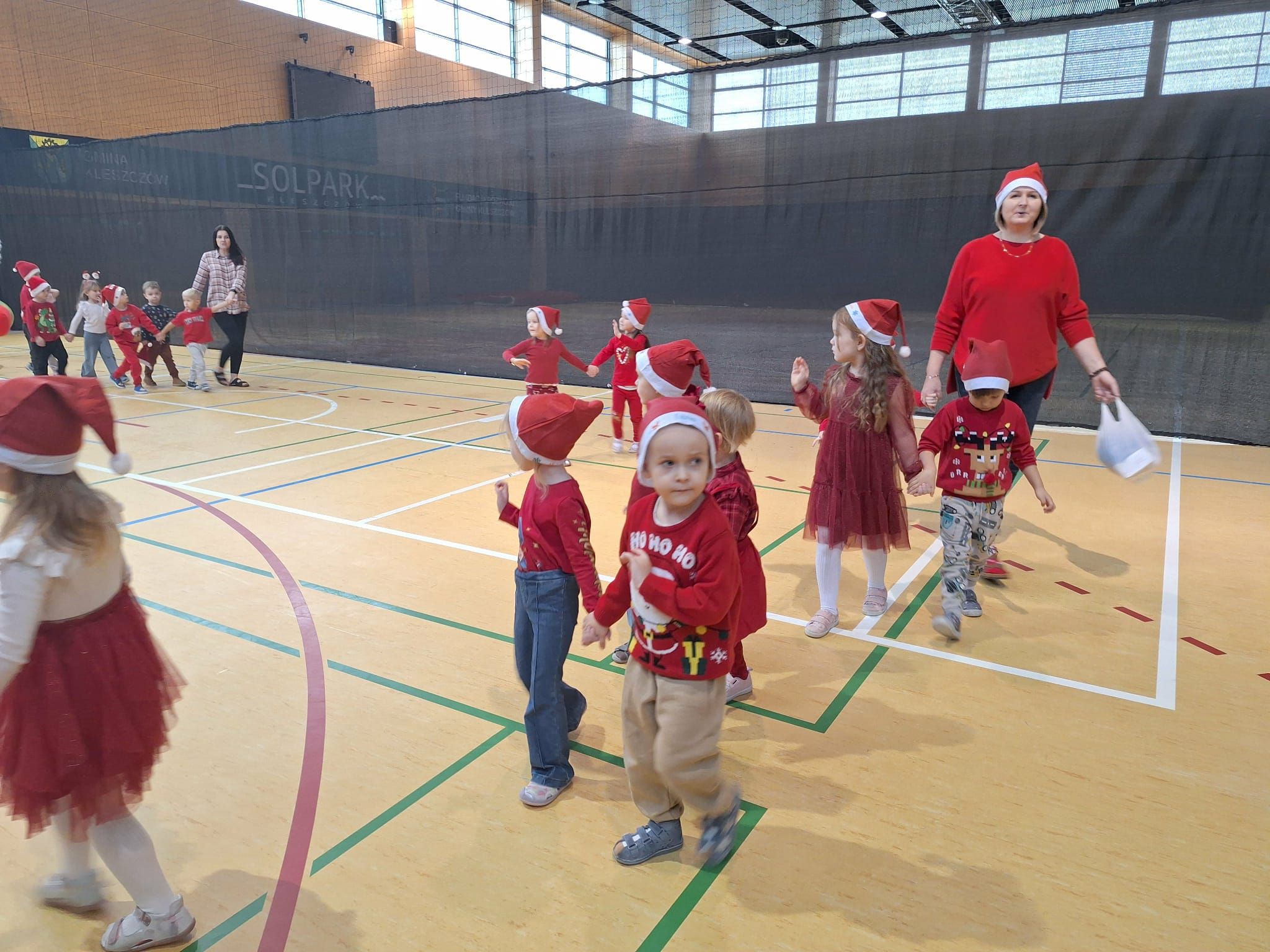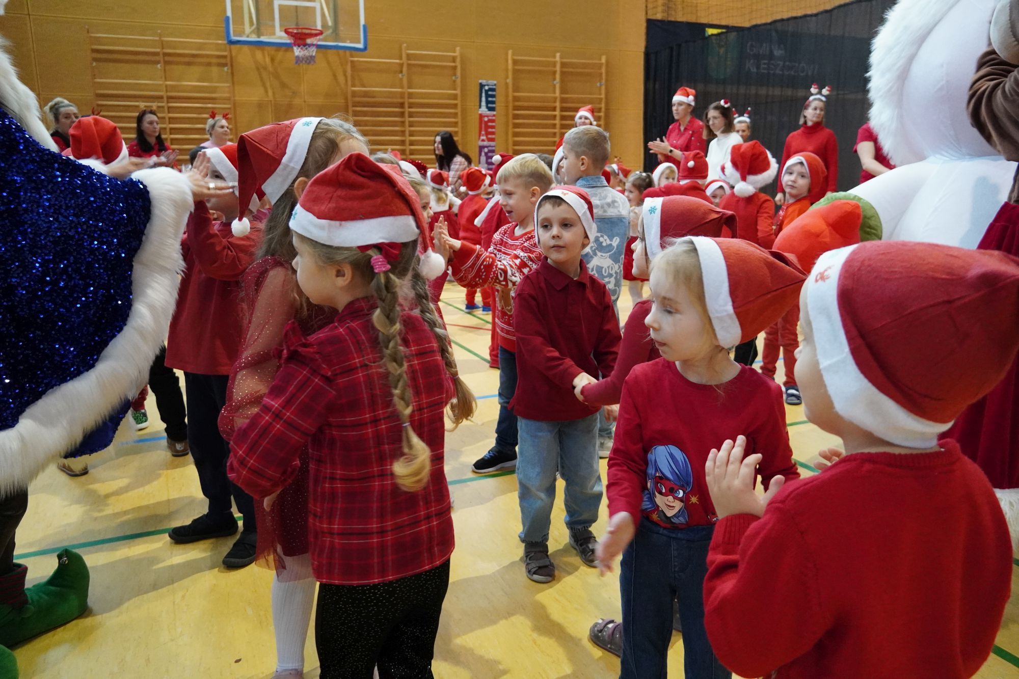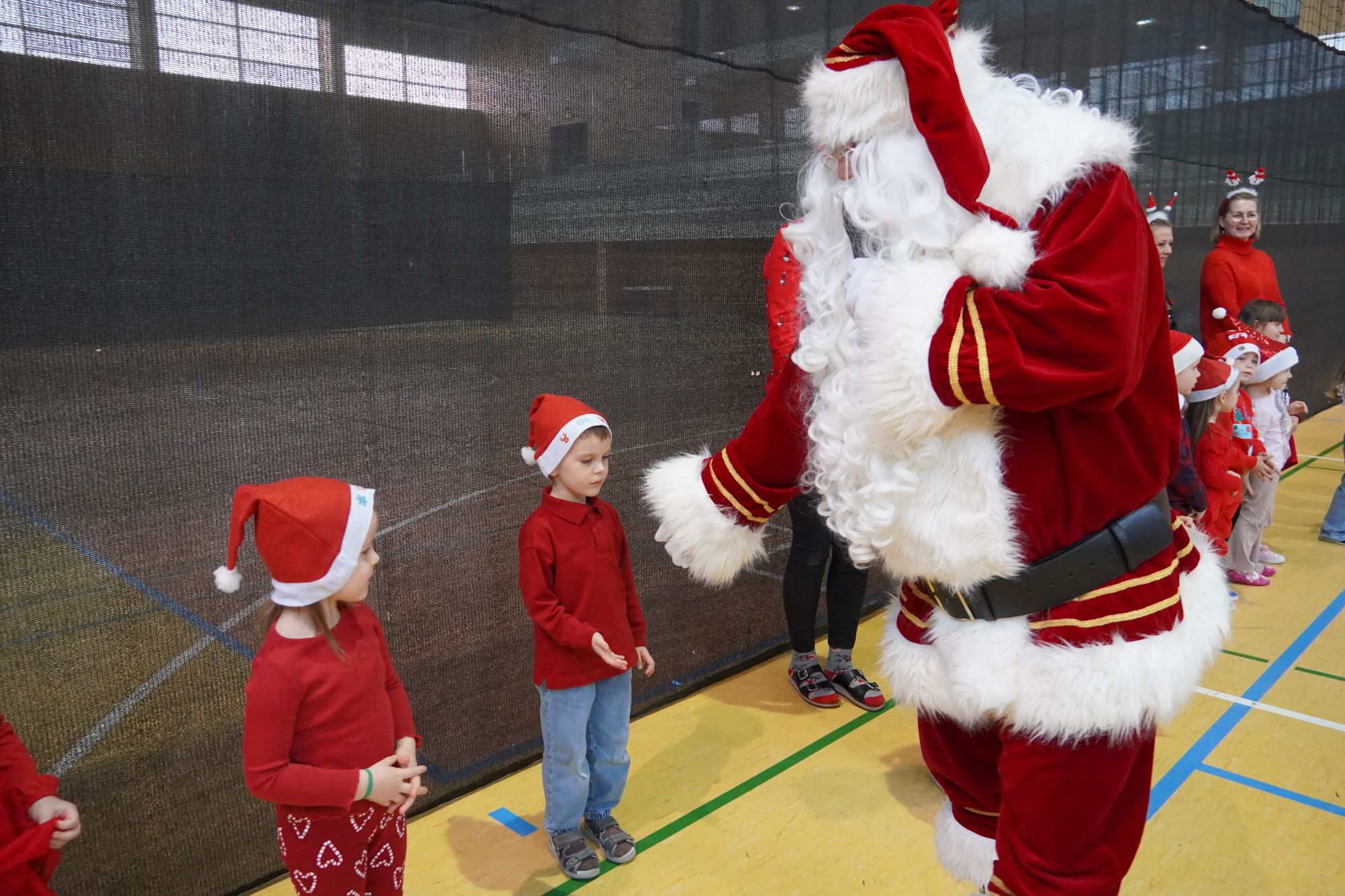 2 grudnia wszystkie dzieci zebrały się na sali gimnastycznej, gdzie zostały zaproszone do wspólnej zabawy z Mikołajem. Przedszkolaki brały udział w różnych wesołych aktywnościach, m.in. w ubieraniu bałwanka oraz zabawach przy świątecznej muzyce. Po części wspólnej każda grupa kolejno miała wyjątkową możliwość przejażdżki saniami Świętego Mikołaja, co dostarczyło dzieciom wielu emocji i radości. Po powrocie do swoich sal na przedszkolaków czekała kolejna niespodzianka — pięknie zapakowane prezenty, przygotowane specjalnie na tę okazję. To był pełen uśmiechów i świątecznej magii dzień.