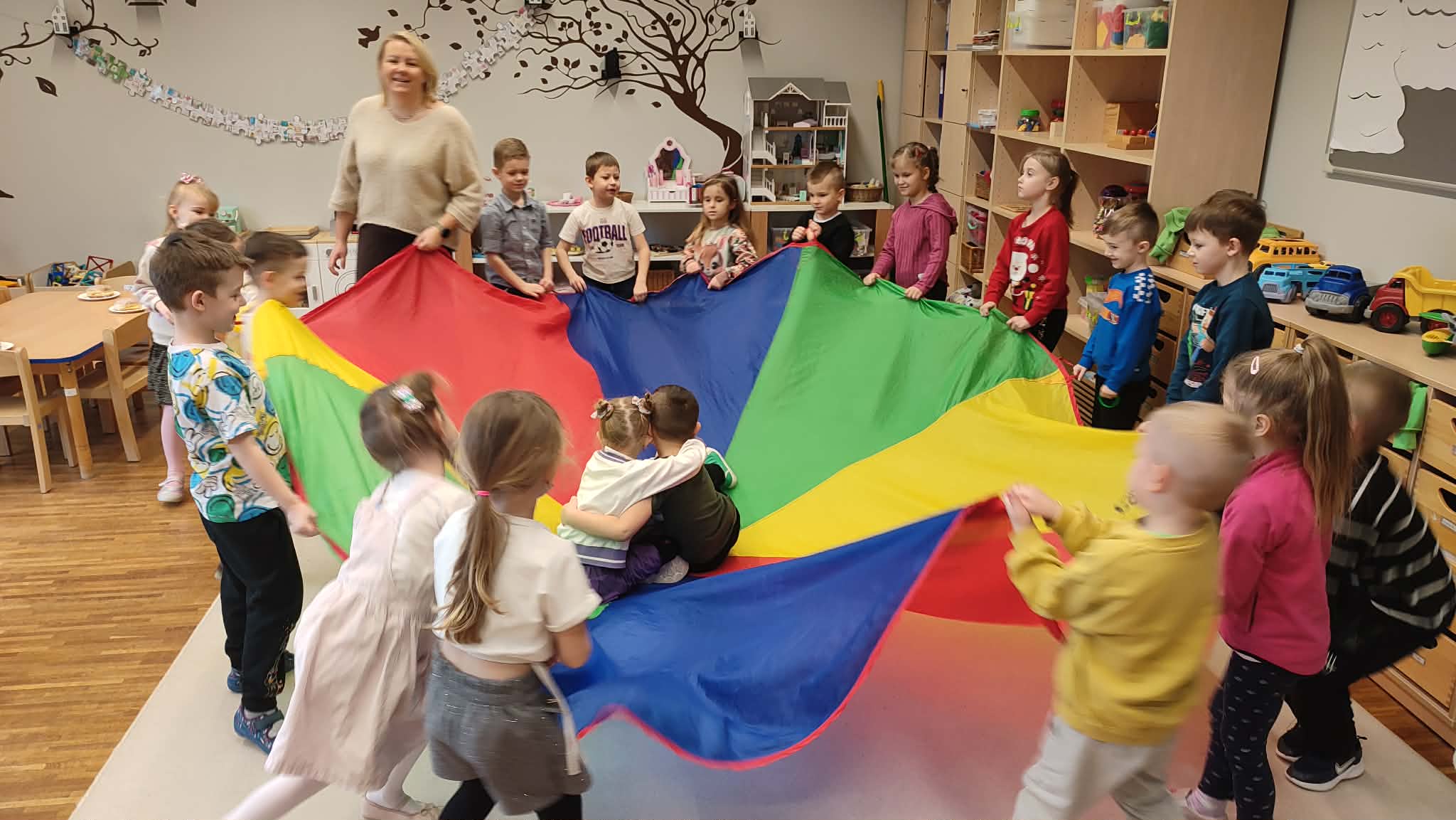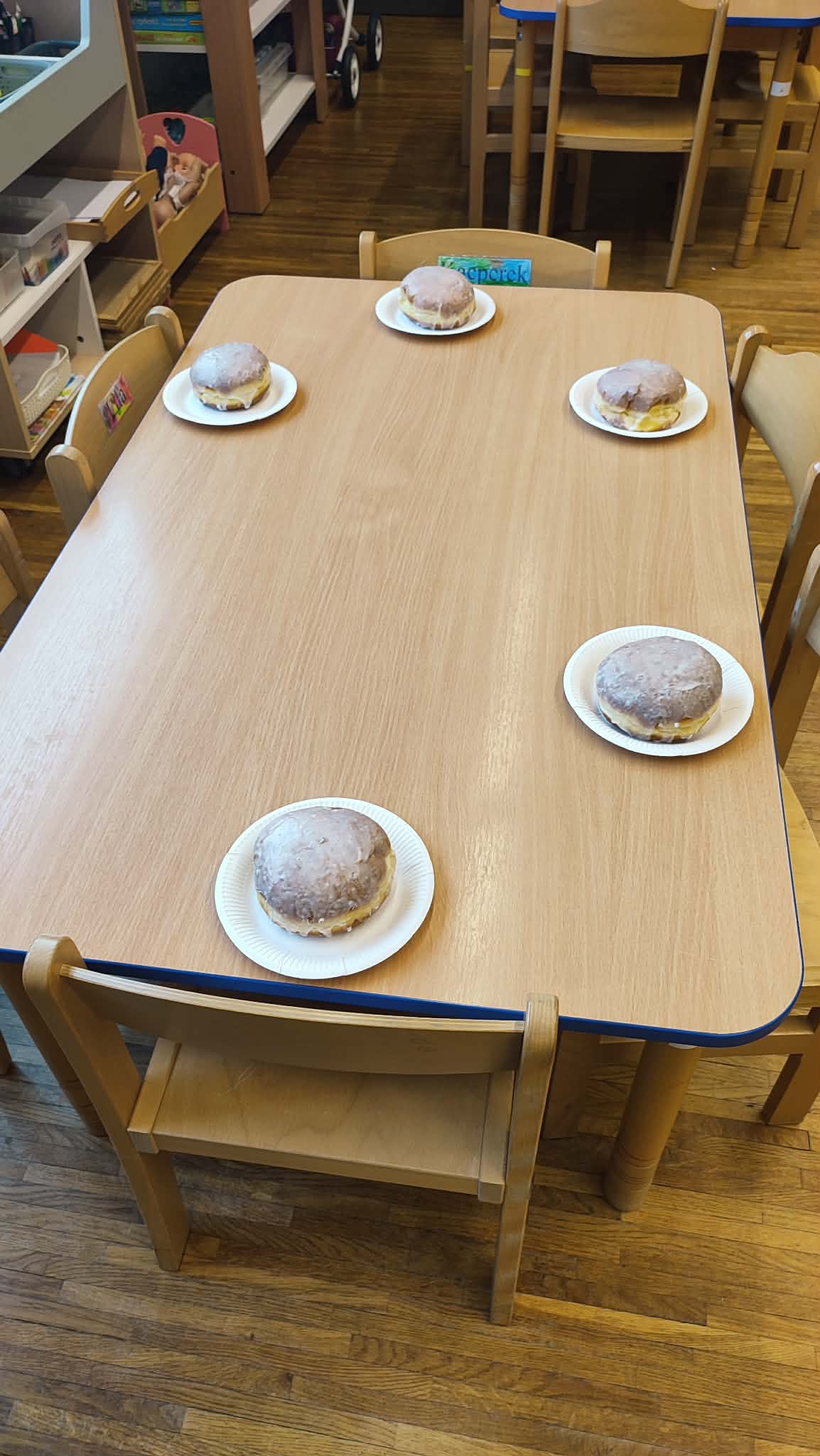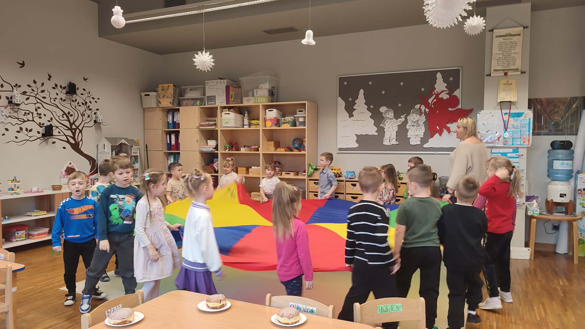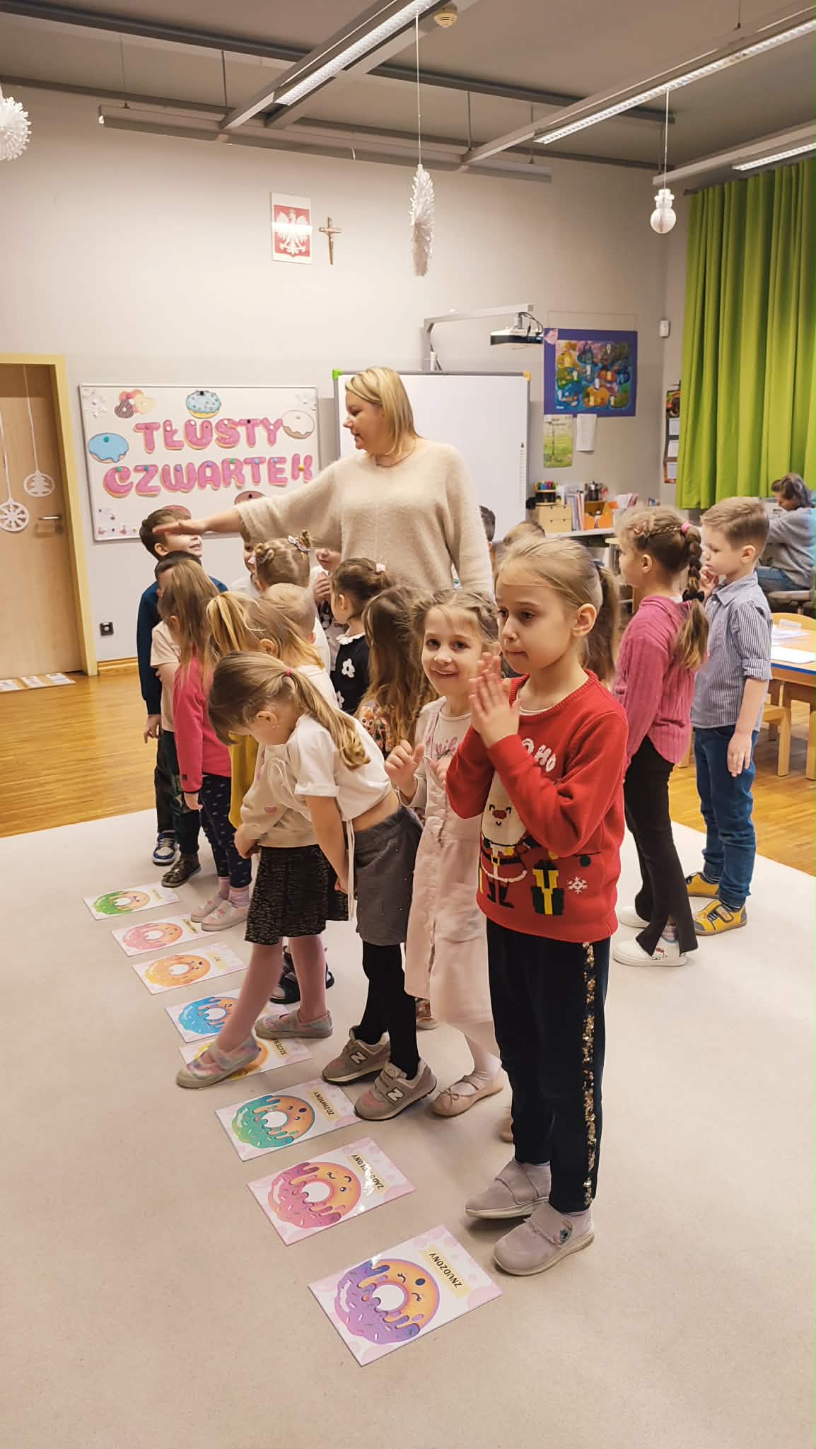 Tłusty Czwartek w naszym przedszkolu był dniem pełnym słodkich tradycji i radosnej atmosfery. Dzieci uczestniczyły w zajęciach poświęconych temu wyjątkowemu dniu, podczas których poznały historię oraz zwyczaje związane z pieczeniem i jedzeniem pączków. Przedszkolaki dowiedziały się, jakie są różne rodzaje pączków oraz jakie nadzienia mogą kryć się w ich wnętrzu. Poznały także przepis na tradycyjne pączki i kolejne etapy ich przygotowania. Nie zabrakło również wesołych zabaw z wykorzystaniem pączków oraz aktywności ruchowych z chustą animacyjną, które sprawiły dzieciom wiele radości. To był dzień pełen uśmiechu, nauki i wspólnego świętowania polskich tradycji.