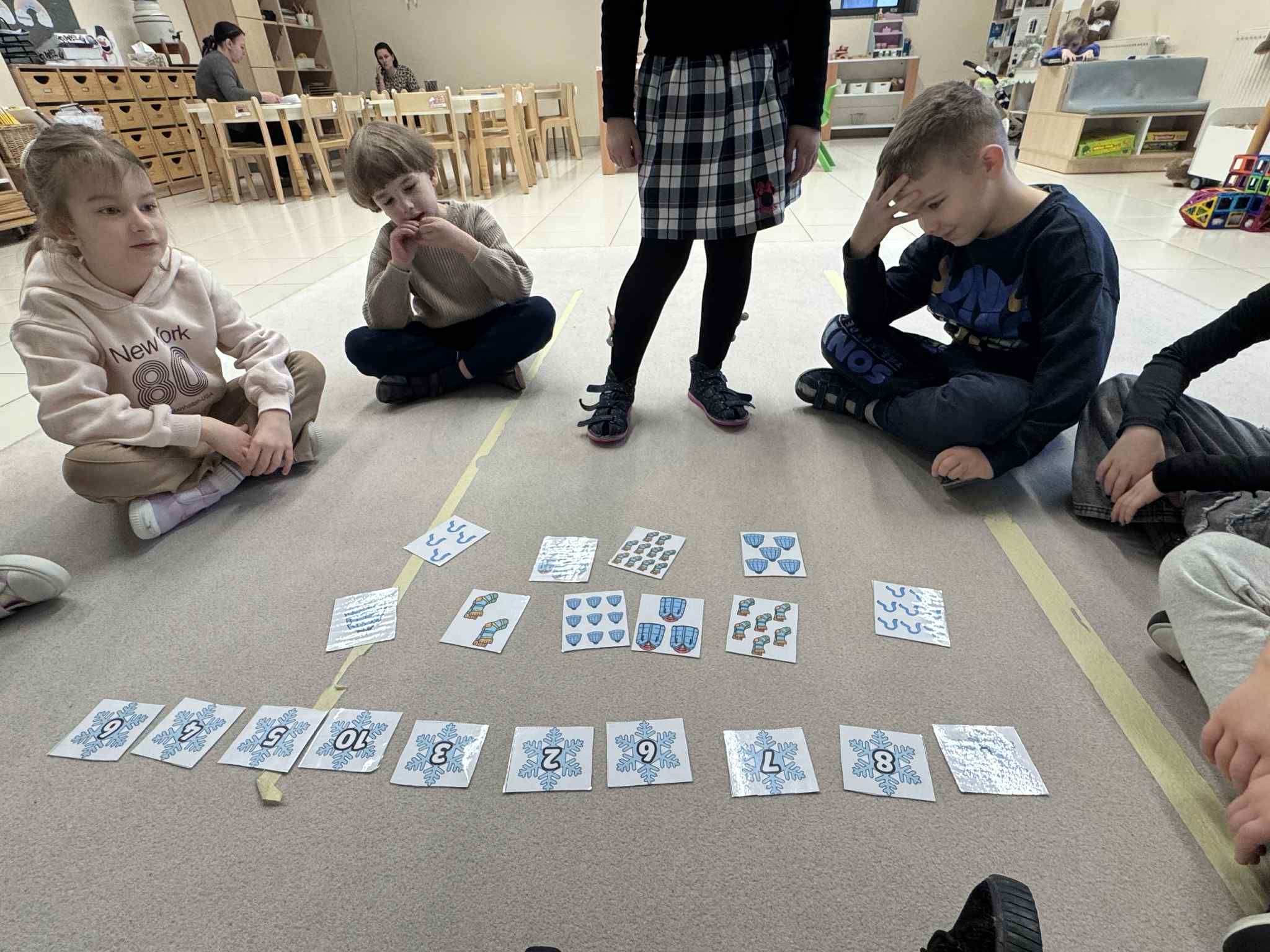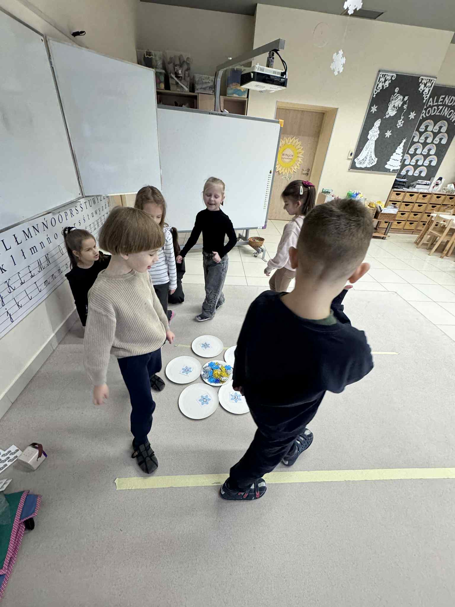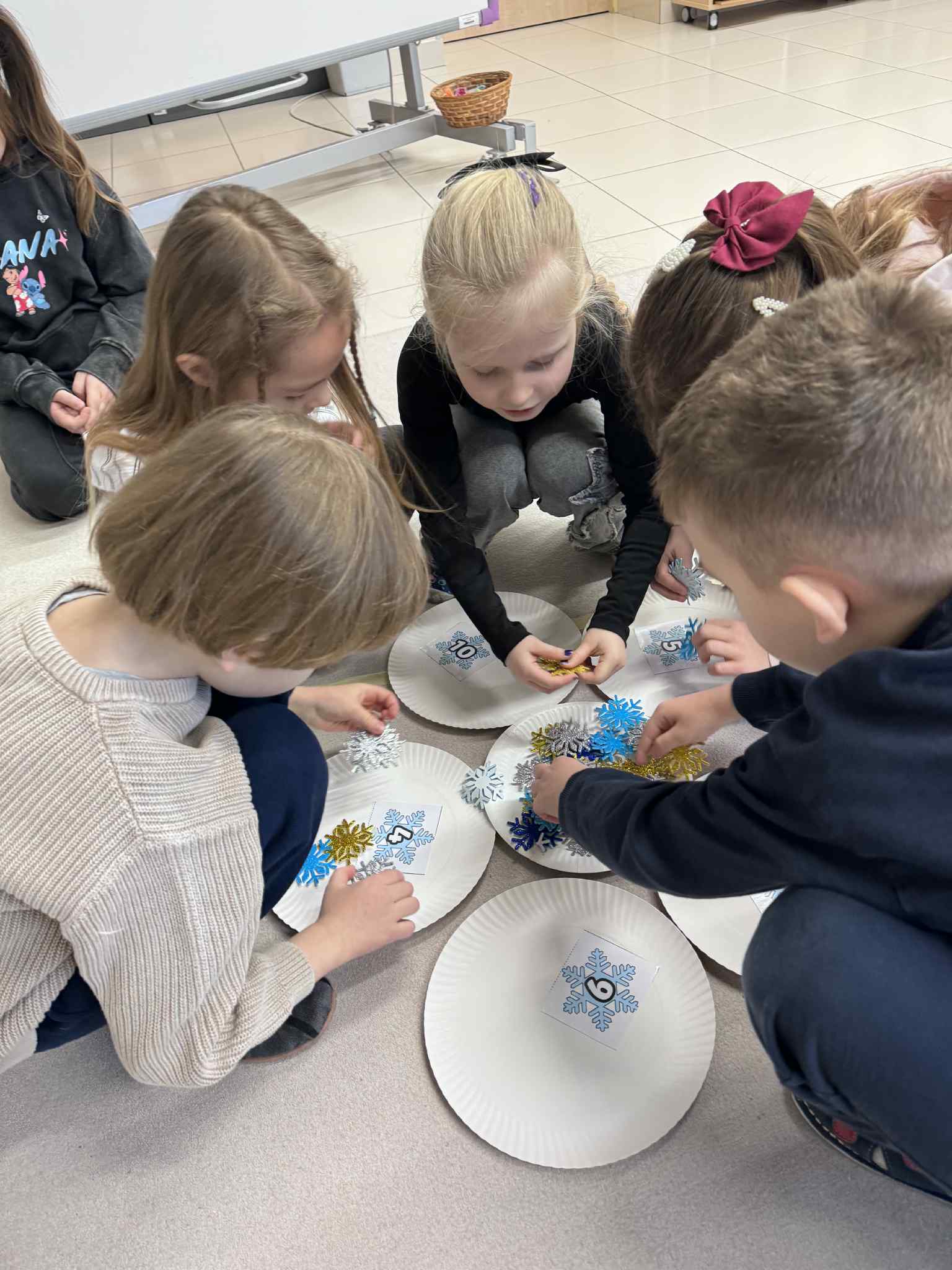 W ramach realizacji zadania 4 „Maths is Action” dzieci uczestniczyły w zabawie matematyczno-ruchowej, podczas której aktywnie liczyły śnieżynki. Nauka odbywała się poprzez ruch i działanie, co sprzyjało zaangażowaniu i radości z odkrywania matematyki.Następnie dzieci liczyły i nazywały w języku angielskim zimowe ubrania, utrwalając słownictwo związane z porą zimową. Połączenie aktywności ruchowej z elementami językowymi pozwoliło na naturalne przyswajanie treści matematycznych i językowych.