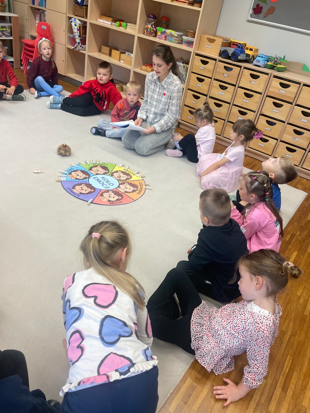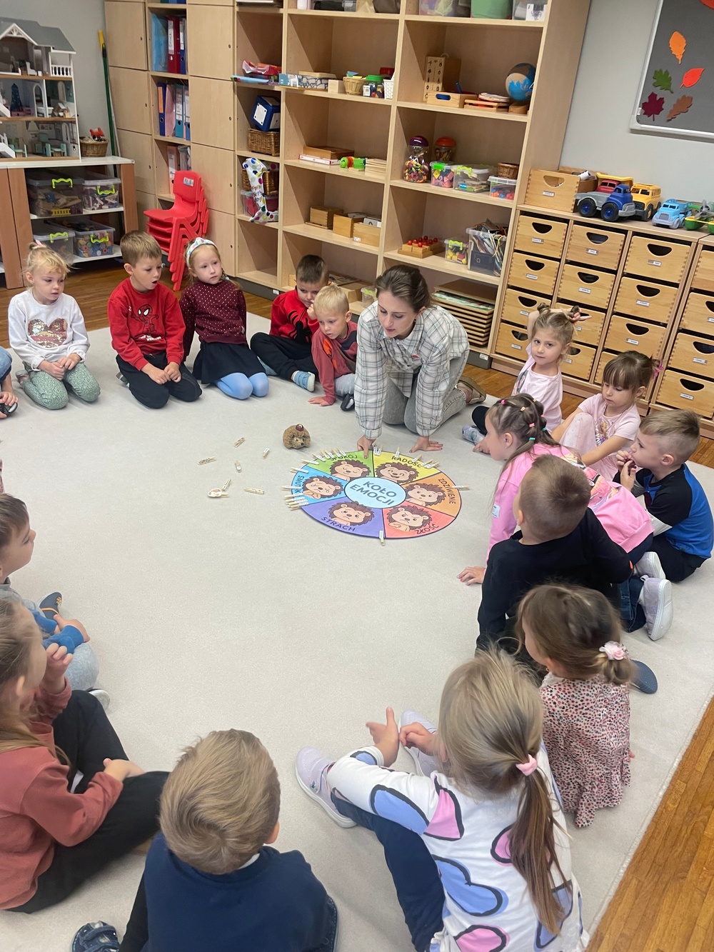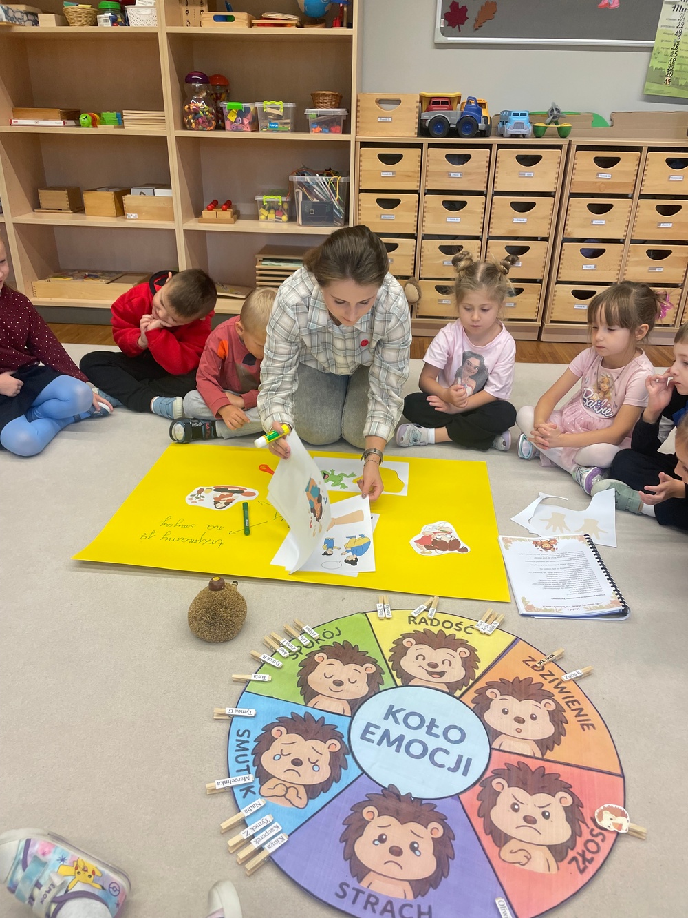 Zajęcia 3 – „Złość – czyli kłótnia o orzech”. Podczas zajęć dzieci wysłuchały opowiadania „Złość – czyli kłótnia o orzech”, które pomogło im zrozumieć, że złość jest naturalną i potrzebną emocją, choć bywa trudna do opanowania. Wspólnie omawiały sytuacje, w których pojawia się złość, oraz sposoby jej bezpiecznego wyrażania. Poprzez rozmowę, zabawy ruchowe i elementy dramy dzieci ćwiczyły rozpoznawanie oznak złości i poznawały sposoby radzenia sobie z nią w sposób akceptowalny społecznie.