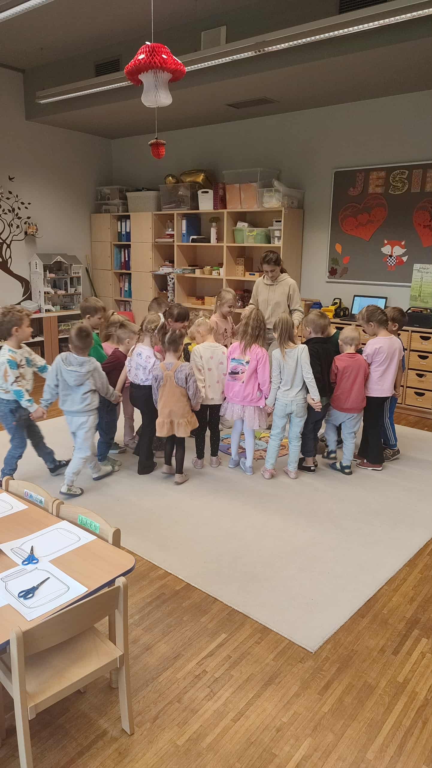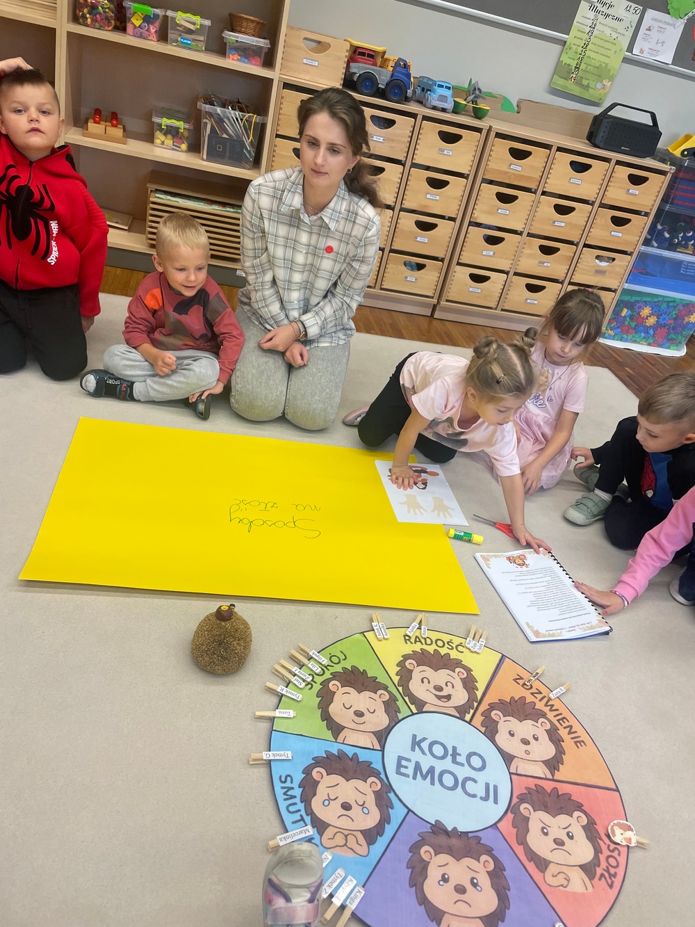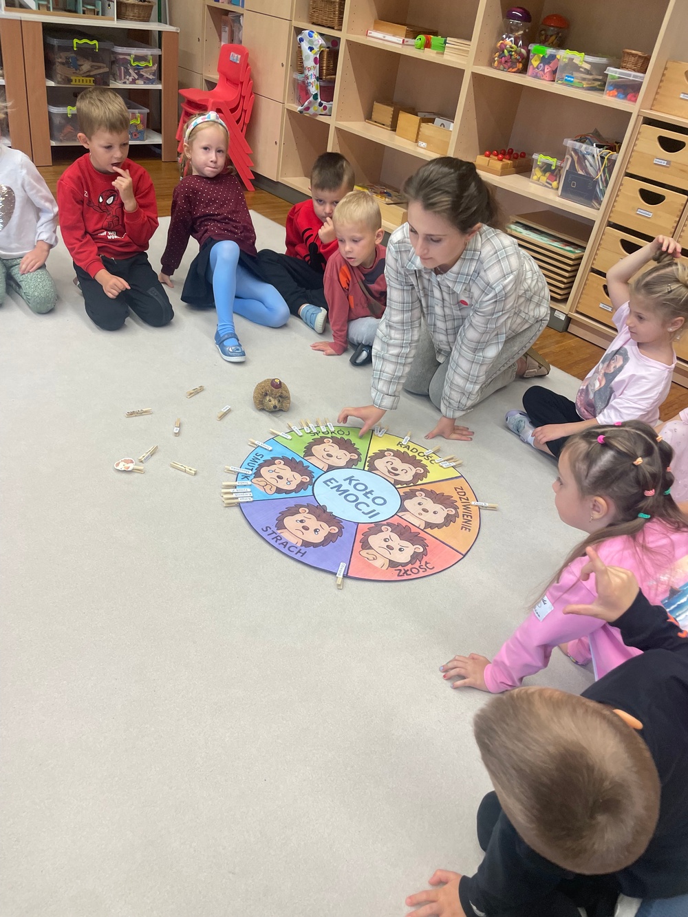 Zajęcia 3 – „Złość – czyli kłótnia o orzech”. Podczas zajęć dzieci wysłuchały opowiadania „Złość – czyli kłótnia o orzech”, które pomogło im zrozumieć, że złość jest naturalną i potrzebną emocją, choć bywa trudna do opanowania. Wspólnie omawiały sytuacje, w których pojawia się złość, oraz sposoby jej bezpiecznego wyrażania. Poprzez rozmowę, zabawy ruchowe i elementy dramy dzieci ćwiczyły rozpoznawanie oznak złości i poznawały sposoby radzenia sobie z nią w sposób akceptowalny społecznie.