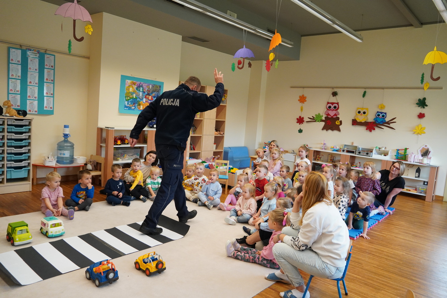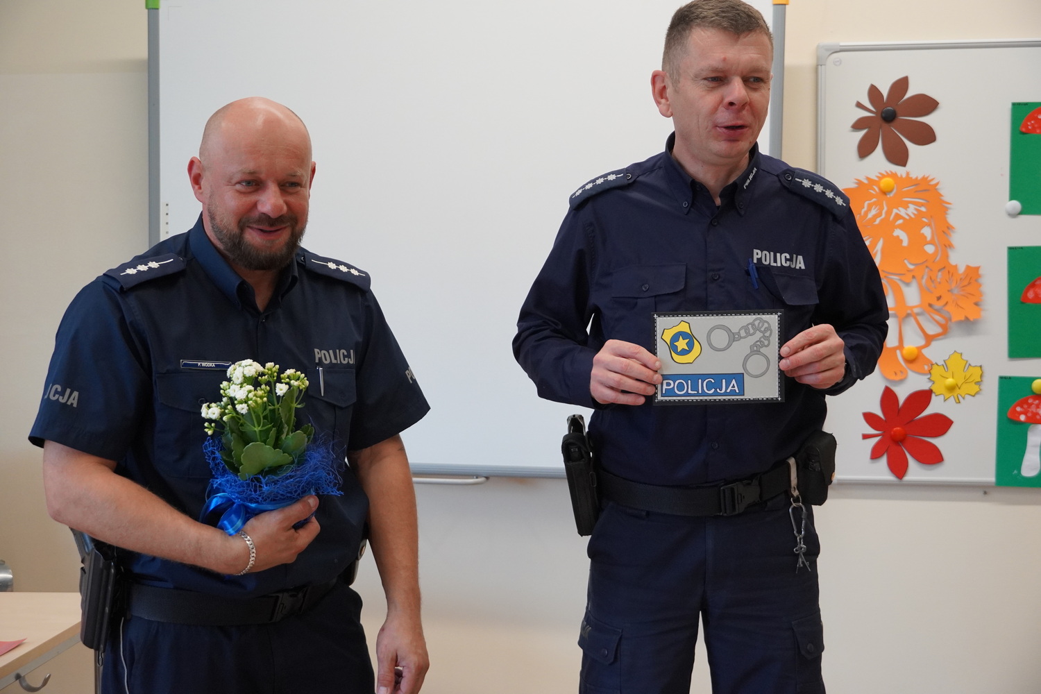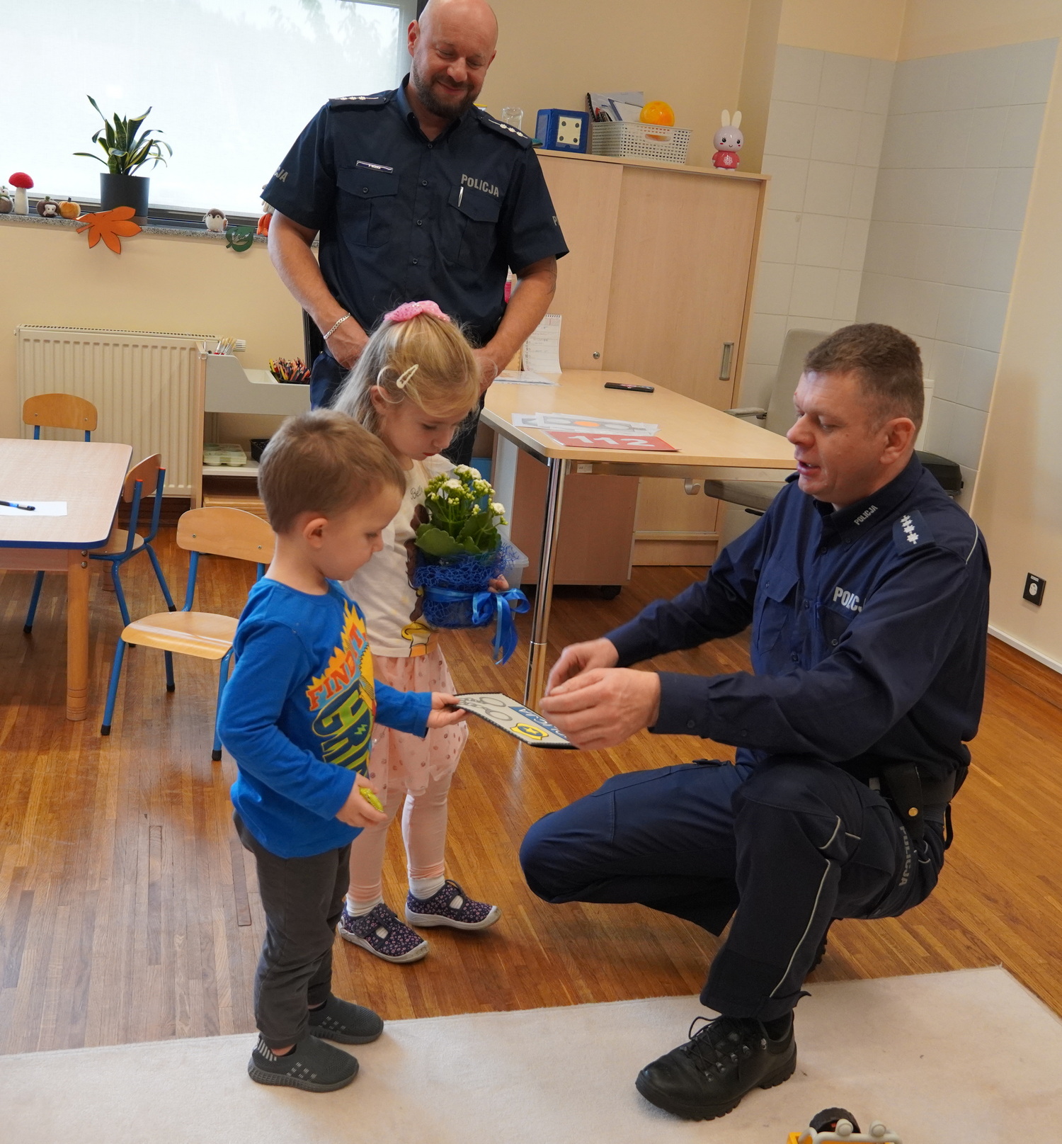 8 października w Publicznym Przedszkolu Samorządowym w Łuszczanowicach odbyło się niezwykle ciekawe spotkanie dzieci z grup 3- i 4-latków z policjantami z Posterunku Policji w Kleszczowie – panem Pawłem Wódką i panem Piotrem Pęciakiem. Dzieci, zebrane wspólnie na dywanie, z dużym zainteresowaniem wysłuchały rozmowy na temat bezpieczeństwa w ruchu drogowym. Policjanci w przystępny i ciekawy sposób przypomnieli najmłodszym, jak należy bezpiecznie poruszać się po drodze, jak prawidłowo przechodzić przez przejście dla pieszych oraz dlaczego tak ważne jest zapinanie pasów i jazda w foteliku samochodowym. Podczas zajęć dzieci mogły również przećwiczyć przejście przez ulicę i utrwalić numer alarmowy 112. Na zakończenie spotkania każdy przedszkolak otrzymał odblaskowy breloczek w kształcie kotka, misia lub samochodu – symbol bezpieczeństwa na drodze. W podziękowaniu za wizytę dzieci wręczyły naszym gościom kwiatka i własnoręcznie przygotowaną laurkę. To było bardzo pouczające i radosne spotkanie, które na długo pozostanie w pamięci najmłodszych!