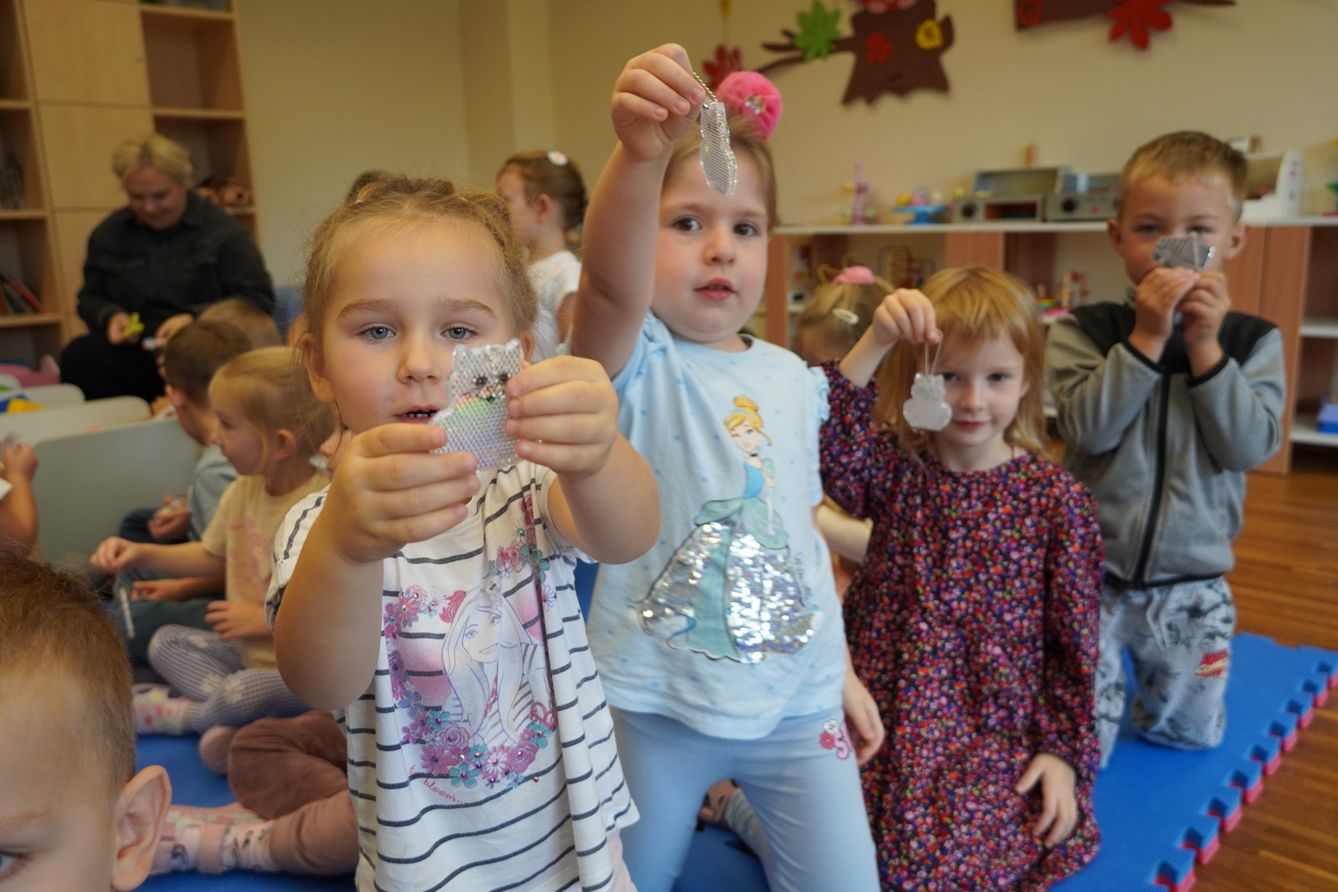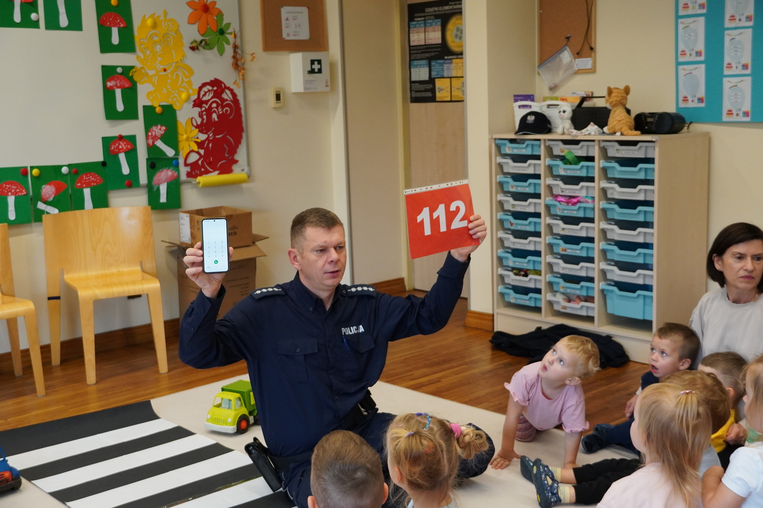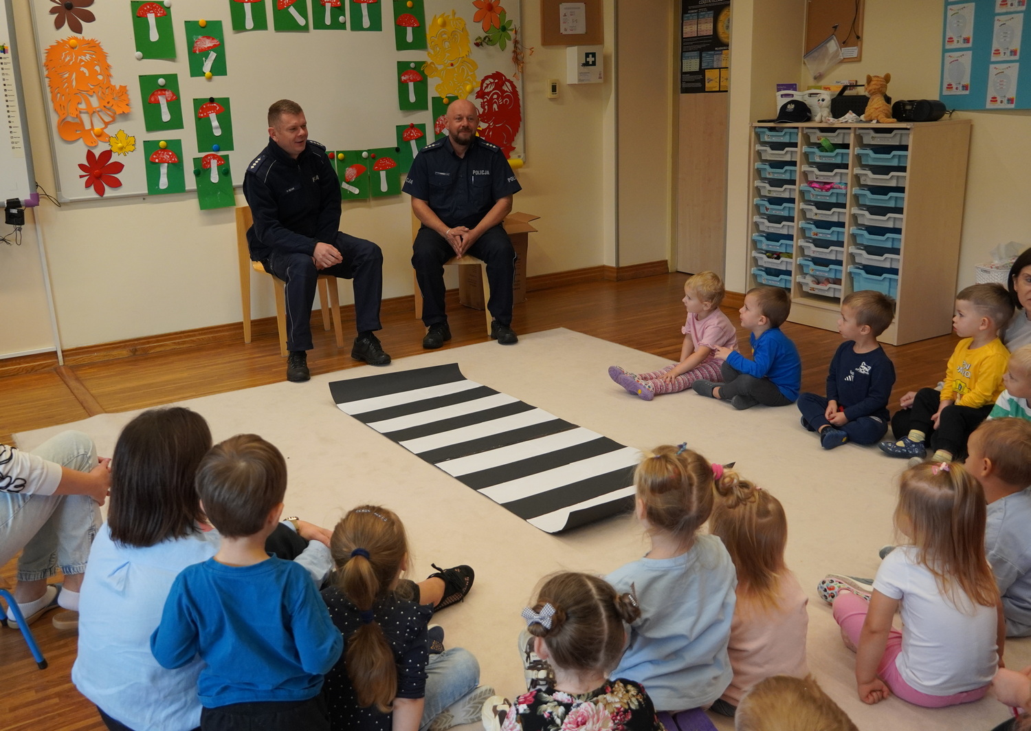 8 października w Publicznym Przedszkolu Samorządowym w Łuszczanowicach odbyło się niezwykle ciekawe spotkanie dzieci z grup 3- i 4-latków z policjantami z Posterunku Policji w Kleszczowie – panem Pawłem Wódką i panem Piotrem Pęciakiem. Dzieci, zebrane wspólnie na dywanie, z dużym zainteresowaniem wysłuchały rozmowy na temat bezpieczeństwa w ruchu drogowym. Policjanci w przystępny i ciekawy sposób przypomnieli najmłodszym, jak należy bezpiecznie poruszać się po drodze, jak prawidłowo przechodzić przez przejście dla pieszych oraz dlaczego tak ważne jest zapinanie pasów i jazda w foteliku samochodowym. Podczas zajęć dzieci mogły również przećwiczyć przejście przez ulicę i utrwalić numer alarmowy 112. Na zakończenie spotkania każdy przedszkolak otrzymał odblaskowy breloczek w kształcie kotka, misia lub samochodu – symbol bezpieczeństwa na drodze. W podziękowaniu za wizytę dzieci wręczyły naszym gościom kwiatka i własnoręcznie przygotowaną laurkę. To było bardzo pouczające i radosne spotkanie, które na długo pozostanie w pamięci najmłodszych!