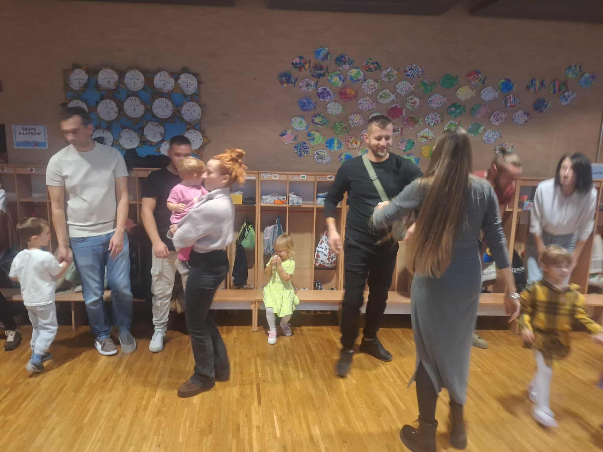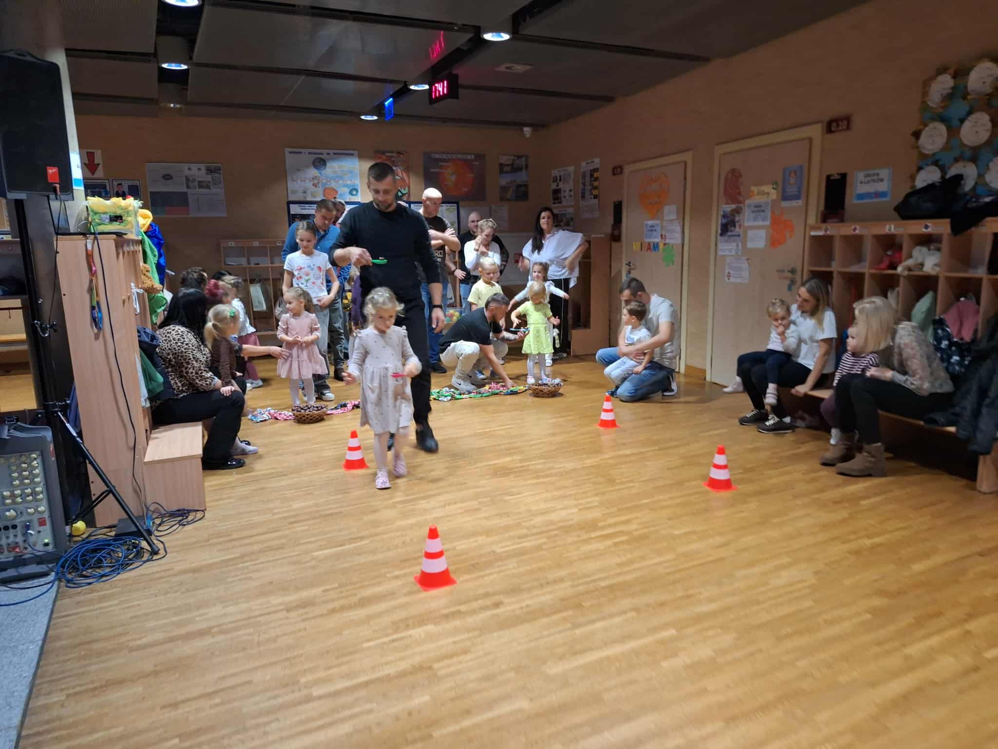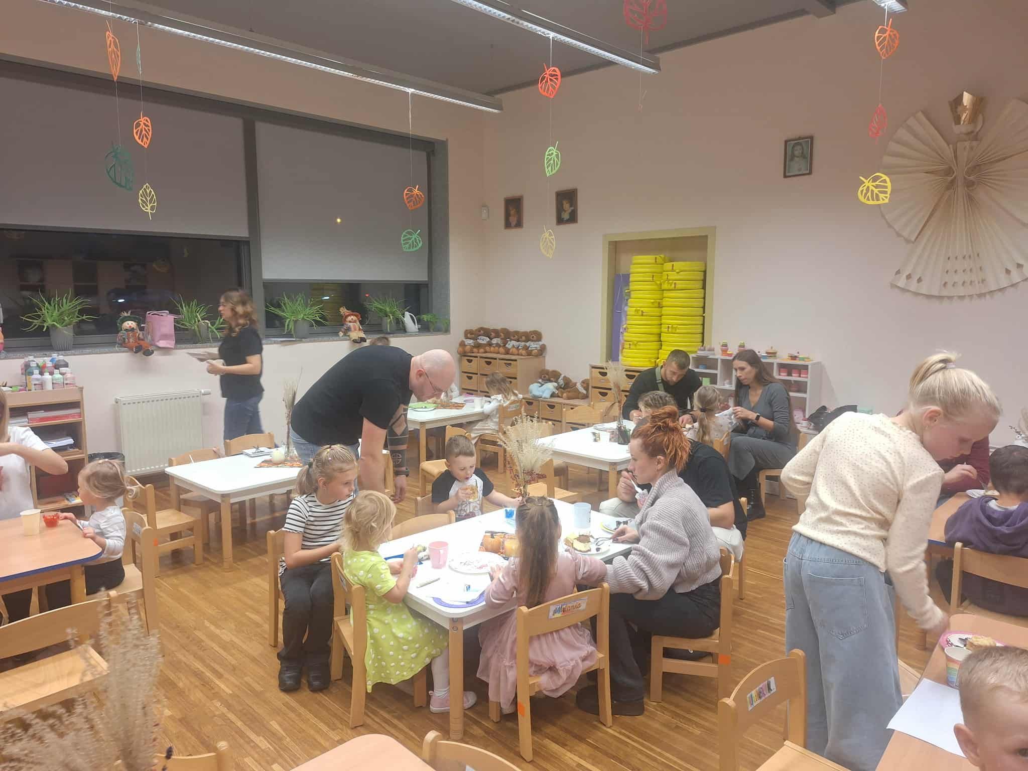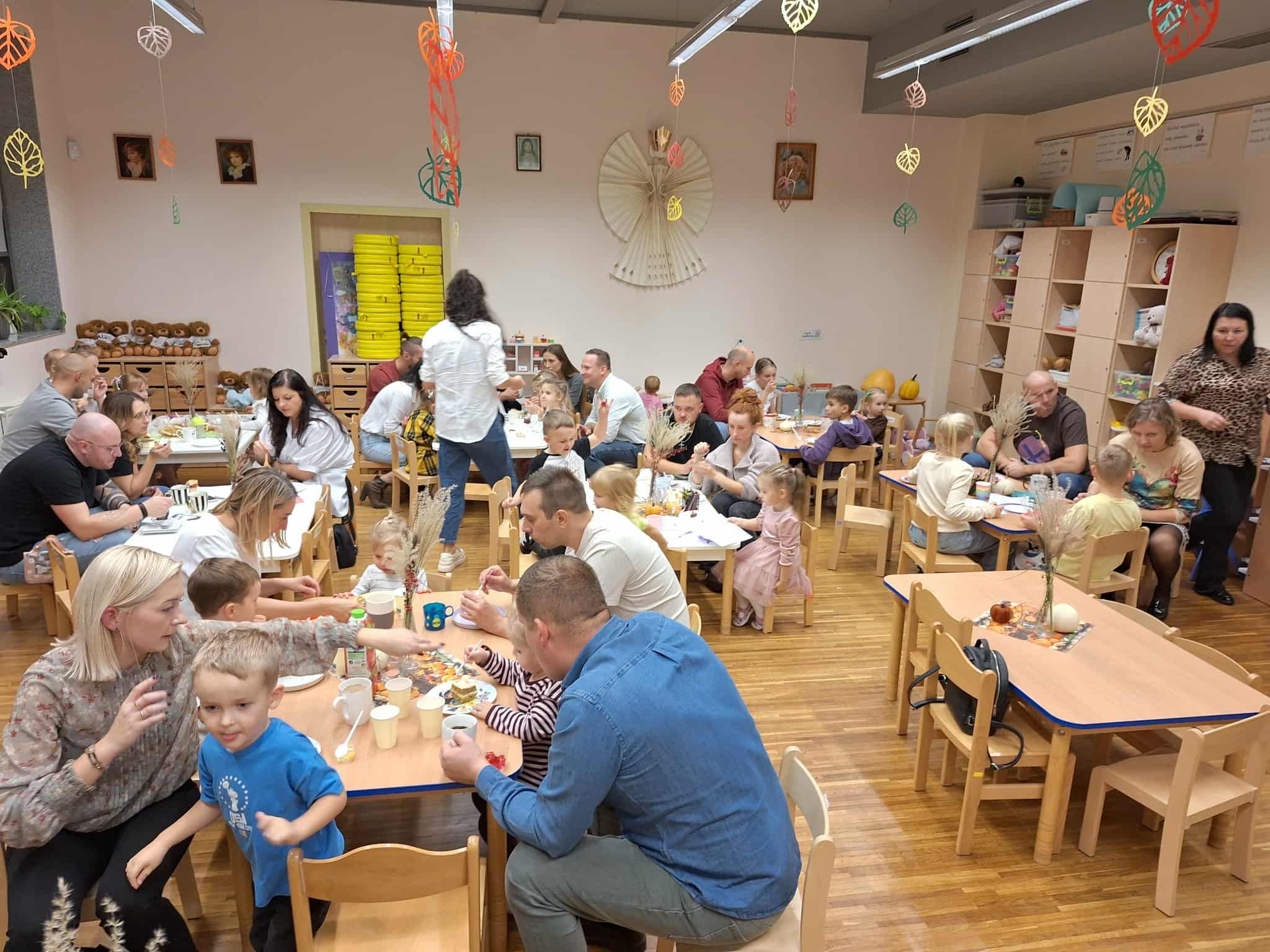 W środę, 22 października, po godzinach pracy przedszkola, odbyło się wyjątkowe spotkanie integracyjne pod hasłem „Rodzinna kawiarenka jesiennych smaków”. W wydarzeniu wzięli udział chętni rodzice wraz z dziećmi, całe rodziny, a także nasi absolwenci, którzy wspólnie z nauczycielami i paniami z obsługi, spędzili miły, pełen ciepła i radości wieczór. Każdy uczestnik przyniósł coś pysznego do wspólnego stołu – nie zabrakło domowych ciast, deserów, owoców z własnych ogrodów oraz świeżych soków. Jak przystało na prawdziwą kawiarenkę, była aromatyczna kawa dla dorosłych, a dla dzieci – herbatka z miodem. Sala została pięknie udekorowana w jesiennym klimacie – przygotowano stoliki z ozdobami z liści, kasztanów i żołędzi, przy których zasiadły rodziny. W centralnej części sali ustawiono szwedzki stół z przysmakami, z którego każdy mógł się częstować. Na początku spotkania panie nauczycielki zaprosiły wszystkich na korytarz do wspólnych zabaw integracyjnych. Były zabawy w parach, z chustą animacyjną, Si gumą, a także slalom z kasztanami i wiele innych aktywności, które dostarczyły uczestnikom mnóstwo radości. Gdy wszyscy byli już rozgrzani i rozbawieni, symbolicznie „wjechaliśmy pociągiem” do naszej kawiarenki, gdzie rozpoczęły się rozmowy, wspólne zabawy i chwile spędzone przy stolikach w miłej, rodzinnej atmosferze. Na zakończenie spotkania odbyła się ewaluacja w formie jesiennego drzewka. Rodzice zawieszali na nim kolorowe liście z podziękowaniami i swoimi spostrzeżeniami na temat spotkania. Wszystkie wpisy były pełne ciepłych słów i wdzięczności za możliwość wspólnego spędzenia czasu. Spotkanie przebiegło w bardzo serdecznej i radosnej atmosferze, a wspólne chwile z pewnością na długo pozostaną w pamięci zarówno dzieci, jak i dorosłych.