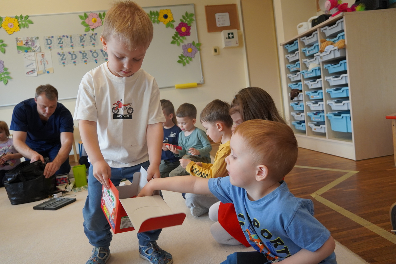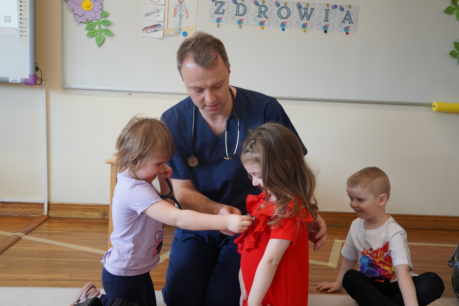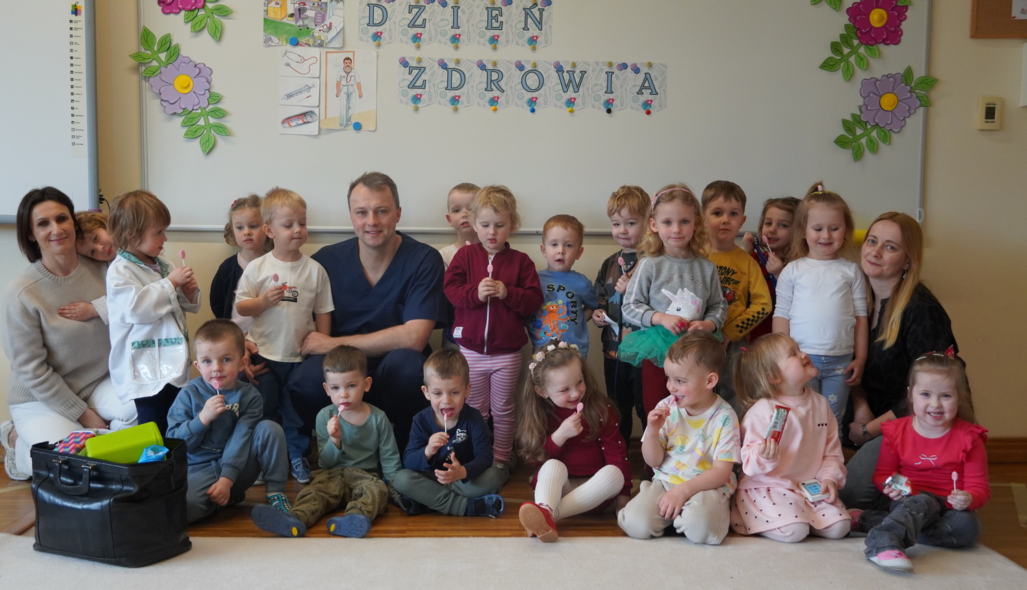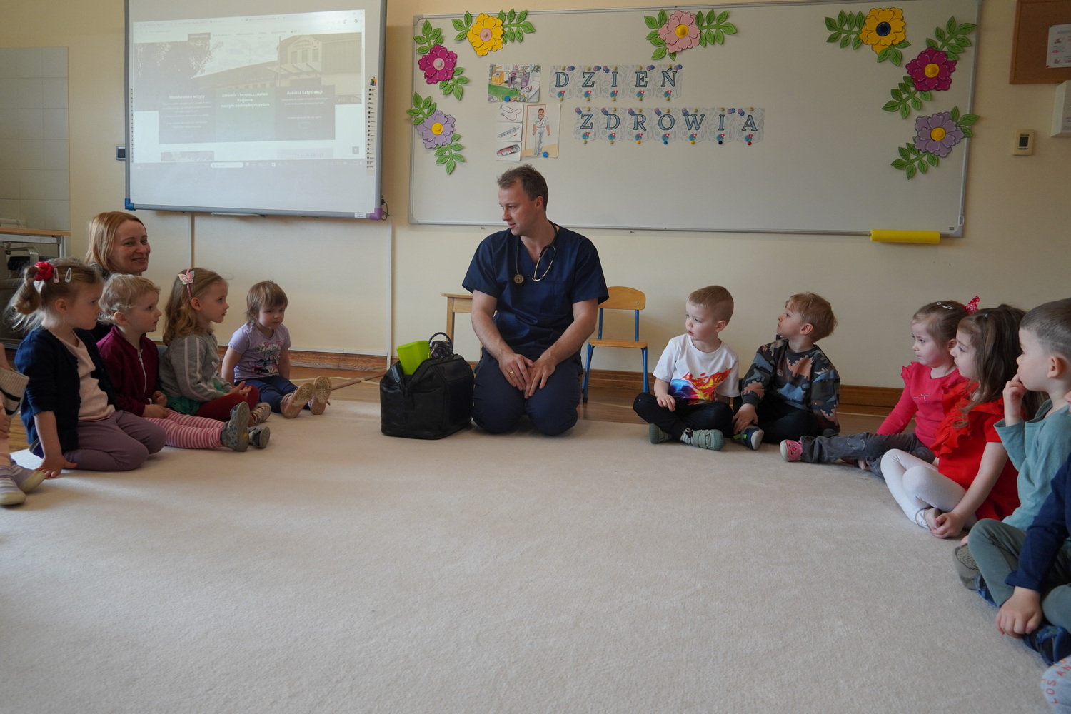 W ramach obchodów Światowego Dnia Zdrowia, naszą grupę odwiedził tata Marcelka, który jest lekarzem. Celem wizyty było poznanie zawodu lekarza i zachęcenie dzieci do dbania o zdrowie. Dzieci miały niepowtarzalną okazję do obejrzenia stetoskopu, ciśnieniomierza oraz innych akcesoriów medycznych. Przedszkolaki bardzo aktywnie uczestniczyły w spotkaniu. W nagrodę Pan Kamil obdarował dzieci naklejkami i lizakami. Spotkanie upłynęło w bardzo miłej atmosferze. Mamy nadzieję, że w przyszłości wizyta dzieci w gabinecie lekarskim nie będzie budziła nieprzyjemnych uczuć.
