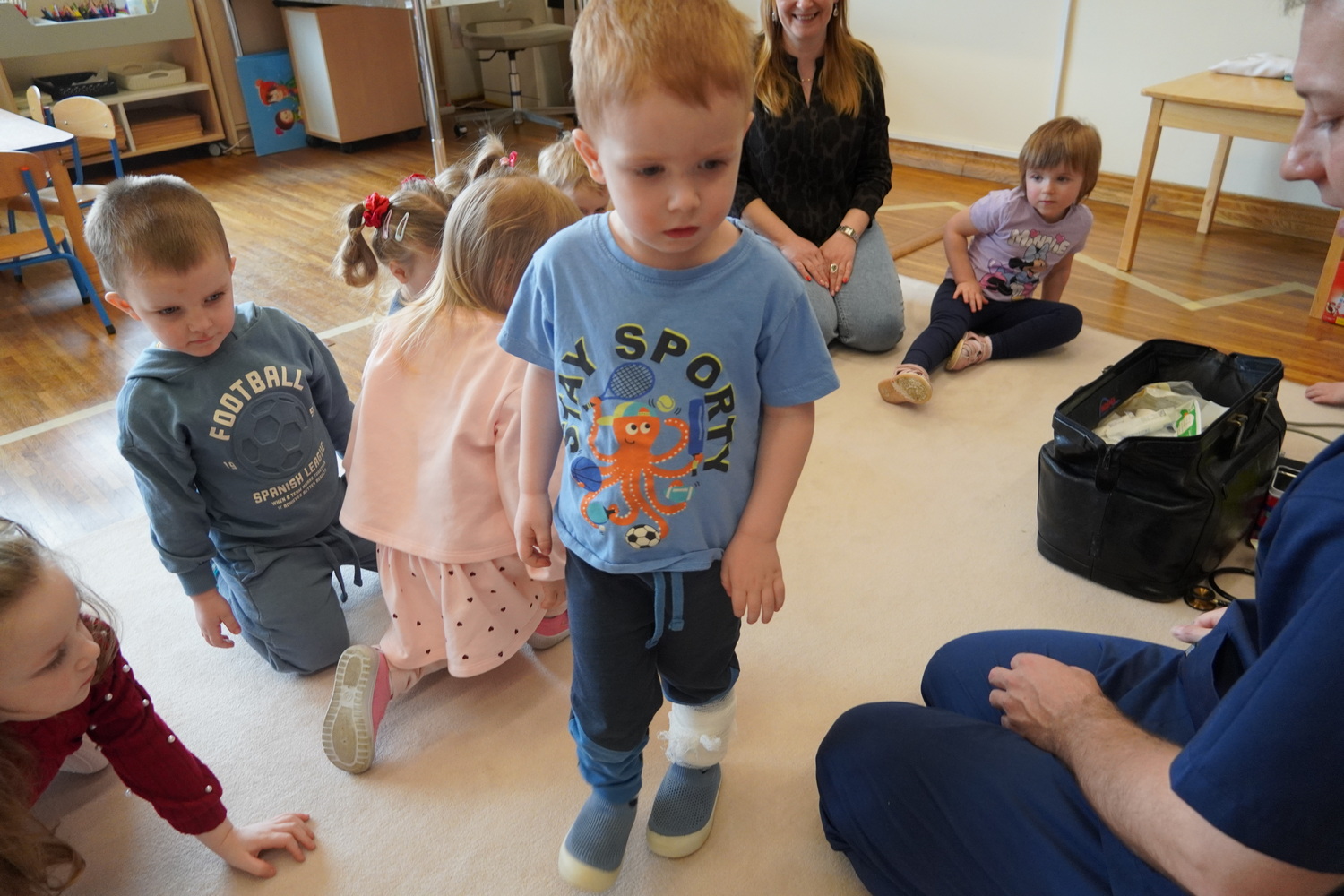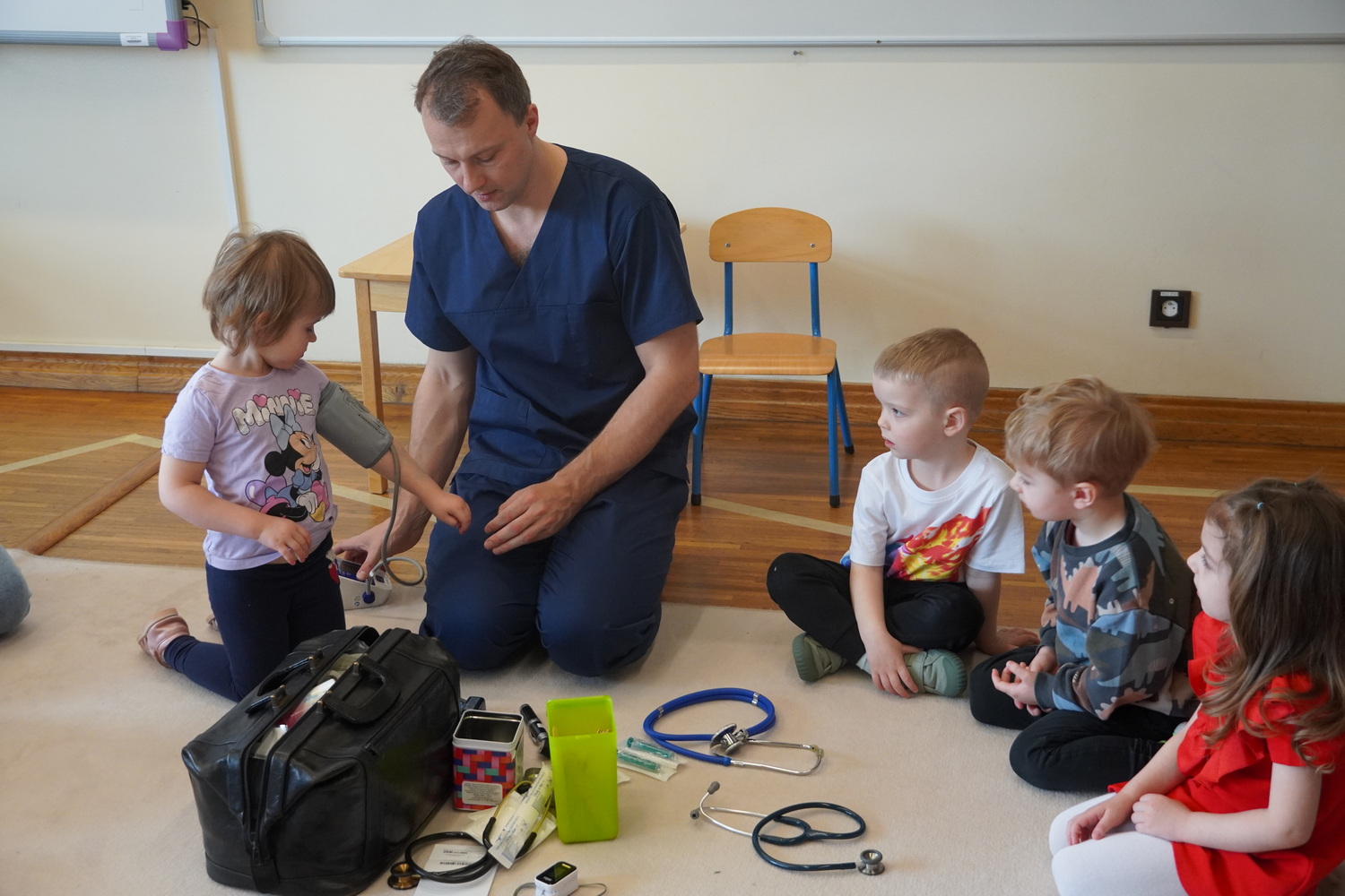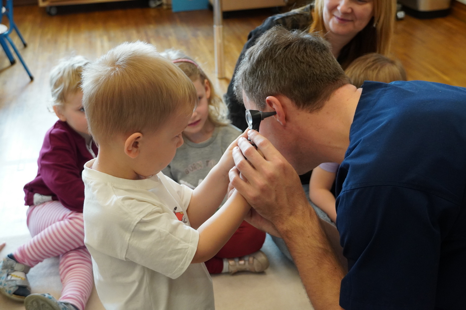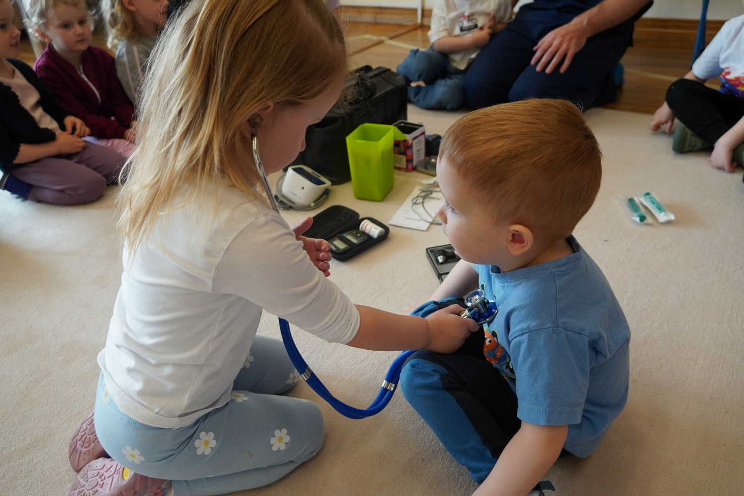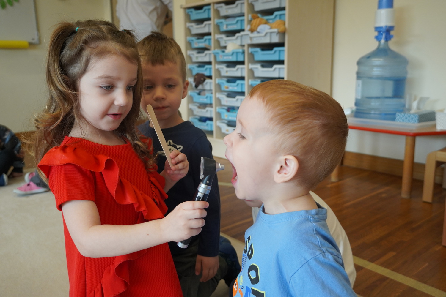 W ramach obchodów Światowego Dnia Zdrowia, naszą grupę odwiedził tata Marcelka, który jest lekarzem. Celem wizyty było poznanie zawodu lekarza i zachęcenie dzieci do dbania o zdrowie. Dzieci miały niepowtarzalną okazję do obejrzenia stetoskopu, ciśnieniomierza oraz innych akcesoriów medycznych. Przedszkolaki bardzo aktywnie uczestniczyły w spotkaniu. W nagrodę Pan Kamil obdarował dzieci naklejkami i lizakami. Spotkanie upłynęło w bardzo miłej atmosferze. Mamy nadzieję, że w przyszłości wizyta dzieci w gabinecie lekarskim nie będzie budziła nieprzyjemnych uczuć.