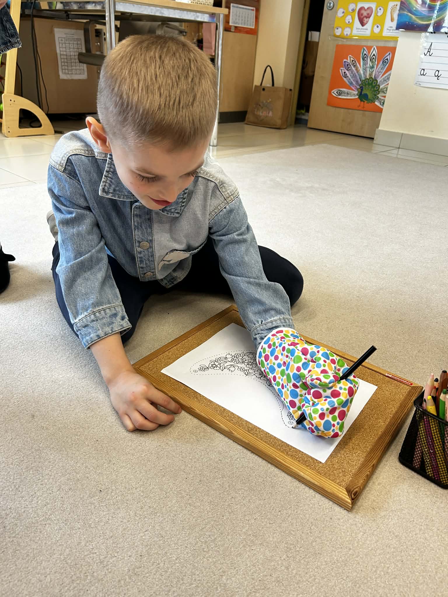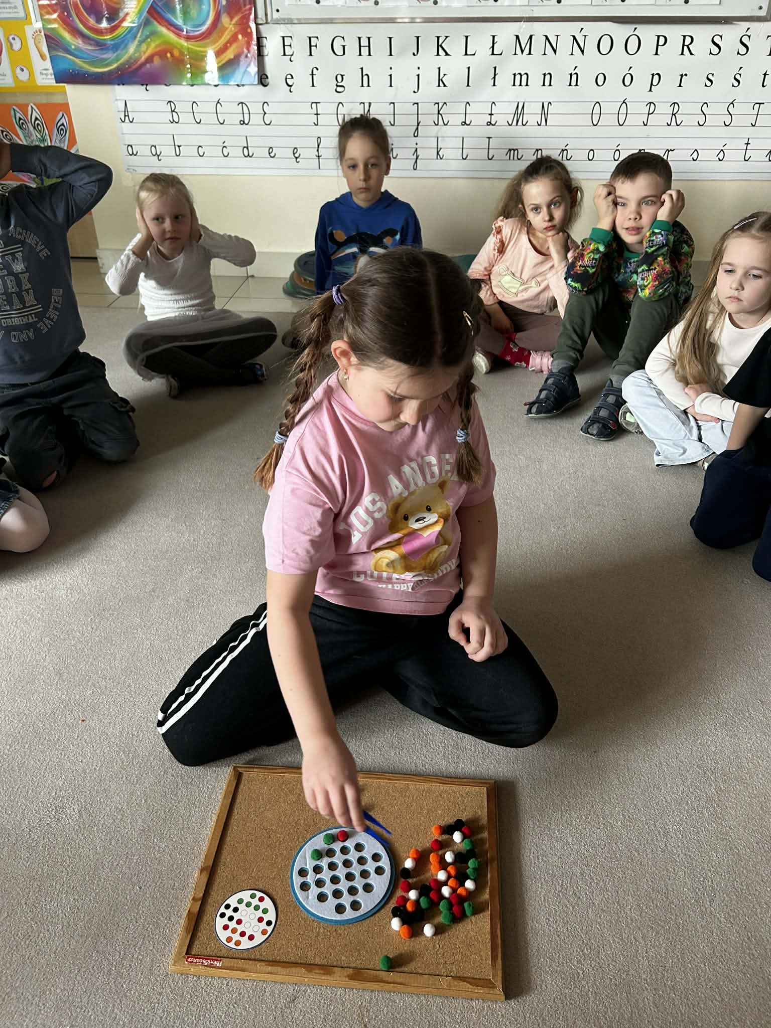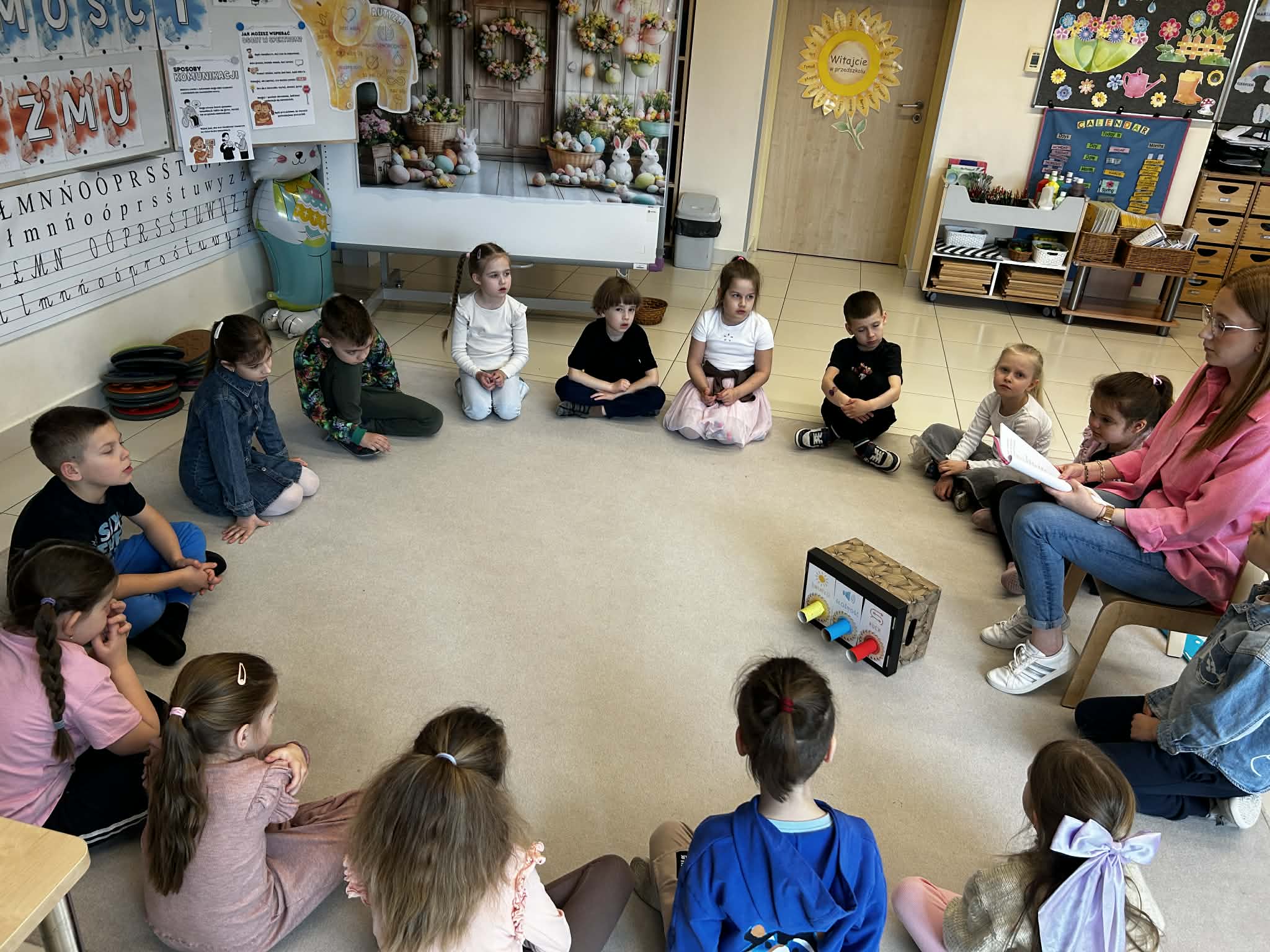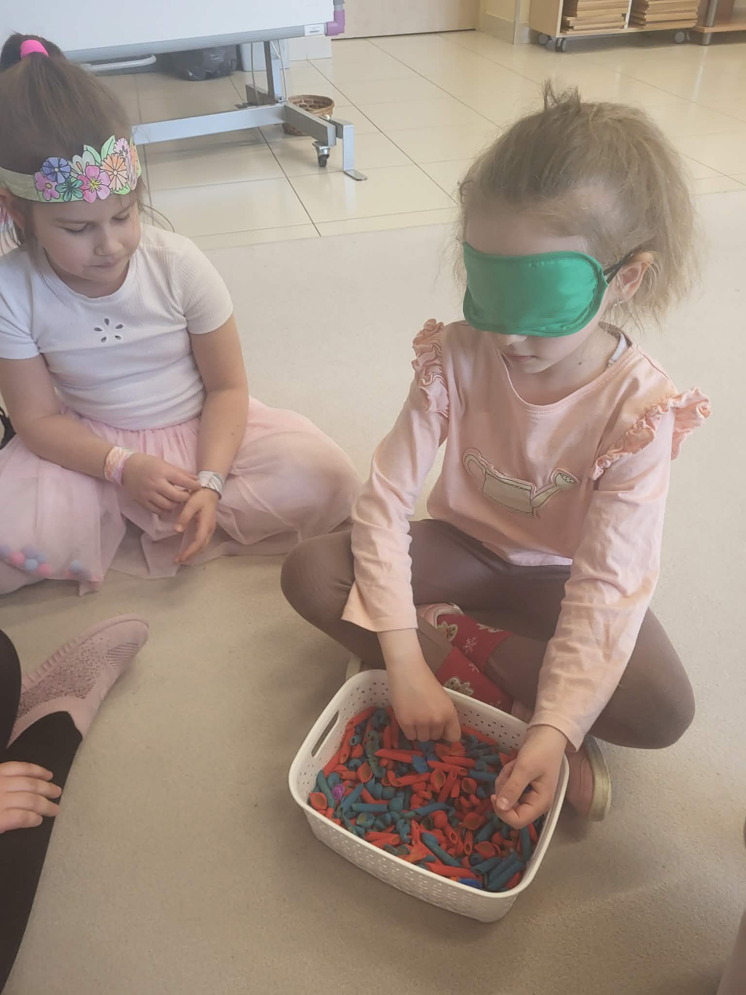 Spotkanie rozpoczęliśmy w kręgu od wysłuchania poruszającego opowiadania oraz poznania „Maszyny świata” – niezwykłej pomocy, dzięki której dzieci mogły zrozumieć, jak nasze wewnętrzne „ustawienia wrażliwości” wpływają na to, jak czujemy i postrzegamy otoczenie. Następnie przedszkolaki wzięły udział w wyzwaniach sensorycznych. Z zasłoniętymi oczami odszukiwały koraliki ukryte w ziarnach ryżu oraz pokonywały tor przeszkód, stąpając po dyskach o różnych fakturach. Dzięki temu mogły doświadczyć, jak różnie nasze zmysły odbierają bodźce. Ważnym elementem była także zabawa ruchowa z kartami przedstawiającymi sytuacje z życia codziennego. Dzieci rozpoznawały emocje i dopasowywały właściwe, wspierające reakcje. Uczyły się w praktyce, że bycie dobrym kolegą to uważność, akceptacja i szacunek dla potrzeb innych.