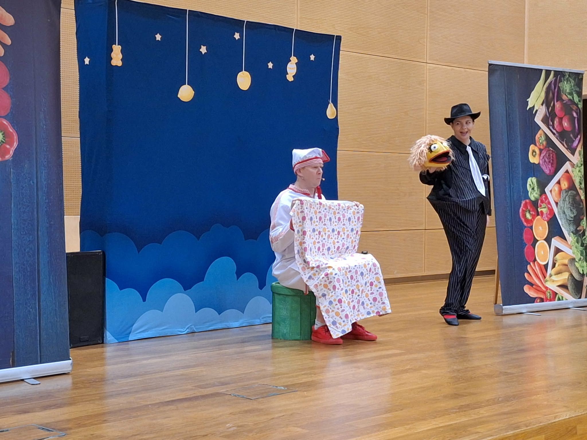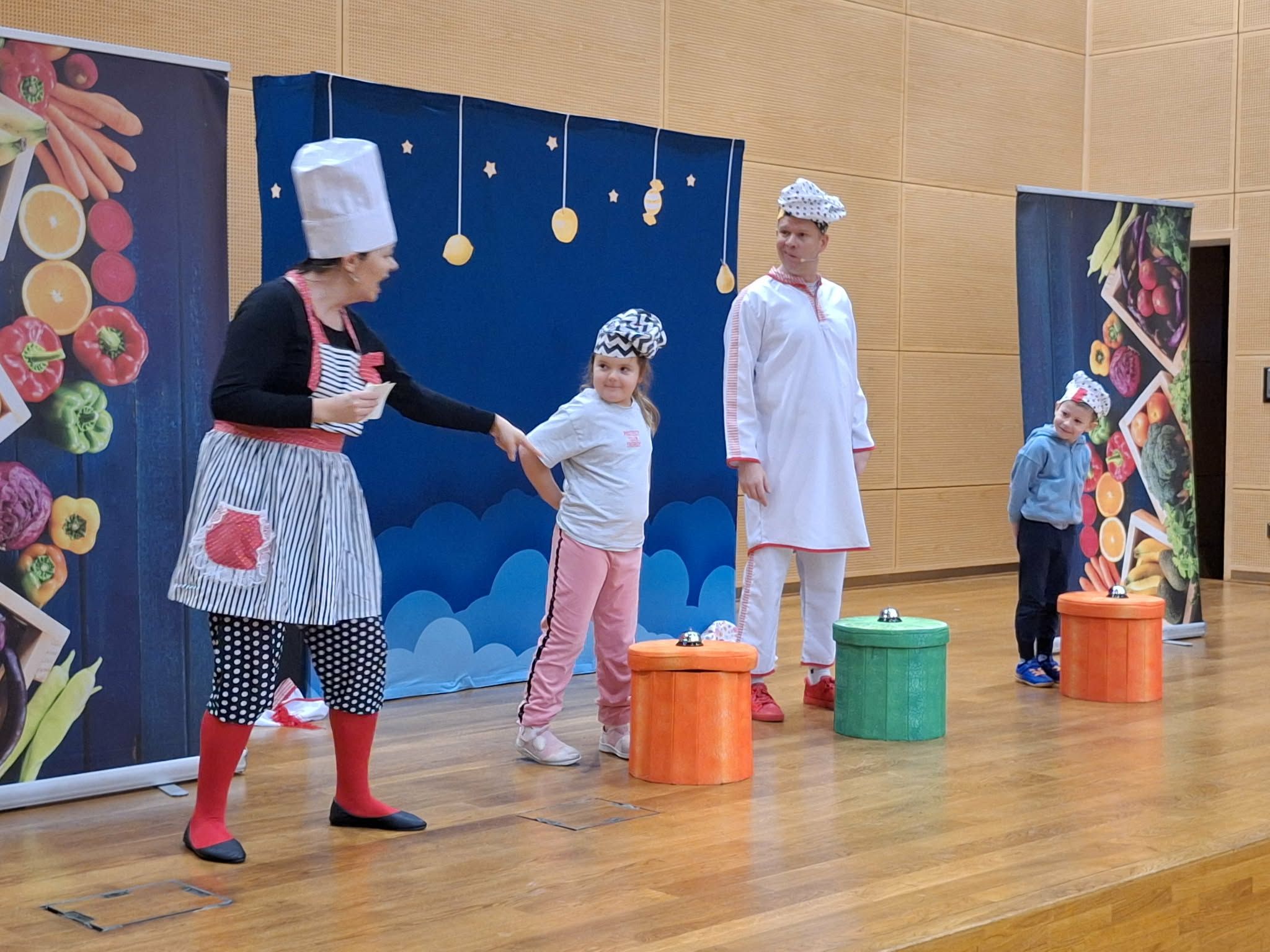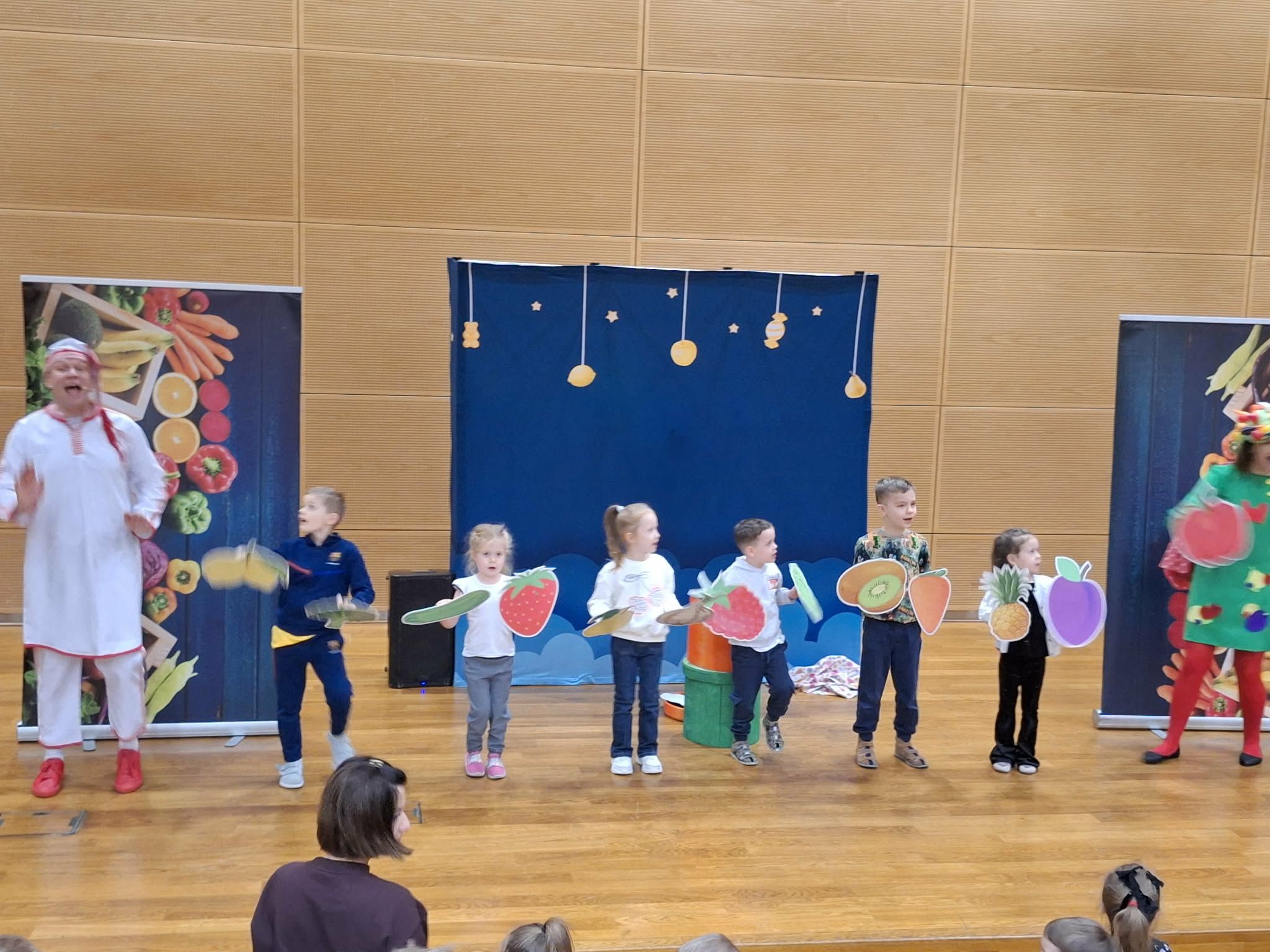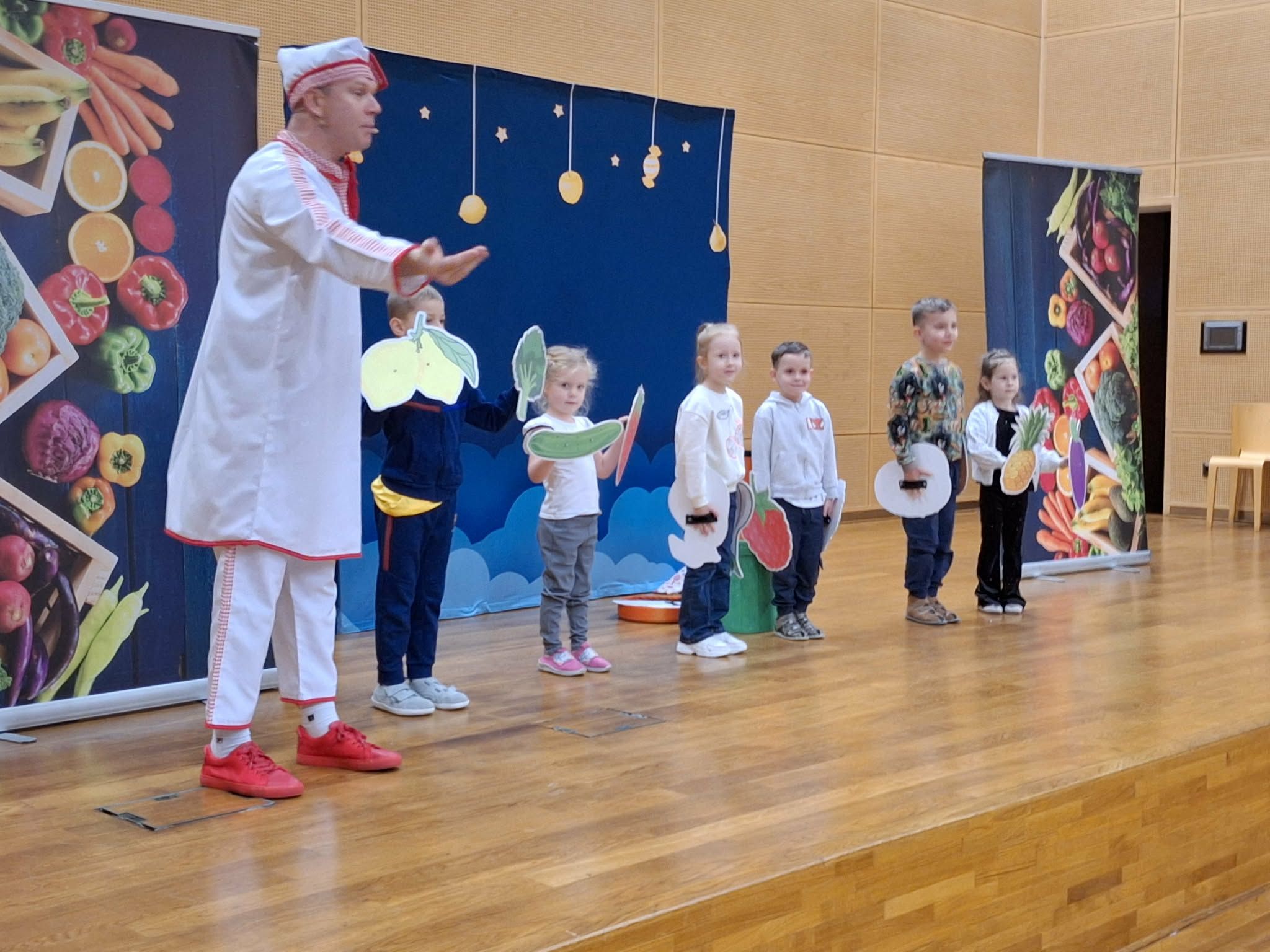 Dzisiaj odwiedziła nas Teatr TAK z przedstawieniem pt.,, Bajka do zjedzenia " Celem przedstawienia było kształtowanie nawyków zdrowego odżywiania oraz utrwalenie słówek z języka angielskiego związanych z nazwami owocami i warzywami . Dzieci aktywnie mogły uczestniczyć w przedstawieniu i poznawały zdrowe nawyki żywieniowe .