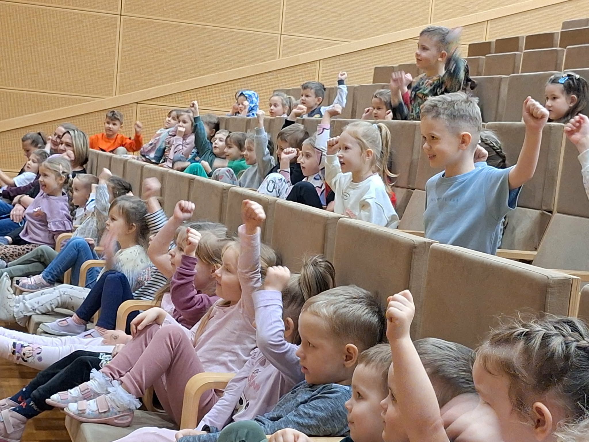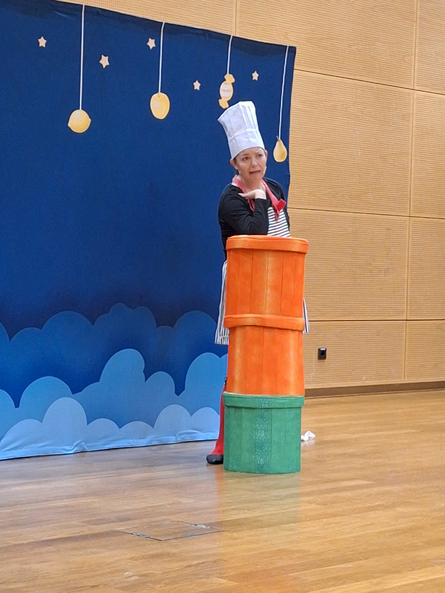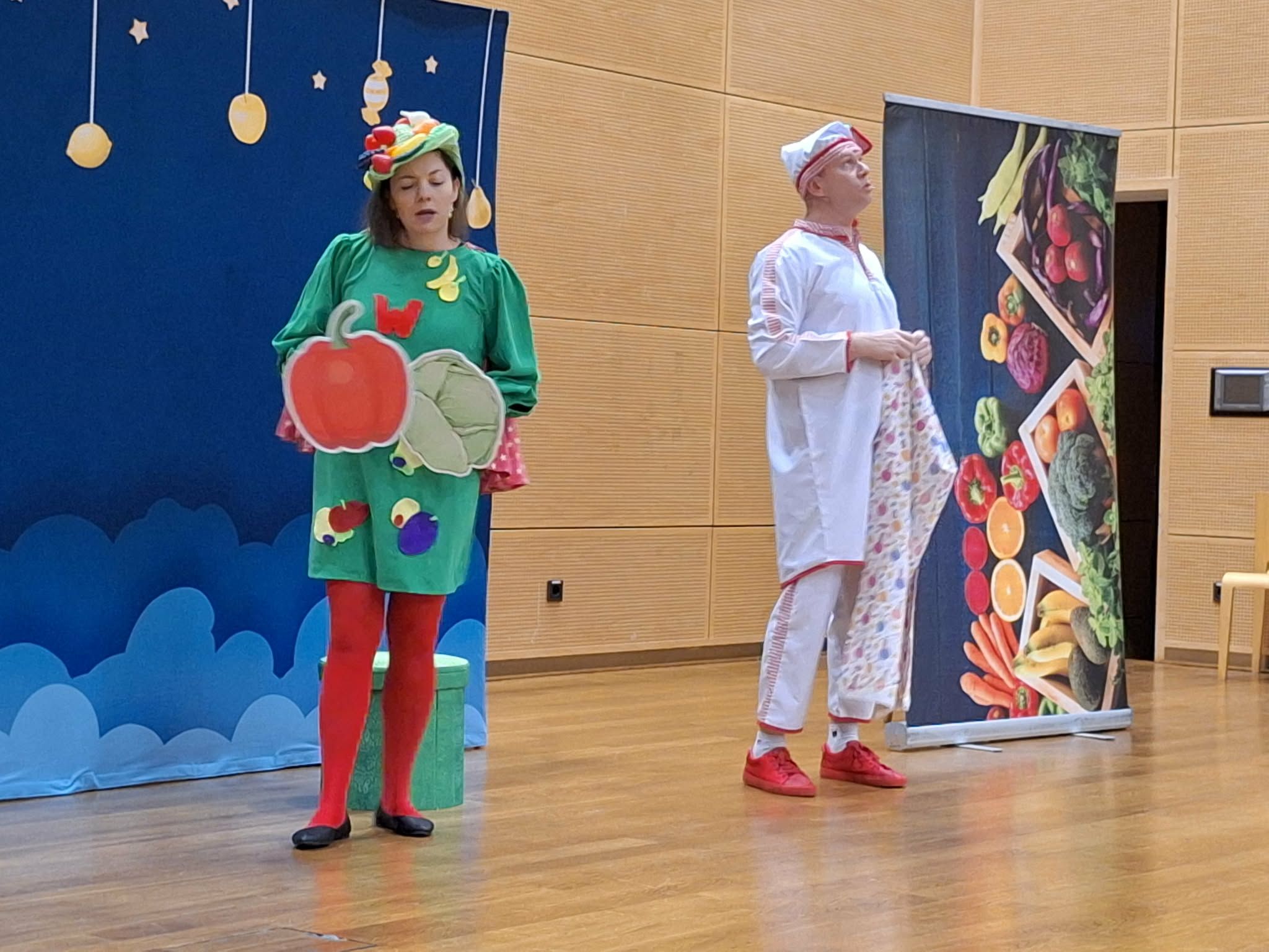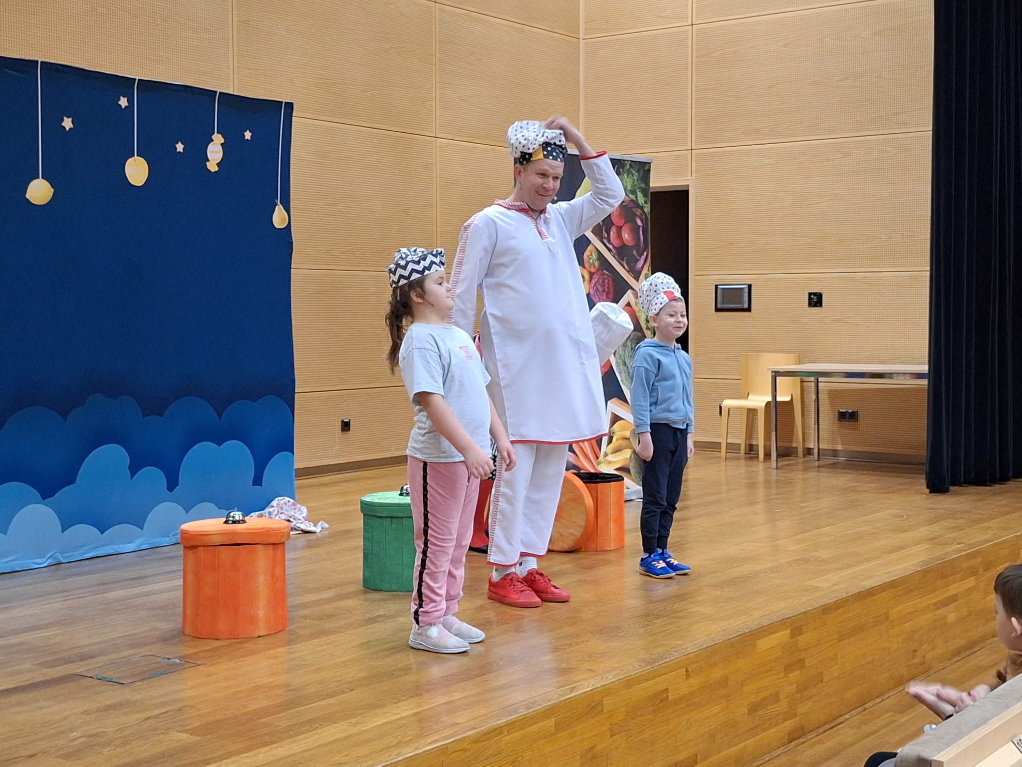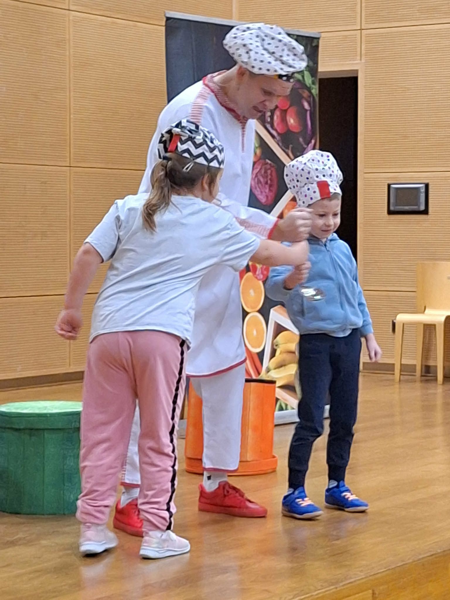 Dzisiaj odwiedziła nas Teatr TAK z przedstawieniem pt.,, Bajka do zjedzenia " Celem przedstawienia było kształtowanie nawyków zdrowego odżywiania oraz utrwalenie słówek z języka angielskiego związanych z nazwami owocami i warzywami . Dzieci aktywnie mogły uczestniczyć w przedstawieniu i poznawały zdrowe nawyki żywieniowe .