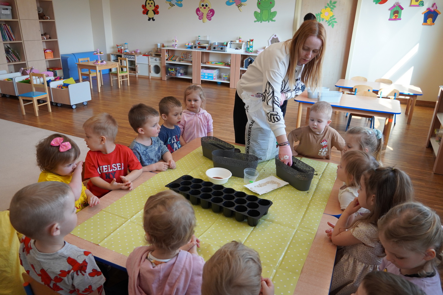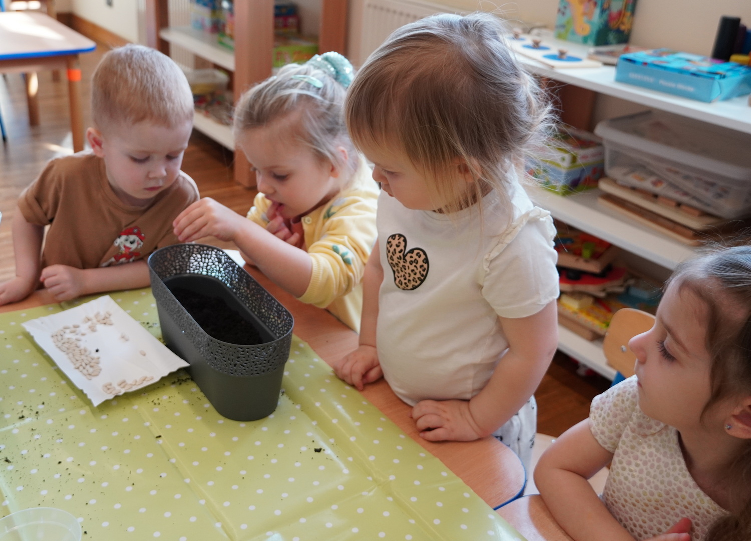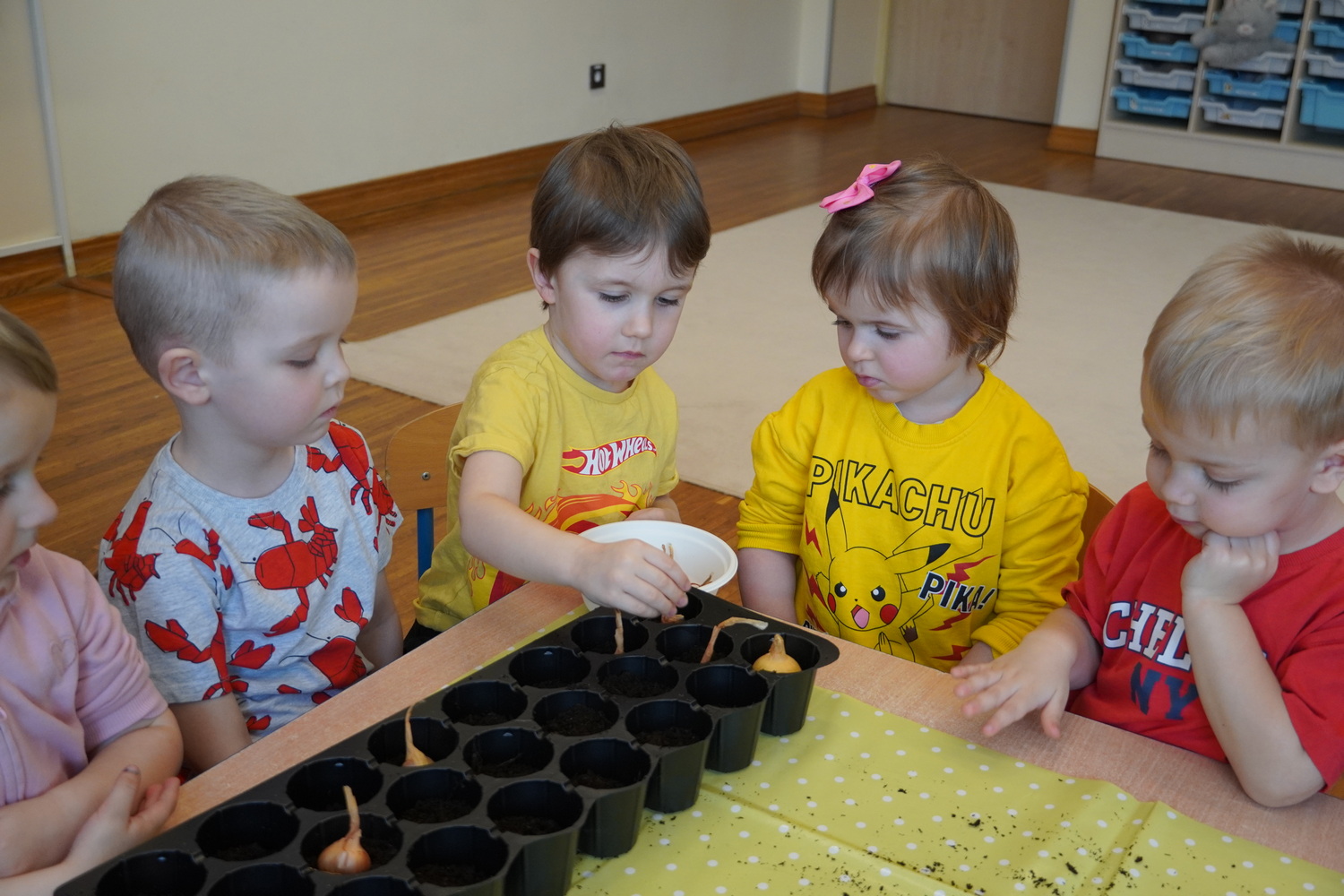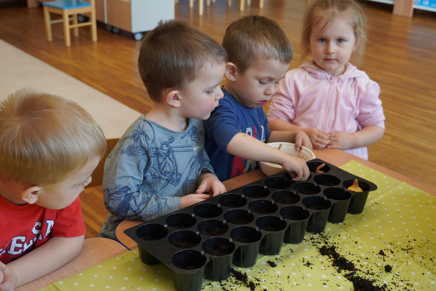Chcąc przyśpieszyć przyjście wiosny maluszki postanowiły założyć w sali zielony, wiosenny ogródek. Zgromadziły potrzebne przybory (pojemniczki, doniczki, konewki), ziemię i nasionka. Przed przystąpieniem do pracy poznały warunki potrzebne roślinom do wzrostu. Następnie siały rzeżuchę, fasolkę i owies oraz sadziły cebulkę na szczypiorek. Po zasianiu i podlaniu rośliny zostały umieszczone na parapecie, a dzieci muszą pamiętać o ich podlewaniu oraz obserwować ich wzrost. Kiedy wyrosną będą źródłem witamin na kanapkach.