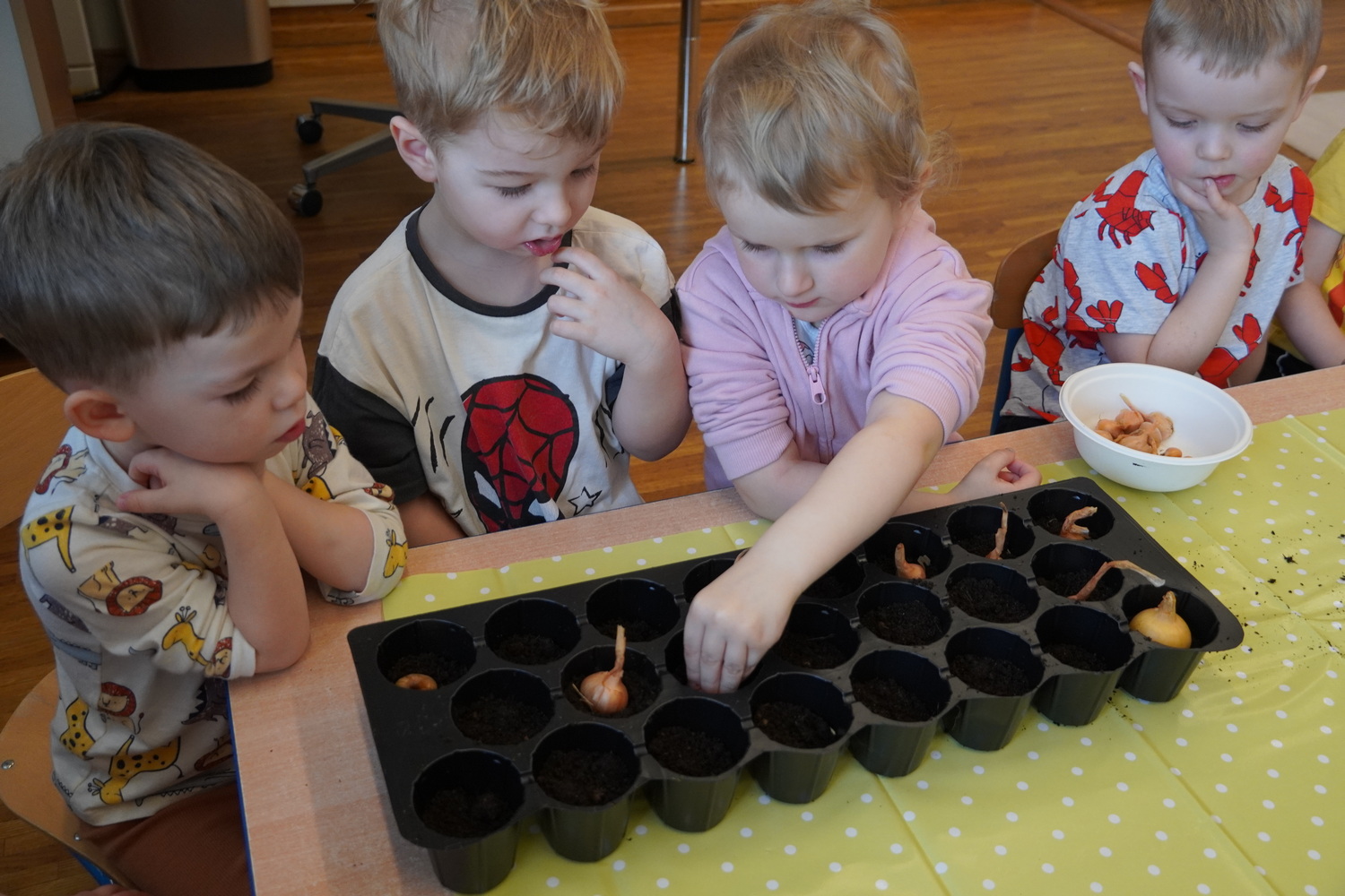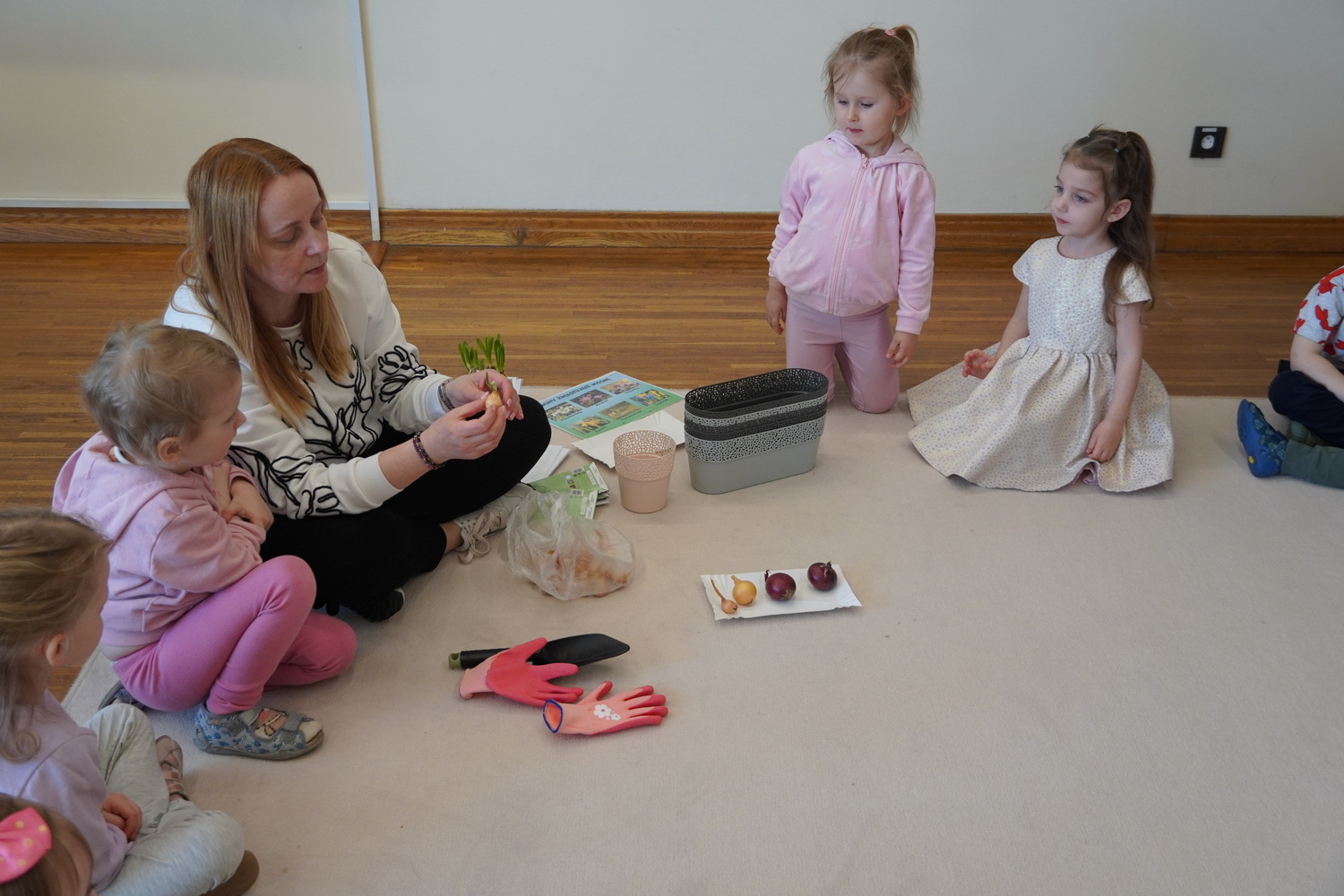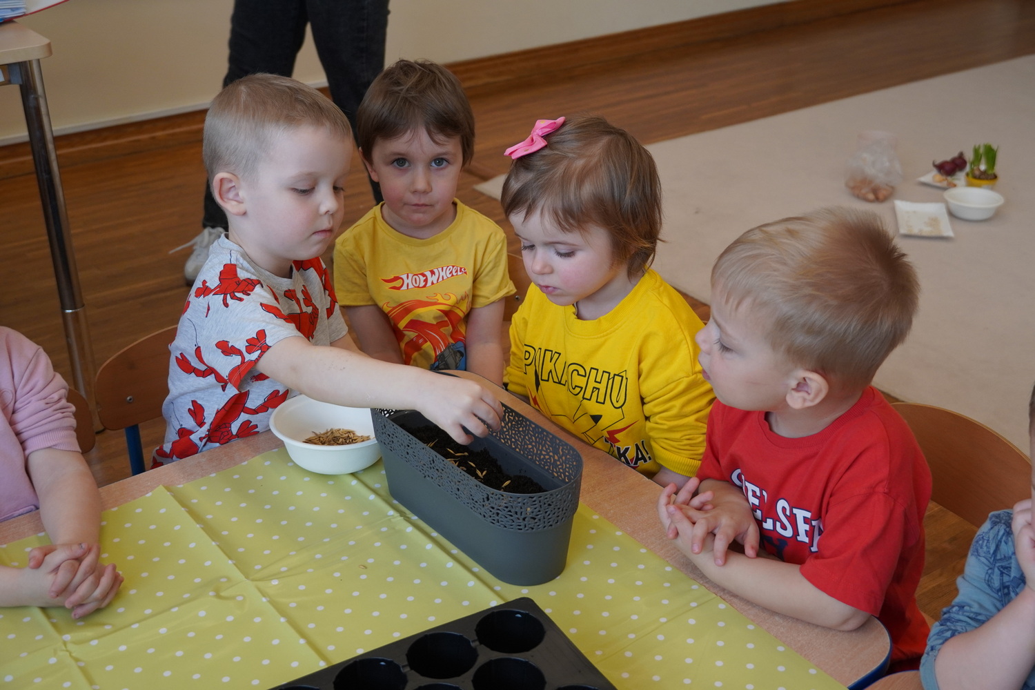 Chcąc przyśpieszyć przyjście wiosny maluszki postanowiły założyć w sali zielony, wiosenny ogródek. Zgromadziły potrzebne przybory (pojemniczki, doniczki, konewki), ziemię i nasionka. Przed przystąpieniem do pracy poznały warunki potrzebne roślinom do wzrostu. Następnie siały rzeżuchę, fasolkę i owies oraz sadziły cebulkę na szczypiorek. Po zasianiu i podlaniu rośliny zostały umieszczone na parapecie, a dzieci muszą pamiętać o ich podlewaniu oraz obserwować ich wzrost. Kiedy wyrosną będą źródłem witamin na kanapkach.
