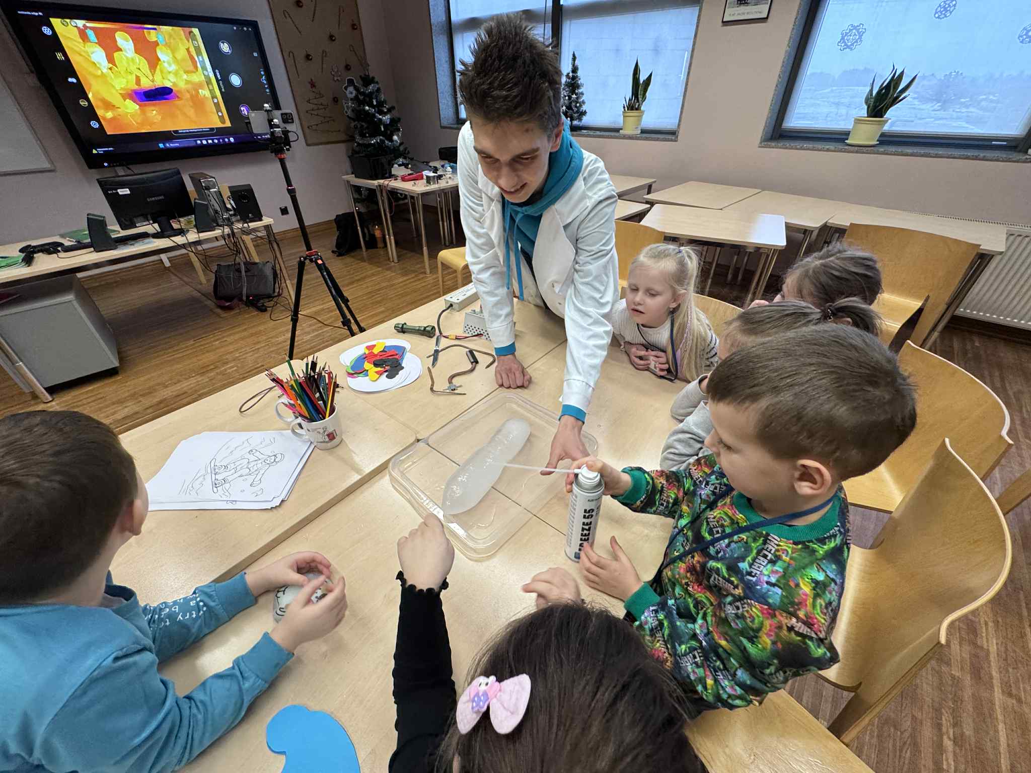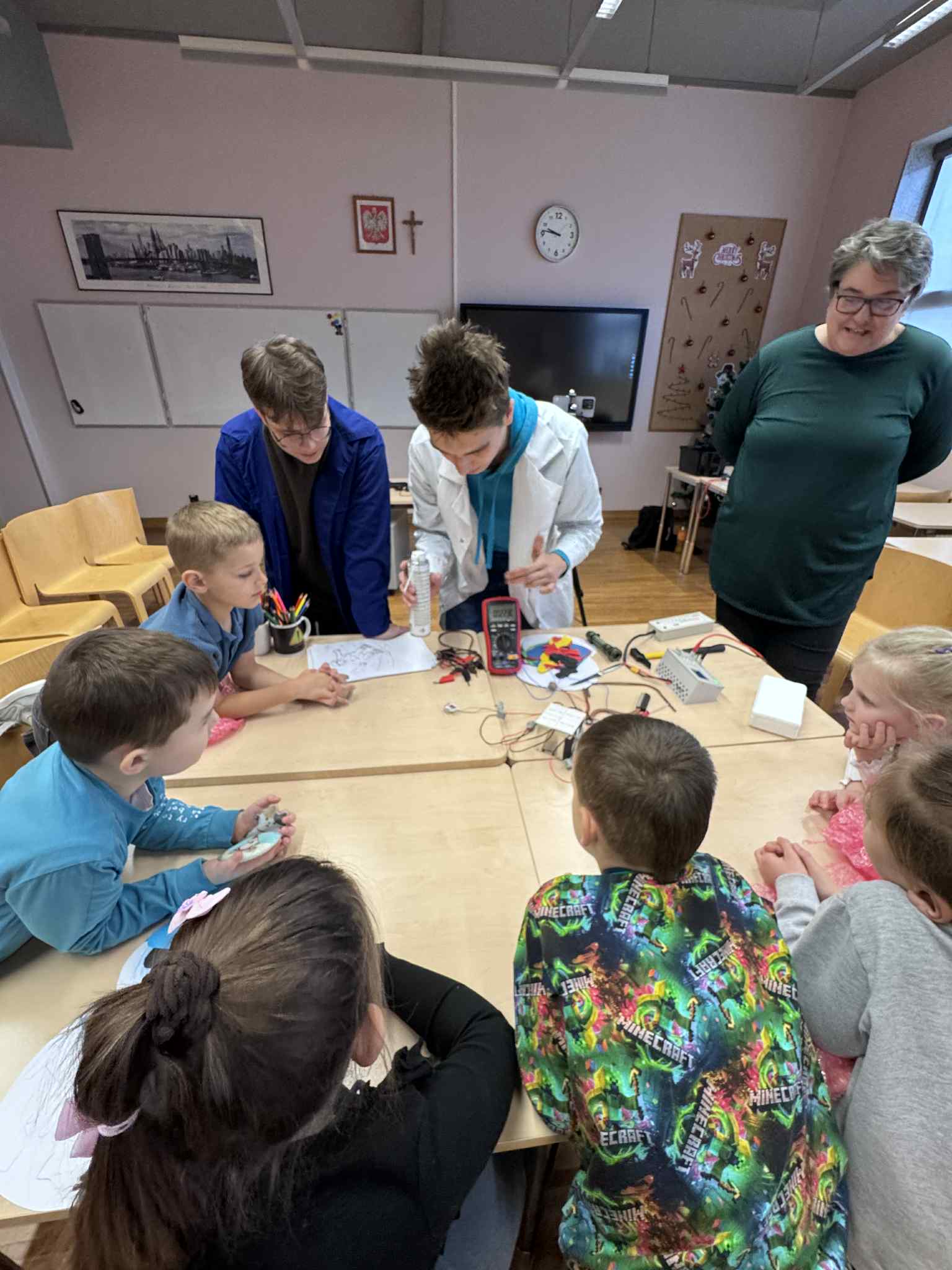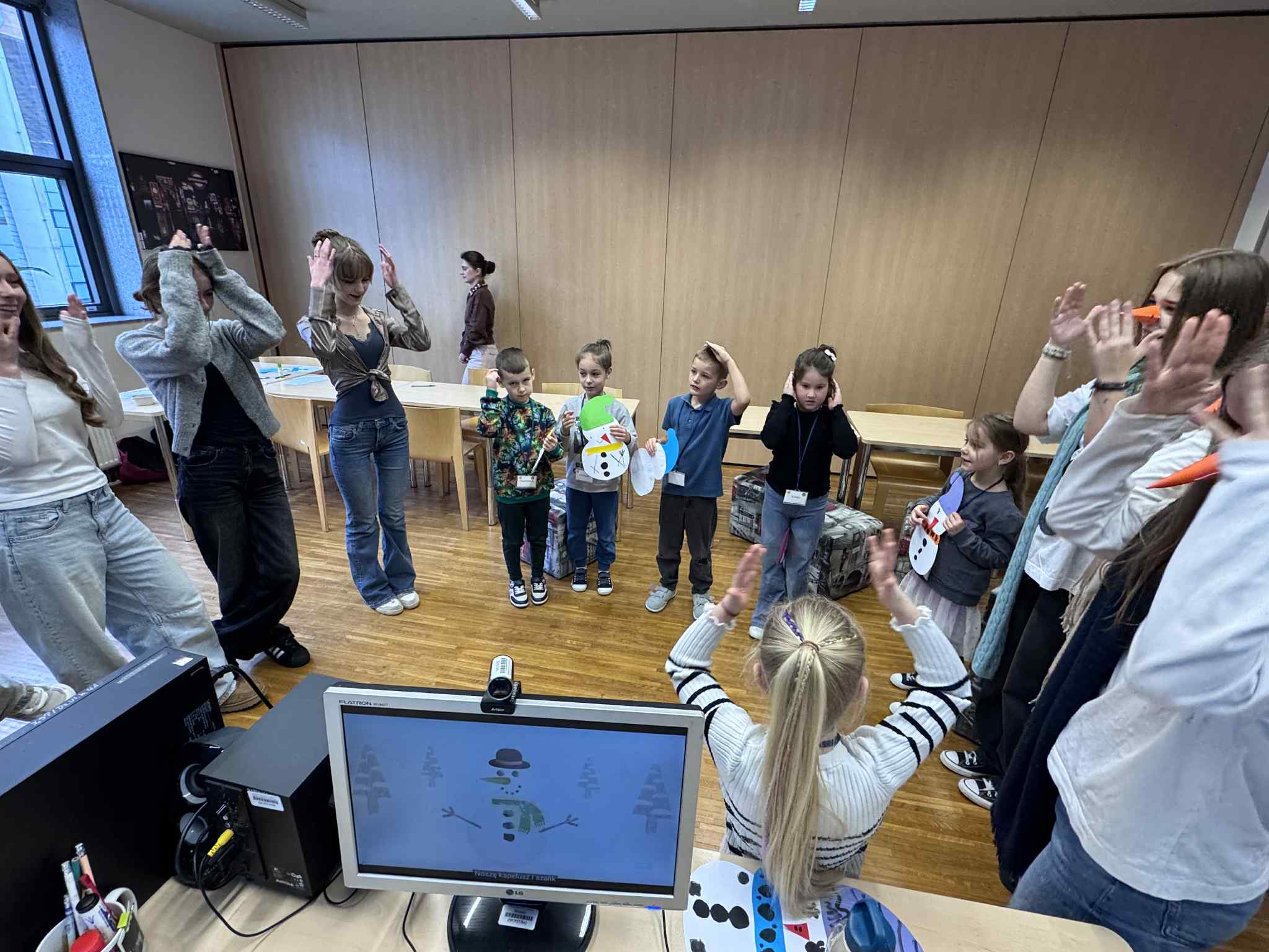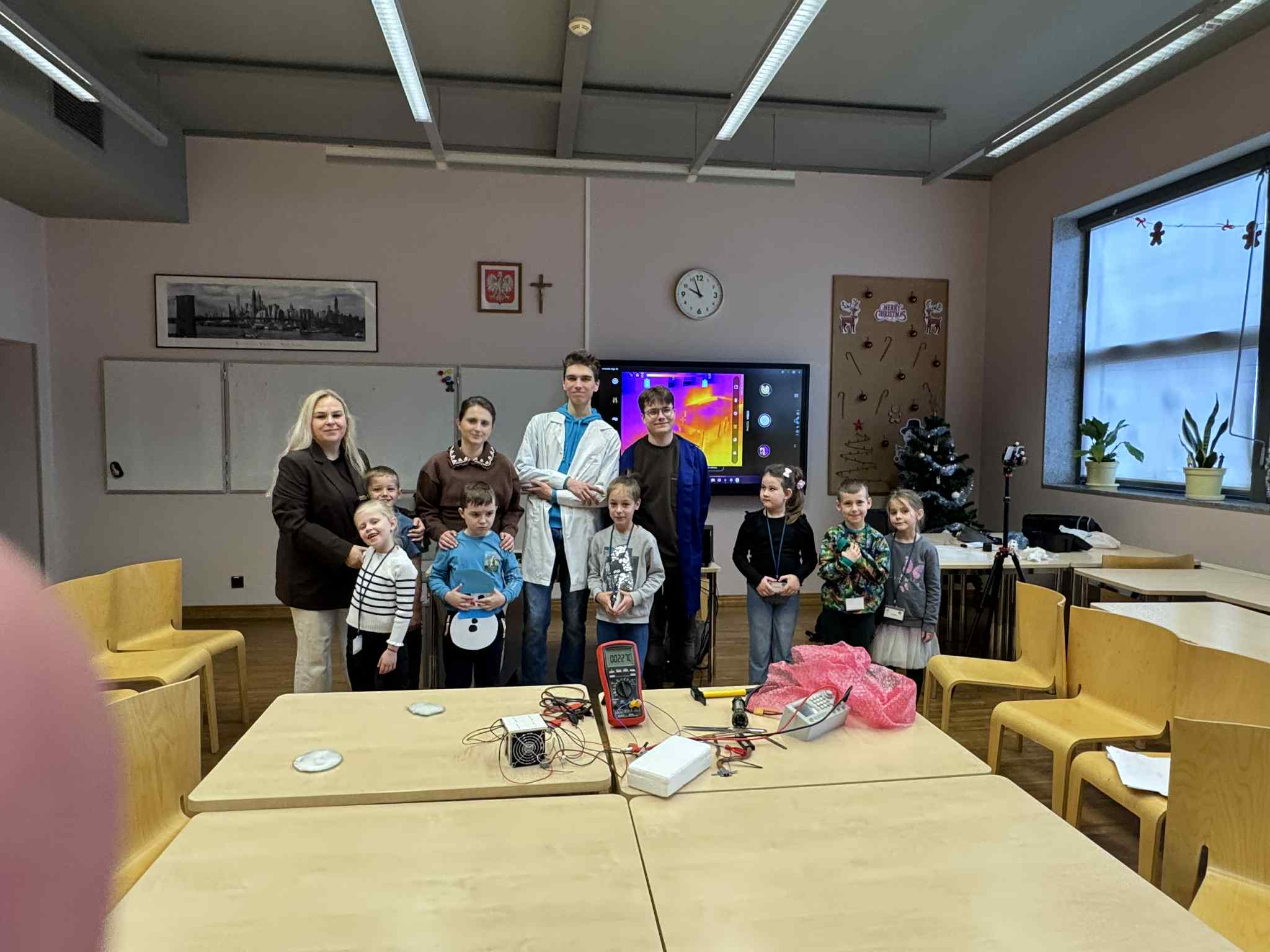 Szóste spotkanie w ramach Uniwersytetu Dziecięcego było pełne radości, ruchu i naukowych emocji. Podczas części językowej dzieci utrwalały nazwy części ciała oraz elementów ubrań w języku angielskim. Wykorzystując kreatywne zadania z bałwankami, mali studenci nazywali, dopasowywali i „ubierali” swoje postacie, ucząc się poprzez działanie, ruch i zabawę. Dzięki temu nauka słownictwa była naturalna i bardzo angażująca. Część zajęć z fizyki poprowadzona została przez uczniów technikum, którzy zaprezentowali dzieciom różnorodne eksperymenty naukowe. Pokazy wywołały ogromne zainteresowanie, zachwyt i mnóstwo pytań. Dzieci mogły obserwować zjawiska fizyczne z bliska, a nauka stała się prawdziwym widowiskiem.