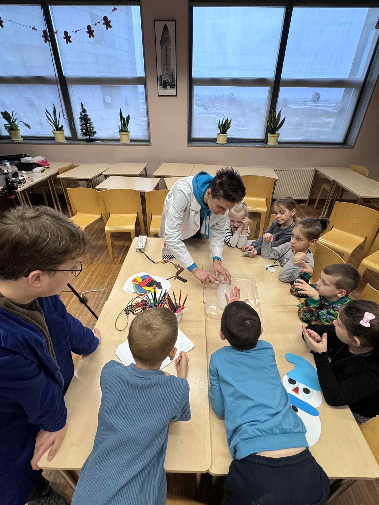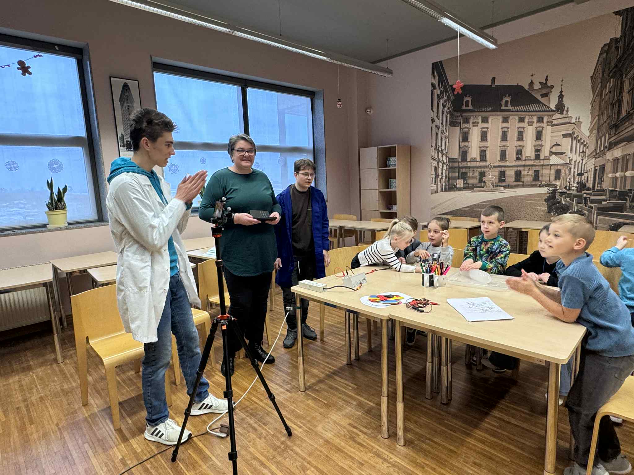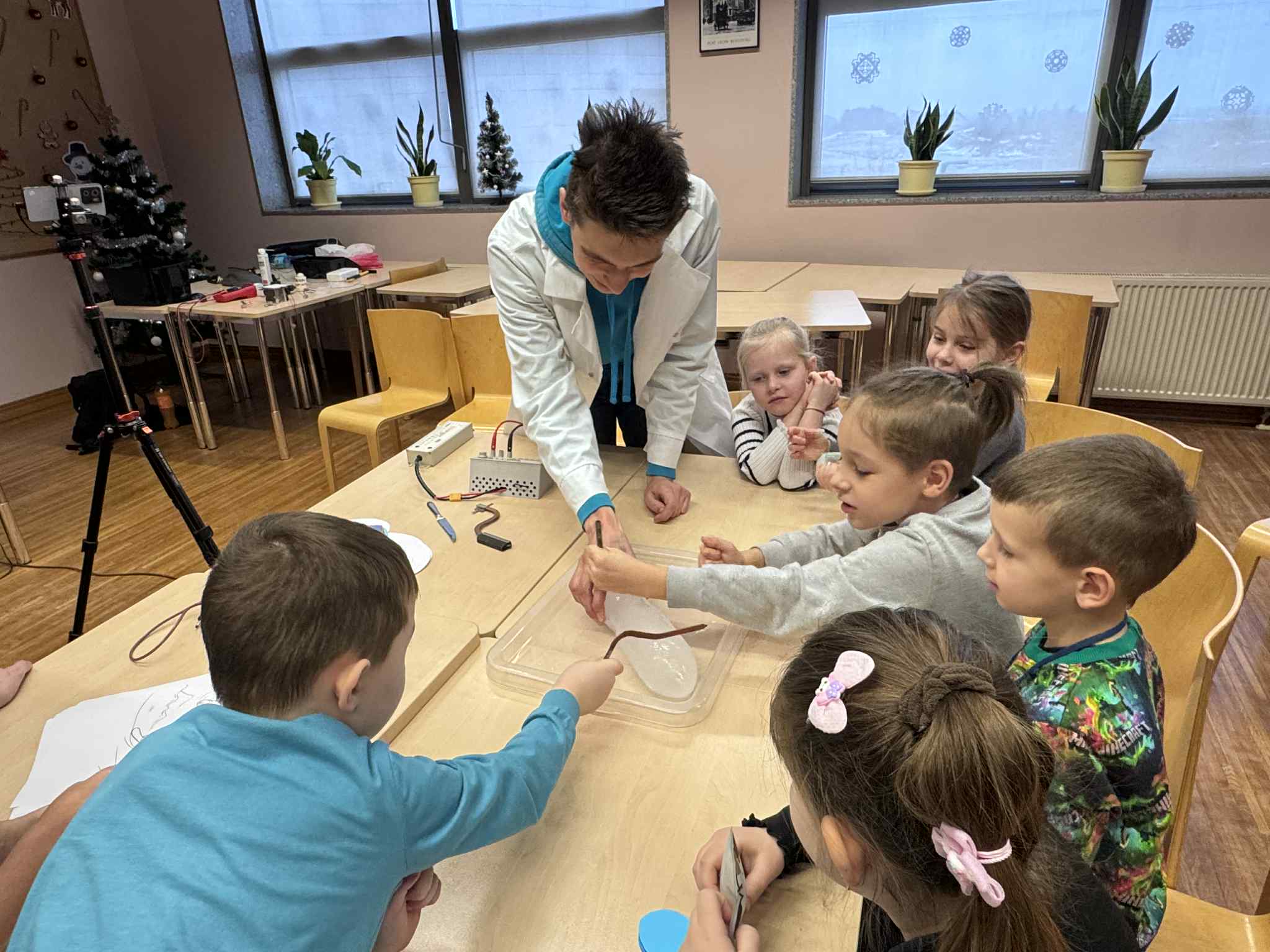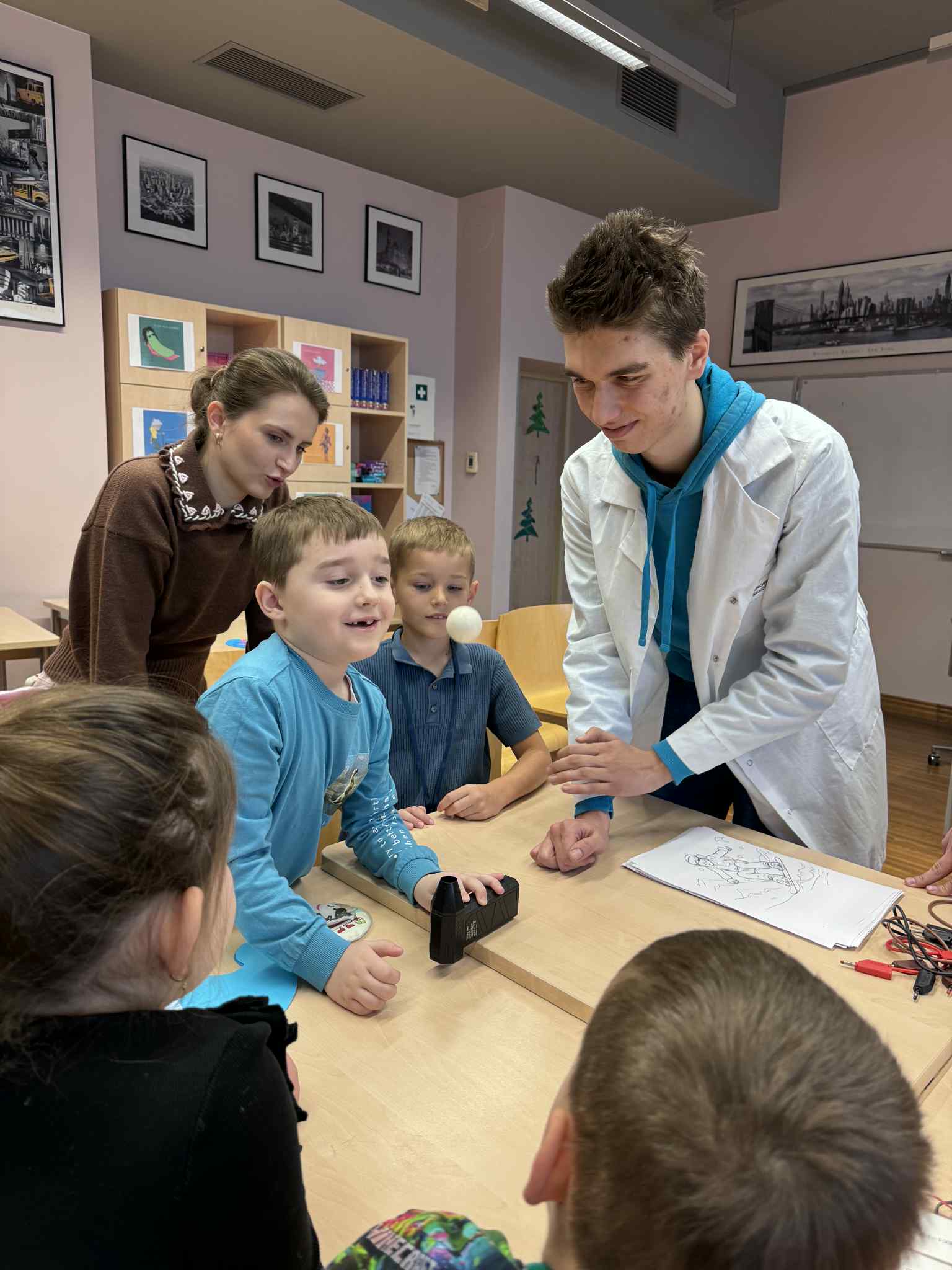 Szóste spotkanie w ramach Uniwersytetu Dziecięcego było pełne radości, ruchu i naukowych emocji. Podczas części językowej dzieci utrwalały nazwy części ciała oraz elementów ubrań w języku angielskim. Wykorzystując kreatywne zadania z bałwankami, mali studenci nazywali, dopasowywali i „ubierali” swoje postacie, ucząc się poprzez działanie, ruch i zabawę. Dzięki temu nauka słownictwa była naturalna i bardzo angażująca. Część zajęć z fizyki poprowadzona została przez uczniów technikum, którzy zaprezentowali dzieciom różnorodne eksperymenty naukowe. Pokazy wywołały ogromne zainteresowanie, zachwyt i mnóstwo pytań. Dzieci mogły obserwować zjawiska fizyczne z bliska, a nauka stała się prawdziwym widowiskiem.