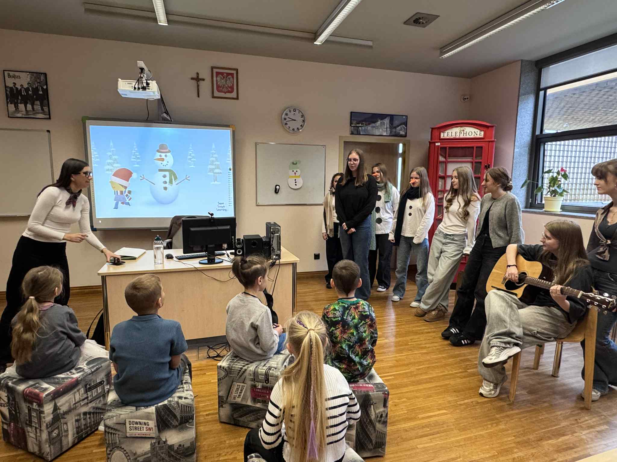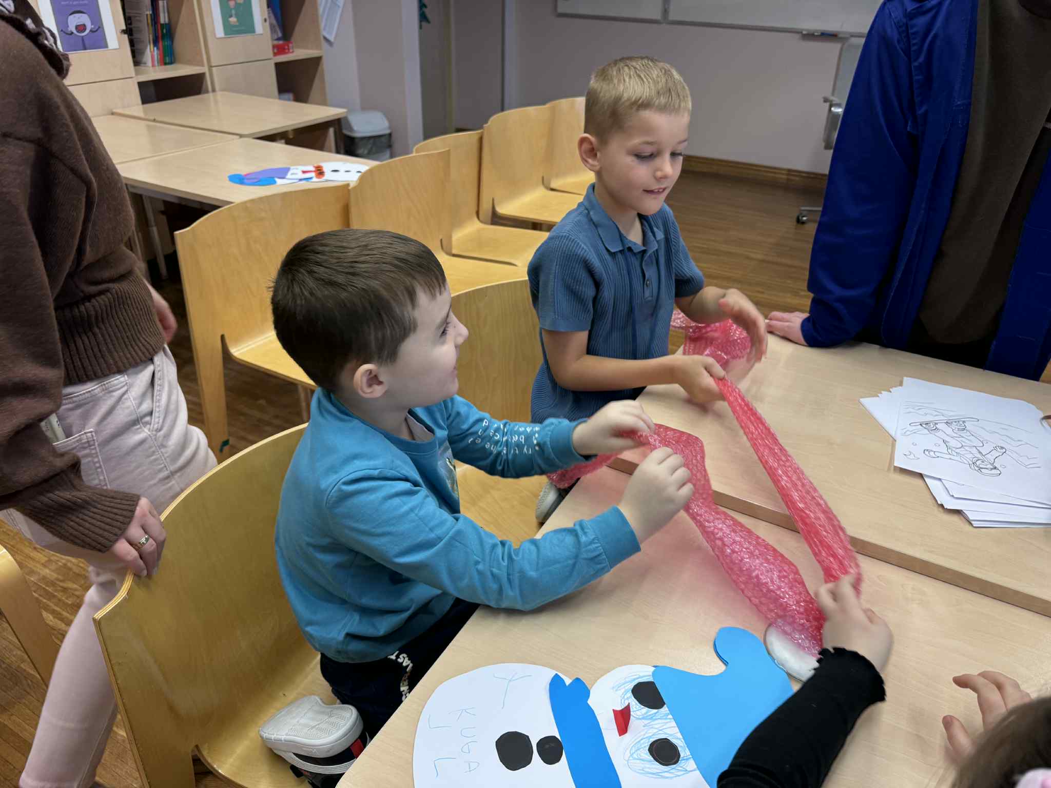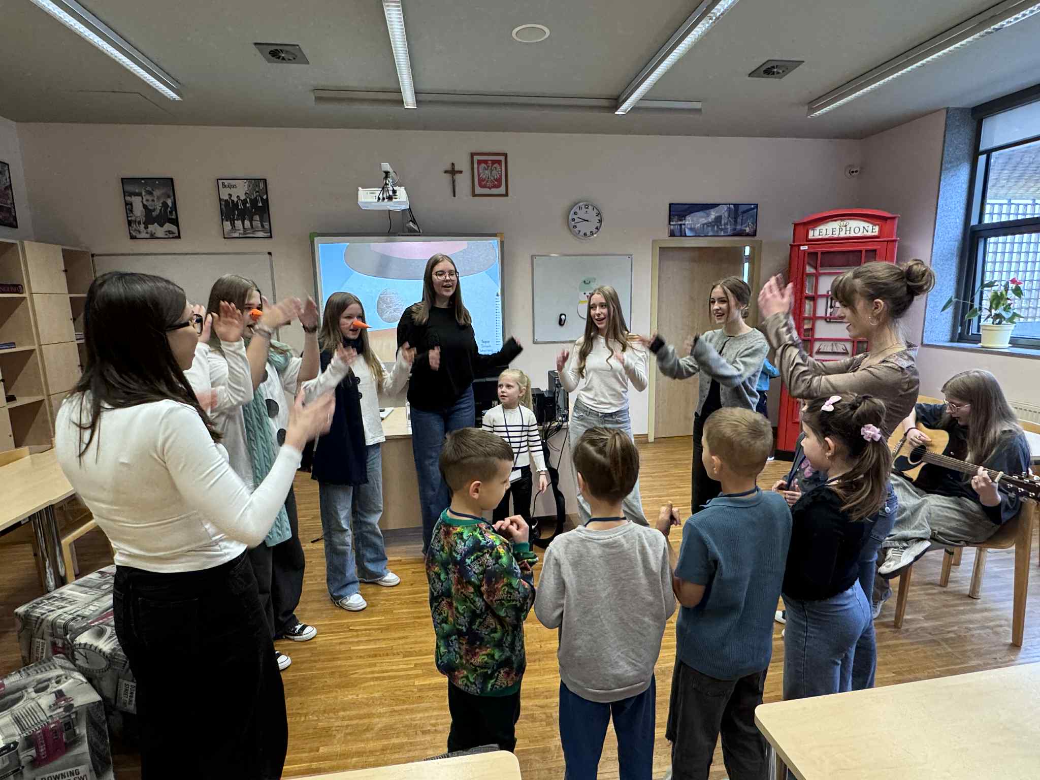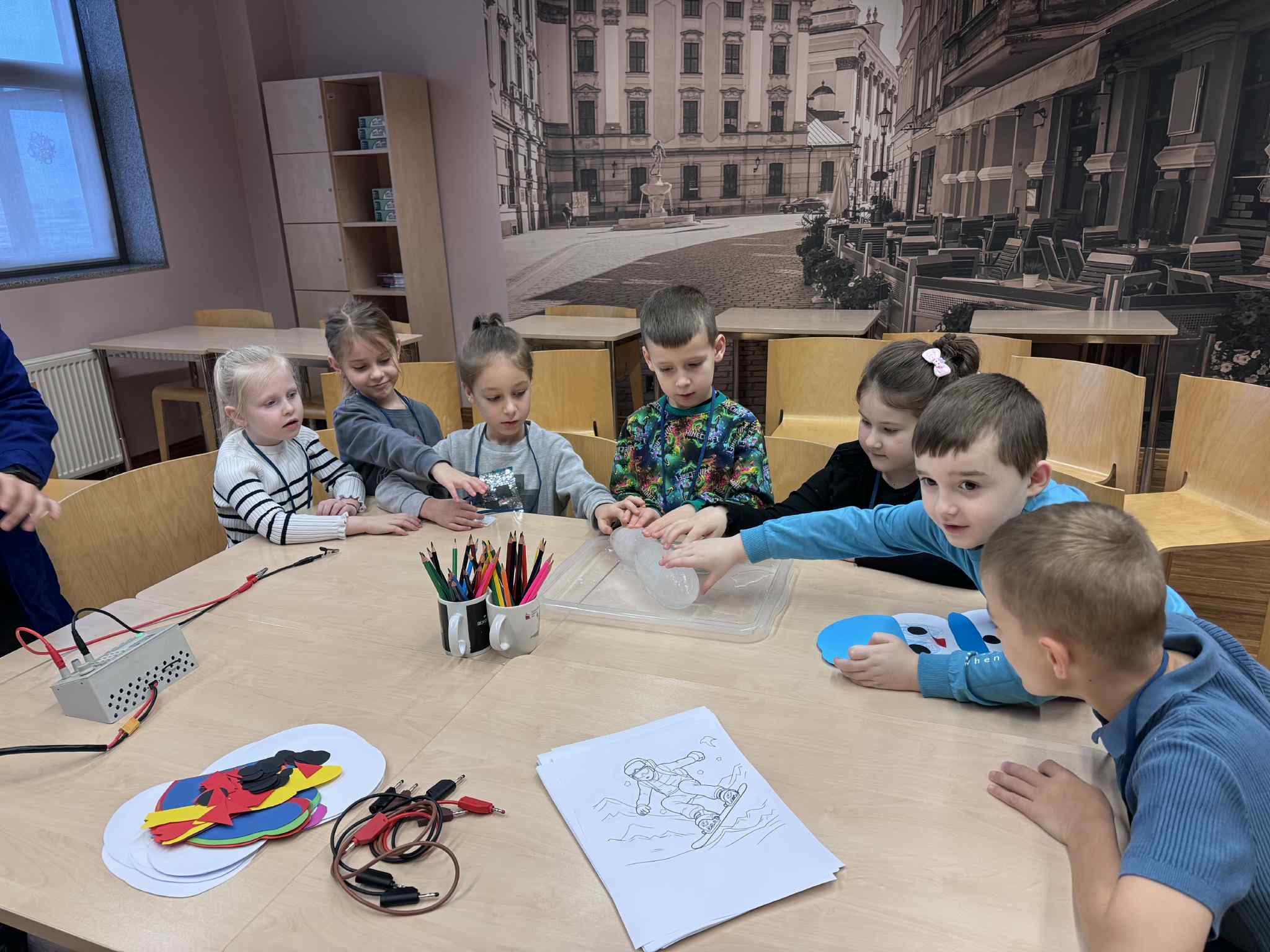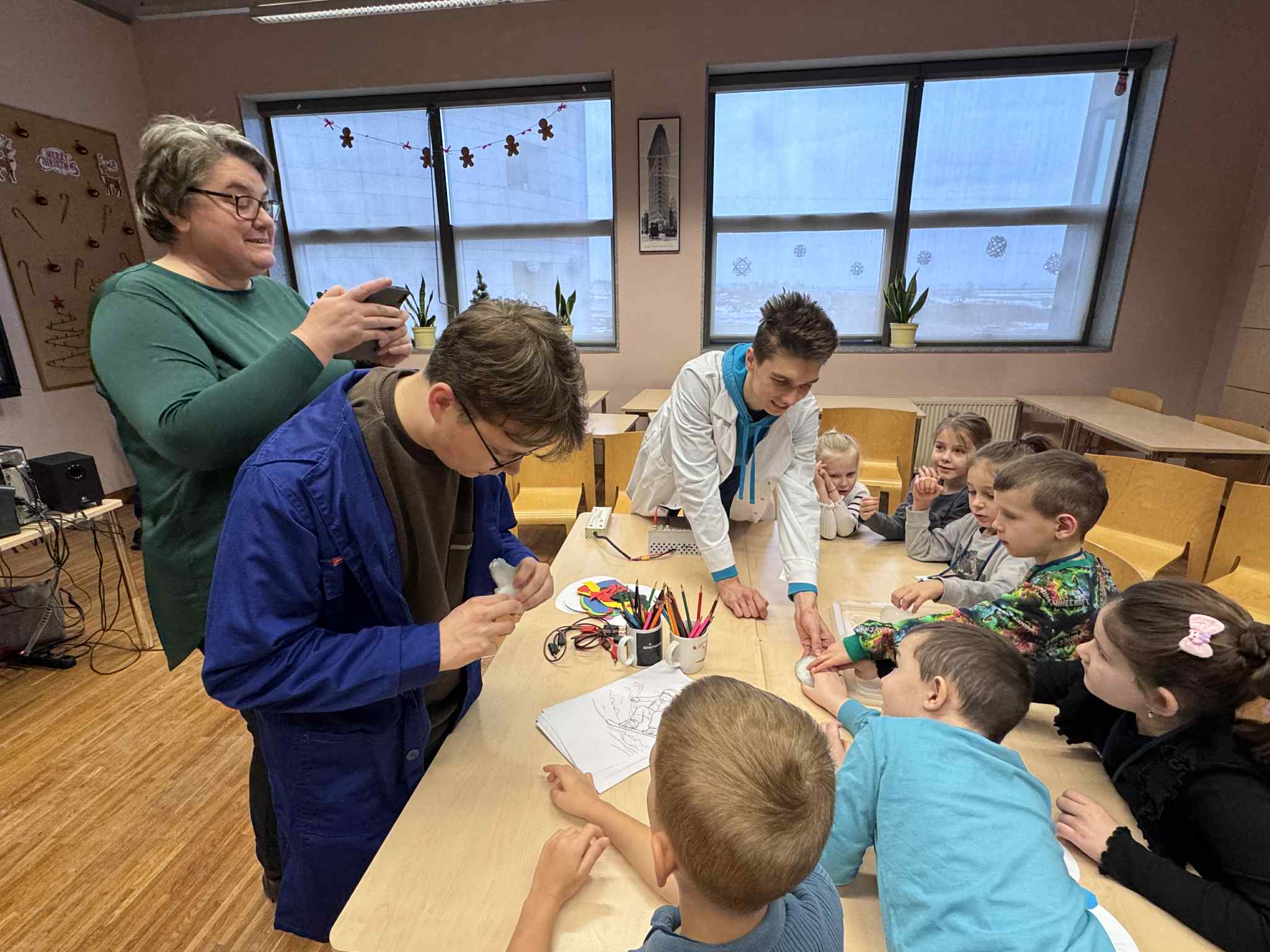 Szóste spotkanie w ramach Uniwersytetu Dziecięcego było pełne radości, ruchu i naukowych emocji. Podczas części językowej dzieci utrwalały nazwy części ciała oraz elementów ubrań w języku angielskim. Wykorzystując kreatywne zadania z bałwankami, mali studenci nazywali, dopasowywali i „ubierali” swoje postacie, ucząc się poprzez działanie, ruch i zabawę. Dzięki temu nauka słownictwa była naturalna i bardzo angażująca. Część zajęć z fizyki poprowadzona została przez uczniów technikum, którzy zaprezentowali dzieciom różnorodne eksperymenty naukowe. Pokazy wywołały ogromne zainteresowanie, zachwyt i mnóstwo pytań. Dzieci mogły obserwować zjawiska fizyczne z bliska, a nauka stała się prawdziwym widowiskiem.