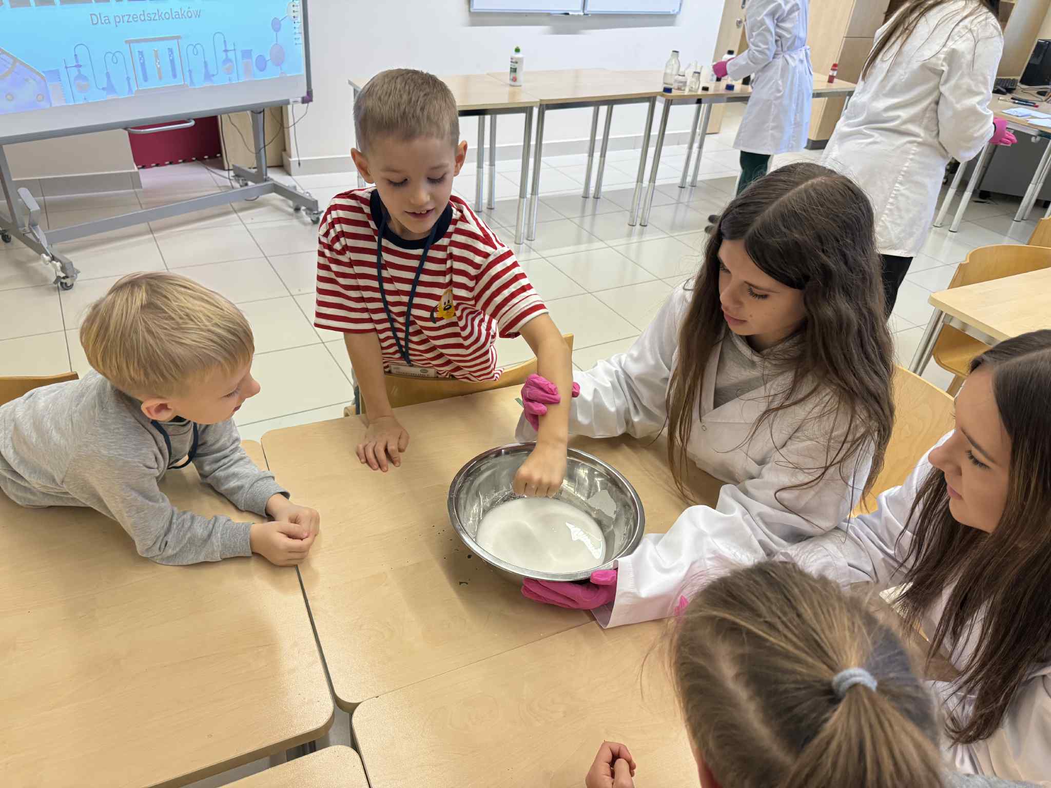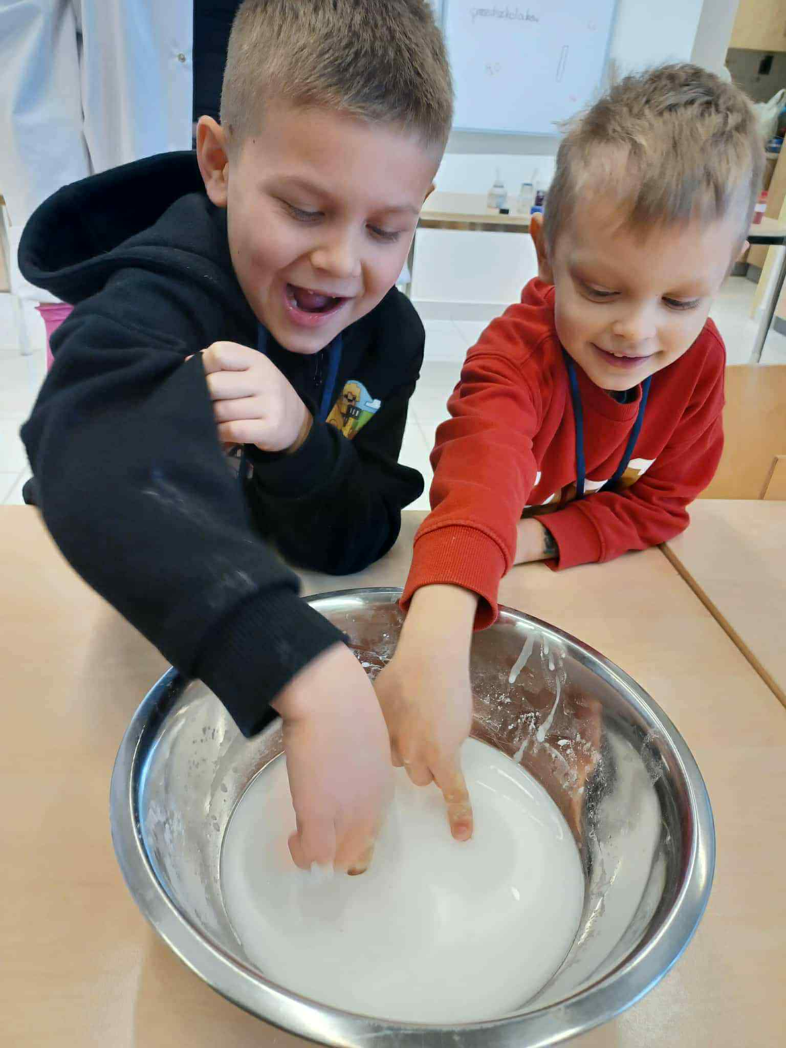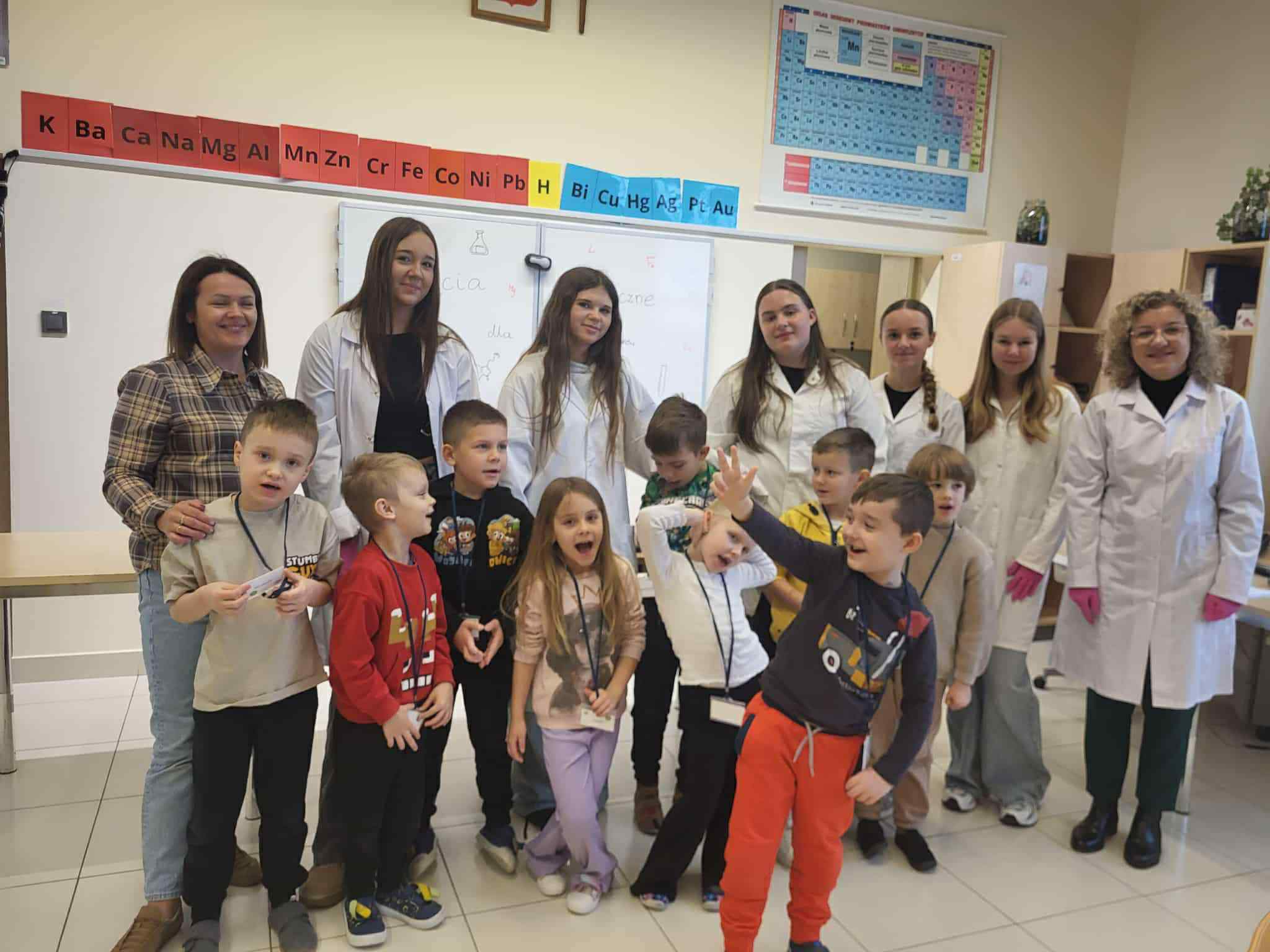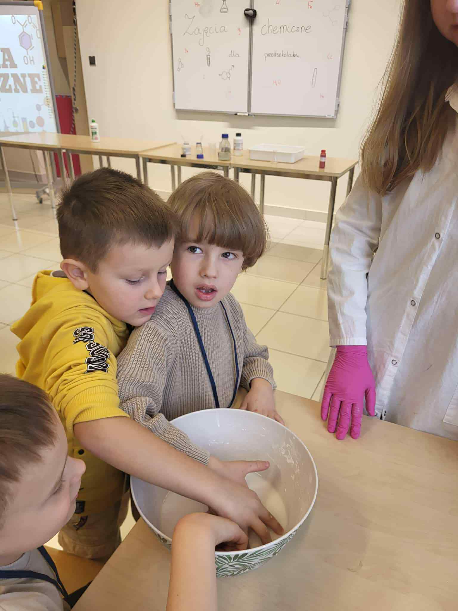 Podczas trzeciego spotkania w ramach Uniwersytetu Dziecięcego przedszkolaki uczestniczyły w wyjątkowych zajęciach chemicznych połączonych z nauką języka angielskiego. Dzieci miały okazję samodzielnie poznawać właściwości cieczy nienewtonowskiej, dotykając i obserwując, jak zmienia się jej zachowanie pod wpływem siły. Dużo emocji wzbudziło również tworzenie domowego wulkanu, który efektownie „wybuchał” dzięki reakcji chemicznej. Kolejnym doświadczeniem było eksperymentowanie z pieprzem i wodą, podczas którego dzieci obserwowały, jak powierzchnia wody reaguje na dodanie detergentu. Część językowa zajęć również była pełna wrażeń, ponieważ odwiedził nas prawdziwy Mikołaj! Wspólne spotkanie pozwoliło dzieciom utrwalić i poszerzyć słownictwo związane z zabawkami w języku angielskim. Przedszkolaki aktywnie uczestniczyły w zabawach językowych, nazywając otrzymane prezenty oraz przedmioty umieszczone w świątecznym worku.Zajęcia były pełne radości, odkryć i świątecznej atmosfery, a dzieci z zaangażowaniem brały udział zarówno w eksperymentach, jak i aktywnościach językowych.