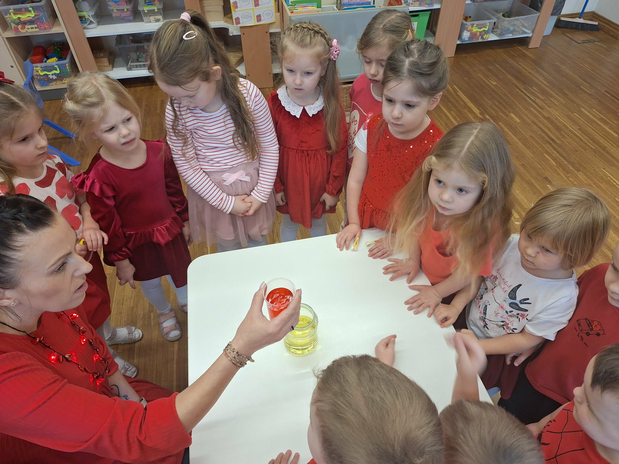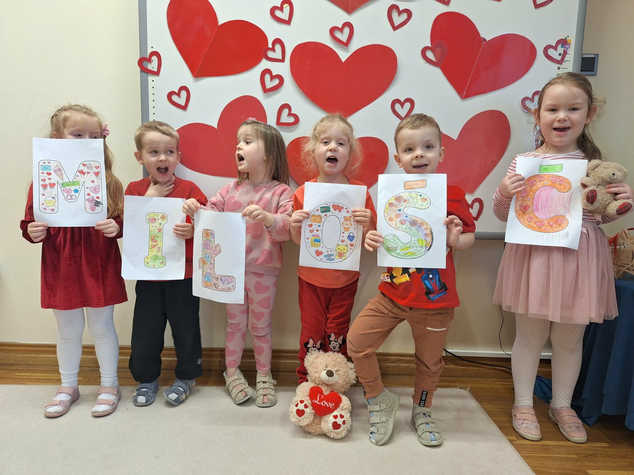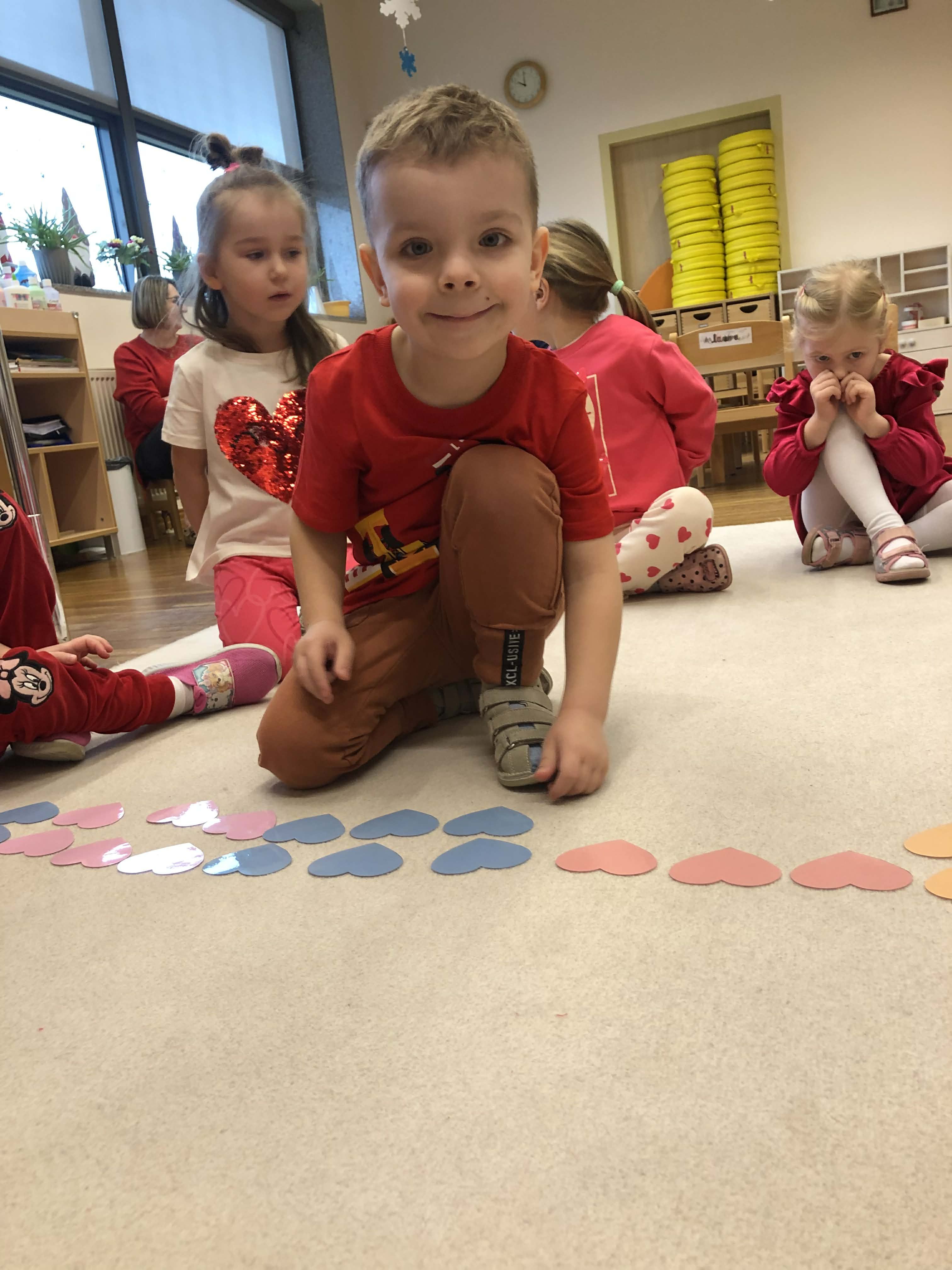 13 lutego w naszej grupie obchodziliśmy Walentynki. Dzieci ubrane na czerwono uczestniczyły w wielu radosnych aktywnościach. Na początku poznały historię Walentynek, a następnie wzięły udział w zabawie integracyjnej w „kręgu życzliwości” z misiem, podczas którego przekazując sobie misia mówiły sobie miłe słowa. Przedszkolaki poszukiwały ukrytych w sali serduszek i przyklejały je na wspólny plakat. Nie zabrakło zabaw przy muzyce – dzieci szukały pasujących połówek serc oraz tańczyły, dotykając się różnymi częściami ciała. Było także walentynkowe memory, układanie serduszkowych sekwencji oraz zabawa zręcznościowa „Strzała Amora”, polegająca na trafianiu czerwoną kulką do serduszka. Dzieci wykonywały również prace plastyczne, kolorowały tematyczne malowanki oraz uczestniczyły w walentynkowych eksperymentach. Był to wesoły, pełen życzliwości i uśmiechu dzień.