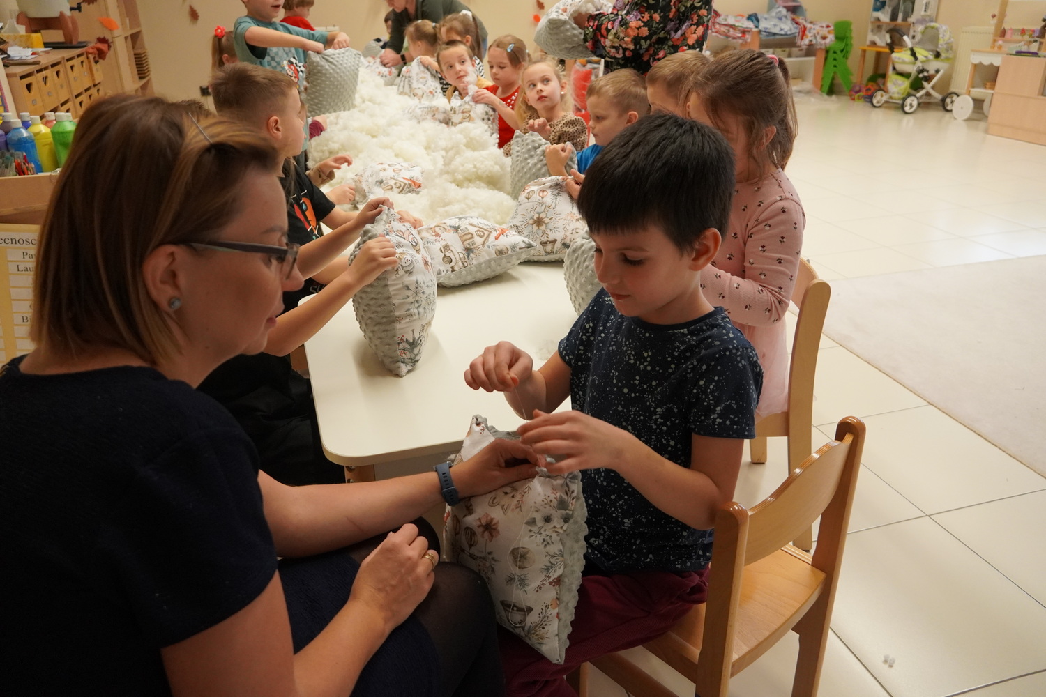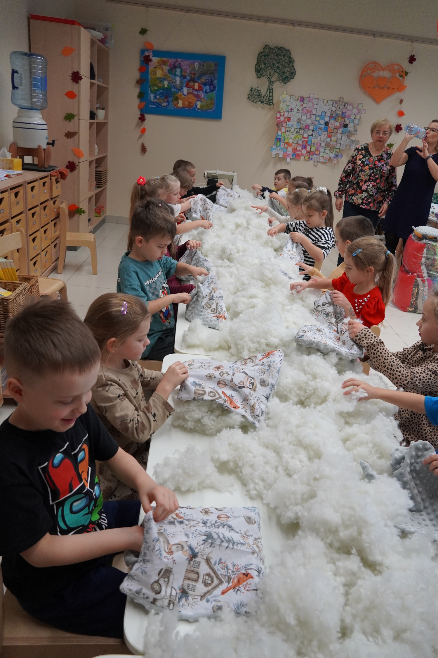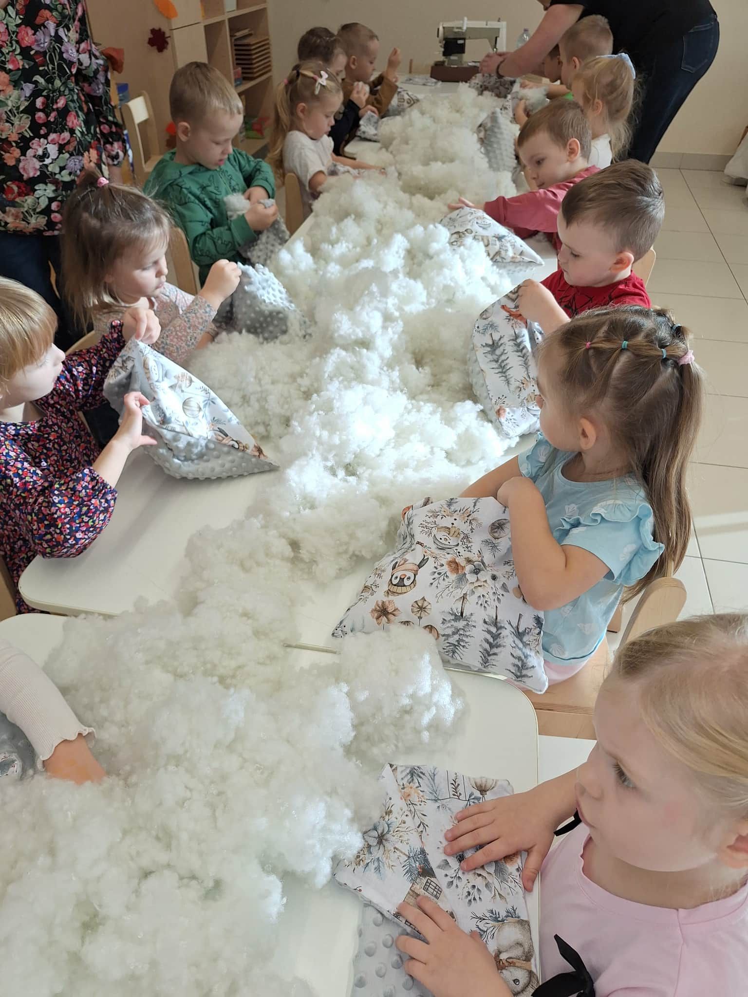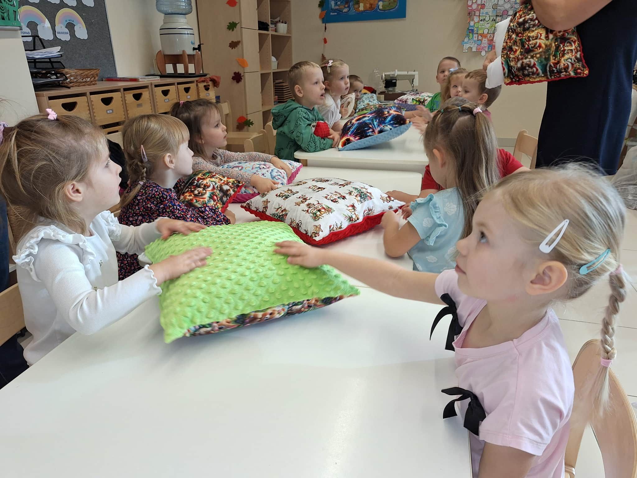 Dzisiaj w naszym przedszkolu odbyły się warsztaty krawieckie . Na początek dzieci zapoznały się z praca krawcowej mogły samodzielnie usiąść przy maszynie i przeszyć kawałek materiału . Kolejnym zadaniem było zrobienie korali z guzików i nitki dzieci bardzo dobrze sobie z tym poradziły z tym wyzwaniem .Na zakończenie dzieci wypełniły poduszki specjalnym wypełniaczem , które następnie panie krawcowe pięknie zaszyły . Zajęcia pozwoliły na rozwijanie zdolności manualnych dzieci kreatywności oraz współpracy. Poduszki, które wykonały dzieci będzie można zakupić 7 grudnia na kiermaszu Charytatywnym a dochód z nich zostanie przekazany dla podopiecznych Fundacji Gajusz .