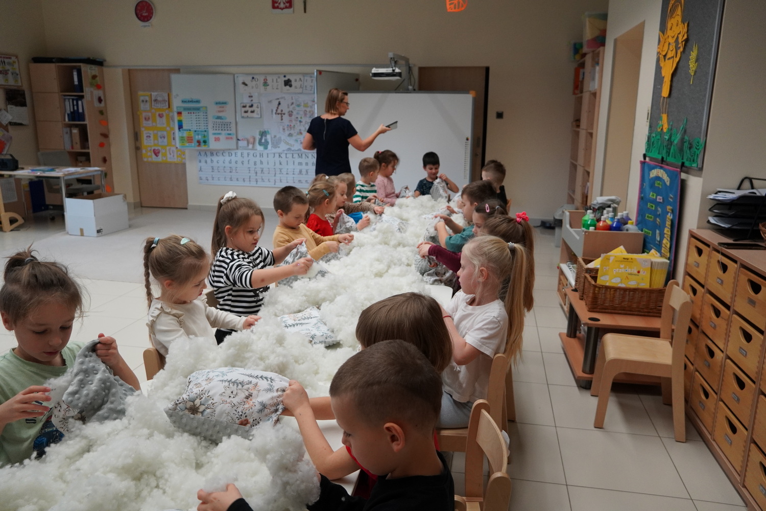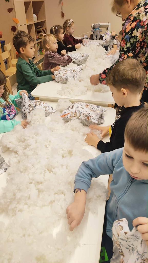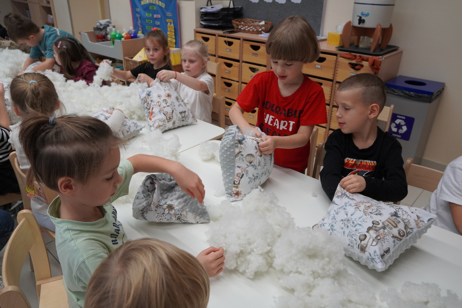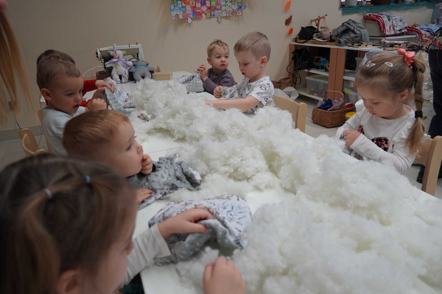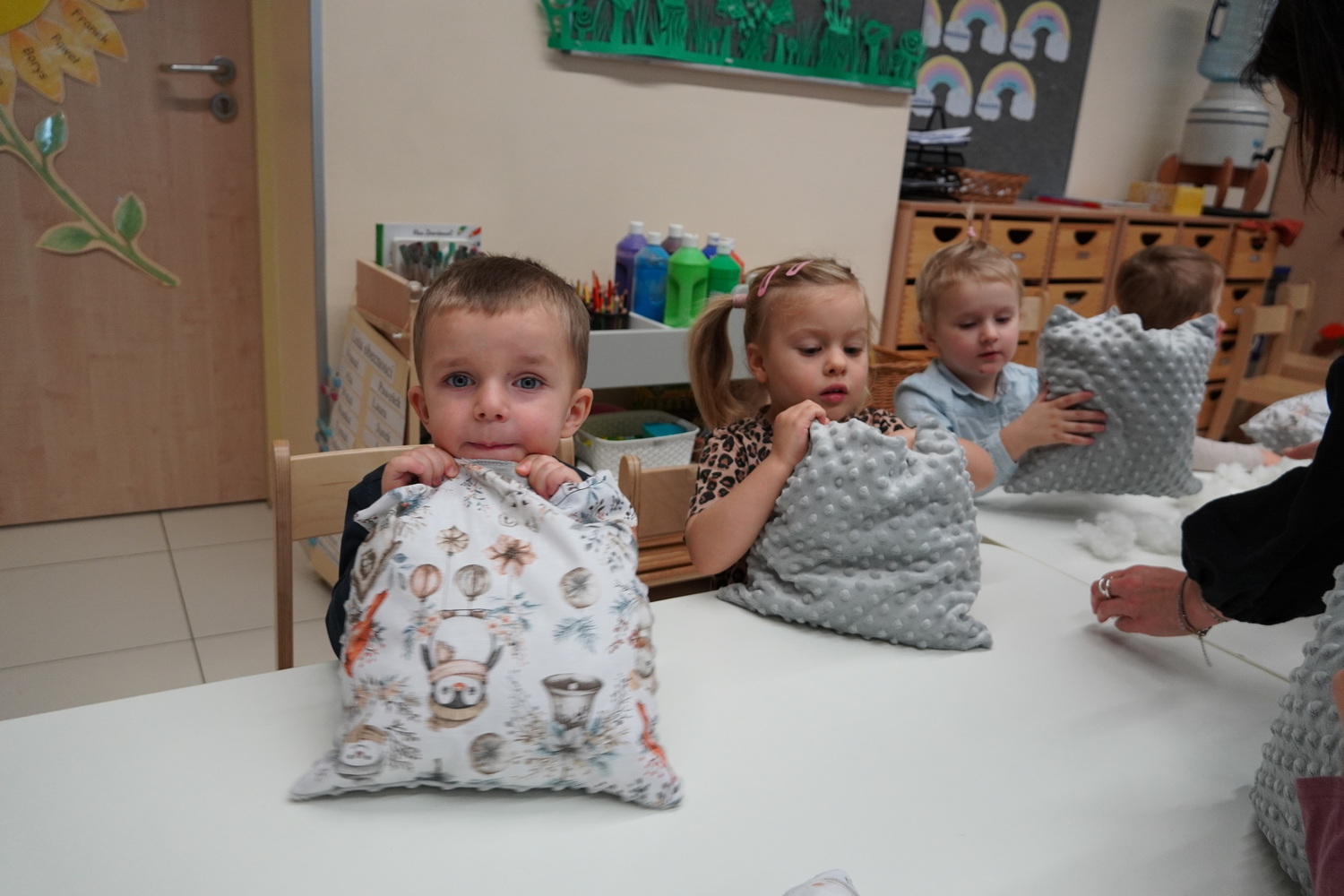 Dzisiaj w naszym przedszkolu odbyły się warsztaty krawieckie . Na początek dzieci zapoznały się z praca krawcowej mogły samodzielnie usiąść przy maszynie i przeszyć kawałek materiału . Kolejnym zadaniem było zrobienie korali z guzików i nitki dzieci bardzo dobrze sobie z tym poradziły z tym wyzwaniem .Na zakończenie dzieci wypełniły poduszki specjalnym wypełniaczem , które następnie panie krawcowe pięknie zaszyły . Zajęcia pozwoliły na rozwijanie zdolności manualnych dzieci kreatywności oraz współpracy. Poduszki, które wykonały dzieci będzie można zakupić 7 grudnia na kiermaszu Charytatywnym a dochód z nich zostanie przekazany dla podopiecznych Fundacji Gajusz .