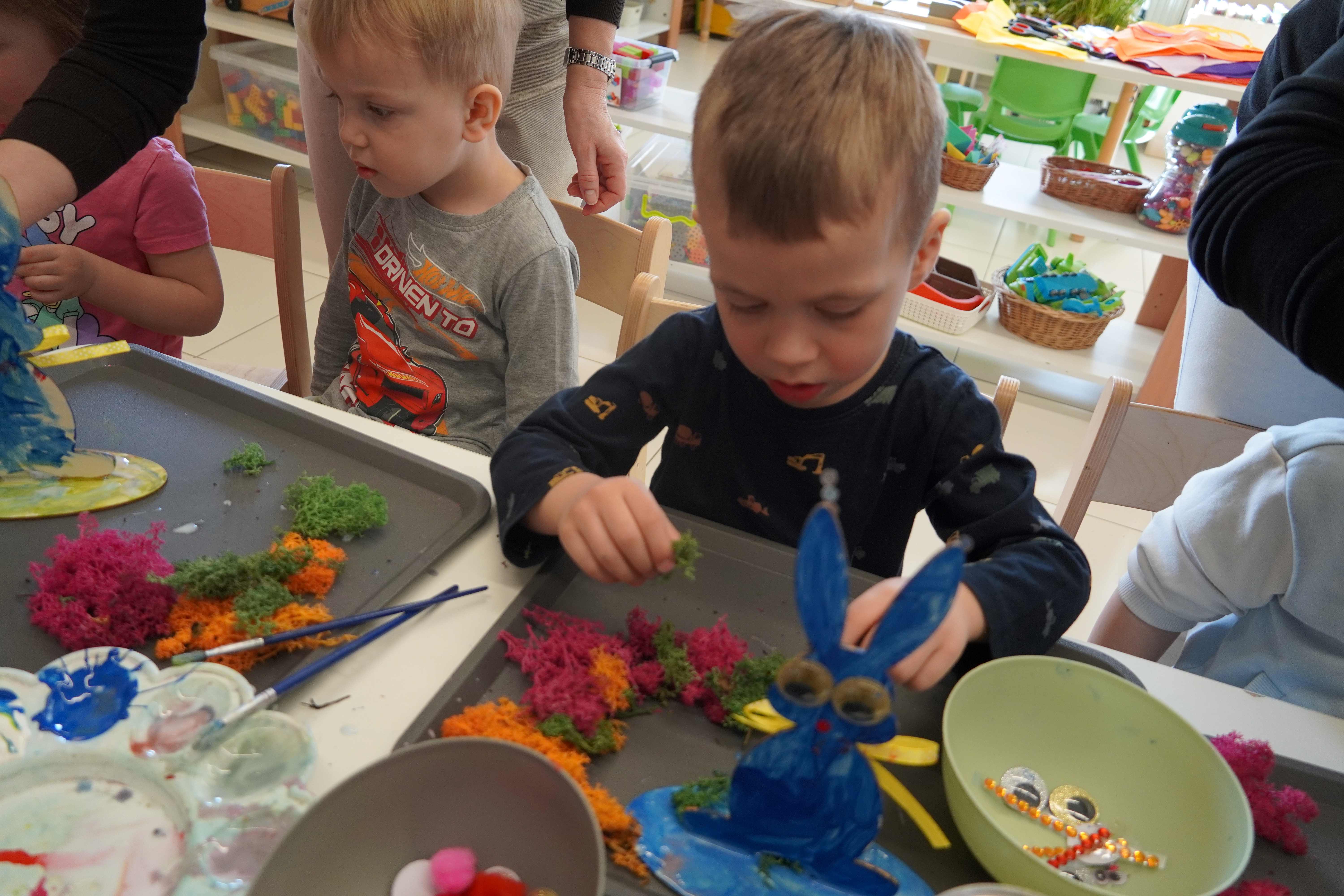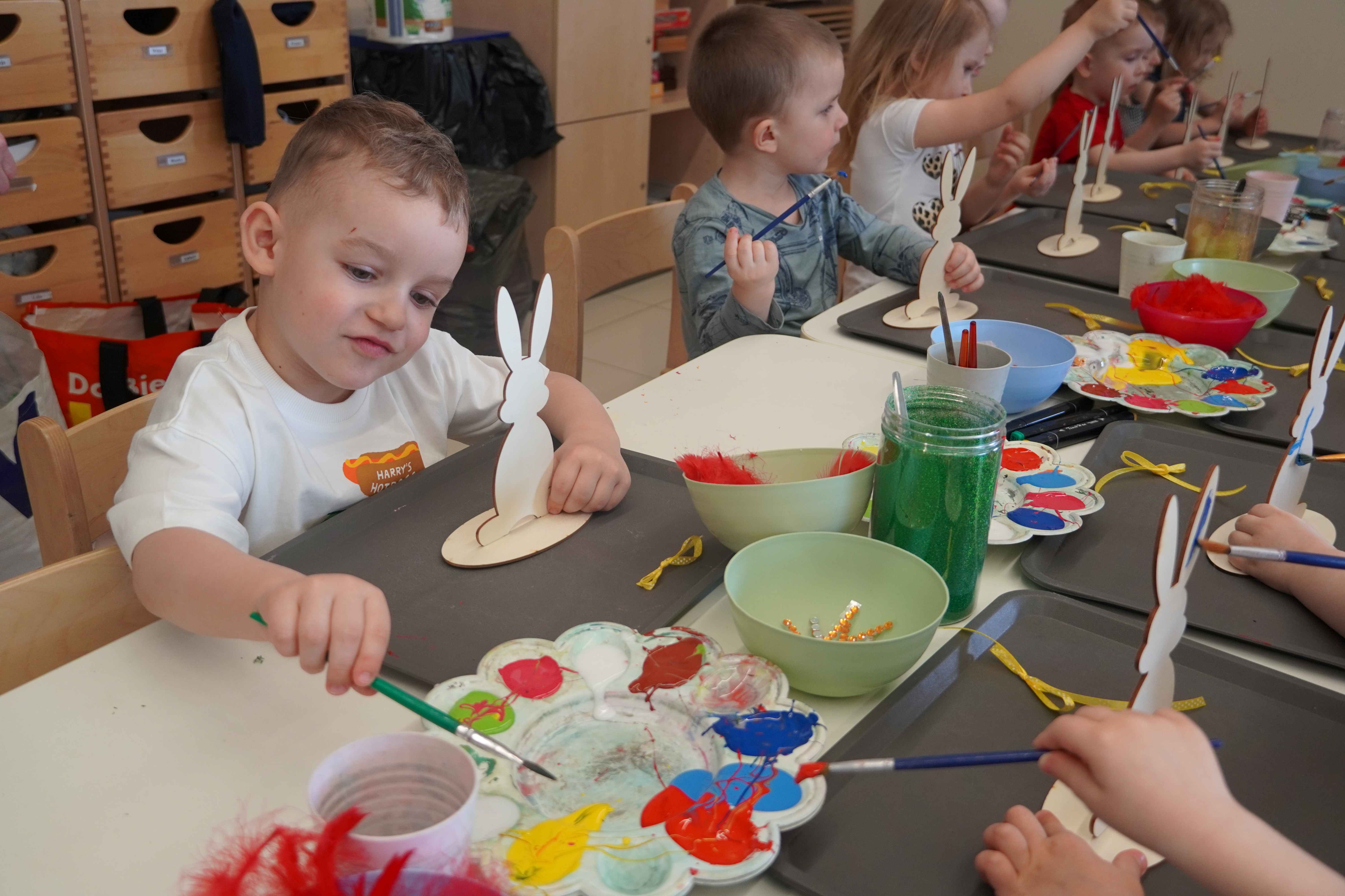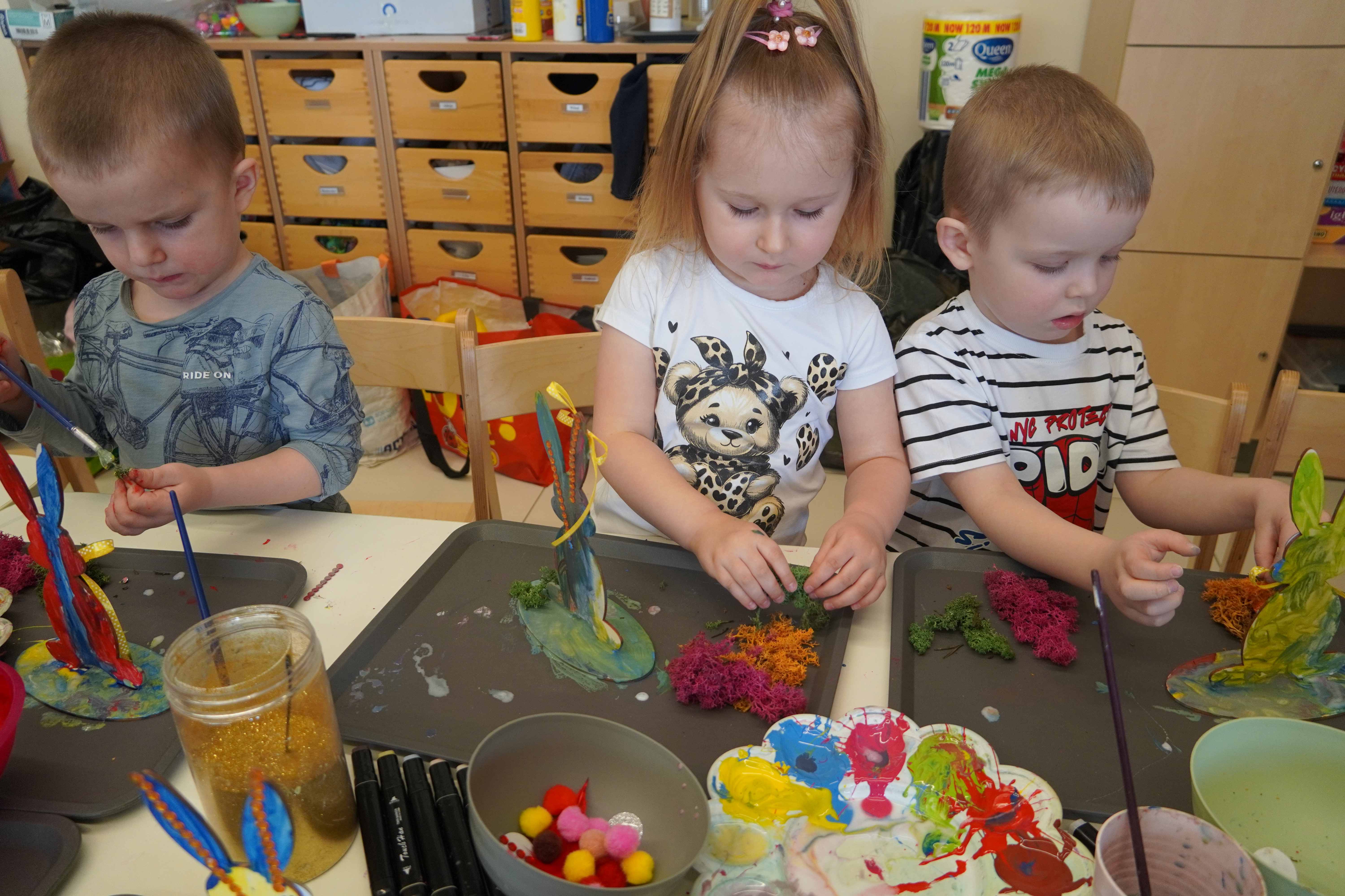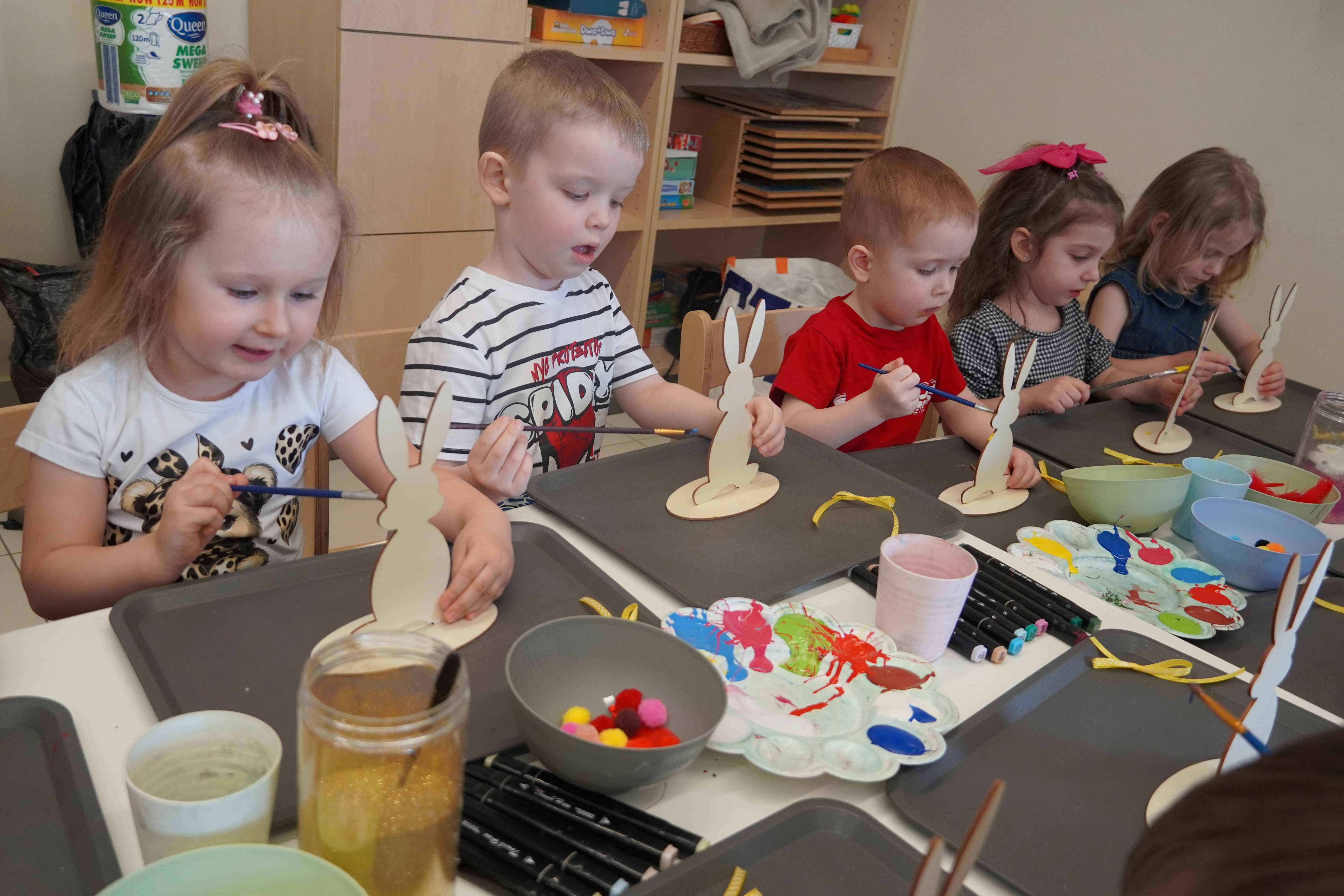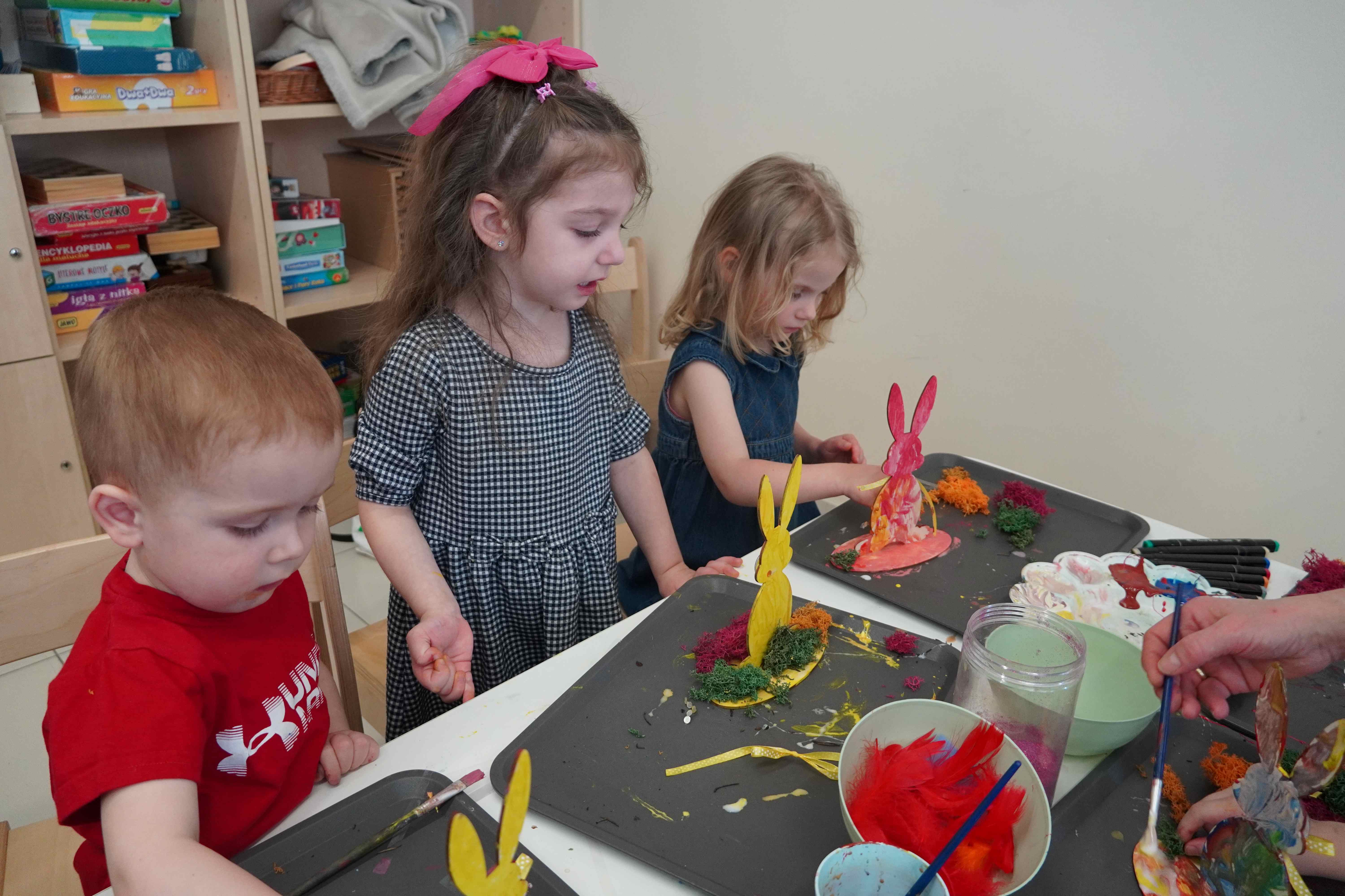 Najmłodsi, czyli 3 i 4-latki, pracowali nad drewnianymi zającami. Z wielkim skupieniem malowali figurki i ozdabiali je kolorowym mchem, piórkami oraz puszystymi pomponami. Praca z różnymi strukturami była dla maluchów świetną zabawą sensoryczną, a każdy zając zyskał swój unikalny, radosny charakter. Te drewniane dekoracje będą teraz najpiękniejszą pamiątką nadchodzących świąt.