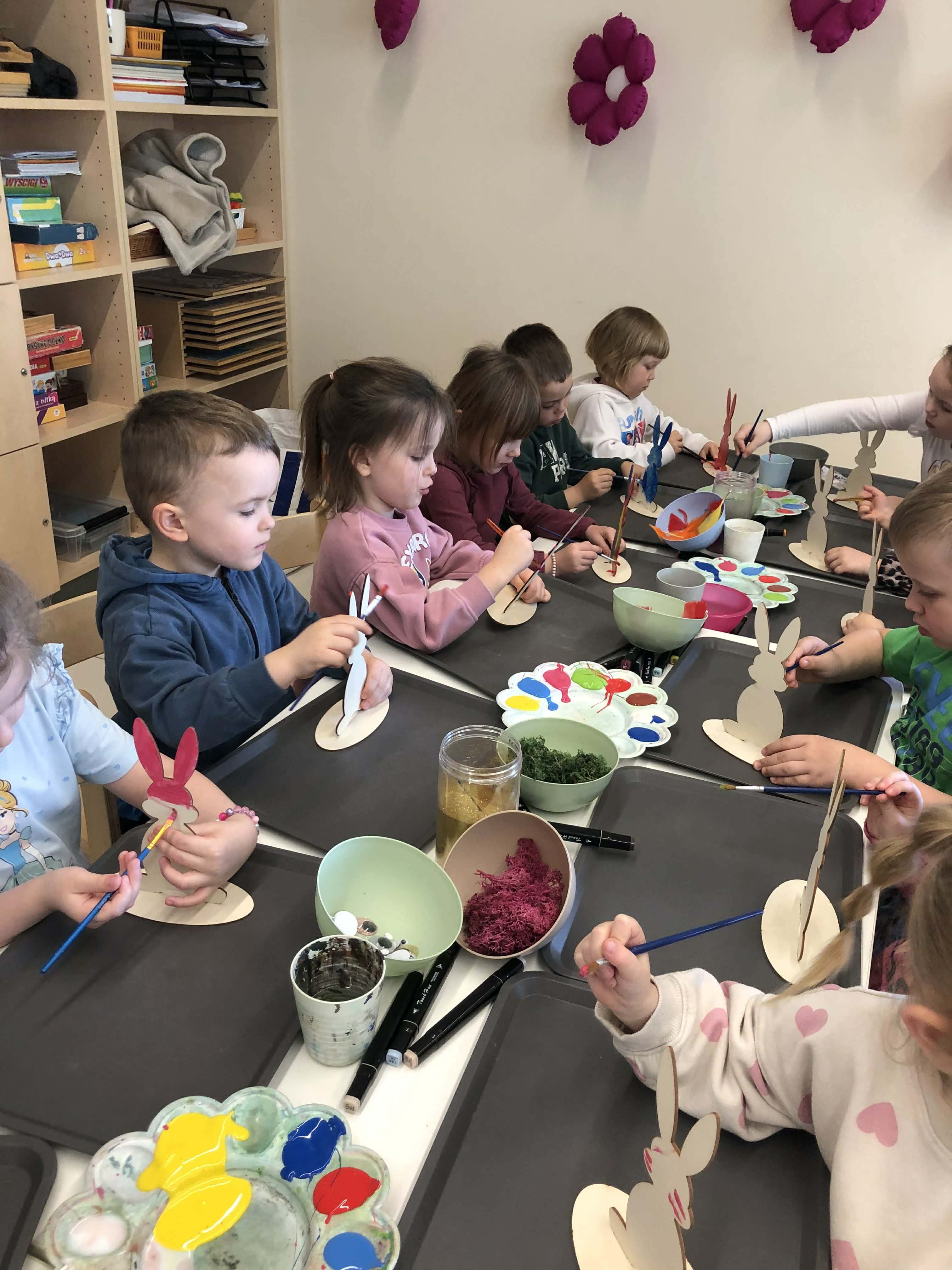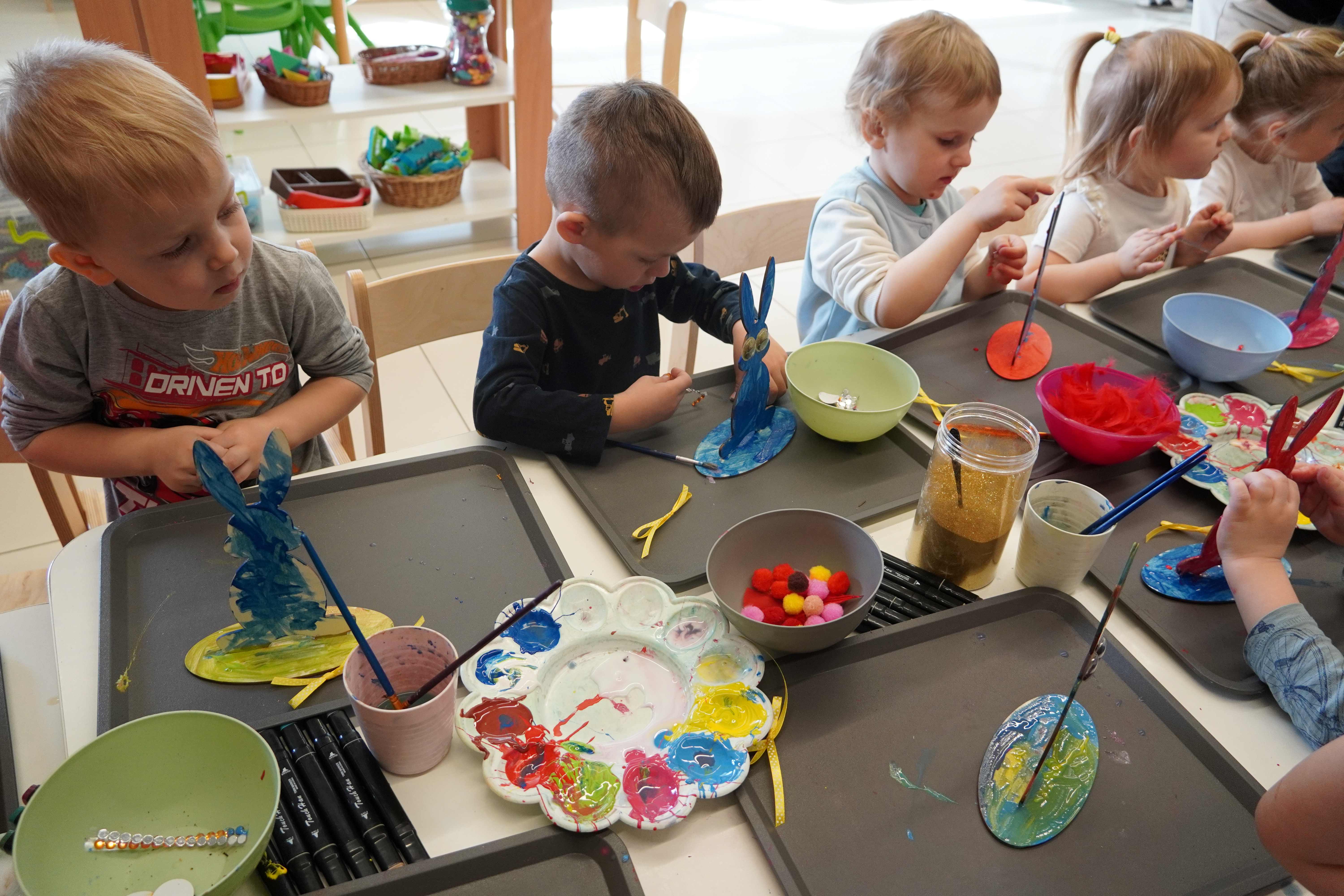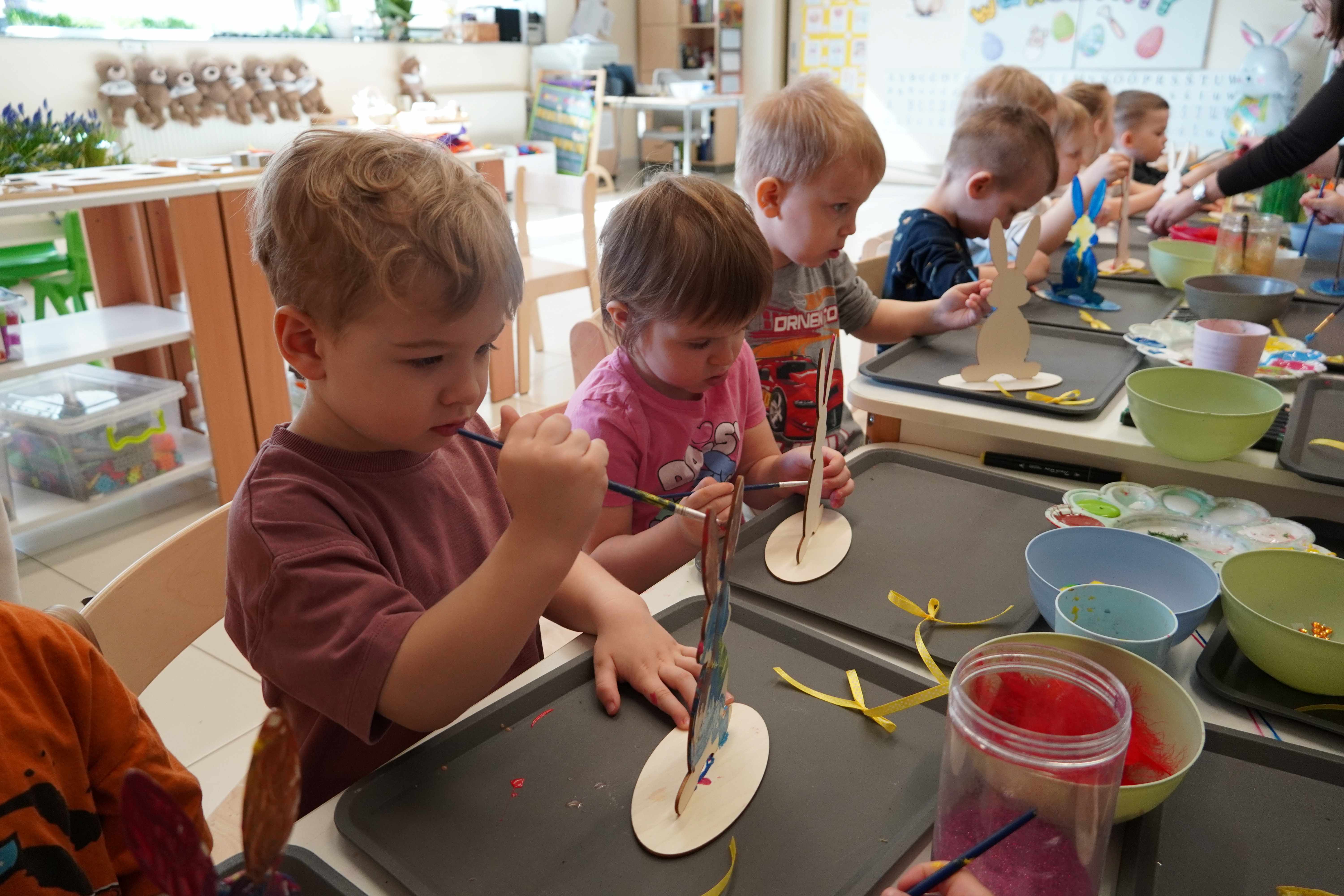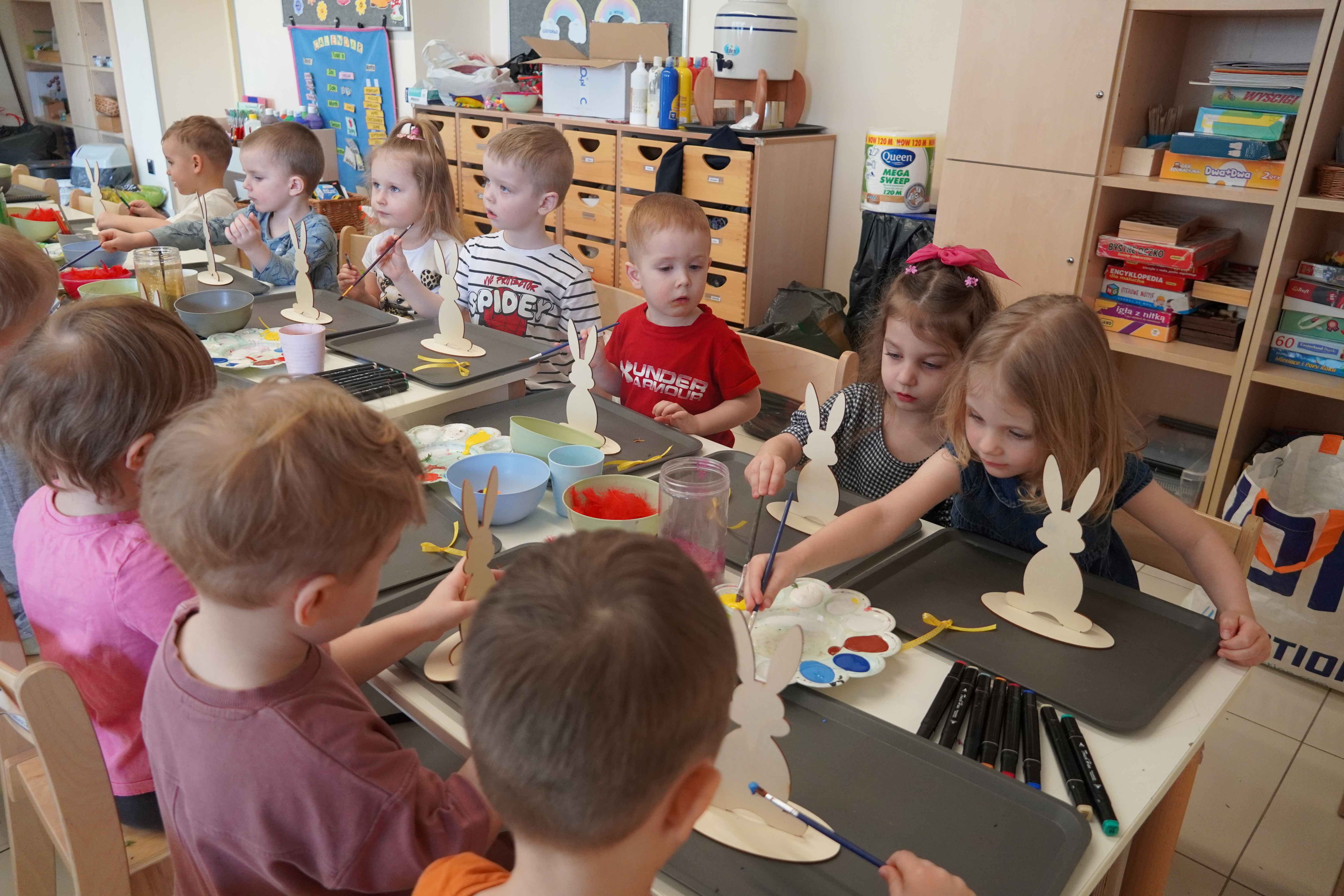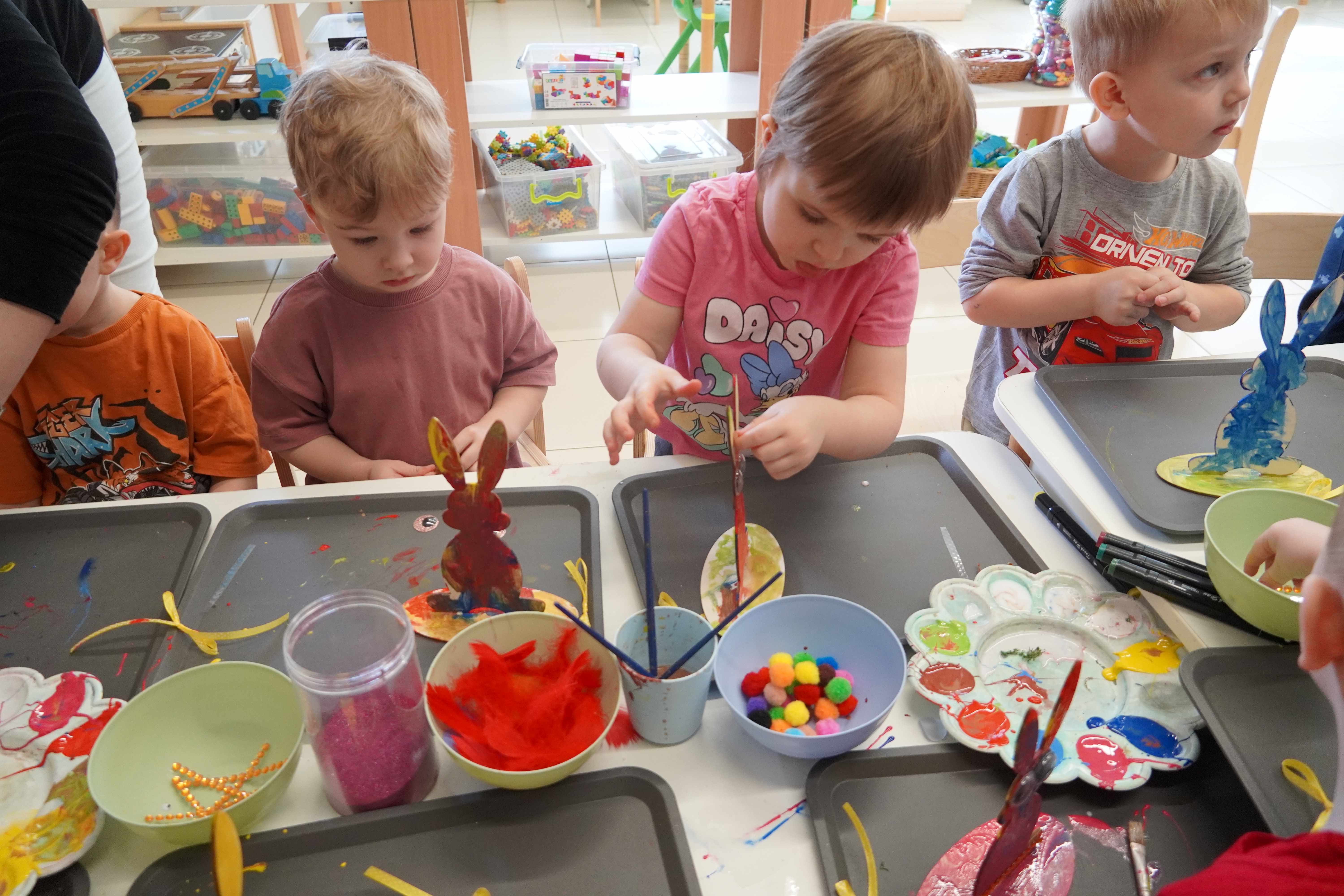 Najmłodsi, czyli 3 i 4-latki, pracowali nad drewnianymi zającami. Z wielkim skupieniem malowali figurki i ozdabiali je kolorowym mchem, piórkami oraz puszystymi pomponami. Praca z różnymi strukturami była dla maluchów świetną zabawą sensoryczną, a każdy zając zyskał swój unikalny, radosny charakter. Te drewniane dekoracje będą teraz najpiękniejszą pamiątką nadchodzących świąt.