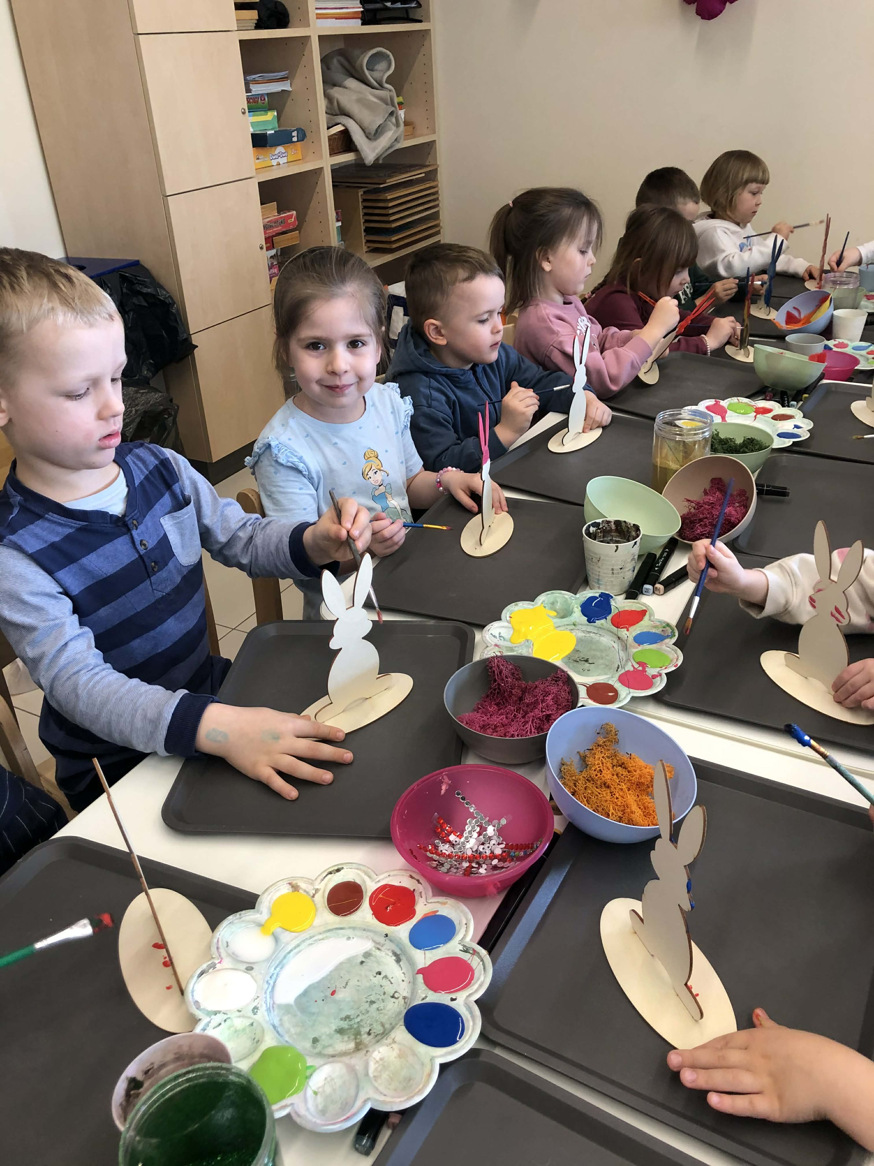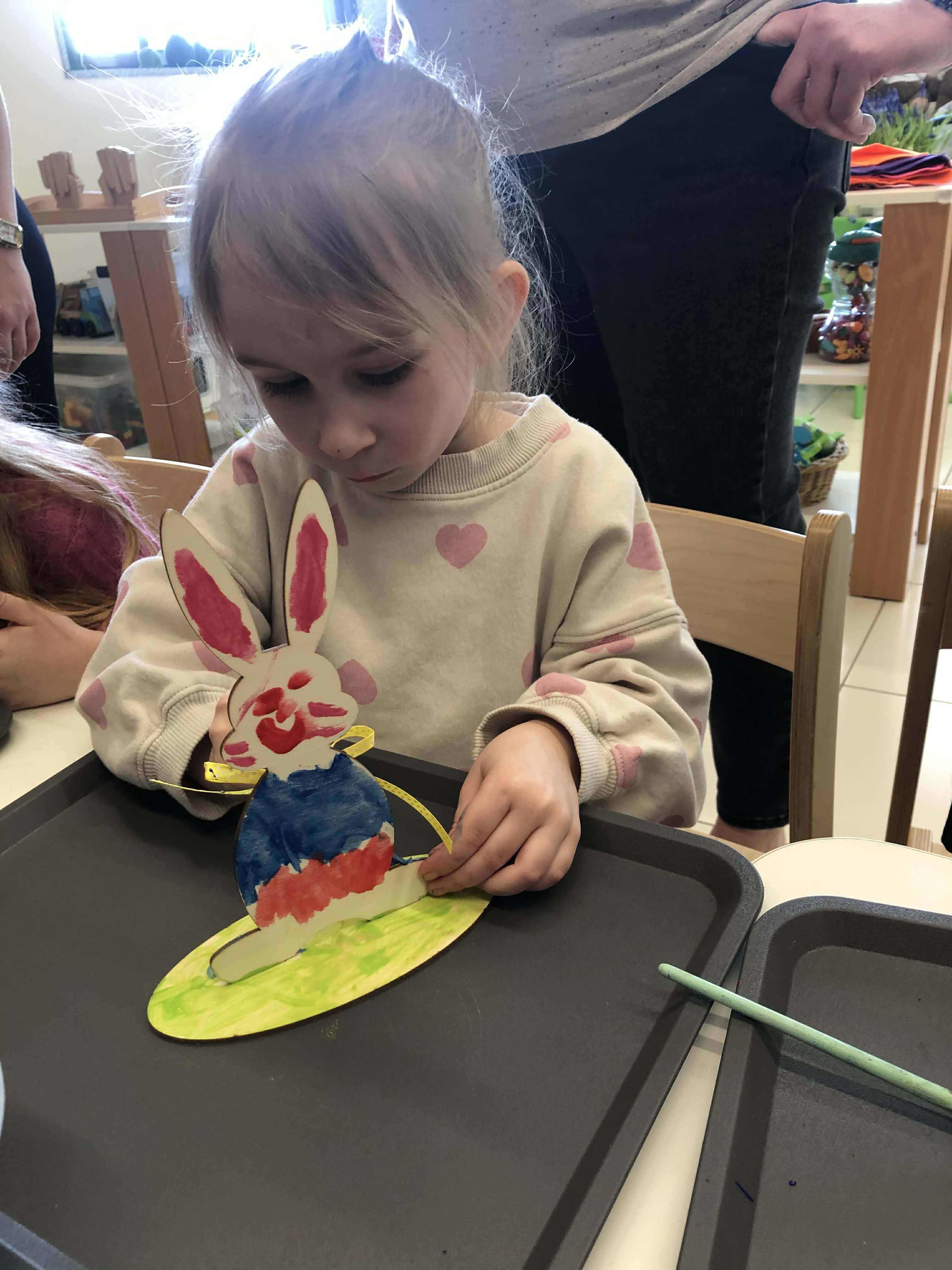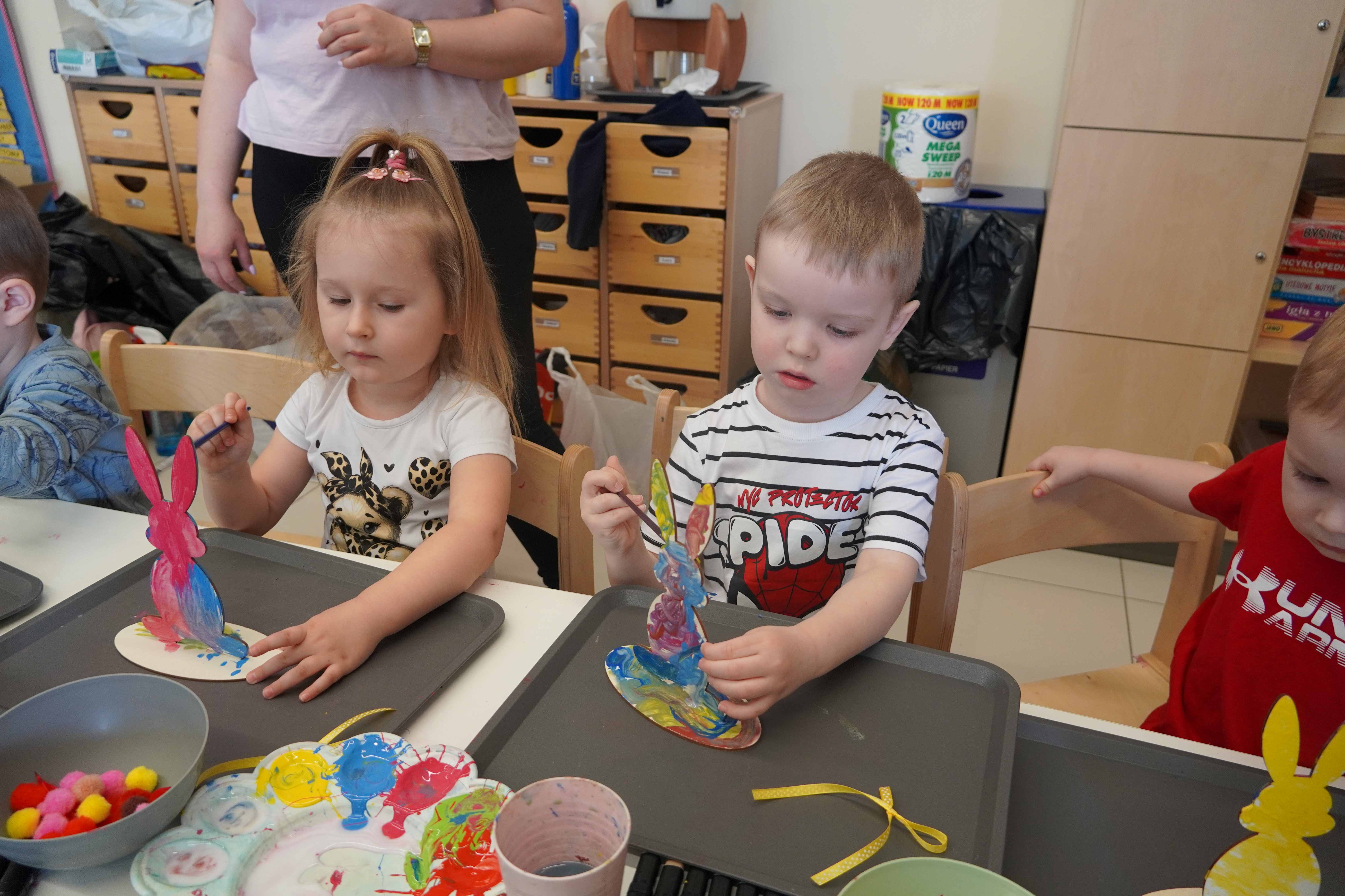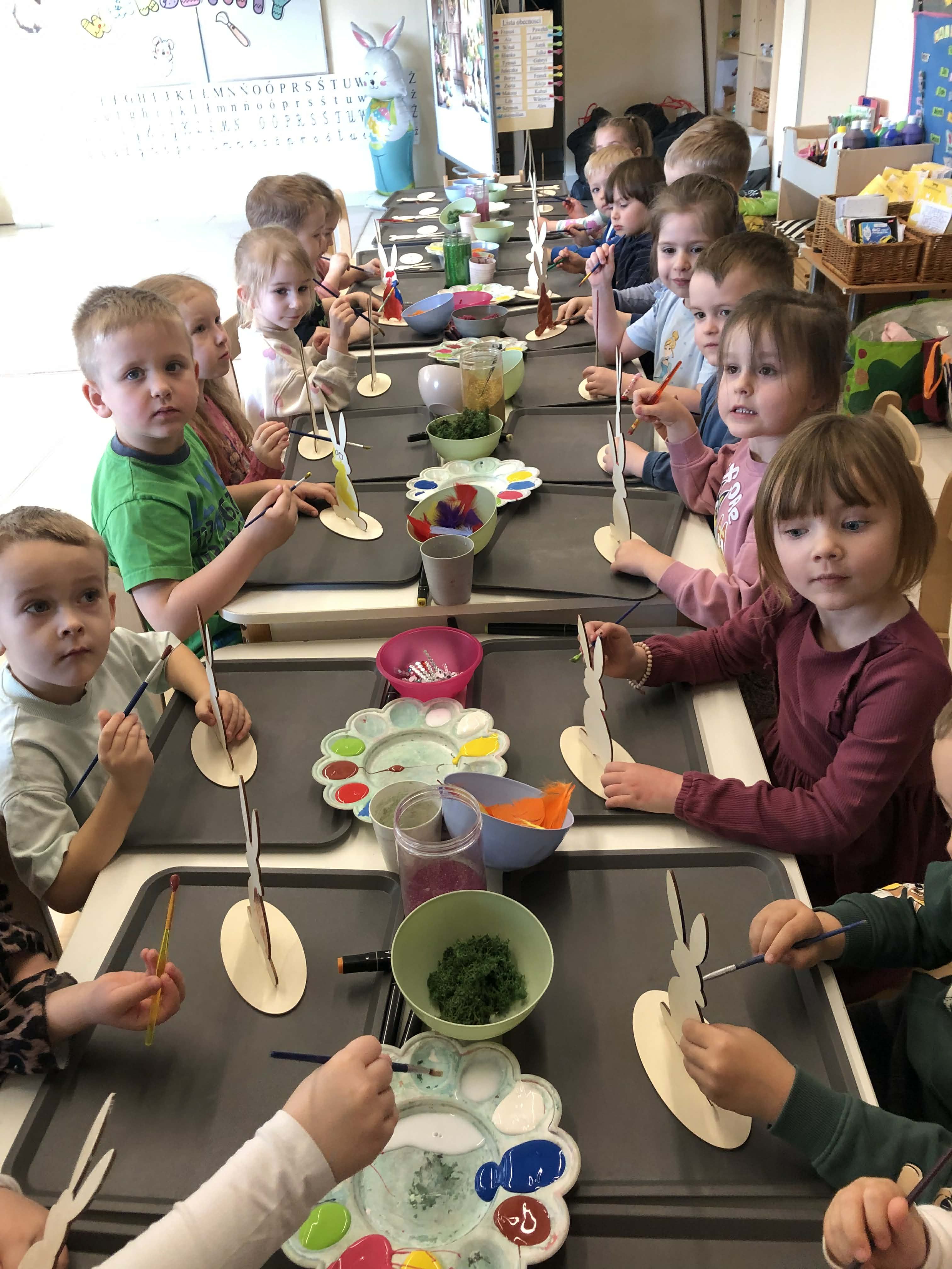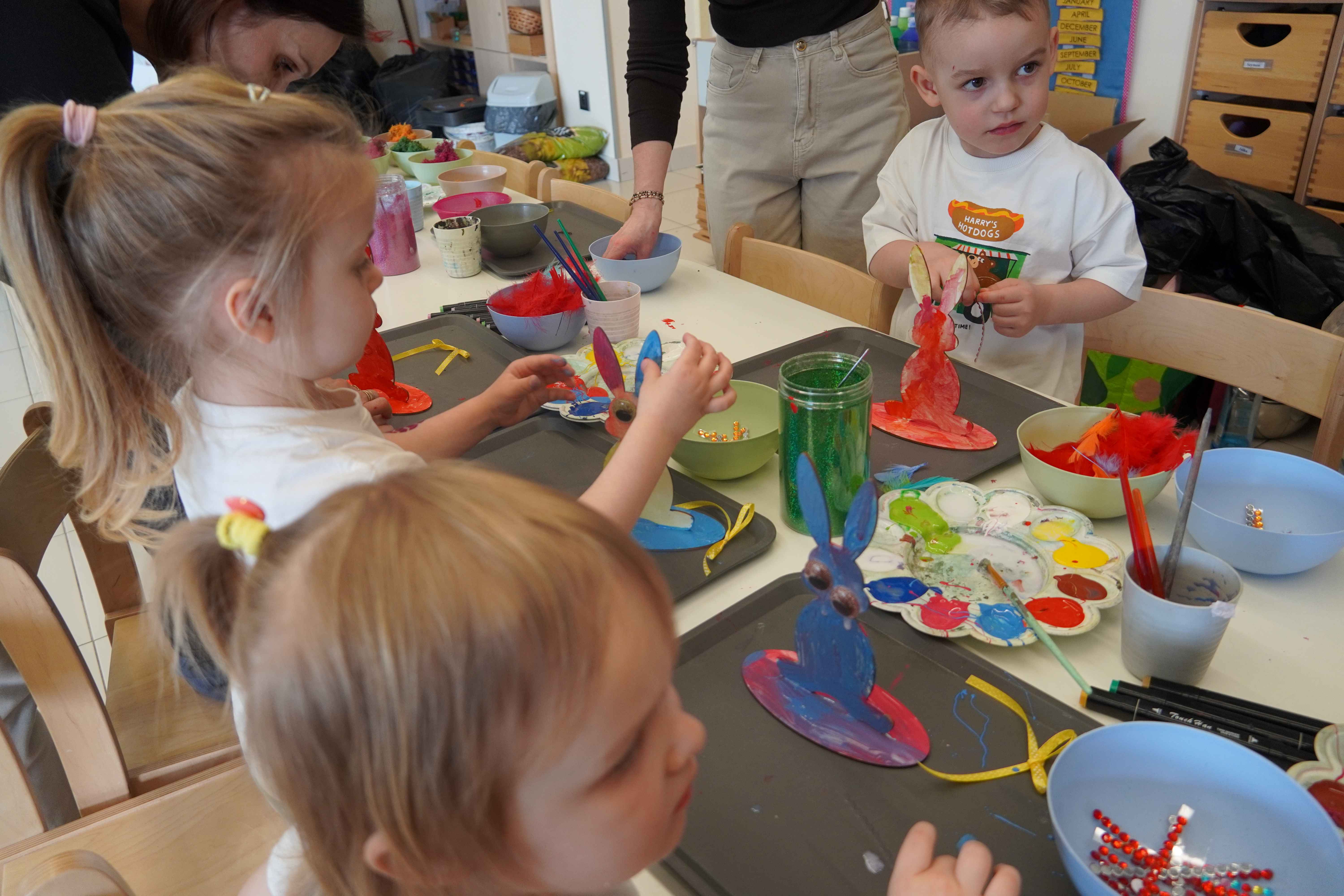 Najmłodsi, czyli 3 i 4-latki, pracowali nad drewnianymi zającami. Z wielkim skupieniem malowali figurki i ozdabiali je kolorowym mchem, piórkami oraz puszystymi pomponami. Praca z różnymi strukturami była dla maluchów świetną zabawą sensoryczną, a każdy zając zyskał swój unikalny, radosny charakter. Te drewniane dekoracje będą teraz najpiękniejszą pamiątką nadchodzących świąt.