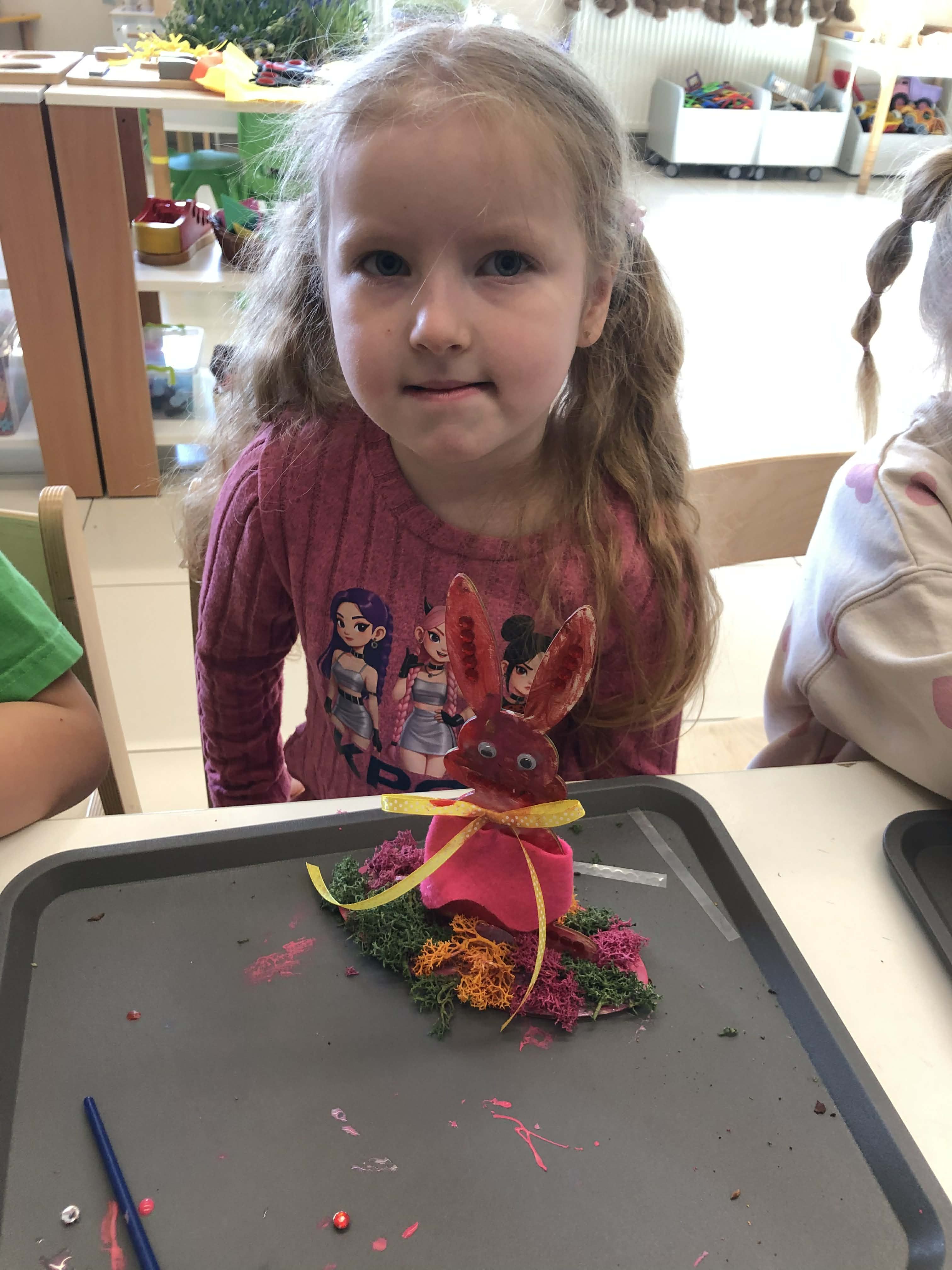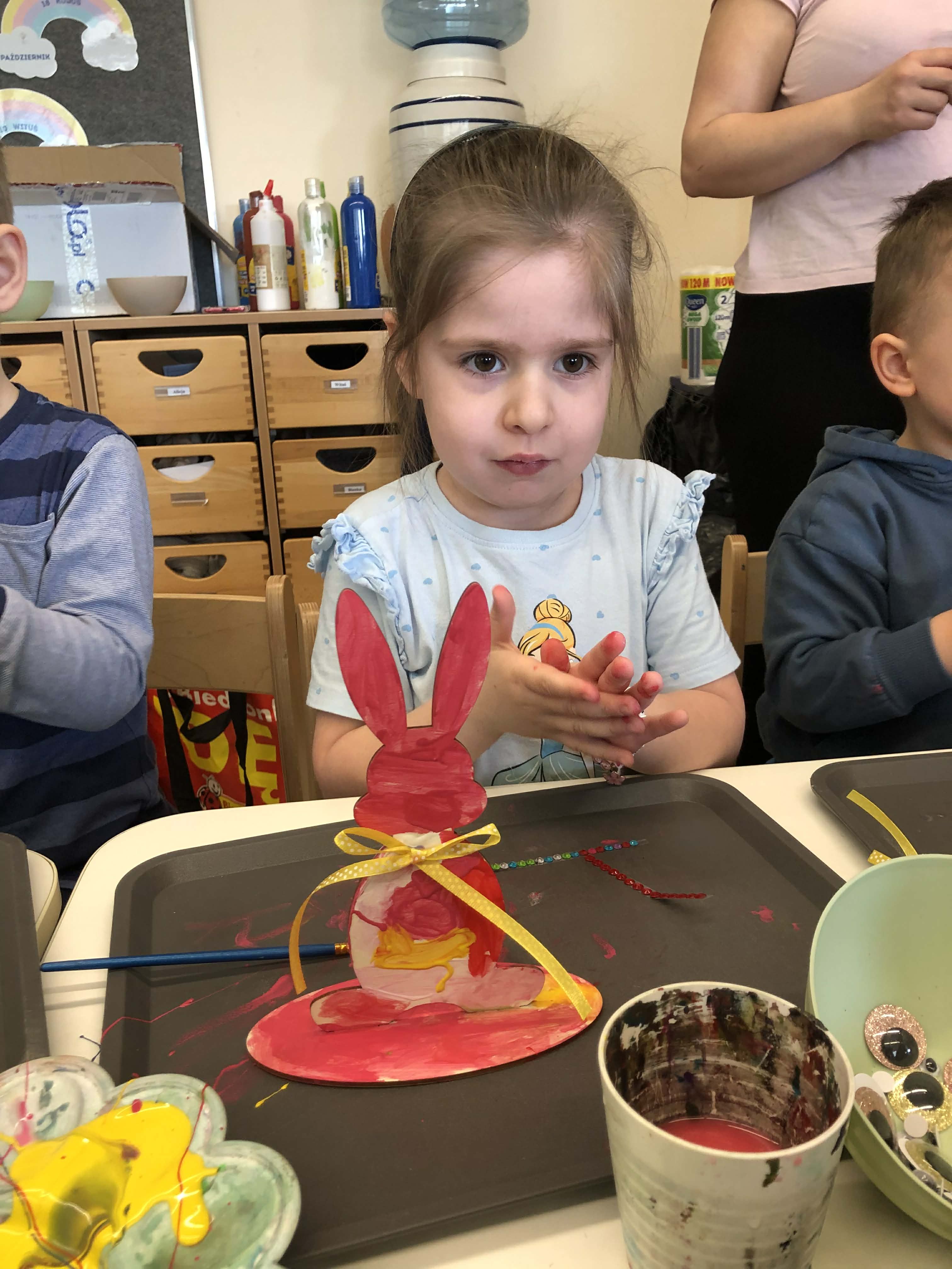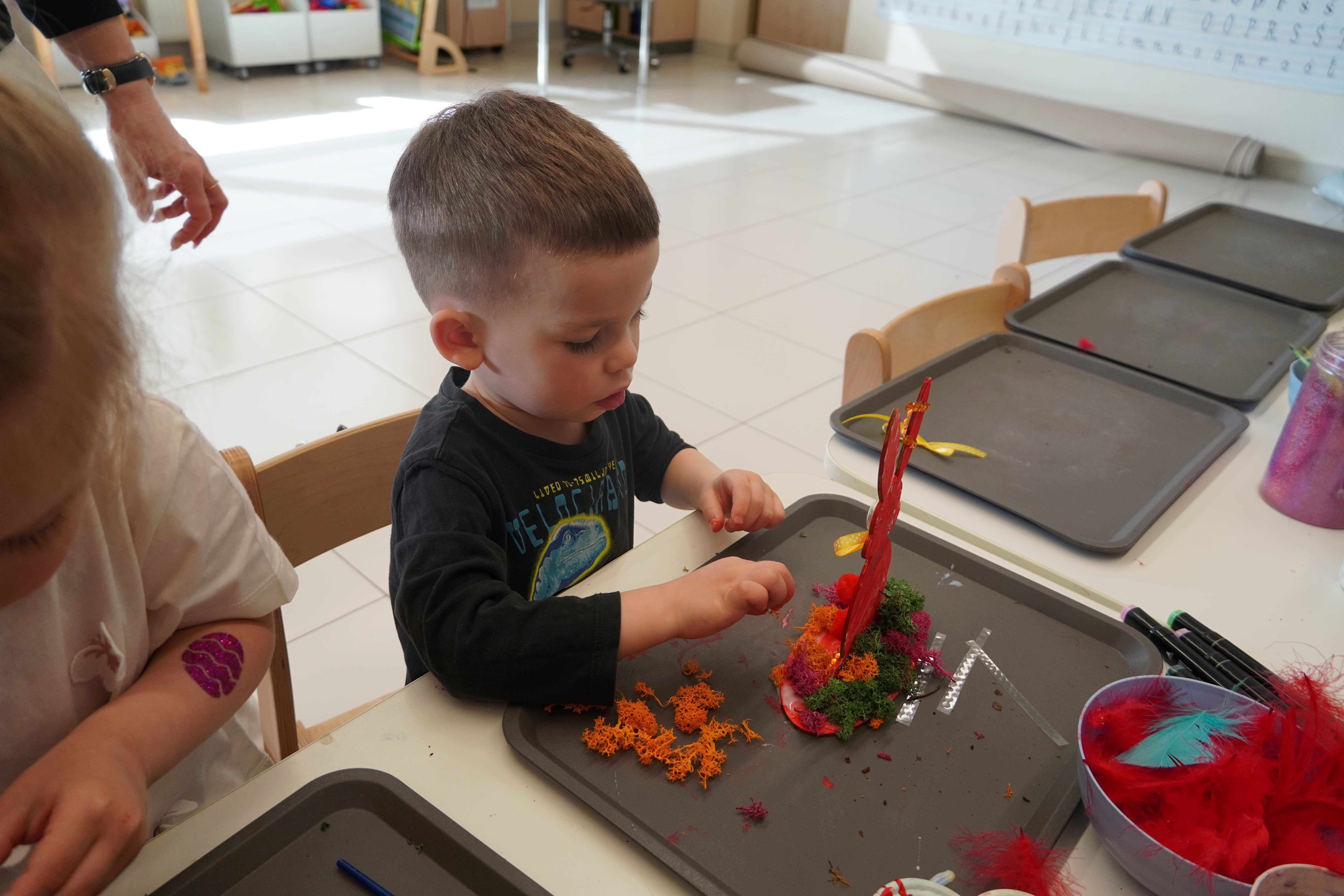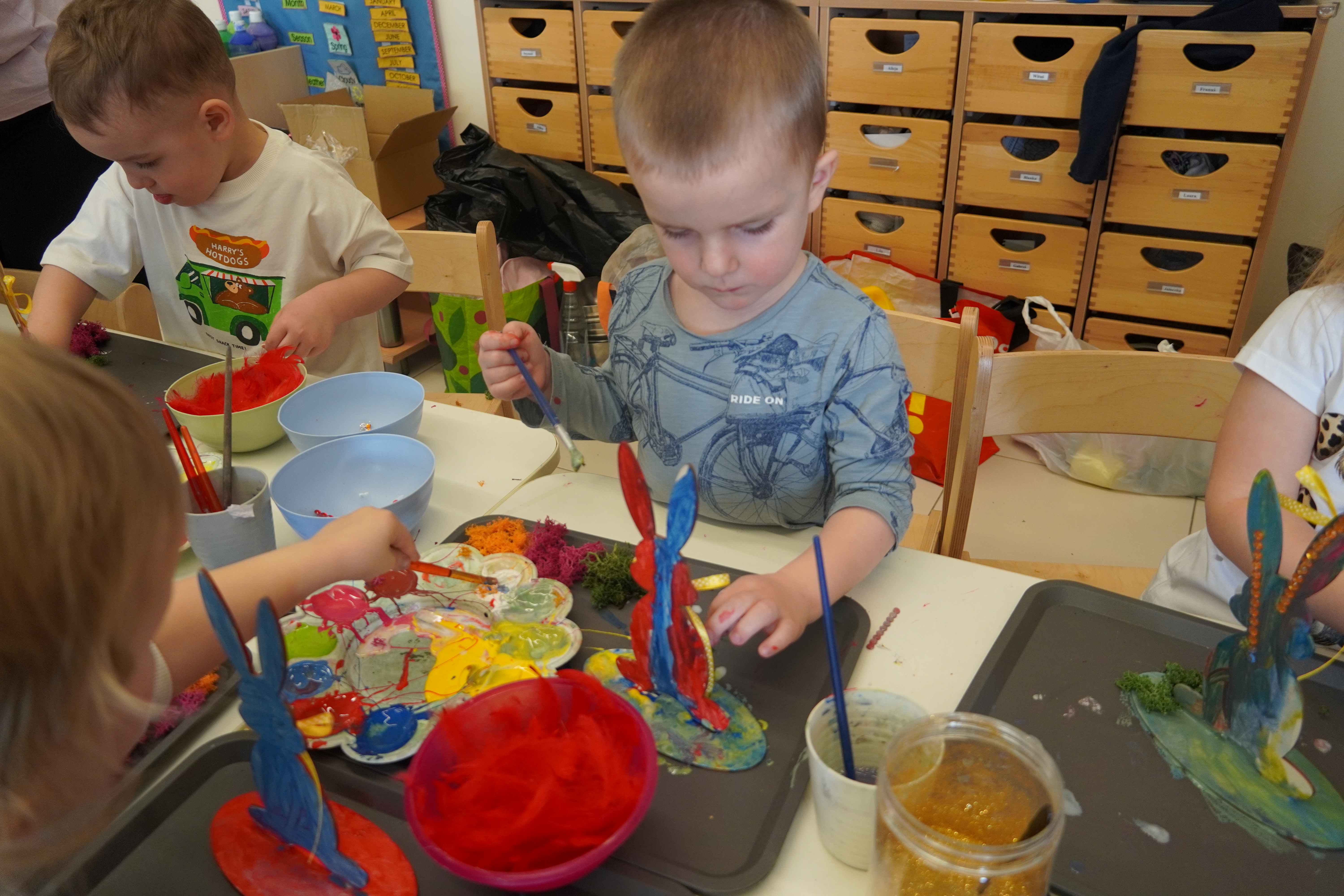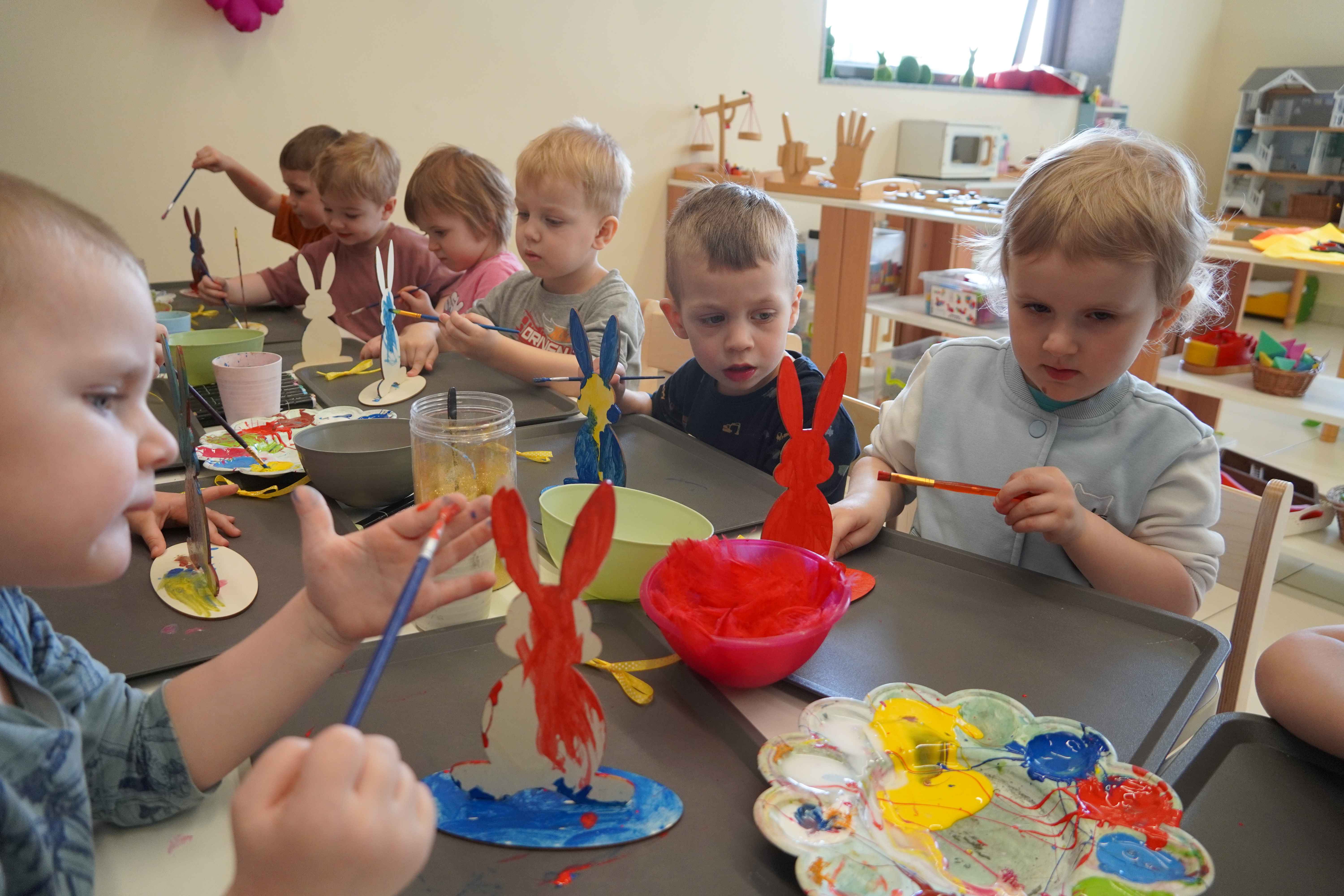 Najmłodsi, czyli 3 i 4-latki, pracowali nad drewnianymi zającami. Z wielkim skupieniem malowali figurki i ozdabiali je kolorowym mchem, piórkami oraz puszystymi pomponami. Praca z różnymi strukturami była dla maluchów świetną zabawą sensoryczną, a każdy zając zyskał swój unikalny, radosny charakter. Te drewniane dekoracje będą teraz najpiękniejszą pamiątką nadchodzących świąt.