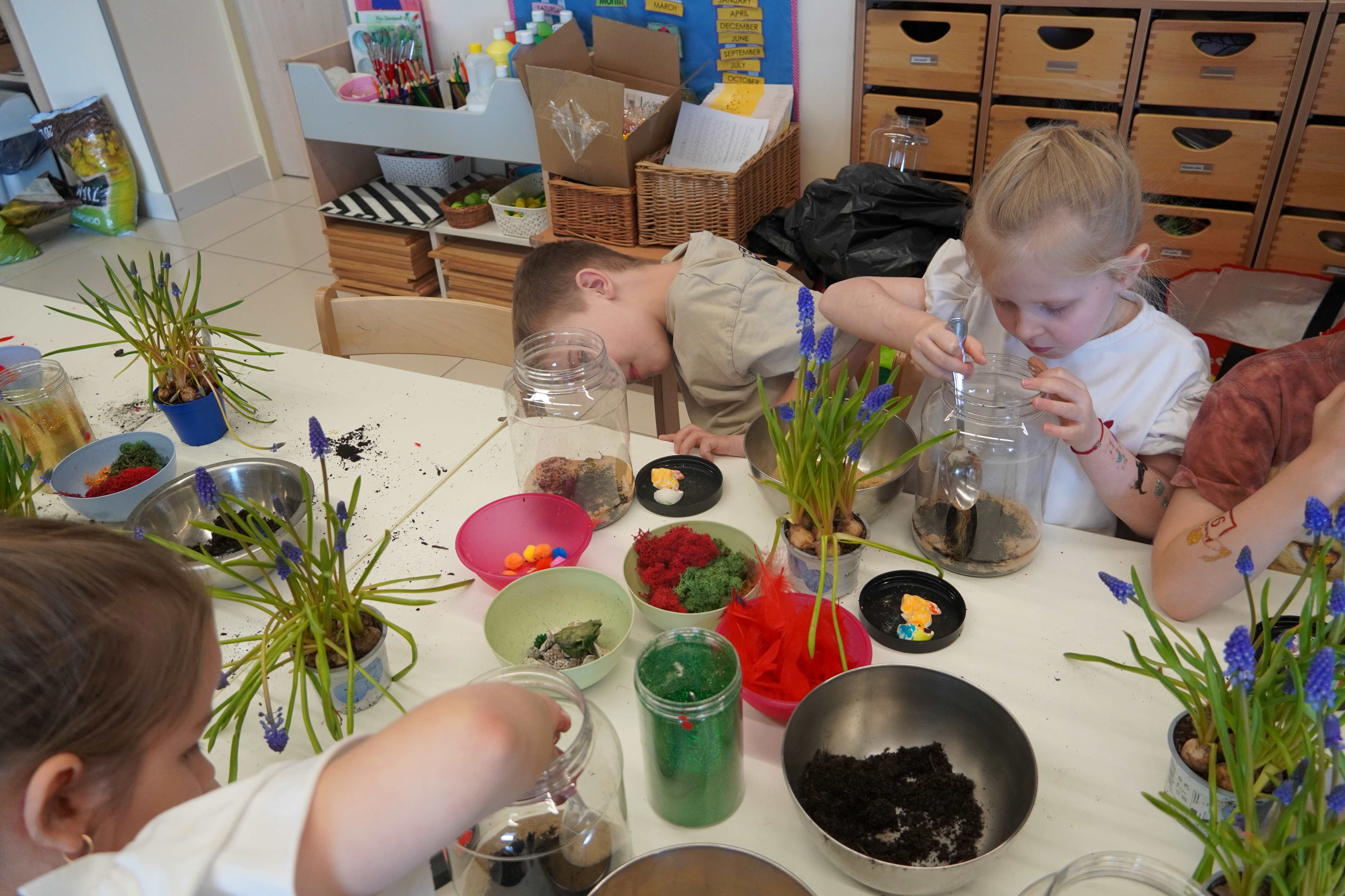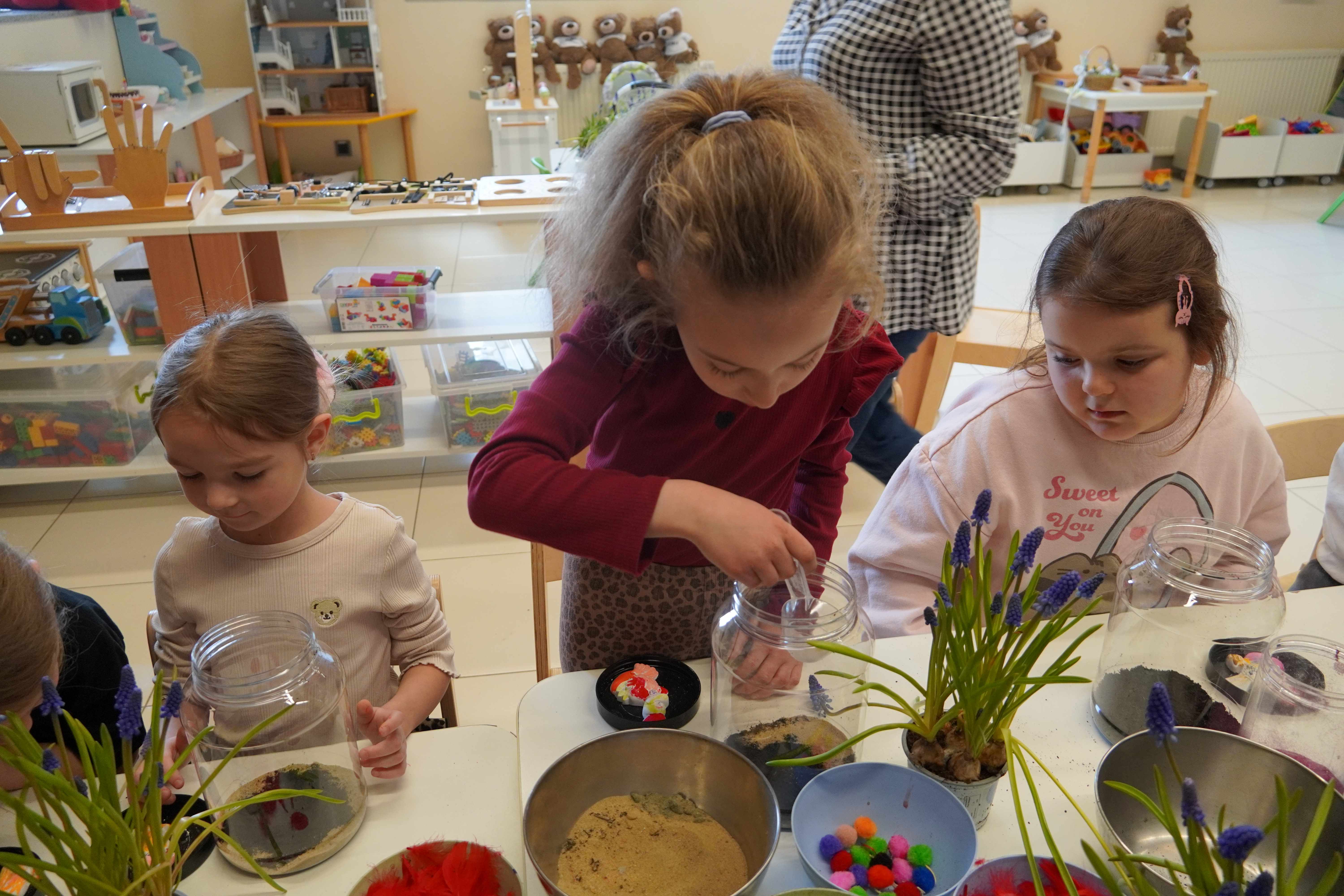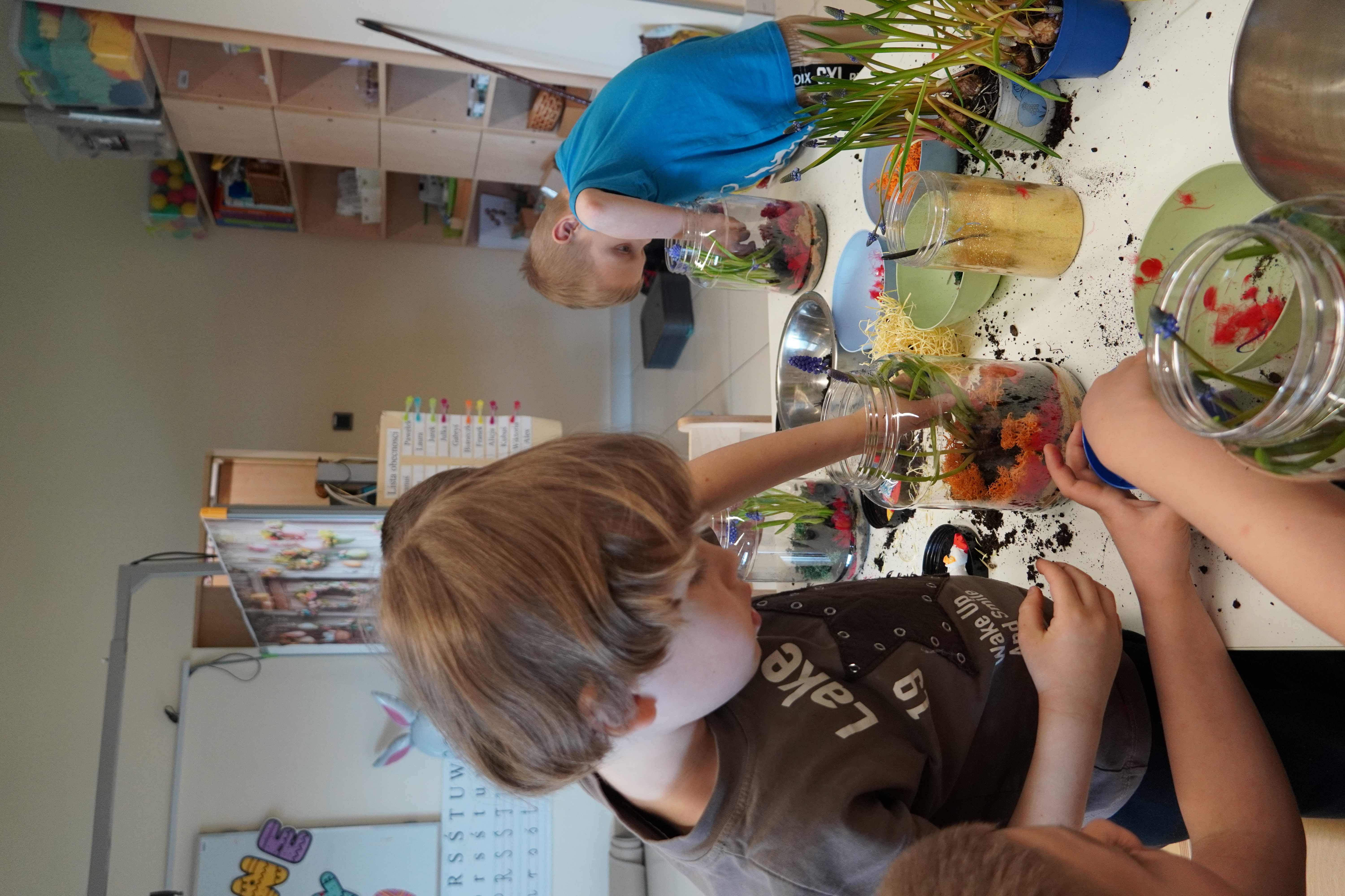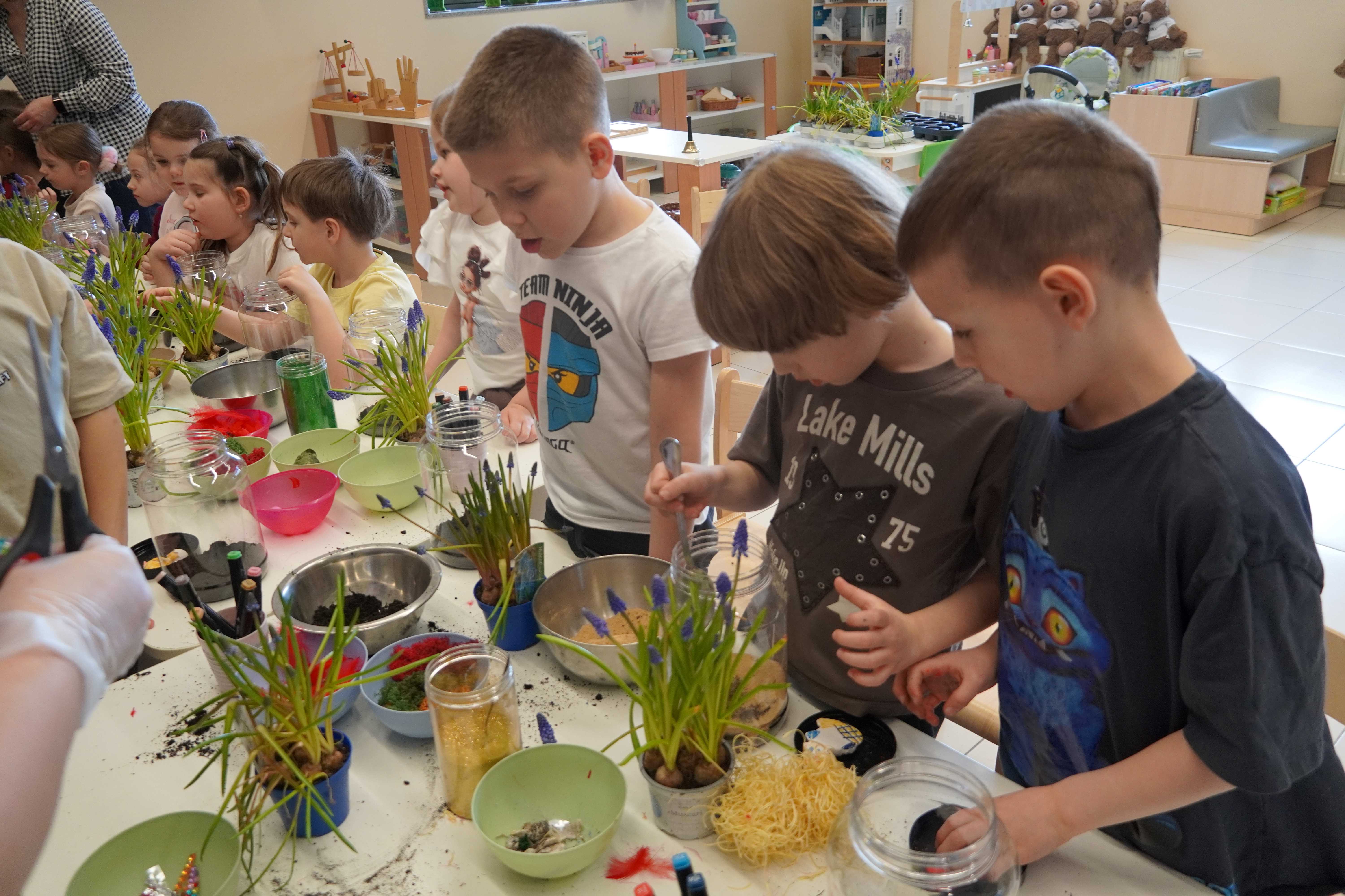 Natomiast grupy 5 i 6-latków tworzyły własne, miniaturowe ekosystemy – lasy w słoiku. Starszaki z dużą precyzją układały warstwy ziemi i piasku, by na końcu starannie zasadzić żywe cebulki szafirków. Była to doskonała lekcja cierpliwości i szacunku do przyrody. W naczyniach powstały magiczne, zielone światy, które już niedługo rozkwitną w domach dzieci.
