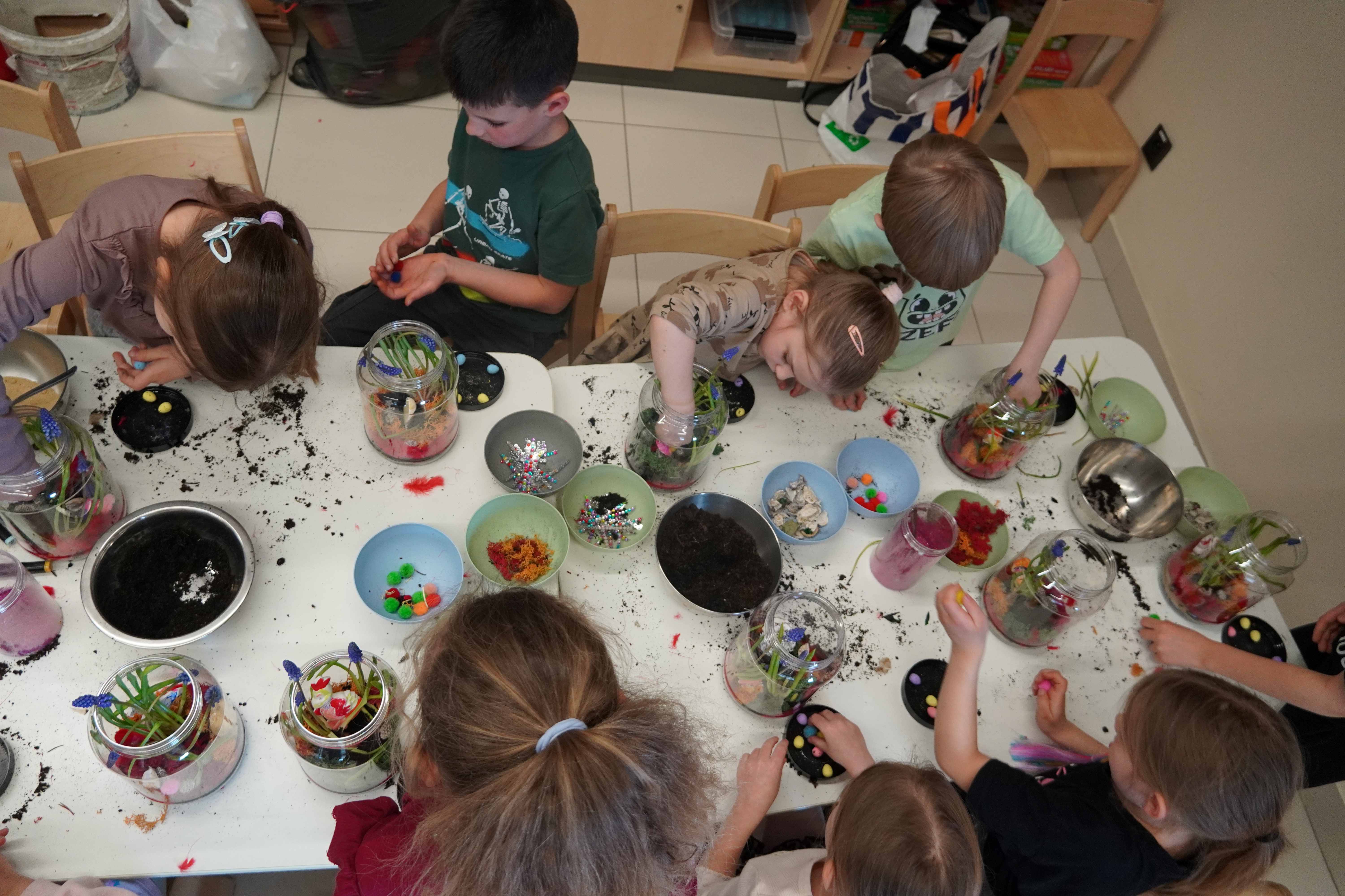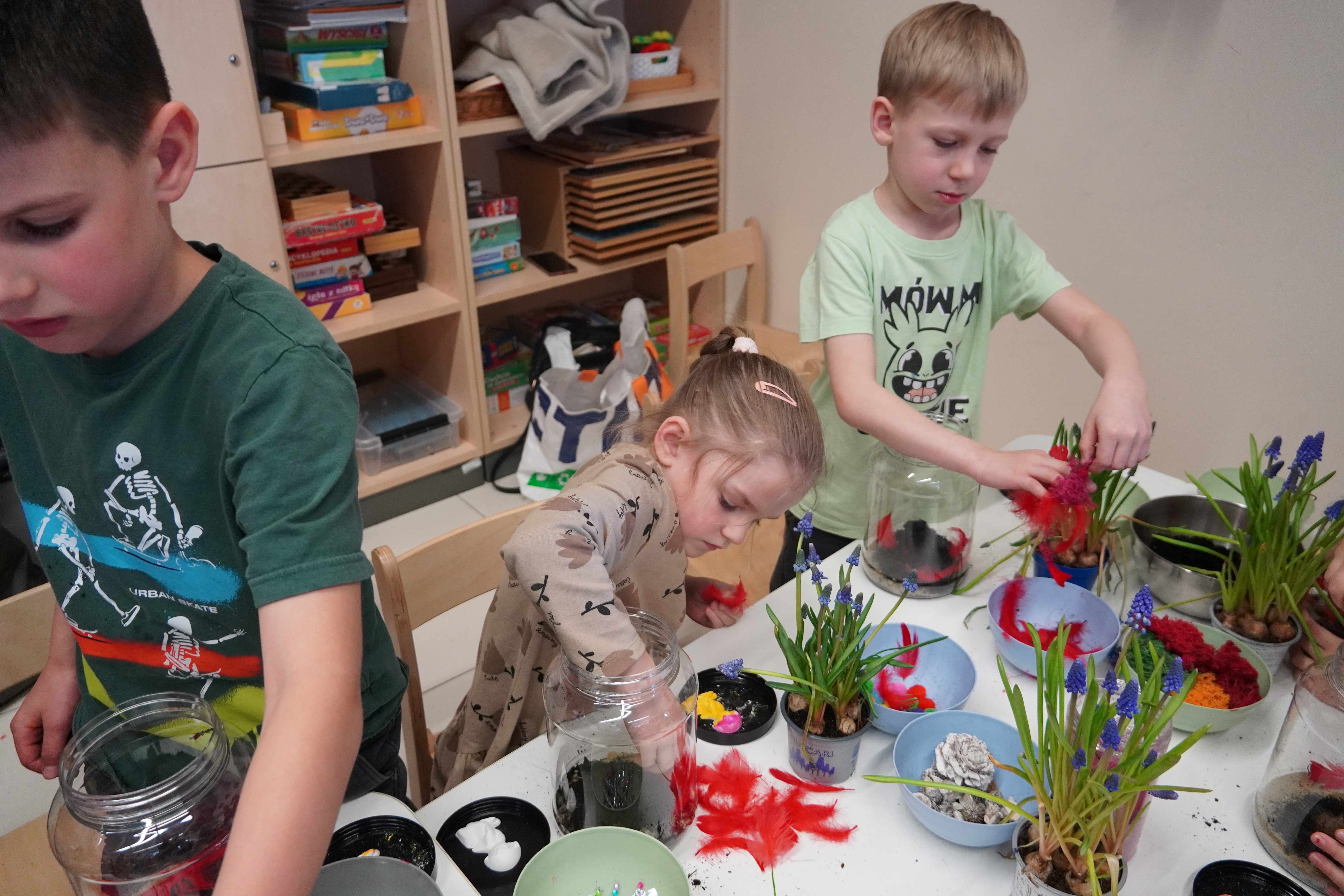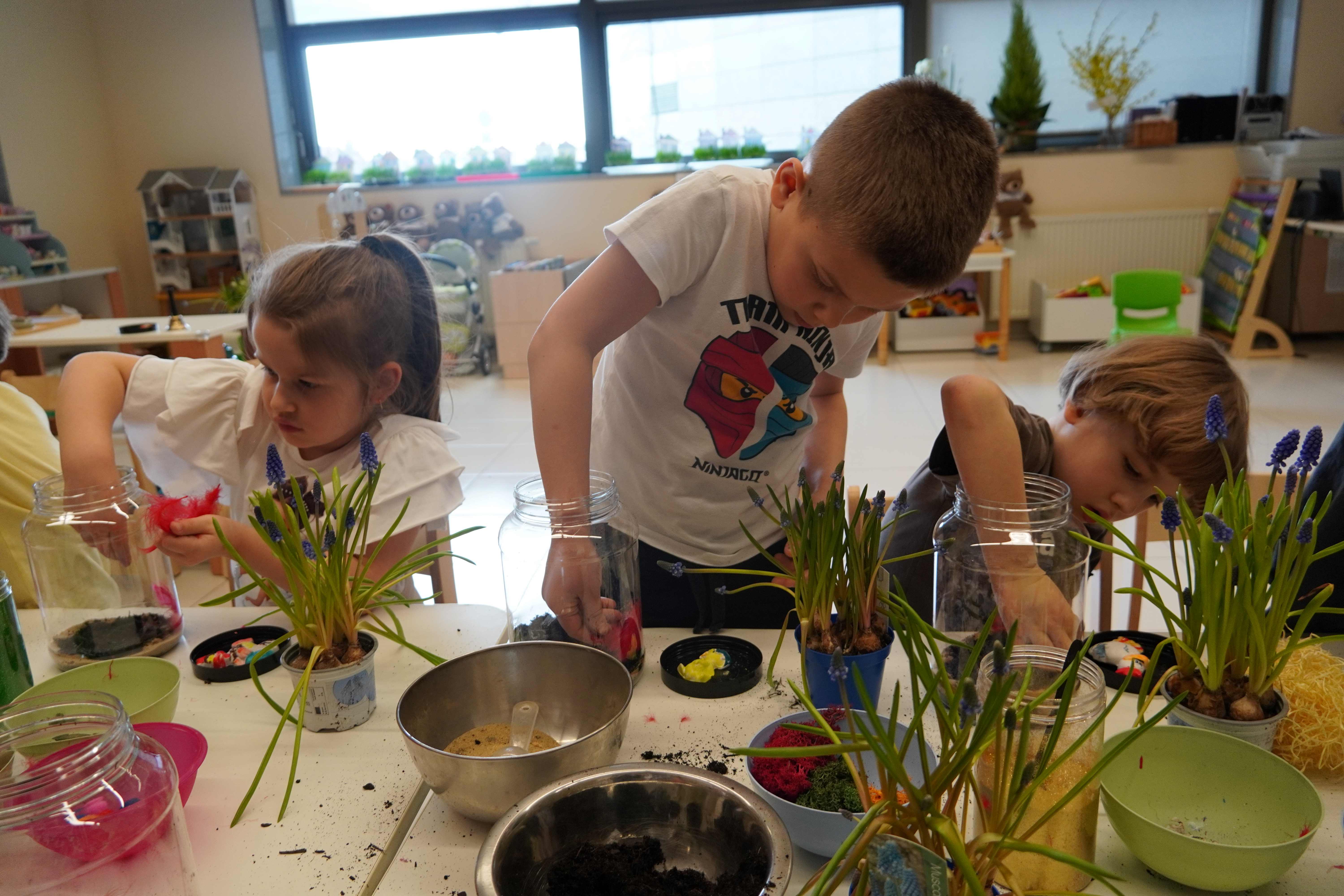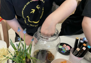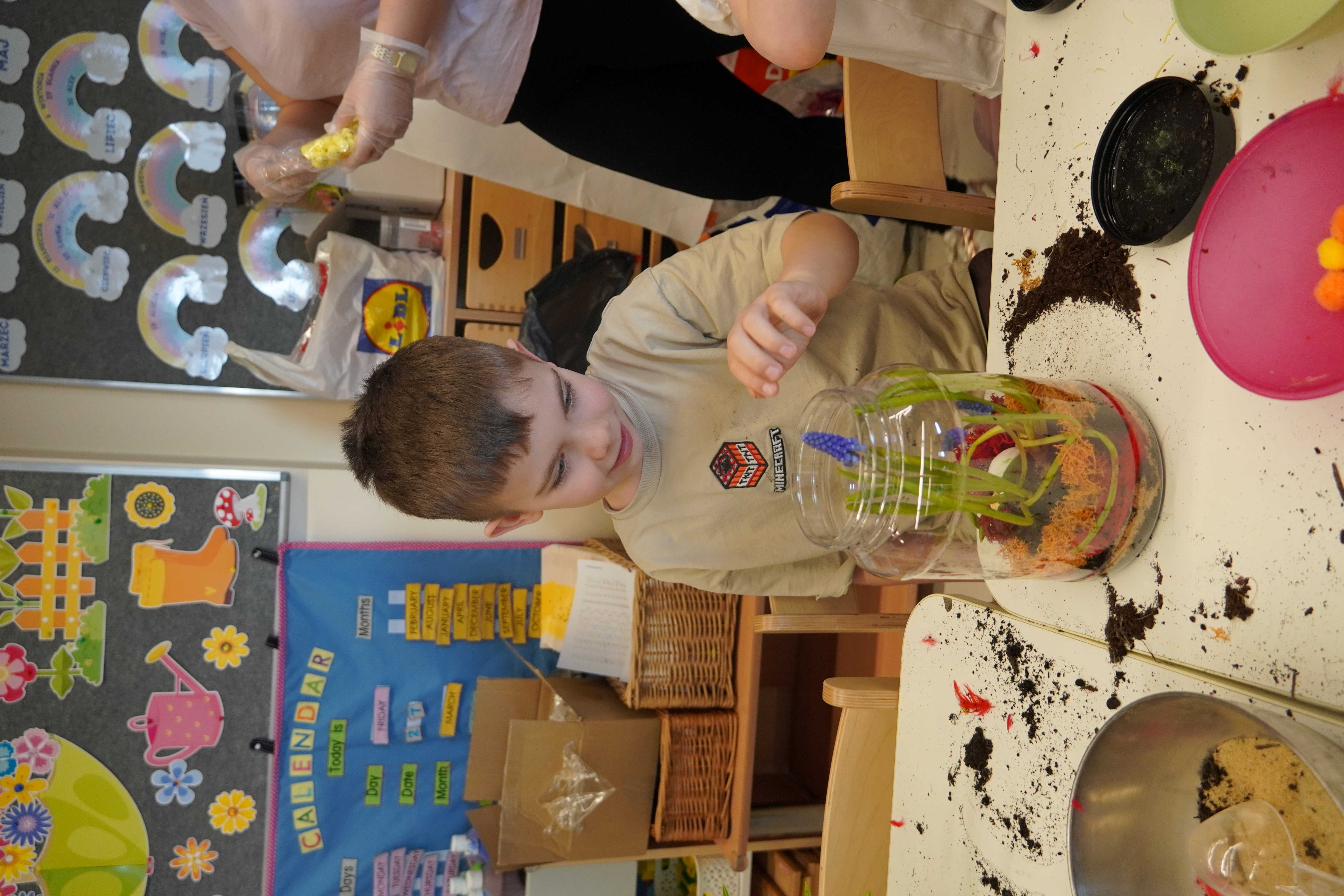 Natomiast grupy 5 i 6-latków tworzyły własne, miniaturowe ekosystemy – lasy w słoiku. Starszaki z dużą precyzją układały warstwy ziemi i piasku, by na końcu starannie zasadzić żywe cebulki szafirków. Była to doskonała lekcja cierpliwości i szacunku do przyrody. W naczyniach powstały magiczne, zielone światy, które już niedługo rozkwitną w domach dzieci.