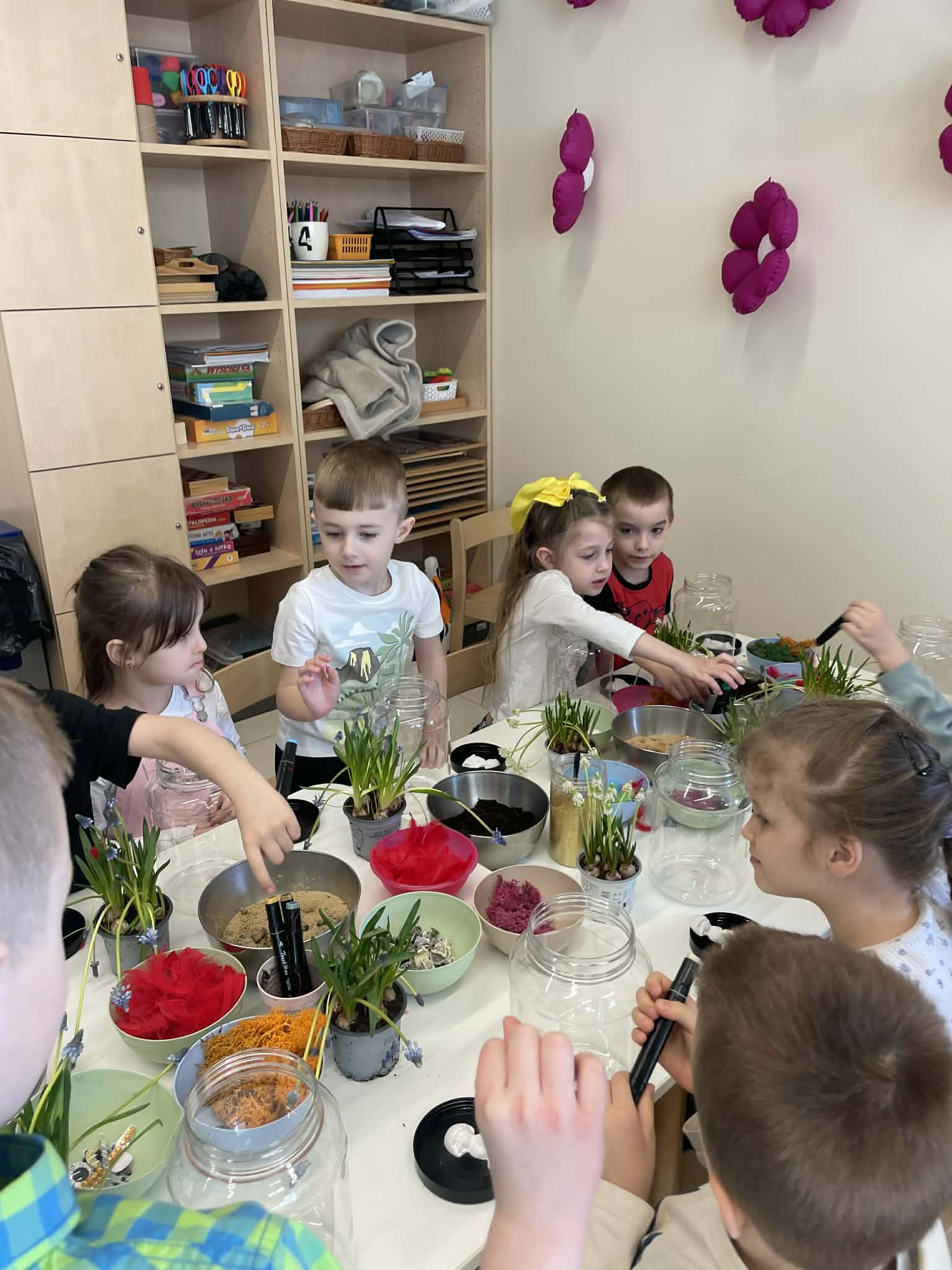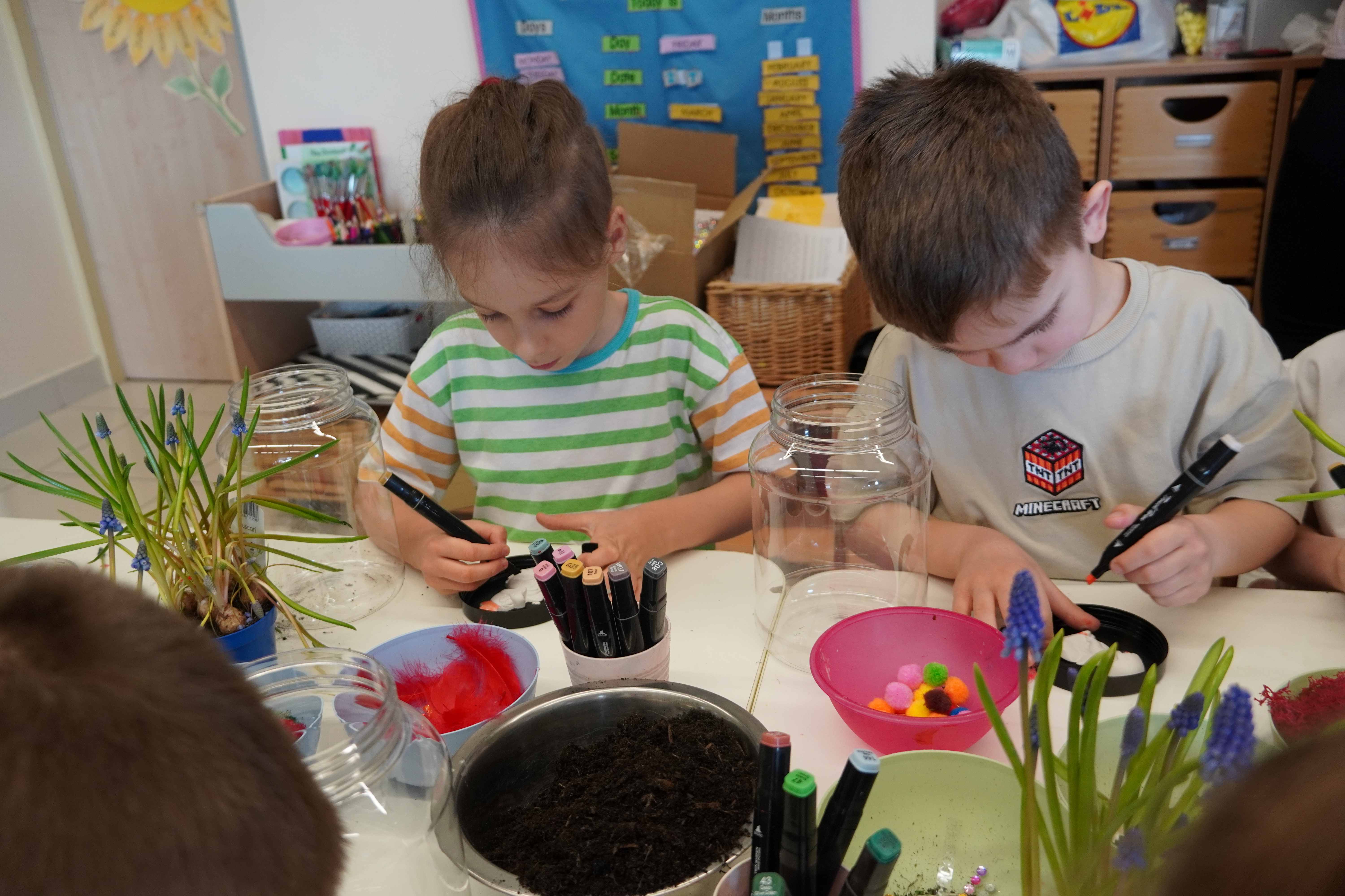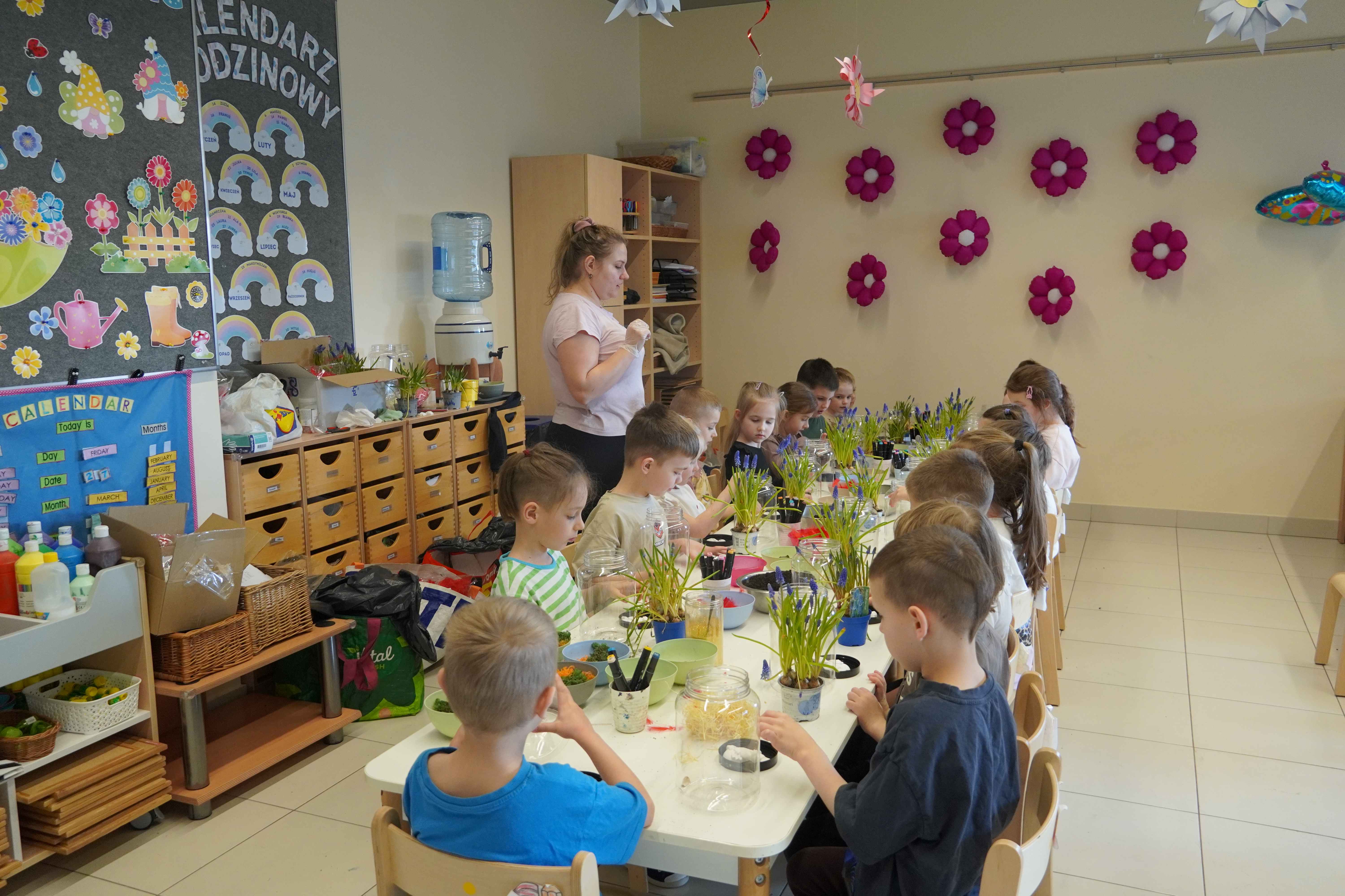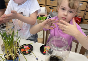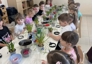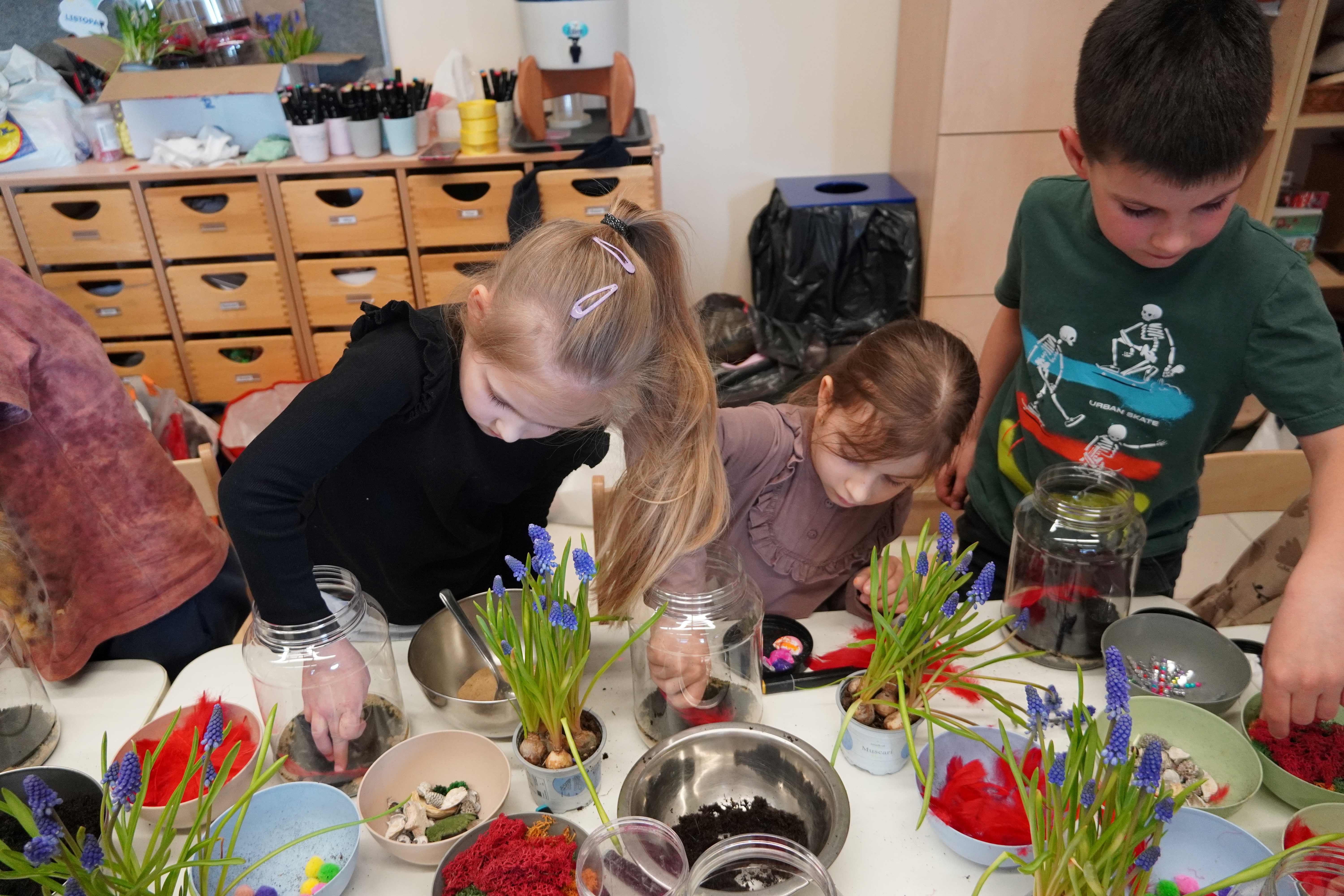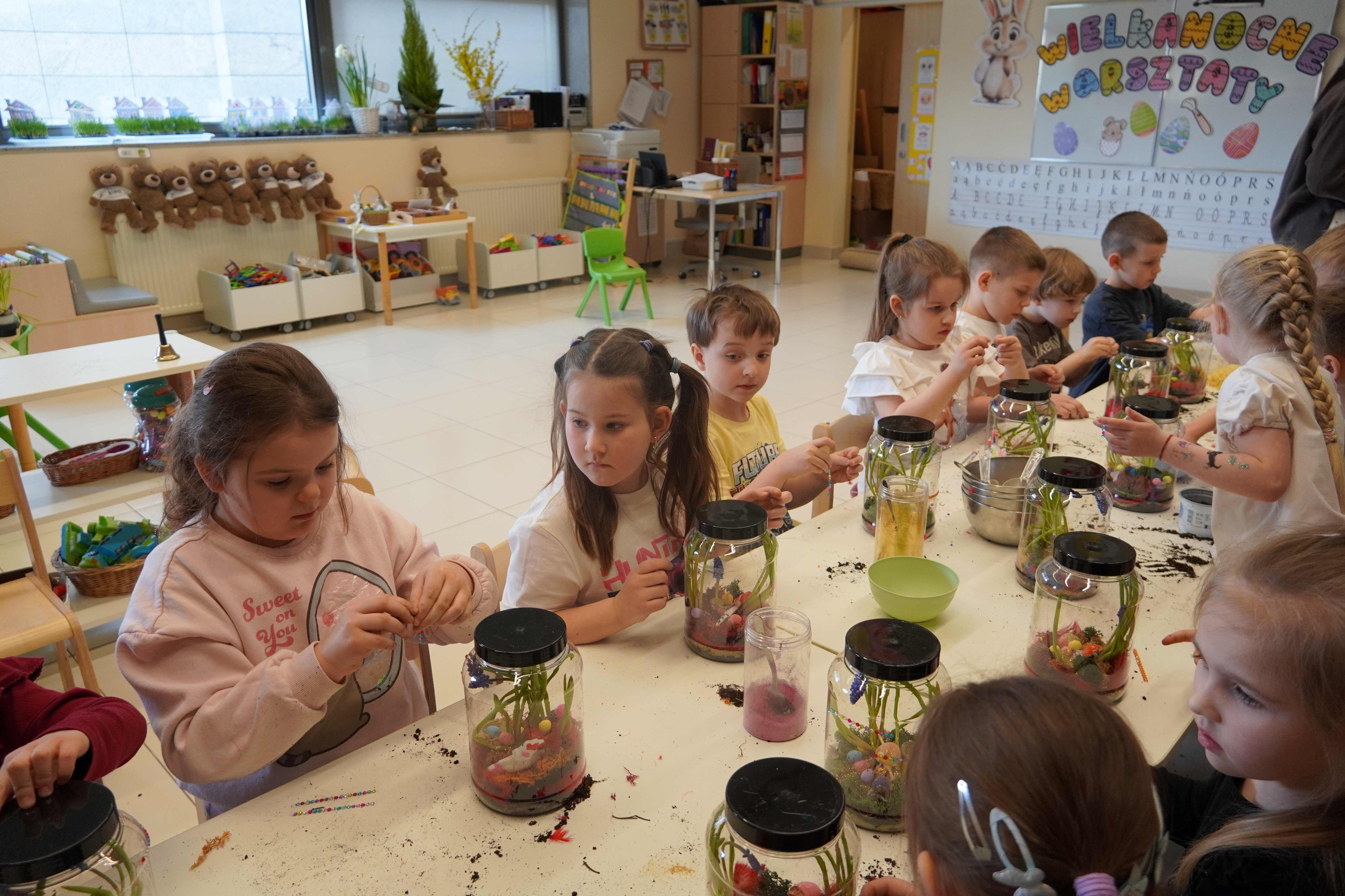 Natomiast grupy 5 i 6-latków tworzyły własne, miniaturowe ekosystemy – lasy w słoiku. Starszaki z dużą precyzją układały warstwy ziemi i piasku, by na końcu starannie zasadzić żywe cebulki szafirków. Była to doskonała lekcja cierpliwości i szacunku do przyrody. W naczyniach powstały magiczne, zielone światy, które już niedługo rozkwitną w domach dzieci.