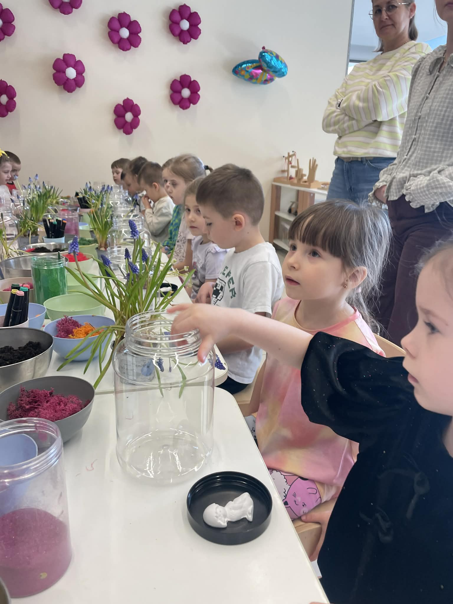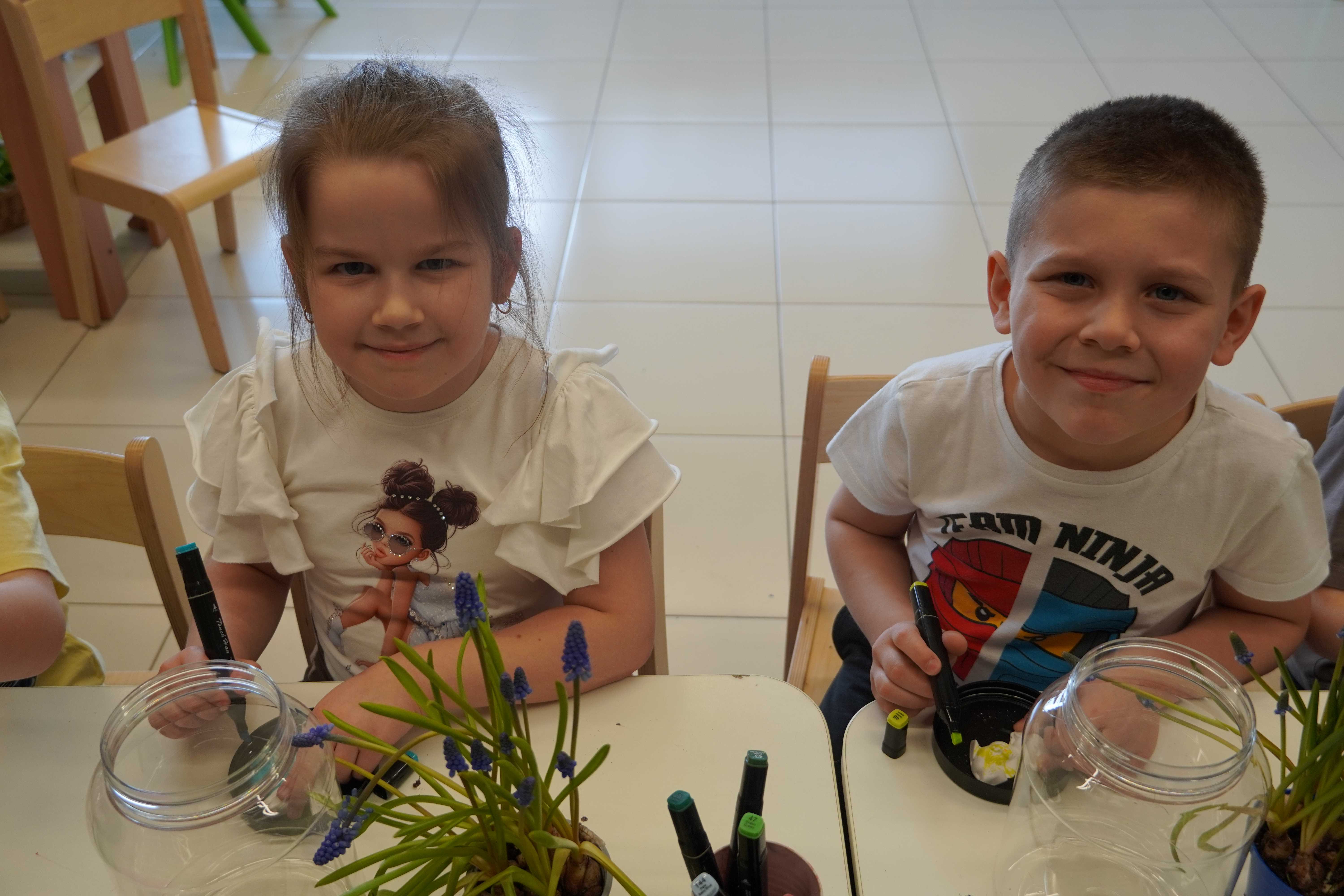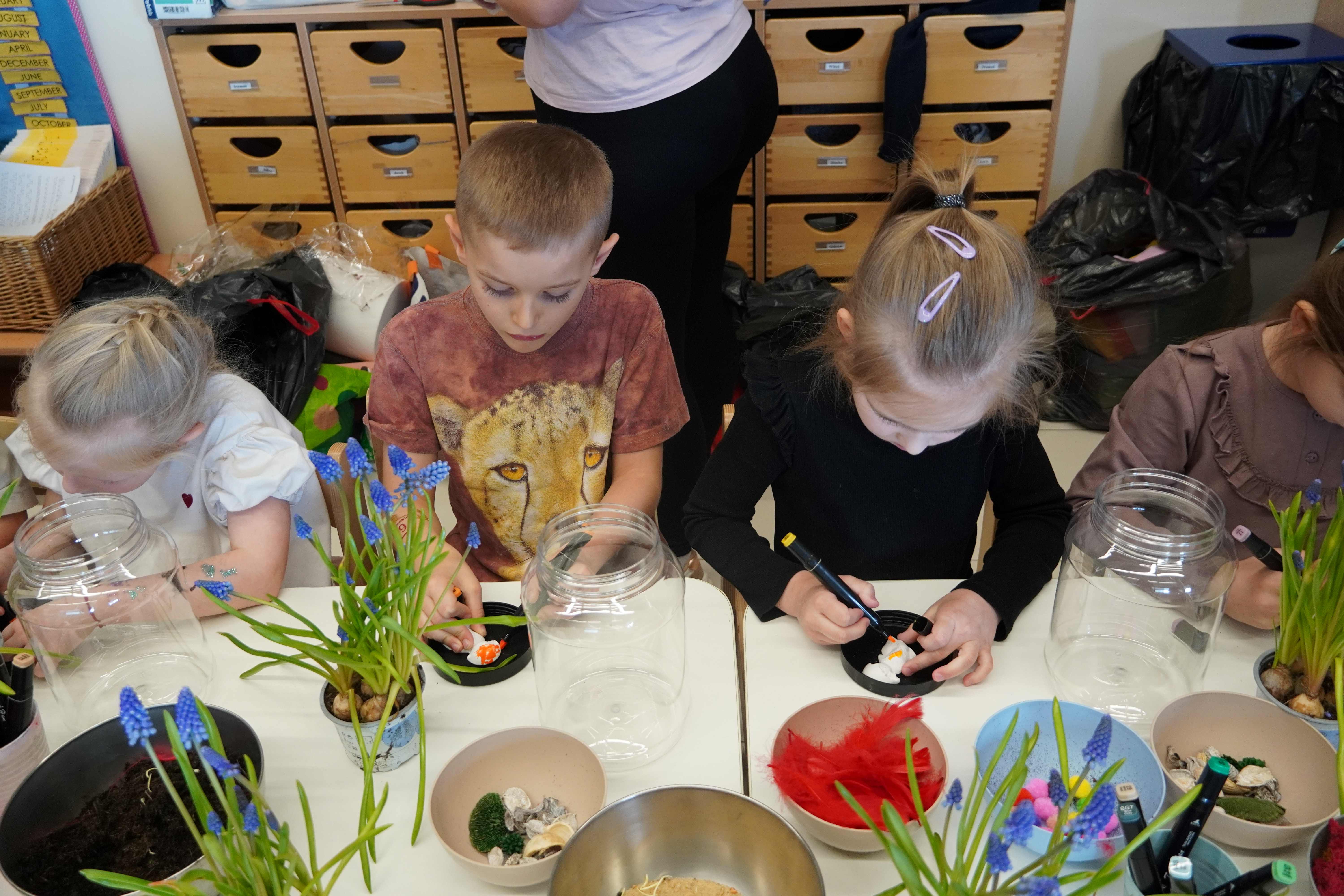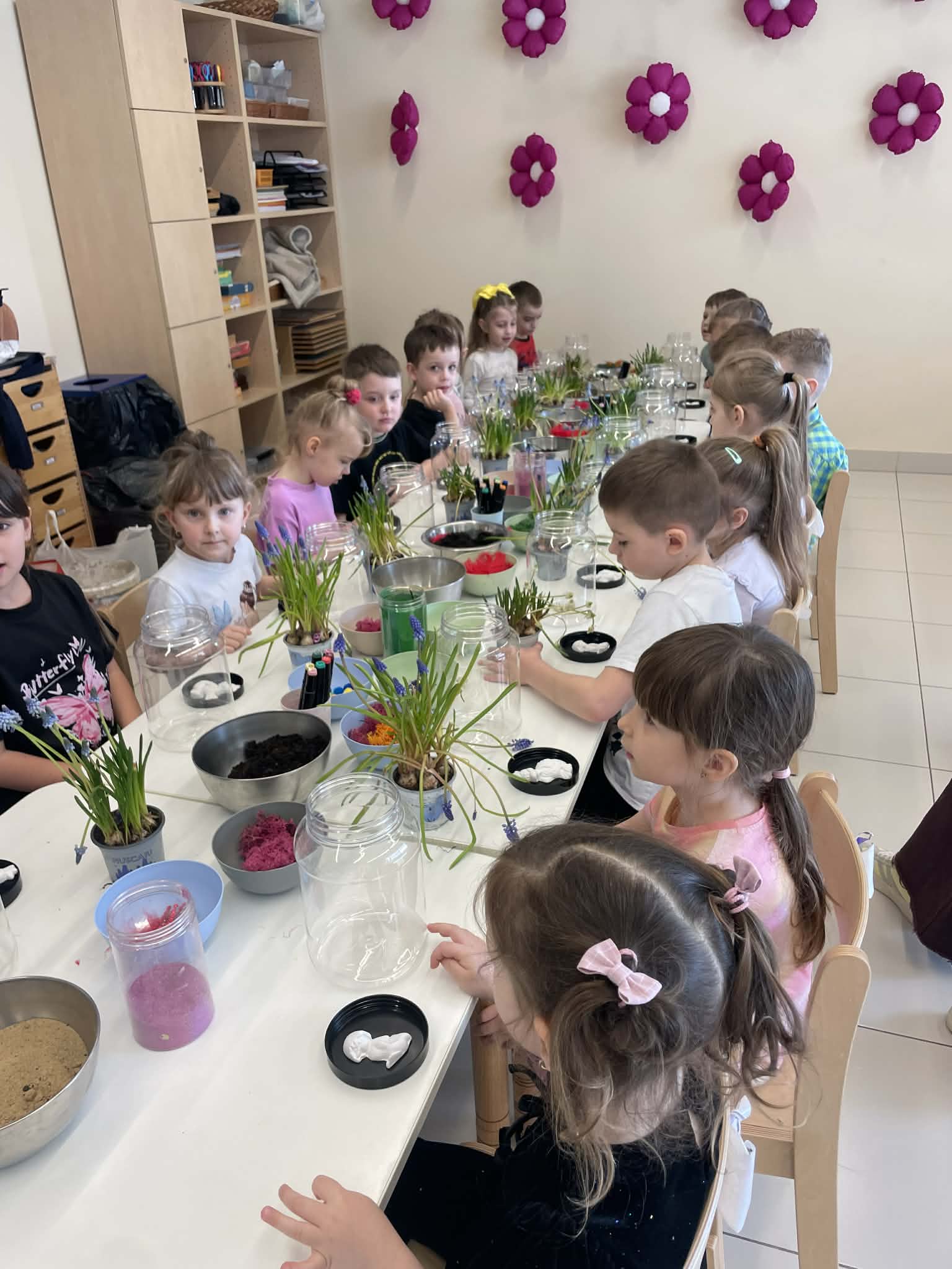 Natomiast grupy 5 i 6-latków tworzyły własne, miniaturowe ekosystemy – lasy w słoiku. Starszaki z dużą precyzją układały warstwy ziemi i piasku, by na końcu starannie zasadzić żywe cebulki szafirków. Była to doskonała lekcja cierpliwości i szacunku do przyrody. W naczyniach powstały magiczne, zielone światy, które już niedługo rozkwitną w domach dzieci.