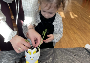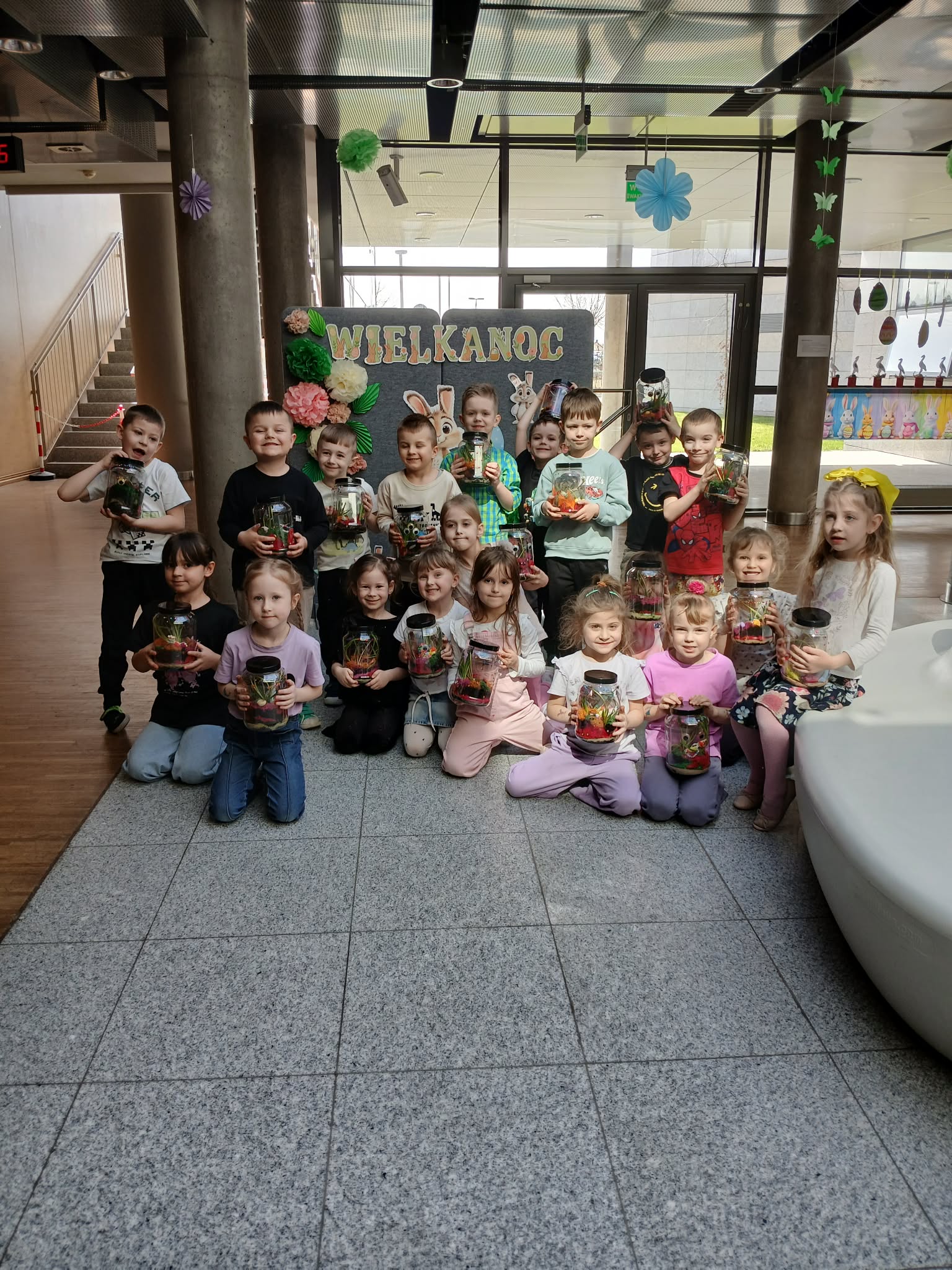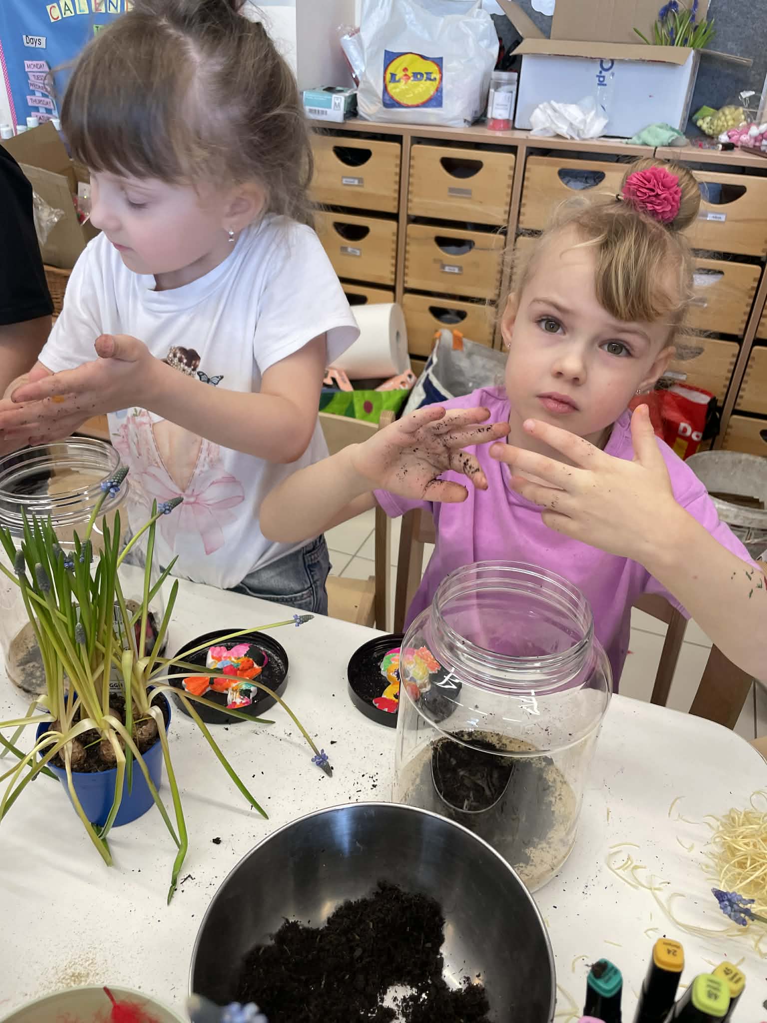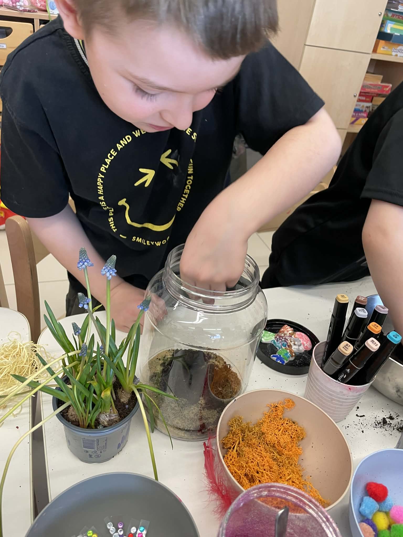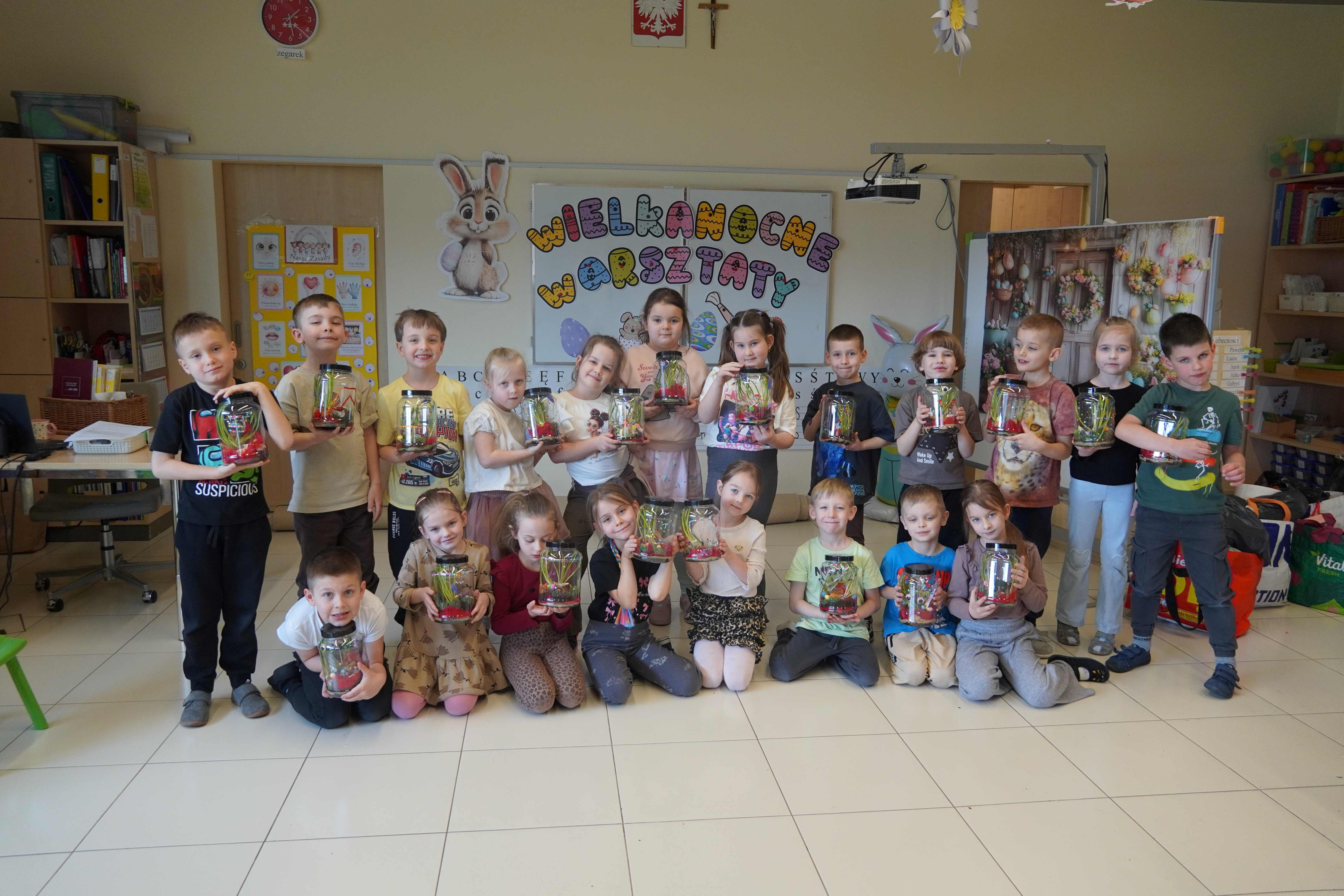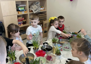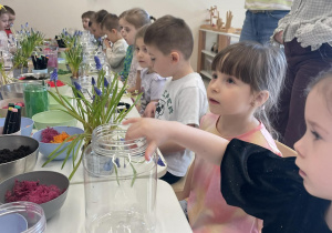 Natomiast grupy 5 i 6-latków tworzyły własne, miniaturowe ekosystemy – lasy w słoiku. Starszaki z dużą precyzją układały warstwy ziemi i piasku, by na końcu starannie zasadzić żywe cebulki szafirków. Była to doskonała lekcja cierpliwości i szacunku do przyrody. W naczyniach powstały magiczne, zielone światy, które już niedługo rozkwitną w domach dzieci.