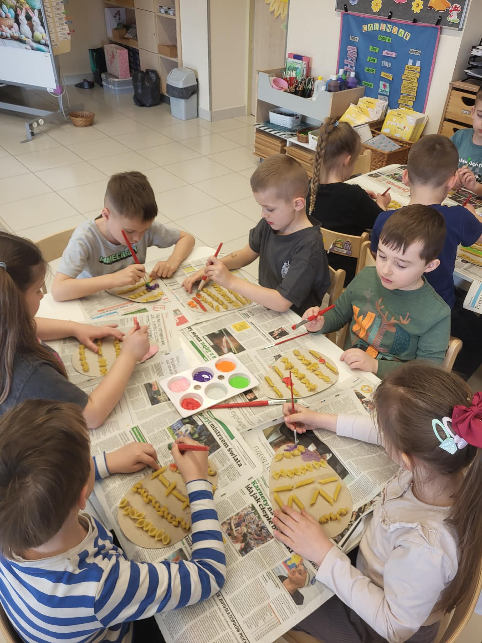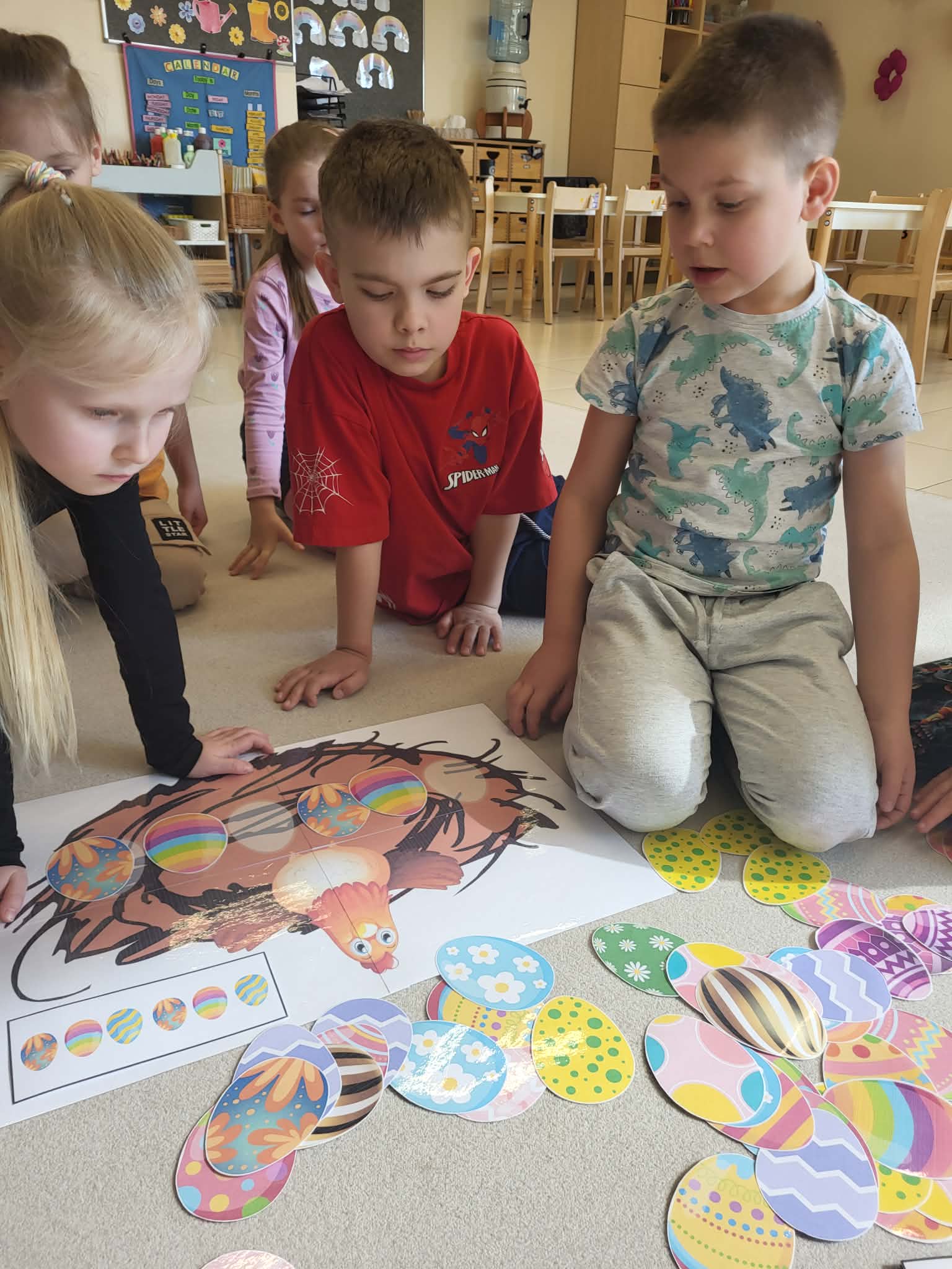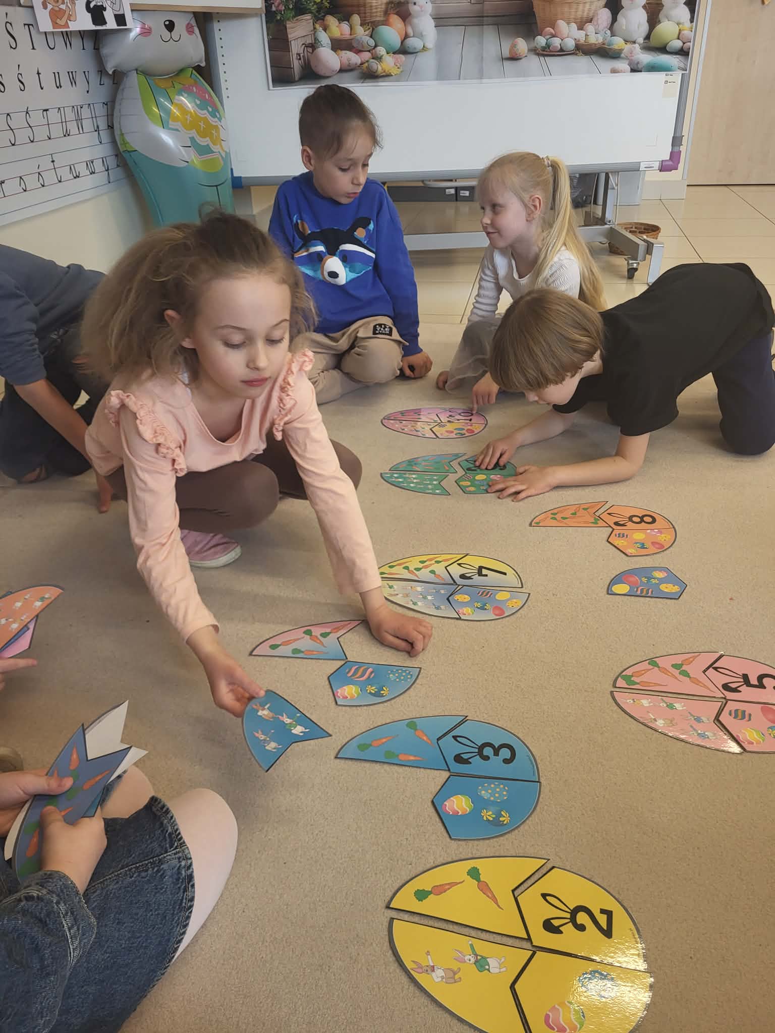 Miniony tydzień w przedszkolu upłynął nam w radosnej, świątecznej atmosferze przygotowań do Wielkanocy. Dzieci poprzez gry matematyczne, zabawy językowe oraz różnorodne działania plastyczne poznawały wielkanocne zwyczaje i tradycje. Przedszkolaki dowiedziały się, co znajduje się w świątecznym koszyczku, poznawały różne rodzaje pisanek i samodzielnie tworzyły własne ozdoby – między innymi pisanki z makaronu oraz papierowe kurczaczki. Nie zabrakło także zabaw dydaktycznych rozwijających spostrzegawczość i logiczne myślenie, takich jak dopasowywanie elementów, segregowanie jajek czy układanie sylabowych wyrazów.