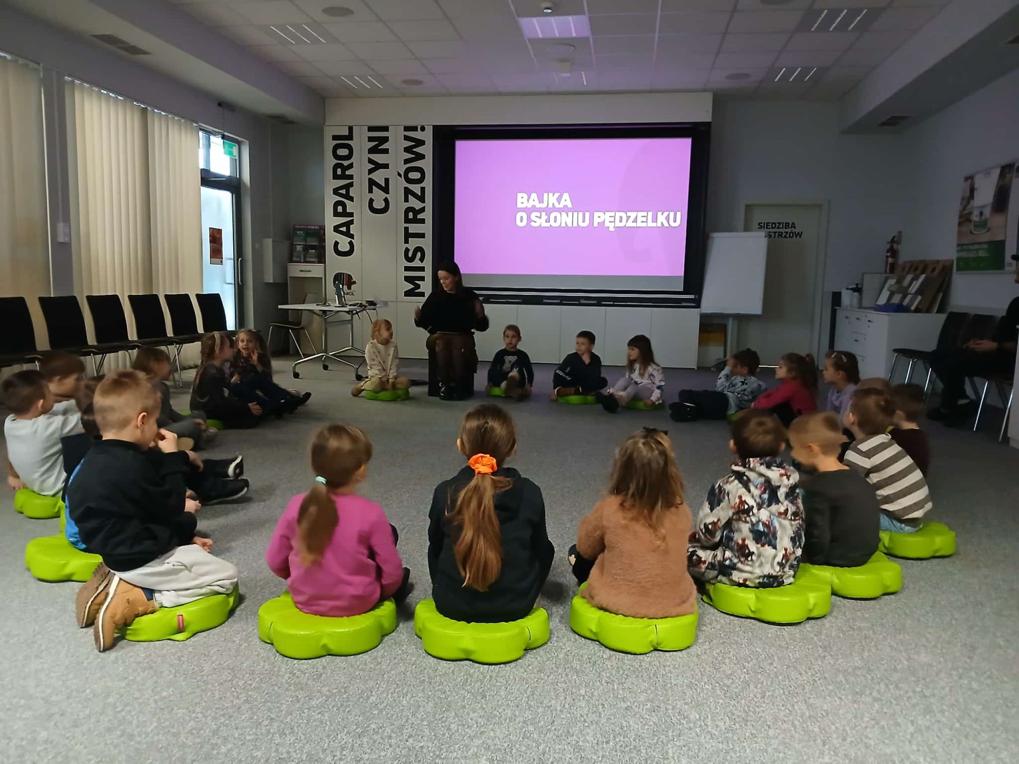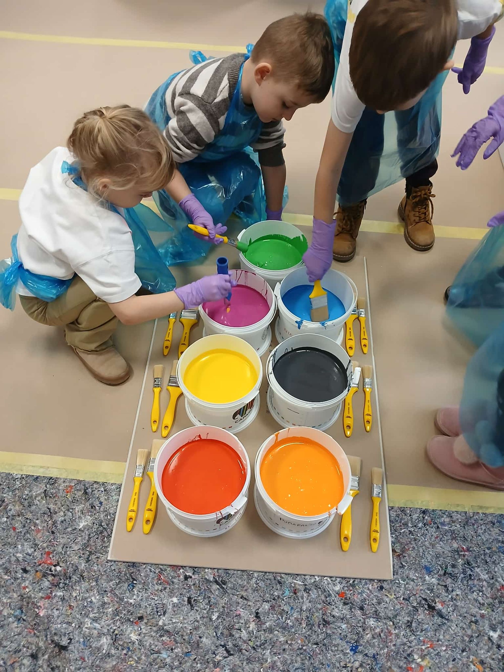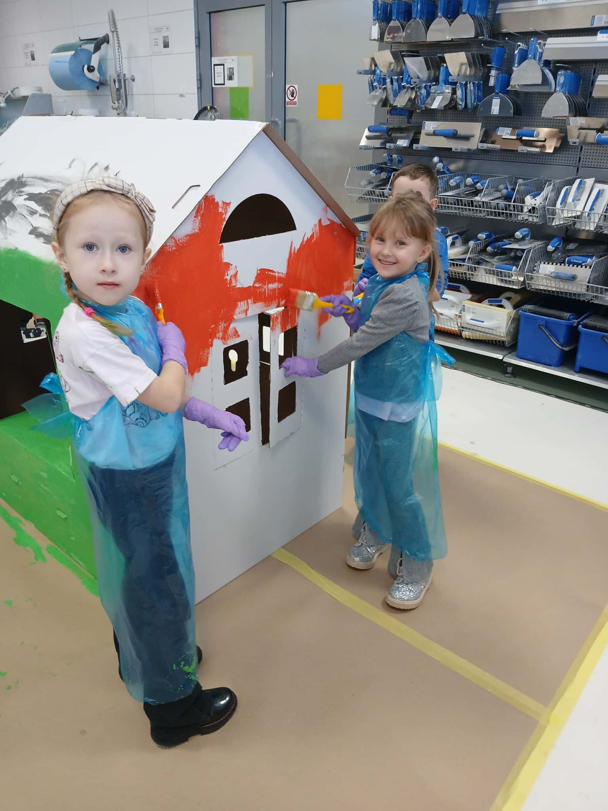Nasze 5-latki miały dziś wyjątkową okazję odwiedzić firmę Caparol, znanego producenta farb i tynków. Już od pierwszych chwil zostaliśmy tam niezwykle miło przyjęci, a cała wizyta okazała się pełna wrażeń, nowych doświadczeń i świetnej zabawy. Na początku pani z firmy Caparol przeczytała dzieciom piękną bajkę o słoniku, która doskonale wprowadziła je w kolorowy świat barw i wyobraźni. Następnie na najmłodszych czekały zagadki słuchowe, które wywołały mnóstwo radości i śmiechu. Kolejnym etapem była część praktyczna. Dzieci założyły fartuchy ochronne i rękawiczki, po czym przystąpiły do prawdziwej pracy malarskiej. Wyposażone w duże pędzle i wałki, mogły samodzielnie malować tekturowe domki prawdziwą farbą! Praca w grupach pozwoliła im nie tylko rozwijać kreatywność, ale także uczyć się współpracy i wspólnego podejmowania decyzji. Na zakończenie na dzieci czekały niespodzianki od firmy, podziękowania oraz słodki poczęstunek, który był idealnym zwieńczeniem pełnej atrakcji wizyty. Serdecznie dziękujemy firmie Caparol za tak ciekawe, kreatywne i niezwykle praktyczne spotkanie. To była wycieczka, którą nasze przedszkolaki z pewnością będą długo wspominać!