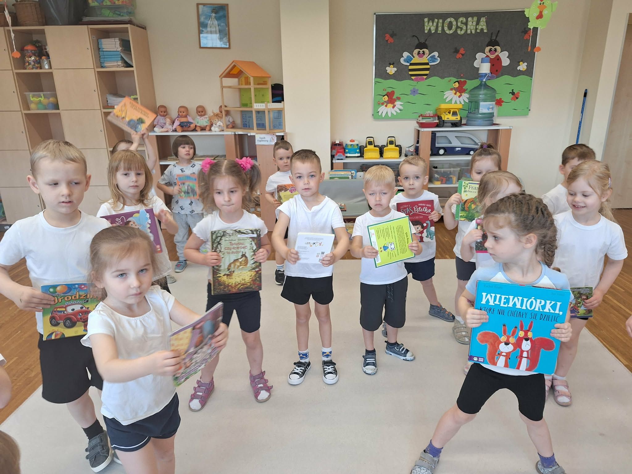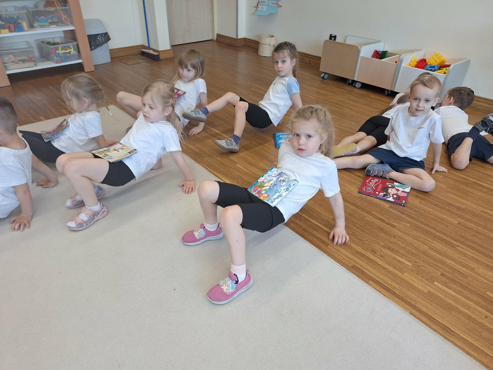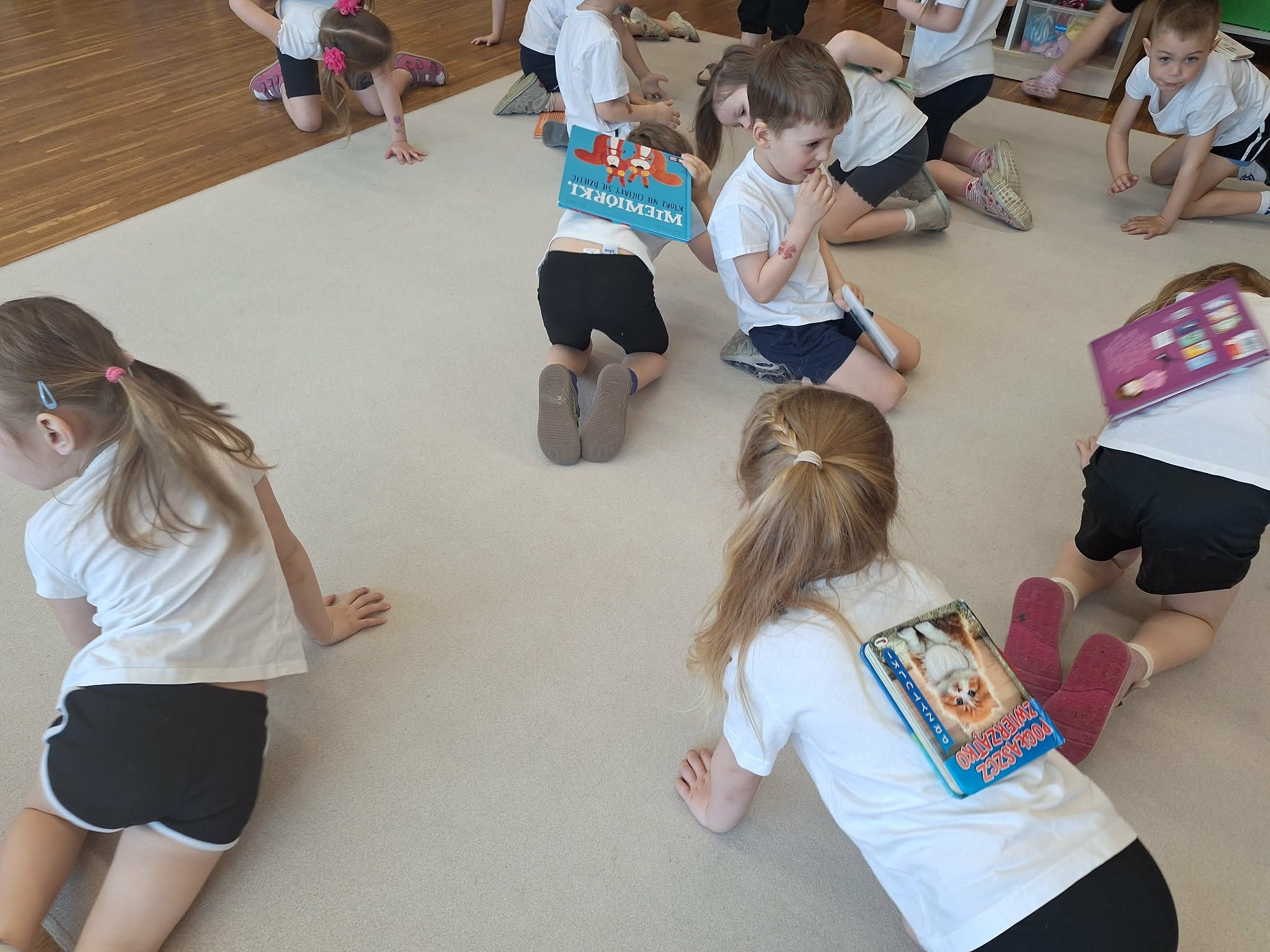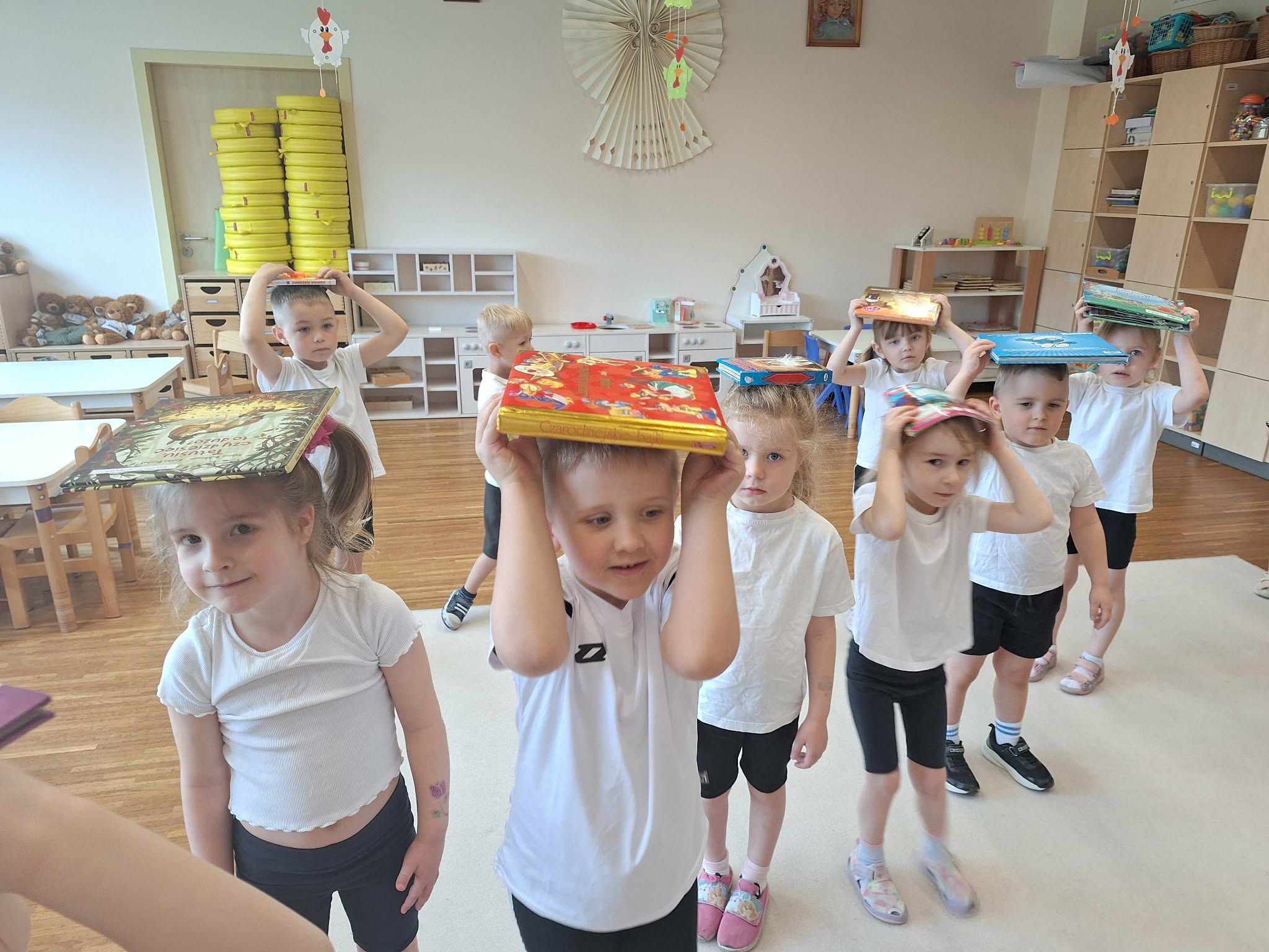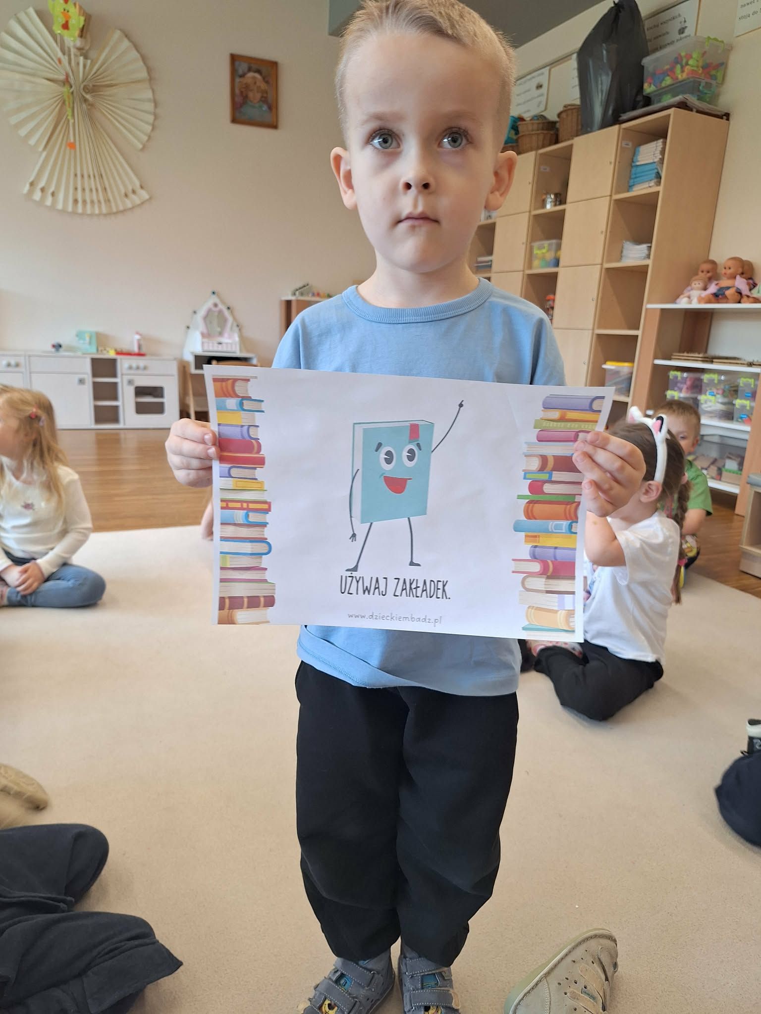 W tym tygodniu dzieci realizowały tematykę „Z książką za pan brat”, poznając świat książek w różnorodny i angażujący sposób. Na początku wspólnie stworzyły „Kodeks czytelnika”, w którym ustaliły zasady szanowania książek i właściwego zachowania podczas czytania. Dzieci miały także okazję zaprezentować książki przyniesione z domu – opowiadały o swoich ulubionych bohaterach i dzieliły się wrażeniami z lektury, co rozwijało ich umiejętności wypowiadania się i budowało zainteresowanie czytelnictwem. W części plastycznej wykonały kolorowe zakładki do książek, rozwijając swoją kreatywność i sprawność manualną. Nawet podczas ćwiczeń gimnastycznych książki stały się elementem zabawy – dzieci wykorzystywały je w różnych aktywnościach ruchowych, łącząc naukę z ruchem. Na zakończenie tygodnia każde dziecko wzięło udział w tworzeniu wyjątkowej książki, w której samo stało się bohaterem. Było to podsumowanie zdobytej wiedzy i okazja do rozwijania wyobraźni oraz poczucia własnej wartości.